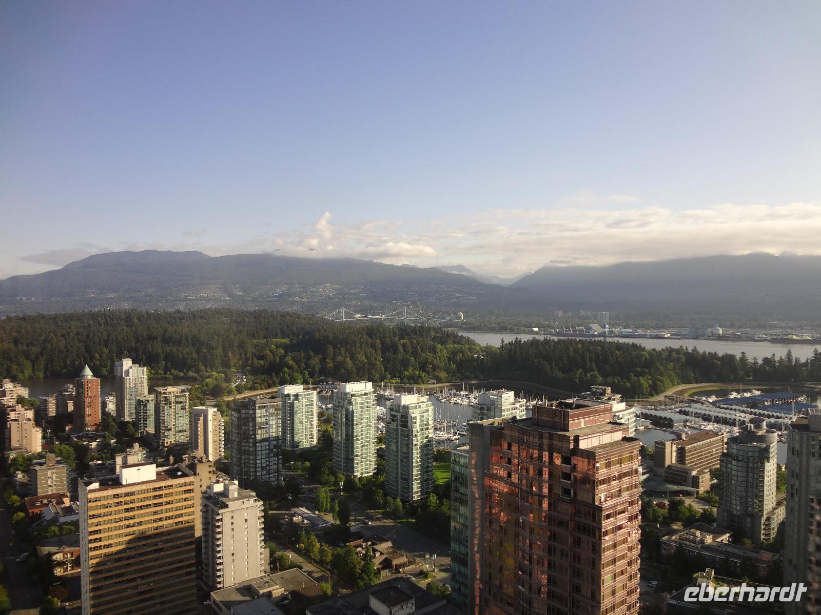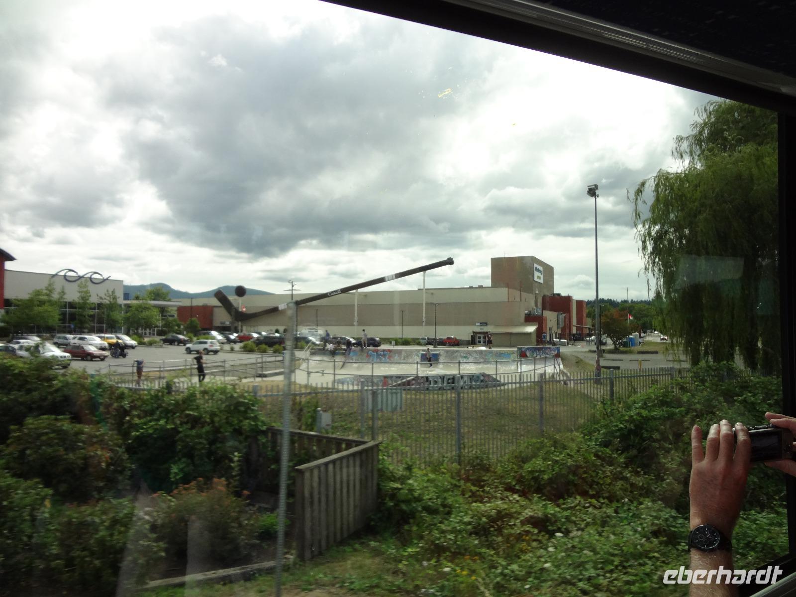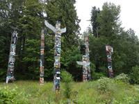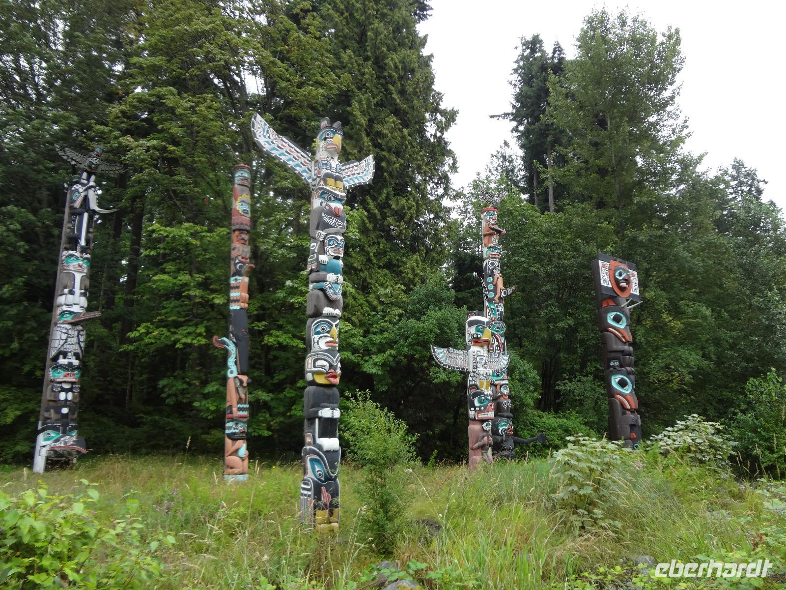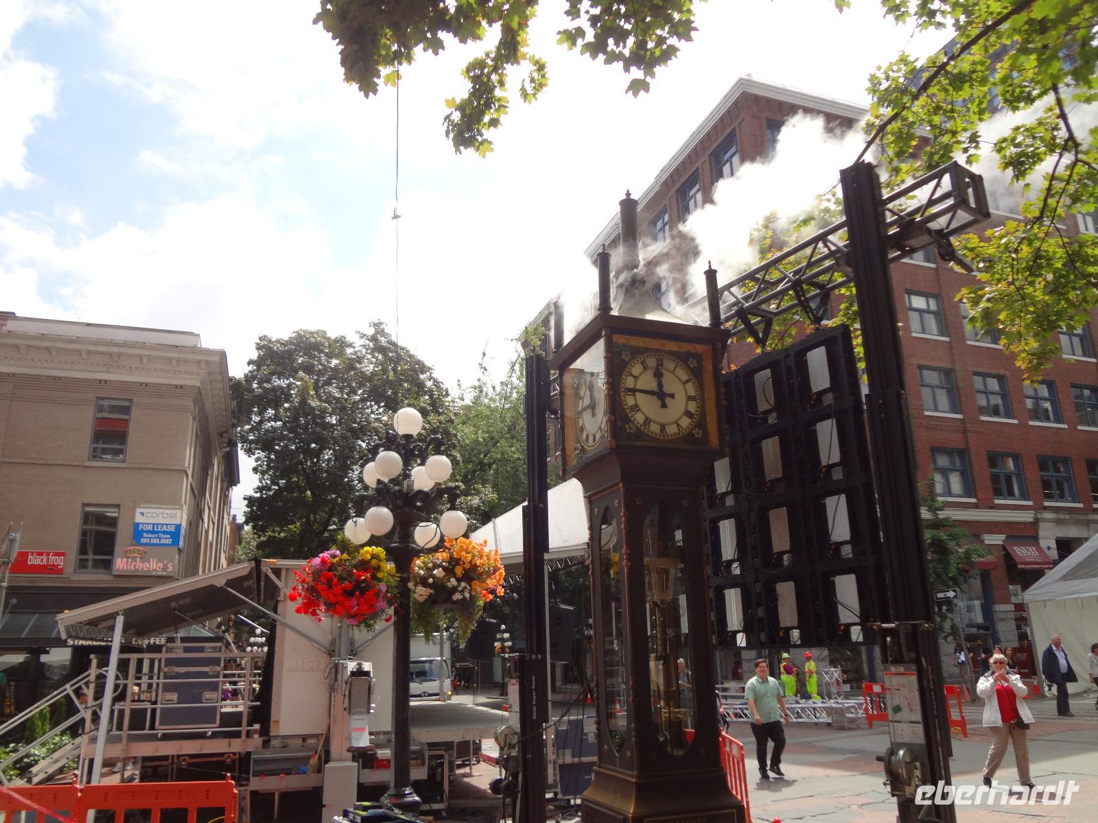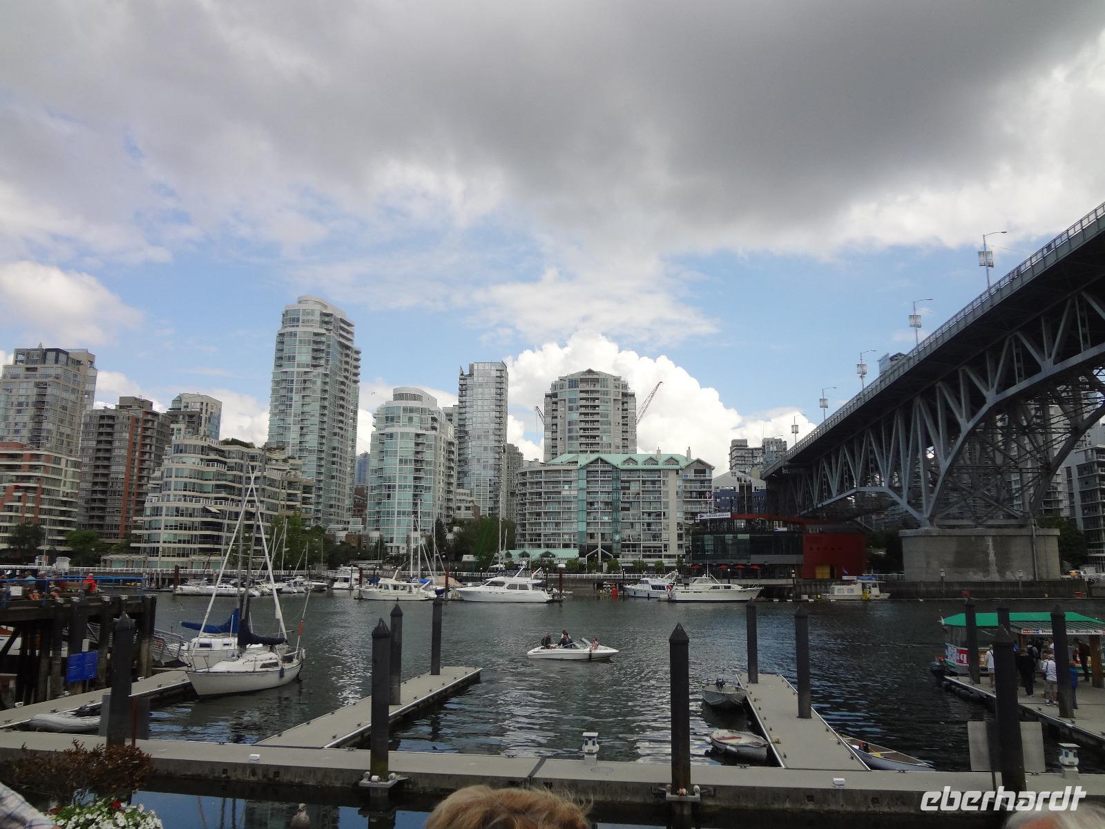 Judihui, wir haben heute eine halbe Stunde geschenkt bekommen. Unsere Stadtrundfahrt beginnt um 9 Uhr. Puenktlich, werden wir von Keith abgeholt denn er wird uns heute durch die Stadt fahren. Vorerst geht es zum Stadtpark, Stanley Park hat einen Rundweg von genau 10 Km und wir halten bei den geschichtserzaehlenden Pfaehlen mit dem schoenen Ausblick auf das Zentrum Vanouvers. Es gibt tatsaechlich noch einiges ueber die Totem zu berichten. Nun ruft aber der Kaffee im Shop und die Toiletten auch ! Wir schlaengeln uns durch die Stadt und befinden uns nach vielen Erlaeuterungen in Chinatown. Wir steigen alle aus und gehen zu Fuss durch diesen Stadtteil. Achtung nicht Nase ruempfen wenn wir an den getrockneten Fischen vorbeigehen die hier als Delikatesse angeboten werden. Noch ein Foto von dem viereckigen Huhn und den Gold Blaettchen und dann gehts weiter nach Gastown. Heute ist ein Radrennen in diesem historischen Stadtteil angesagt und das Fest ist genau dort wo die beruehmte Dampfuhr steht. Wir sind 11:45 dort und horchen dem Dampforchester zu ehe wir unseren Bus betreten. Wir sehen Canada Place, die Olympische Fackel, das beruehmte Hotel Vancouver und viel Verkehr, wir ueberqueren Bruecken und fahren durch staedtische Reservate bis wir auf Granville Island inne halten. Hier, unter der Granville Bruecke geht es lustig zu und her. Markthalle, Kuenstler, Glasblaeser, Restaurants, Seidenhersteller, Gallerien, Bars, Theater und Emily Carr's Universitaet befinden sich alle auf dieser aufgeschuetteten Insel + noch eine Zementfabrik. Dort treffen wir uns auch wieder alle nach 1 Stunde Aufenthalt. Die Lachspizza war koestlich. Alle, fahren wir mit Keith zurueck zum Hotel da wir ja heute Nachmittag frei haben und wir diese ueberschauliche Stadt selbst erkunden wollen.