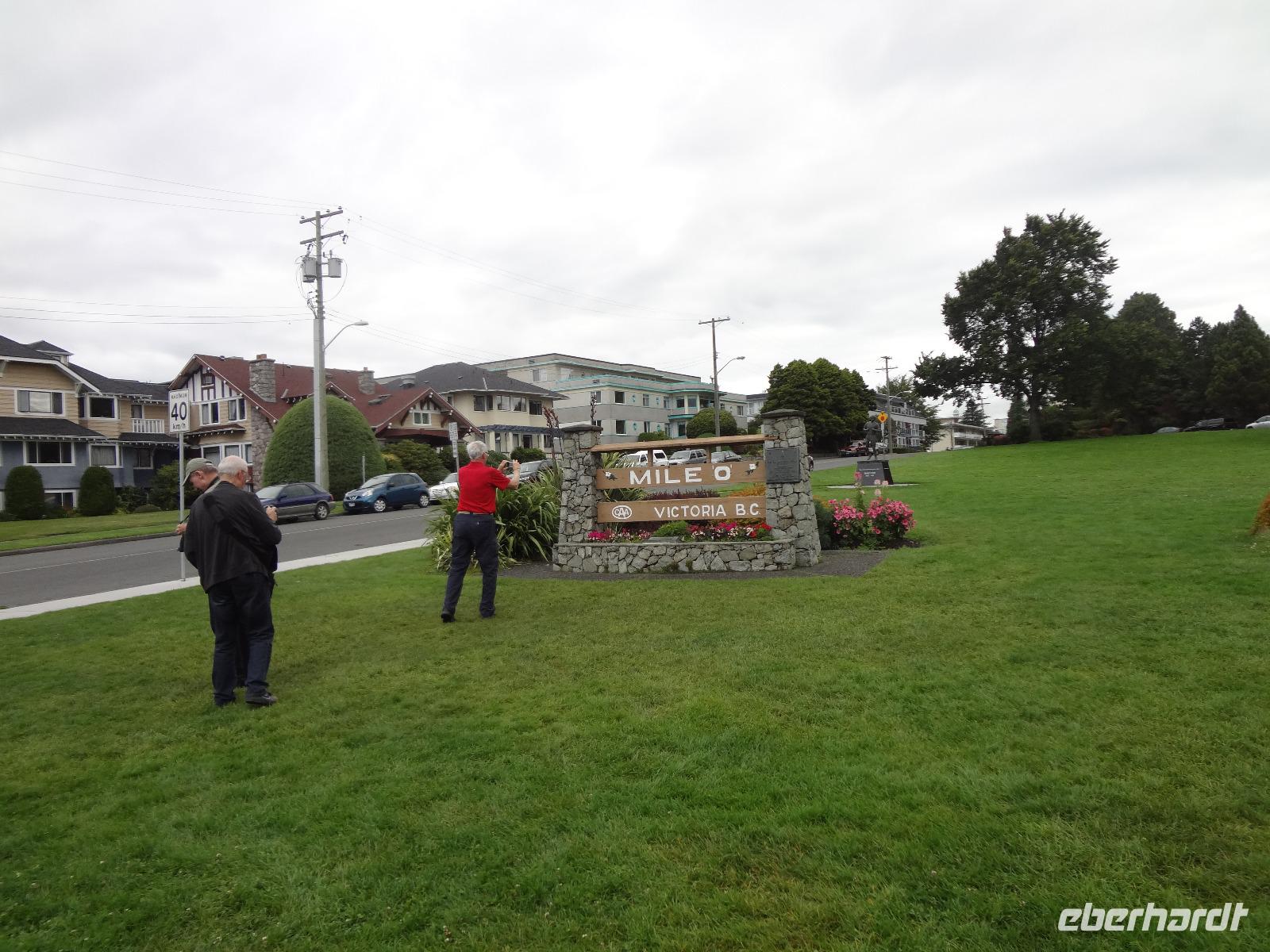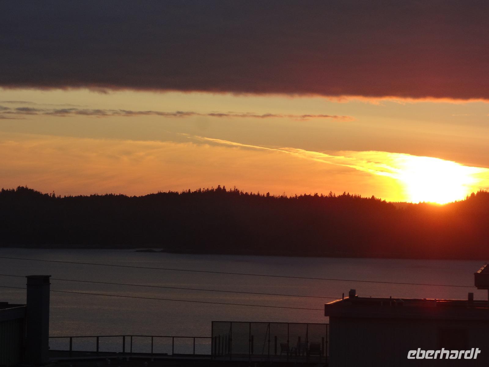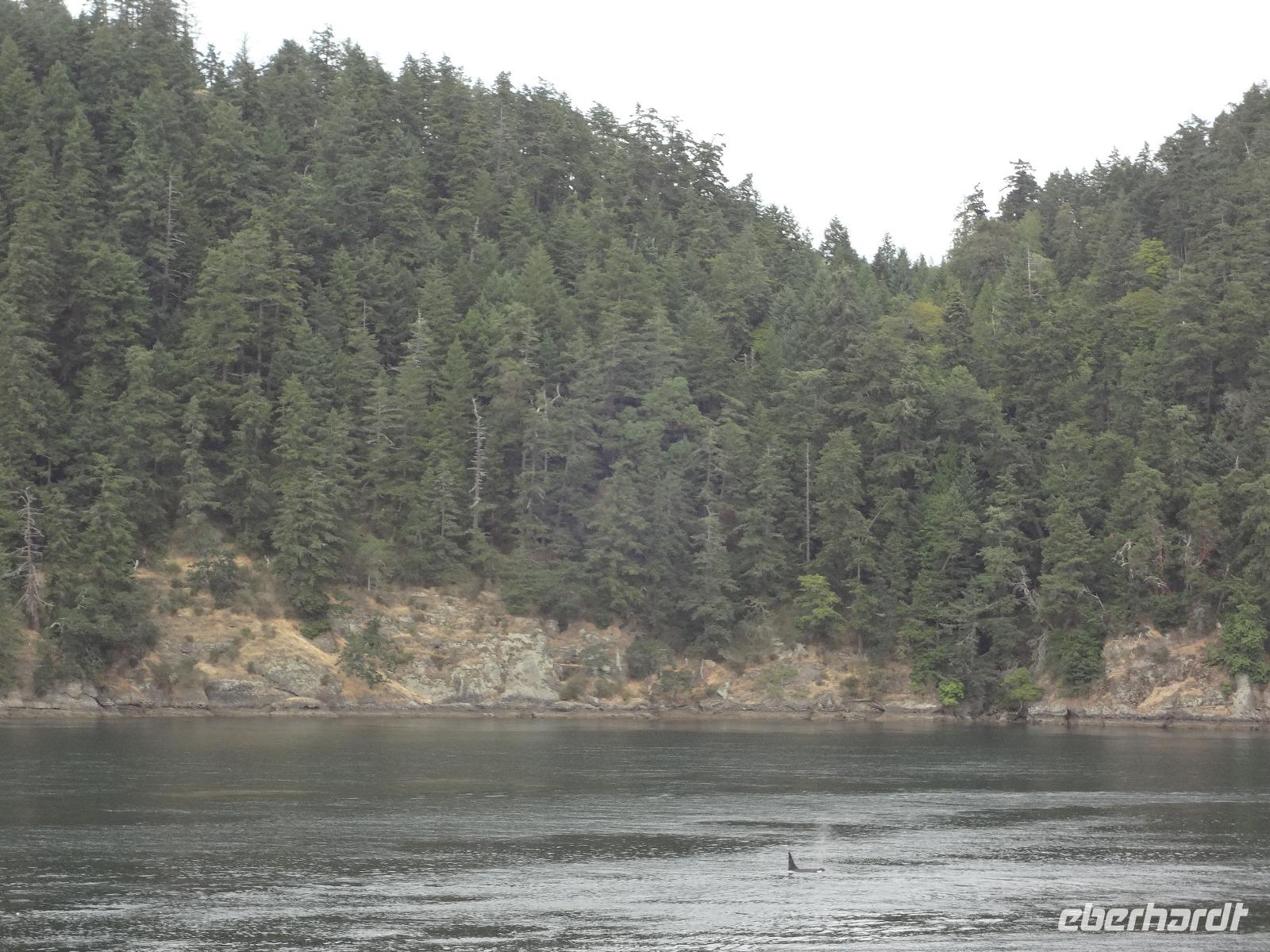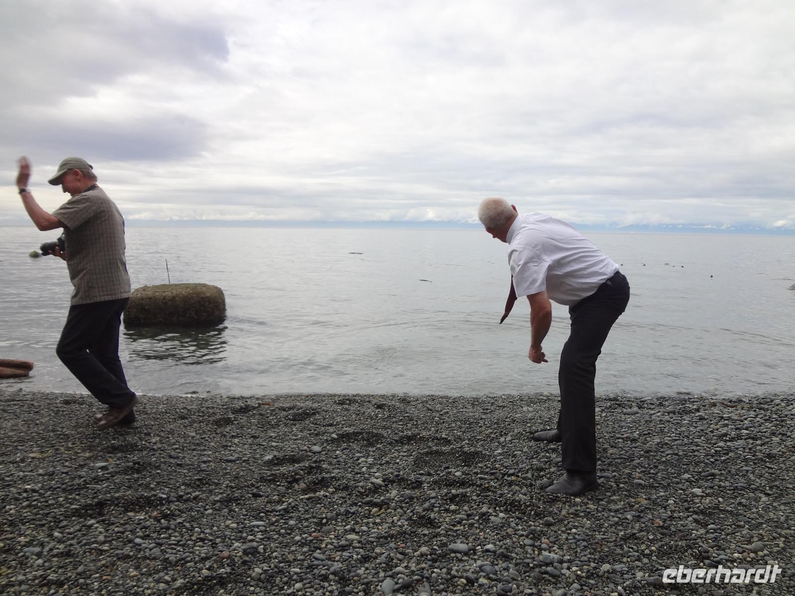Nun ist Stadtrundfahrt im groesseren Victoria angesagt und froehlich fahren wir los um uns vorerst mal jene Haeuser anzuschauen die keine Grundsteuer zu bezahlen brauchen. Das schwimmende Dorf mit seinem Privat-Seehund wird von der Sonne so beleuchtet, dass jeder die Kamera und das Handy zueckt. Der Seehund hat allzuviele Fish n'Chips gegessen und taucht deswegen nicht mehr tief, guenstig fuer die Fotografen. Es geht weiter beim Kreuzschiffhafen vorbei bis zur Meile 0 der kanadischen Highway Nummer 1. Dort gehen wir auch Fuesse baden. Einmal die Fuesse in den frischen, sauberen Pazifischen Ozean stecken, auch dieser Wunsch wird nun erfuellt. An riesengrossen Privatvillen vorbei und einer atemberaubender Kueste entlang mit Sicht auf die Olympische Halbinsel die schon zu den USA gehoeren, fahren wir auf den hoechsten Berg dieser Gegend. Das Wetter spielt mit, wie bislang immer, auf dieser Reise und viele Fotos werden geschossen. Der Besuch bei den beruehmten Butchart Gardens ist anfangs sehr schoen und genuesslich. Wir sehen viele verschiedene Gaerten wie, Haengegarten, versunkener Garten, Rosengarten, Rhododendron Garten usw, und mitten im japanischen Garten, werden wir von einem Platzregen ueberrascht. Durchsichtige Regenschirme gibt es ploetzlich ueberall, wir gucken darunter hinaus und beeilen uns durch den franzoesischen und den italienischen Garten ins Restaurant. Nach der Mittagspause fahren wir zum Faehrehafen um nach Vancouver um aufs Festland hinueber zu fahren. Die Sonne lacht nun wieder und wir geniessen die Inselwelt die sich hier zeigt. Gerade in der engsten Passage, da wo sich die Faehren kreuzen ertoent die Stimme des 3. Offiziers. : Orcas tummeln sich, wir muessen die Fahrt verlangsamen, denn die Walfischbeobachtung - Boote und die Killerwale selbst, versperren fast die Passage. Wir sind alle schon zur Hand mit unseren Kameras und schauen dem Schauspiel zu. Was fuer ein Glueck. Nun haben wir alle grossen Tiere dieses Meeres gesehen. Wie auf Safari. Glueckseelig kommen wir in Vancouver an wo wir uns dann von unserem Fahrer Goran verabschieden muessen. Er war wohl der beste Fahrer den man sich haette wuenschen koennen. Ruhig, lustig, sicher, stark und gross das ist unser Goran, er hat uns nun 12 Tage durch den hohen Norden gefahren und er passte richtig in unsere Familie. Er verlaesst uns heute, da wir morgen bloss einige Stunden auf eine Stadtrundfahrt gehen werden. Grosse Verabschiedung ehe wir im Landmark Hotel auf der Robsonstrasse im Zentrum Vancouvers einchecken. Wir kaempfen uns durch die vielen Leute die hier leben und gehen heute Abend zum Italiener essen. Fein ist das Bestellte, genuesslich der Wein, bloss an den Laermpegel, da muessen wir uns wohl wieder gewoehnen muessen. Heute wirds nichts mit dem Rezitieren von eigenen Gedichten wie in vorhergehenden Restaurants. Mancher traeumt heute von den ewigen Waeldern, den glitzernden Gletschern, den tuerkisblauen Seen waehrend er in dieser pulsierenden Millionenstadt das Kissen drueckt und die Augenlieder von innen anschaut.