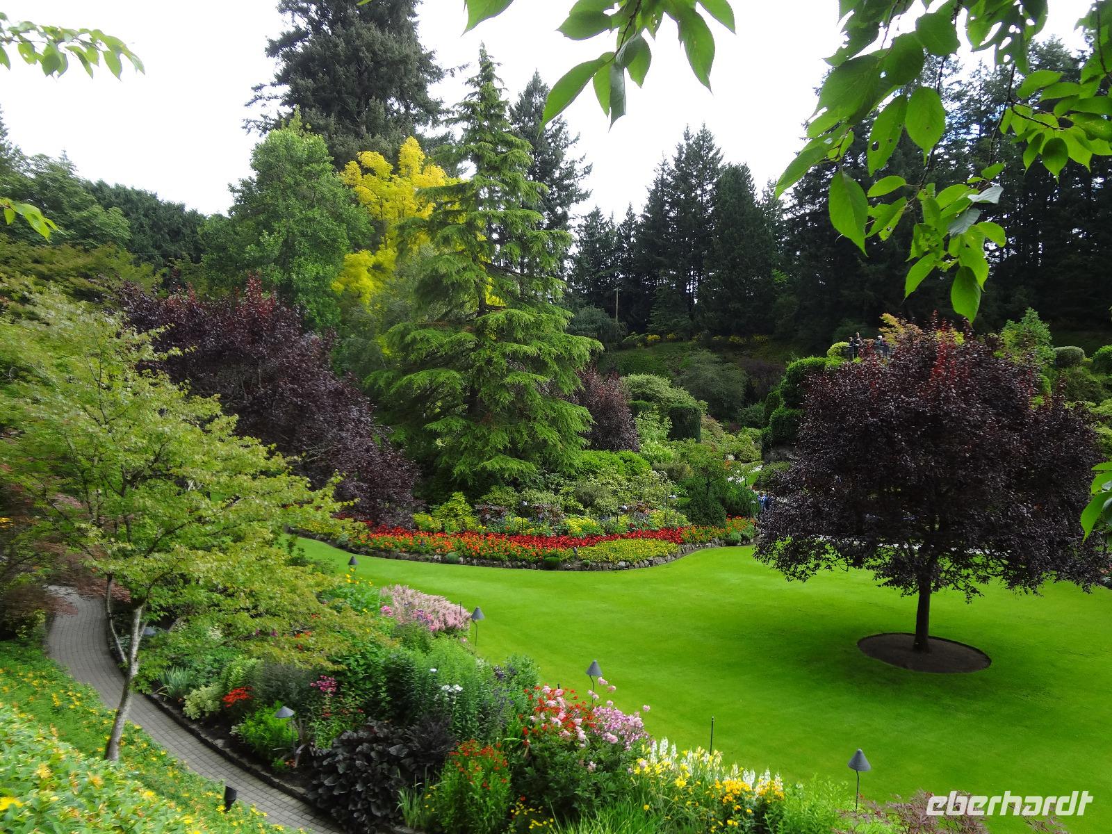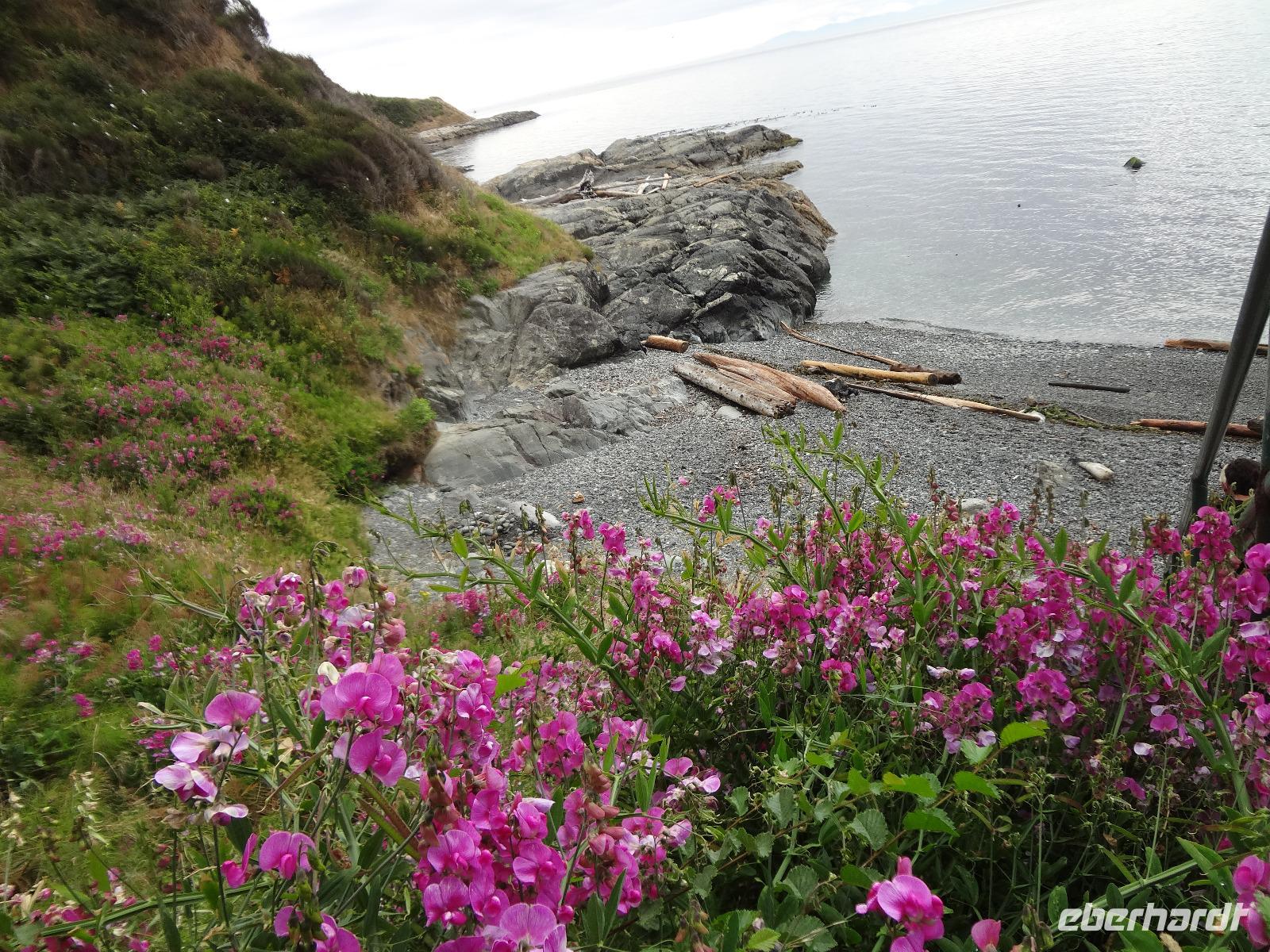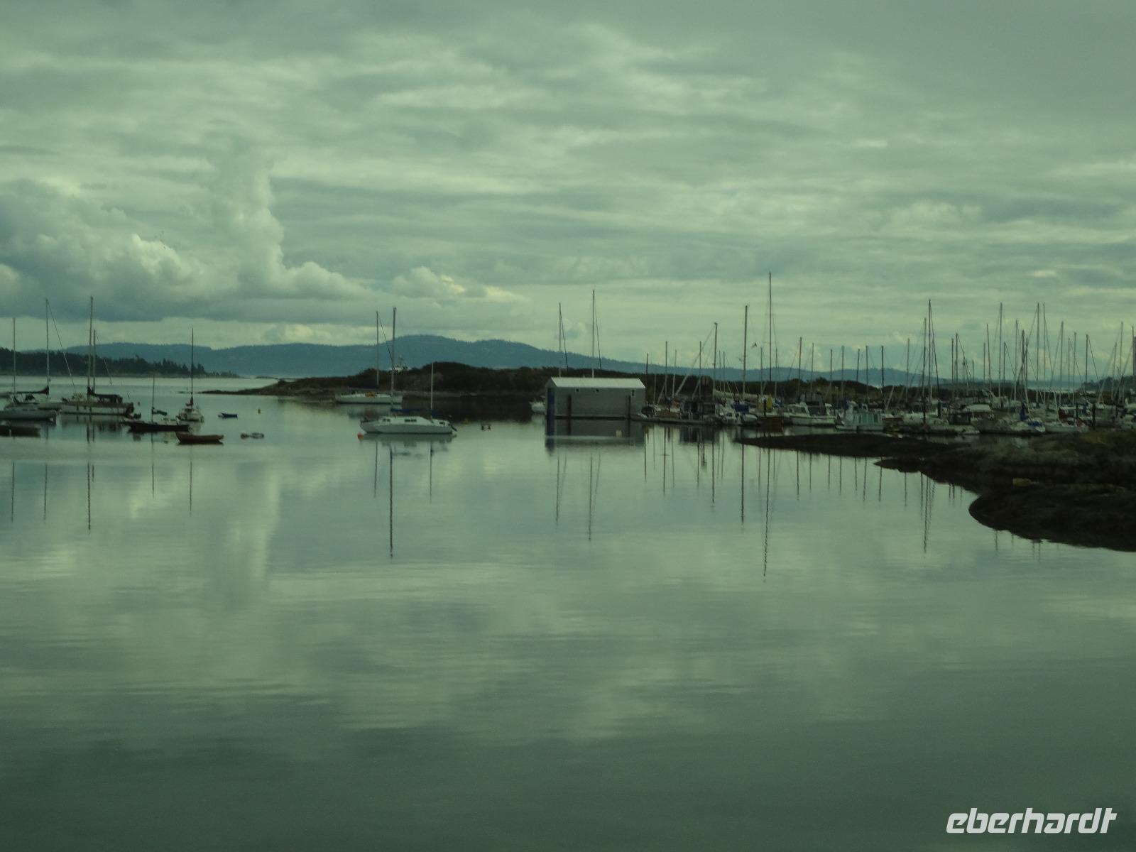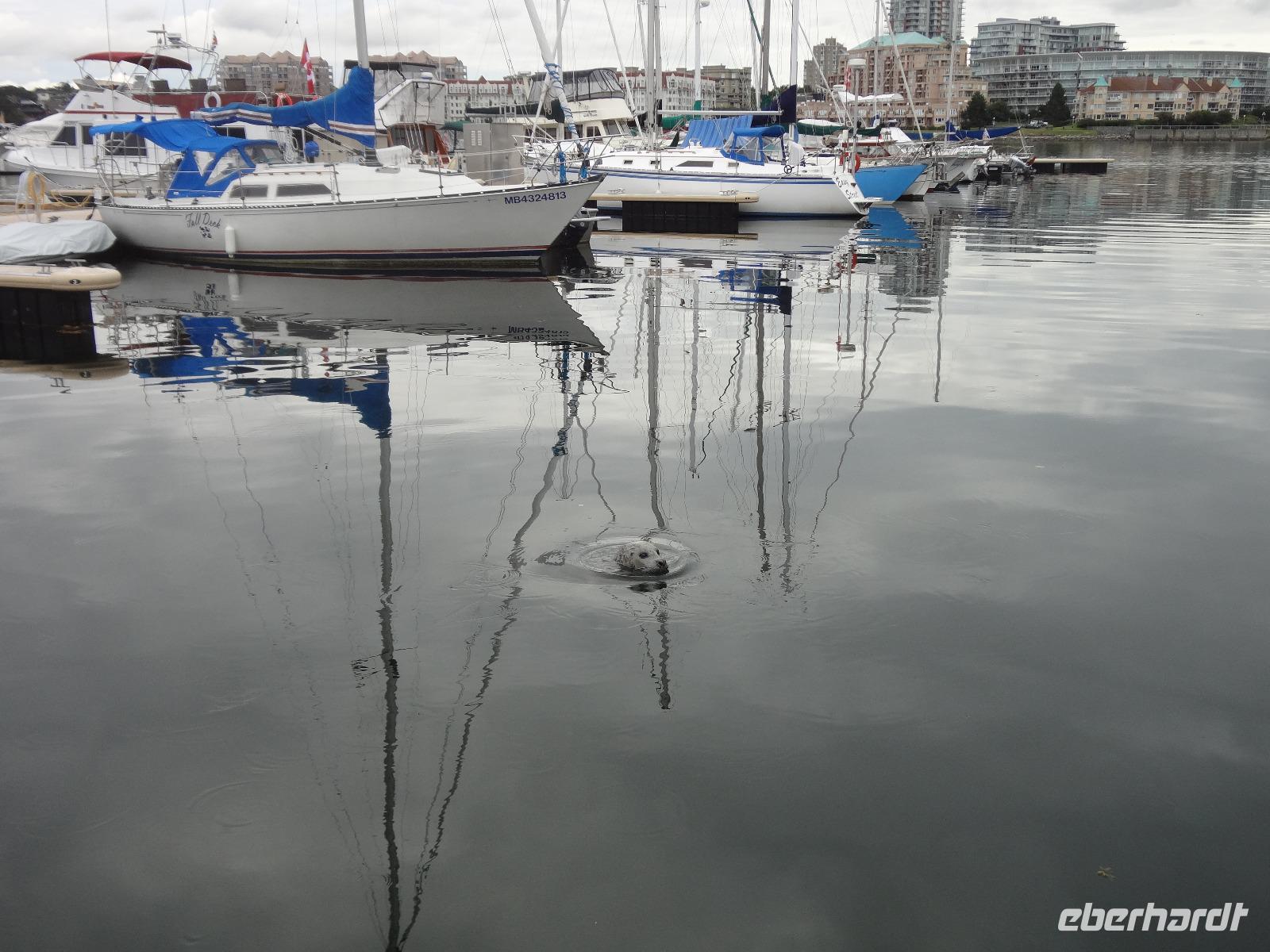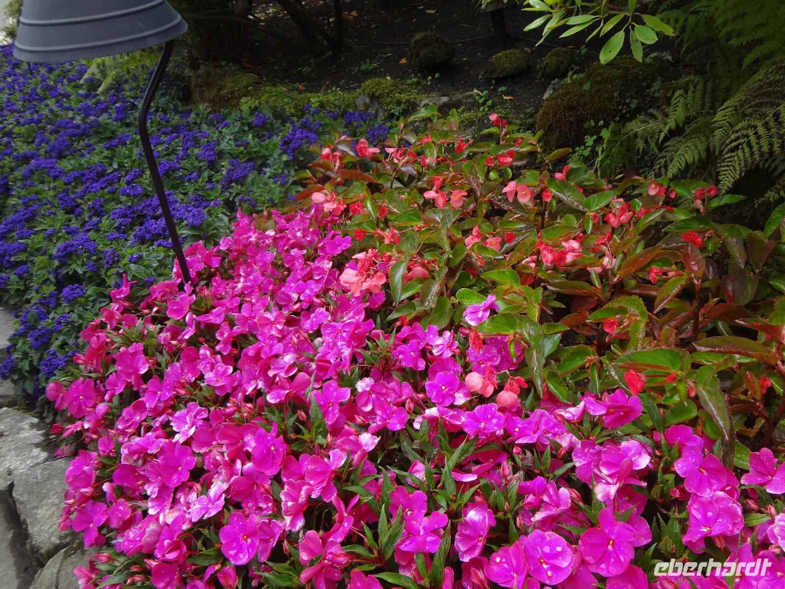 Nun ist Stadtrundfahrt im groesseren Victoria angesagt und froehlich fahren wir los um uns vorerst mal jene Haeuser anzuschauen die keine Grundsteuer zu bezahlen brauchen. Das schwimmende Dorf mit seinem Privat-Seehund wird von der Sonne so beleuchtet, dass jeder die Kamera und das Handy zueckt. Der Seehund hat allzuviele Fish n'Chips gegessen und taucht deswegen nicht mehr tief, guenstig fuer die Fotografen. Es geht weiter beim Kreuzschiffhafen vorbei bis zur Meile 0 der kanadischen Highway Nummer 1. Dort gehen wir auch Fuesse baden. Einmal die Fuesse in den frischen, sauberen Pazifischen Ozean stecken, auch dieser Wunsch wird nun erfuellt. An riesengrossen Privatvillen vorbei und einer atemberaubender Kueste entlang mit Sicht auf die Olympische Halbinsel die schon zu den USA gehoeren, fahren wir auf den hoechsten Berg dieser Gegend. Das Wetter spielt mit, wie bislang immer, auf dieser Reise und viele Fotos werden geschossen. Der Besuch bei den beruehmten Butchart Gardens ist anfangs sehr schoen und genuesslich. Wir sehen viele verschiedene Gaerten wie, Haengegarten, versunkener Garten, Rosengarten, Rhododendron Garten usw, und mitten im japanischen Garten, werden wir von einem Platzregen ueberrascht. Durchsichtige Regenschirme gibt es ploetzlich ueberall, wir gucken darunter hinaus und beeilen uns durch den franzoesischen und den italienischen Garten ins Restaurant. Nach der Mittagspause fahren wir zum Faehrehafen um nach Vancouver um aufs Festland hinueber zu fahren. Die Sonne lacht nun wieder und wir geniessen die Inselwelt die sich hier zeigt. Gerade in der engsten Passage, da wo sich die Faehren kreuzen ertoent die Stimme des 3. Offiziers. : Orcas tummeln sich, wir muessen die Fahrt verlangsamen, denn die Walfischbeobachtung - Boote und die Killerwale selbst, versperren fast die Passage. Wir sind alle schon zur Hand mit unseren Kameras und schauen dem Schauspiel zu. Was fuer ein Glueck. Nun haben wir alle grossen Tiere dieses Meeres gesehen. Wie auf Safari. Glueckseelig kommen wir in Vancouver an wo wir uns dann von unserem Fahrer Goran verabschieden muessen. Er war wohl der beste Fahrer den man sich haette wuenschen koennen. Ruhig, lustig, sicher, stark und gross das ist unser Goran, er hat uns nun 12 Tage durch den hohen Norden gefahren und er passte richtig in unsere Familie. Er verlaesst uns heute, da wir morgen bloss einige Stunden auf eine Stadtrundfahrt gehen werden. Grosse Verabschiedung ehe wir im Landmark Hotel auf der Robsonstrasse im Zentrum Vancouvers einchecken. Wir kaempfen uns durch die vielen Leute die hier leben und gehen heute Abend zum Italiener essen. Fein ist das Bestellte, genuesslich der Wein, bloss an den Laermpegel, da muessen wir uns wohl wieder gewoehnen muessen. Heute wirds nichts mit dem Rezitieren von eigenen Gedichten wie in vorhergehenden Restaurants. Mancher traeumt heute von den ewigen Waeldern, den glitzernden Gletschern, den tuerkisblauen Seen waehrend er in dieser pulsierenden Millionenstadt das Kissen drueckt und die Augenlieder von innen anschaut.