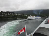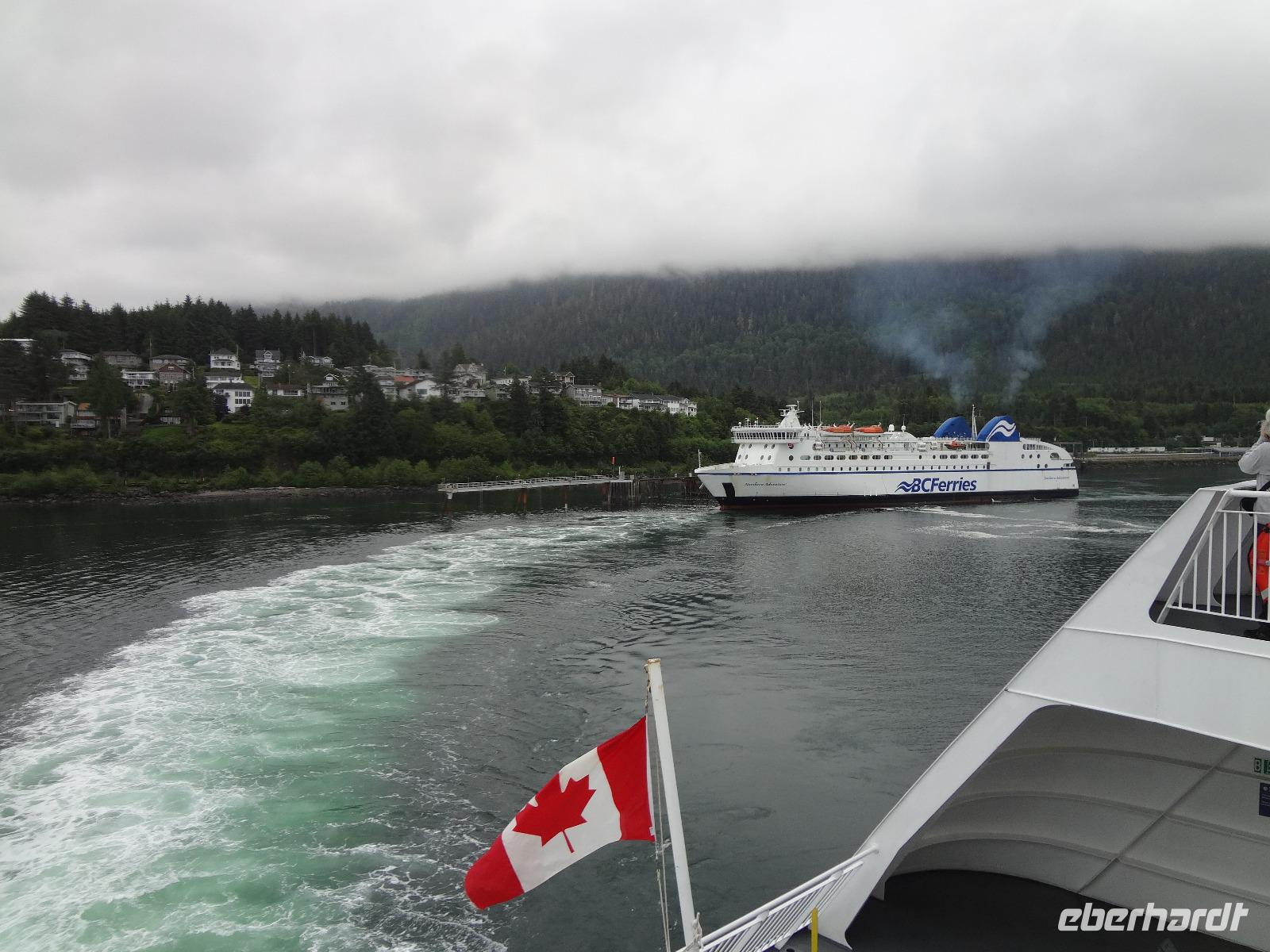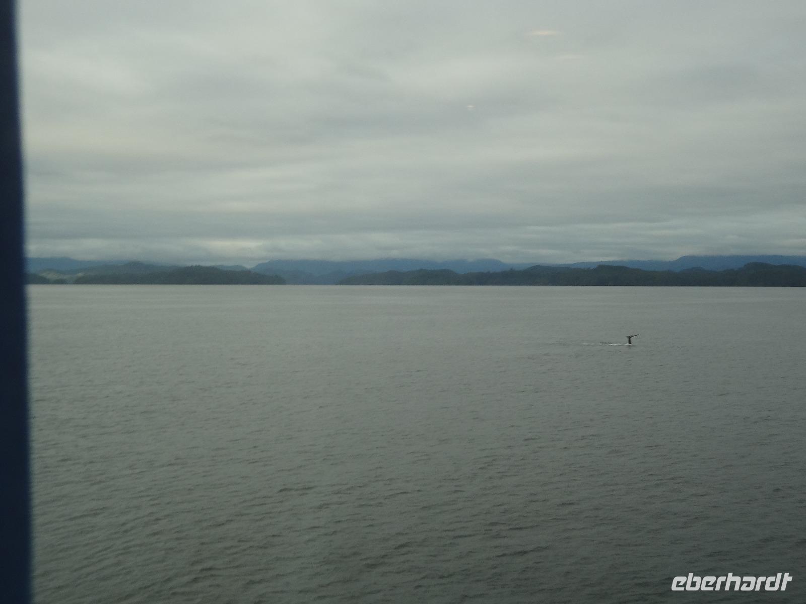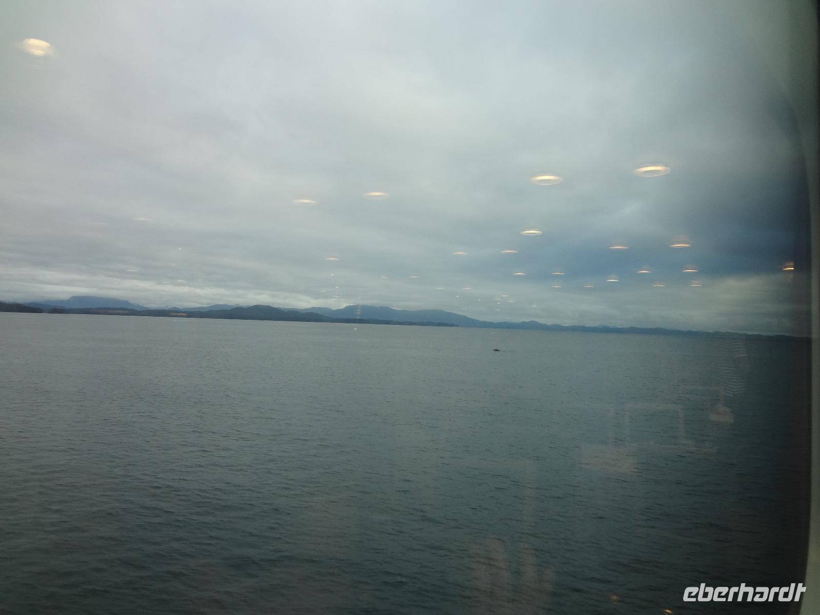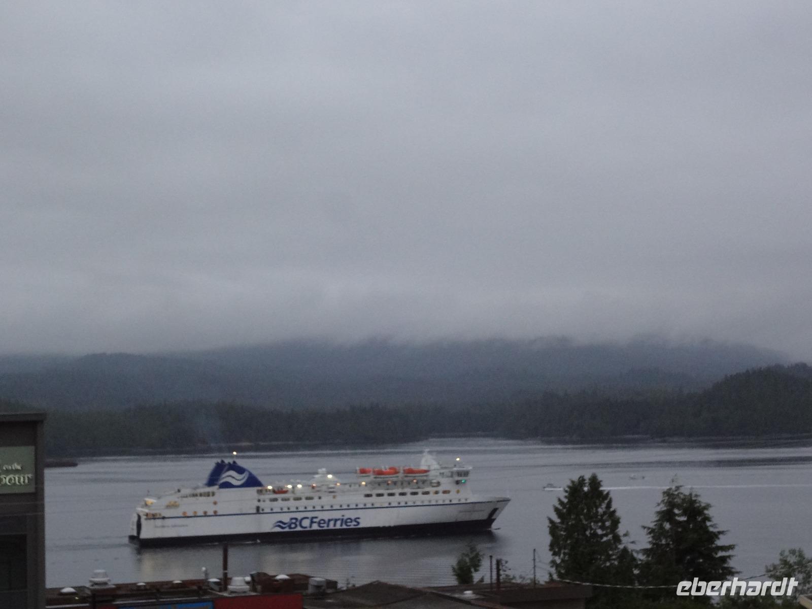 Schon um 6 Uhr in der Frueh checken wir mit dem Bus auf der Faehre ein und duerfen auch gleich schon in den Bauch der Faehre fahren. Wir sind der einzige Bus auf der 17 stuendigen Fahrt von Prince Rupert nach Port Hardy und wir finden auch gleich die schoensten Sitzplaetze. Vorerst schauen wir mal zu wie die Faehre auslaeuft und staunen ueber die schoenen Haeuser die hier alle eine super Aussicht auf die vorgelagerten Inseln haben. Schoen muss es sein, in Prince Rupert zu wohnen, bloss ist man sehr abgelegen ! Vorbei am Kohlehafen und der Verfrachtung des Getreides treffen wir uns alle auf Deck 4 zu einem koestlichen Fruehstuecksbuffet. Wir ziehen unser Fruehstueck auch ganz schoen in die Laenge, lachen viel und erzaehlen natuerlich, unter anderem, unser Abendessen-Ekmek-Erlebnis. Jeder hat nun Zeit fuer sich, einige gehen aufs Deck und geniessen die Inside Passage, andere doesen ein wenig, lesen, unterhalten sich oder spielen Karten. Elisabeth hat es auch arrangiert, dass wir alle, in 3 Gruppen aufgeteilt auf die Bruecke duerfen. Wir segeln auf einer deutschen Faehre und der heilige Nikolas sorgt fuer Sicherheit. Auf der Faehre gibt es auch eine Imbisstube wo man ein kleines Mittagessen einnehmen kann. Elisabeth hat Buero-Stunde um 16:00 Uhr und um 18:00 Uhr treffen wir uns alle wieder auf dem Aussendeck fuer eine gemuetliche Runde mit kanadischem Weiss- und Rotwein sowie kanadischem Bier. Eingeladen hat uns Eberhardt ! Nach dem feinen und lustigen Umtrunk begeben wir uns wieder ins Restaurant zum Abendessen am Buffet. Untermalt wird das Abendbrot durch Buckelwahle und Blauwahle die wir auch fotografieren. Ein sehr abwechslungsreiches Abendprogramm wird uns daher geboten. Bald sind wir auch in Port Hardy wo wir anlegen. Muede sind wir, als wir im Airport Inn ankommen und fallen auch gleich ins Bett.