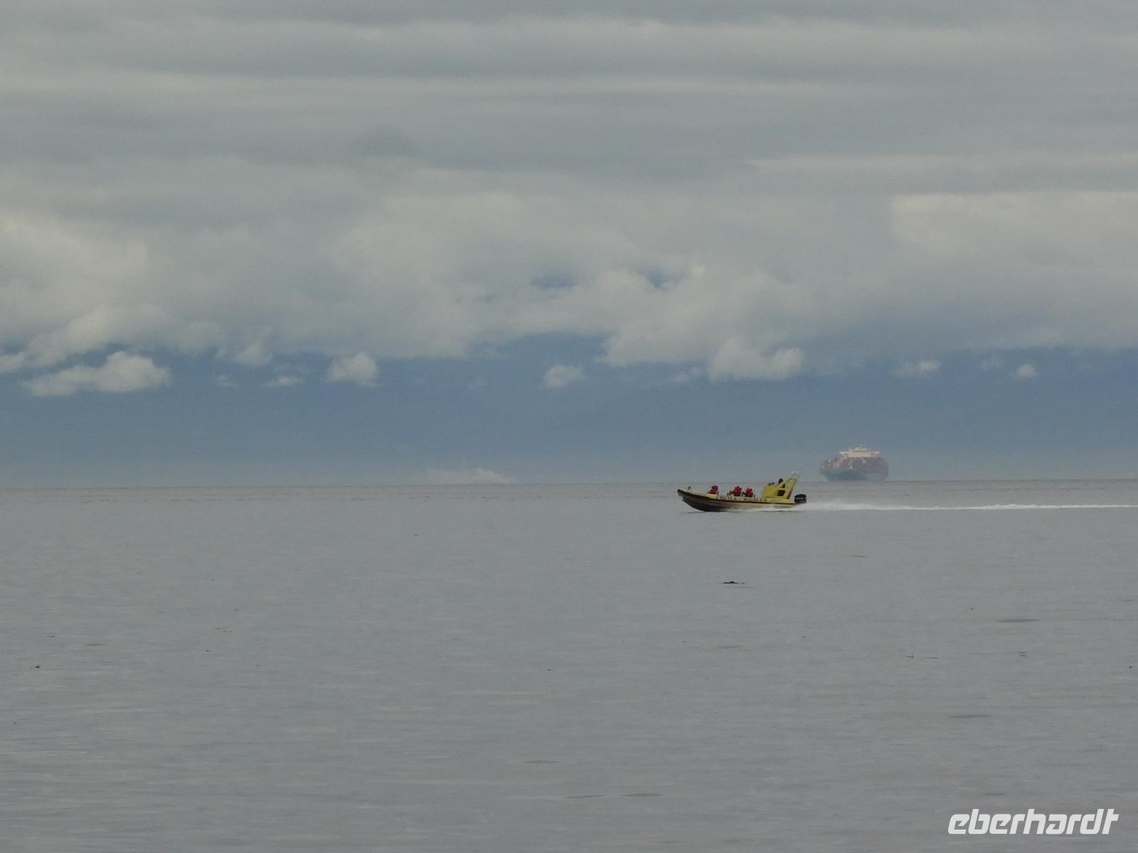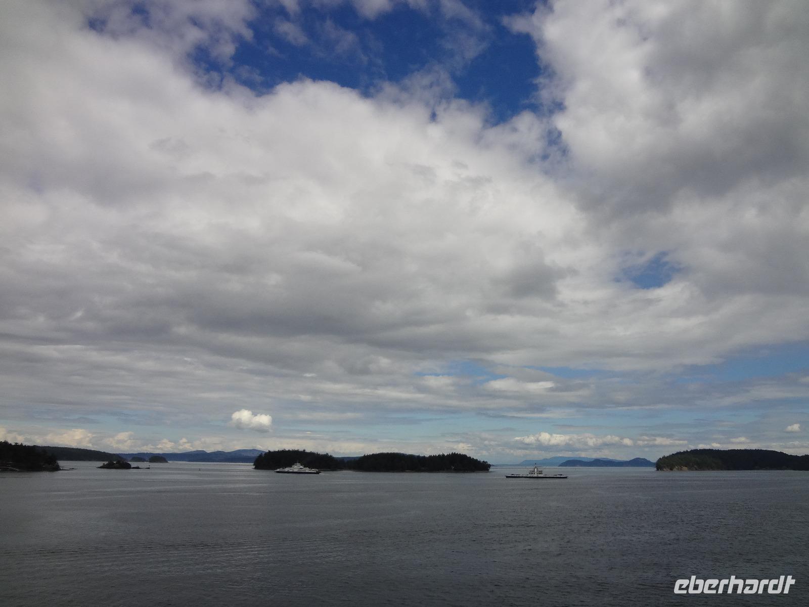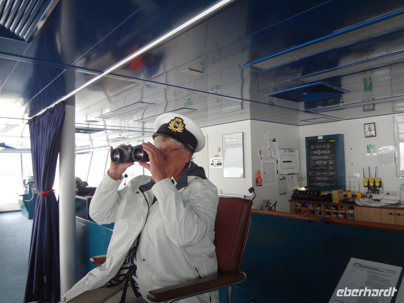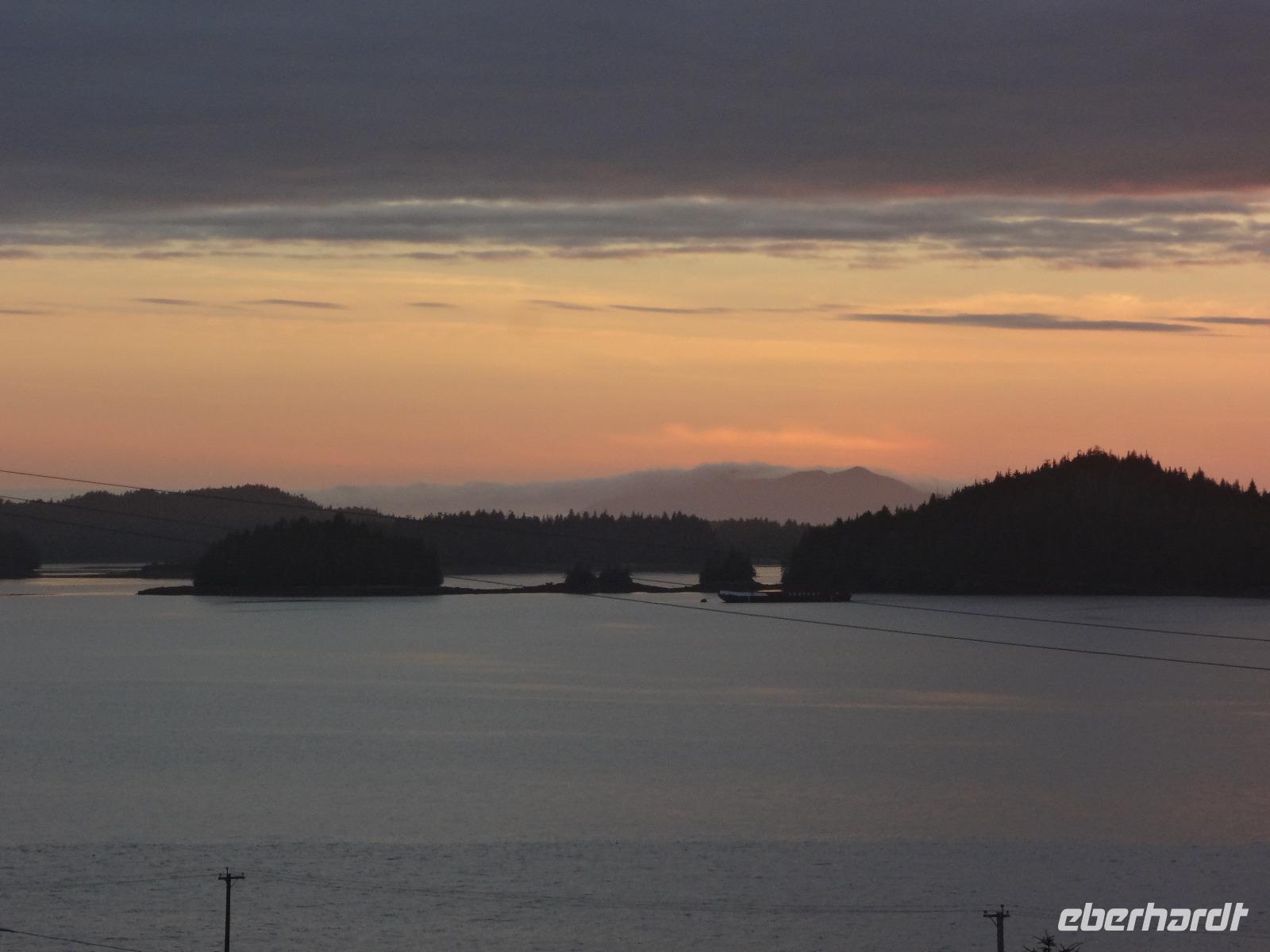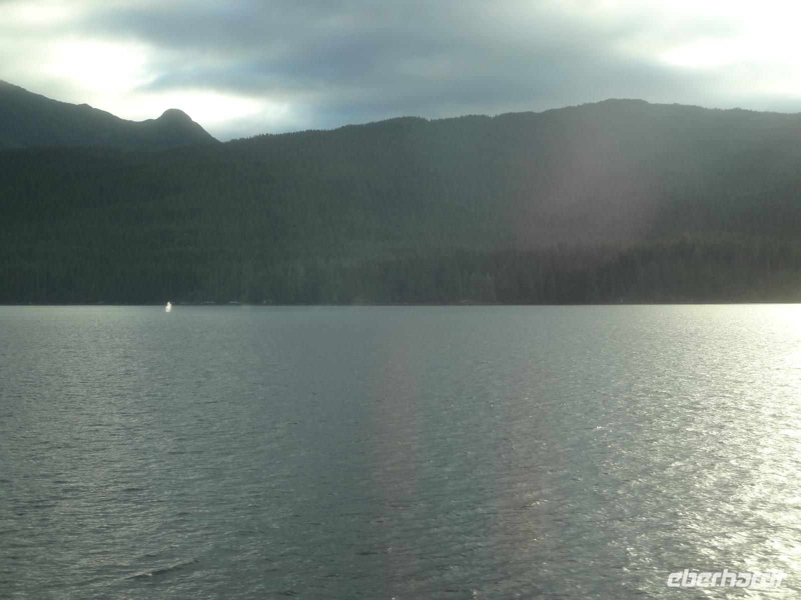 Schon um 6 Uhr in der Frueh checken wir mit dem Bus auf der Faehre ein und duerfen auch gleich schon in den Bauch der Faehre fahren. Wir sind der einzige Bus auf der 17 stuendigen Fahrt von Prince Rupert nach Port Hardy und wir finden auch gleich die schoensten Sitzplaetze. Vorerst schauen wir mal zu wie die Faehre auslaeuft und staunen ueber die schoenen Haeuser die hier alle eine super Aussicht auf die vorgelagerten Inseln haben. Schoen muss es sein, in Prince Rupert zu wohnen, bloss ist man sehr abgelegen ! Vorbei am Kohlehafen und der Verfrachtung des Getreides treffen wir uns alle auf Deck 4 zu einem koestlichen Fruehstuecksbuffet. Wir ziehen unser Fruehstueck auch ganz schoen in die Laenge, lachen viel und erzaehlen natuerlich, unter anderem, unser Abendessen-Ekmek-Erlebnis. Jeder hat nun Zeit fuer sich, einige gehen aufs Deck und geniessen die Inside Passage, andere doesen ein wenig, lesen, unterhalten sich oder spielen Karten. Elisabeth hat es auch arrangiert, dass wir alle, in 3 Gruppen aufgeteilt auf die Bruecke duerfen. Wir segeln auf einer deutschen Faehre und der heilige Nikolas sorgt fuer Sicherheit. Auf der Faehre gibt es auch eine Imbisstube wo man ein kleines Mittagessen einnehmen kann. Elisabeth hat Buero-Stunde um 16:00 Uhr und um 18:00 Uhr treffen wir uns alle wieder auf dem Aussendeck fuer eine gemuetliche Runde mit kanadischem Weiss- und Rotwein sowie kanadischem Bier. Eingeladen hat uns Eberhardt ! Nach dem feinen und lustigen Umtrunk begeben wir uns wieder ins Restaurant zum Abendessen am Buffet. Untermalt wird das Abendbrot durch Buckelwahle und Blauwahle die wir auch fotografieren. Ein sehr abwechslungsreiches Abendprogramm wird uns daher geboten. Bald sind wir auch in Port Hardy wo wir anlegen. Muede sind wir, als wir im Airport Inn ankommen und fallen auch gleich ins Bett.