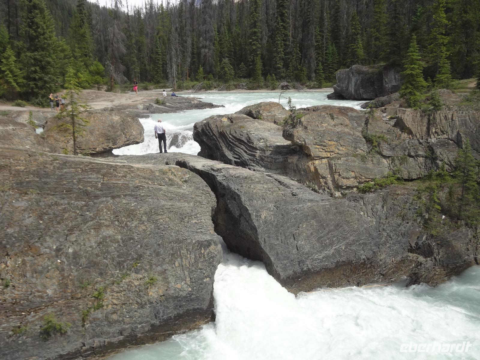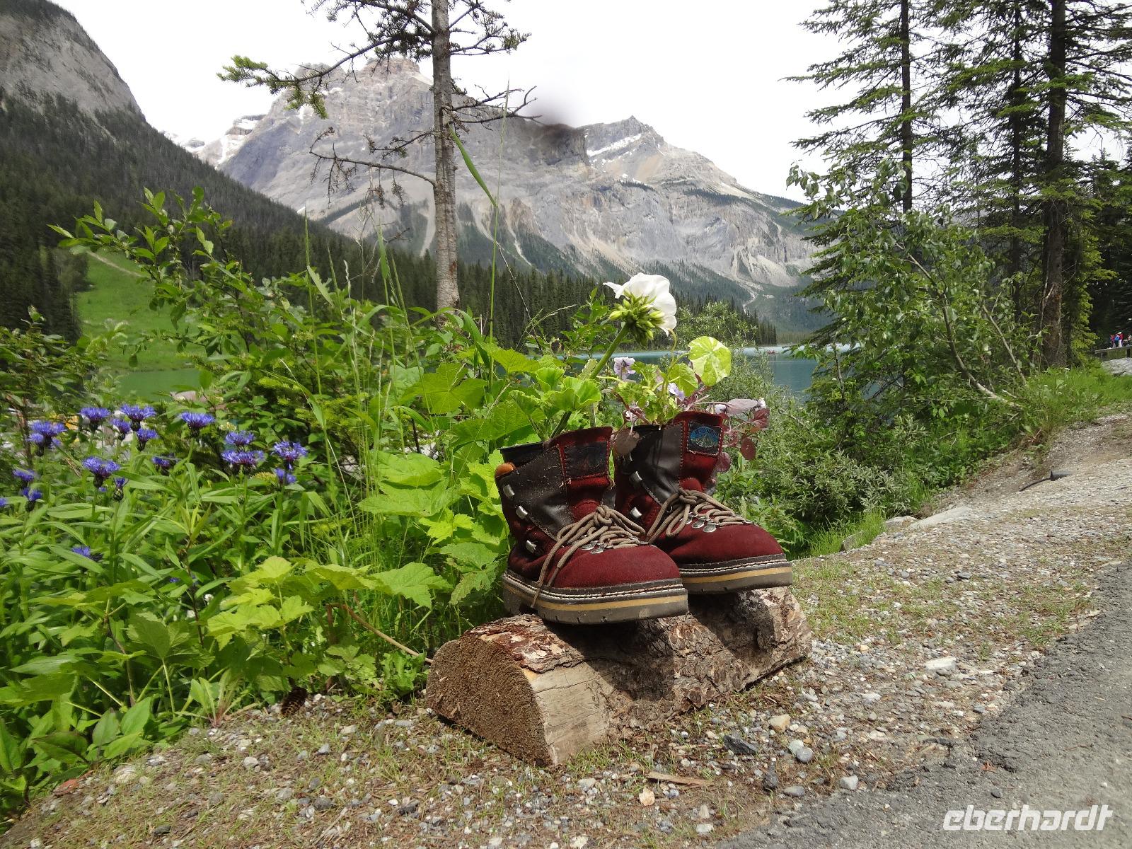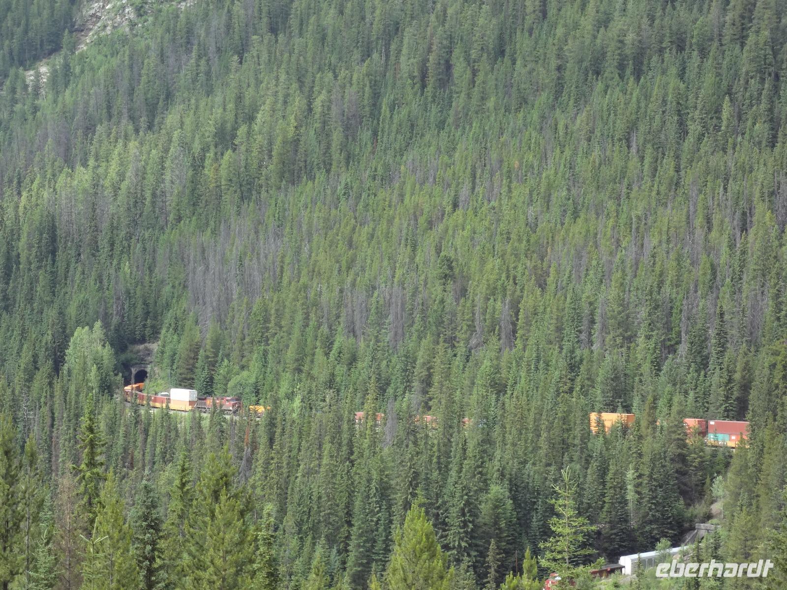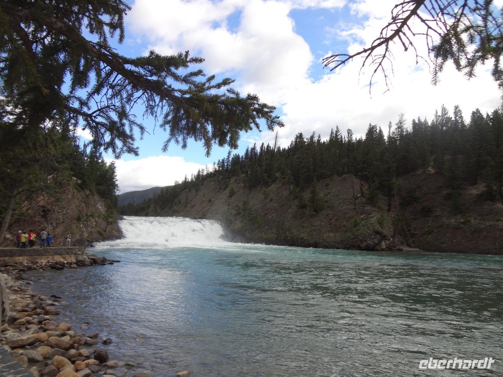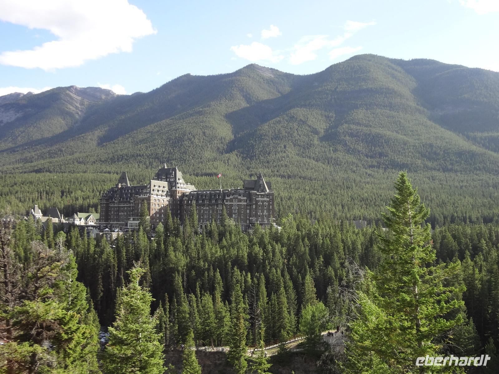 Dring, dring geht das Telefon schon um 6:30 ! Wir sind eh alle schon wach und warten bloss auf das Zeichen, dass wir bald schon an das feine Fruehstuecksmuesli kommen von welchem so geschwaermt wird. Nach dem tollen Fruehstueck gehts auf unseren Seen-Tag. Als erstes besuchen wir Lake Moraine. Nun verstehen wir auch, weshalb gerade dieser See auf der alten kanadischen 20 Dollar Note verewigt wurde. Ganz verzaubert fahren wir weiter zum Lake Louise wo wir als erstes natuerlich die Mona Lisa der Rocky Mountains von innen besuchen und das obligate Foto knipsen auf Elisabeth's Terrasse ! Wahrlich herrlich diese Aussicht, die Blumen leuchten, der Victoria Gletscher glitzert, der See liegt ruhig und die Sonne lacht, besser geht es gar nicht. Genau wie im Prospekt. Am Nachmittag haben wir noch vieles vor, vorerst schauen wir uns das Modell der Spiralen Tunnel an. Ein Fest der Ingenieure, nur leider kommt gerade kein Zug vorbei ! Es ist eben Kei-na-da! Im Yoho National Park besuchen wir den Emerald Lake und danach halten wir mitten im Wald an um uns den tobenden Kicking Horse River anzuschauen wie er unter einer natuerlichen Steinbruecke durchstoebt. Ein Energie geladener, toller Anblick. Die naechste Etappe sind die Takakawa Falls, mit 384 Meter, die 2. groessten Wasserfaelle Britisch Columbiens. Vor dieser imposanten Kulisse packen nun Goran und Elisabeth, die Party Zutaten aus. Kanadischen Weiss- und Rotwein sowie Kookanie Bier, Chips und Snacks werden aufgetischt und die Party kann beginnen. Lustig fahren wir wieder zurueck in den Banff National Park. Da in den Spiral Tunnels bewegt sich ein Zug. Die vielen Wagons fahren in den Berg und man sieht denselben Zug wieder aus einem anderen Tunnel hinausfahren ! Toll. Wir besuchen bei Banff die Hoodoos die wie Geister entlang des Tales dastehen und knipsen noch schoene Bilder vom beruehmten Banff Springs Hotel. Weiter geht die Fahrt nach Banff hinein, wo wir auch im Stau stecken bleiben. Ganze 5 Minuten !!! Es ist heute Feiertag und Banff ist zum bersten voll. Ein feines Abendessen in einem nahegelegenen Restaurant rundet diesen wunderschoenen Tag ab. Nur einige unter uns bleiben noch so lange wach um das Feuerwerk zu sehen.