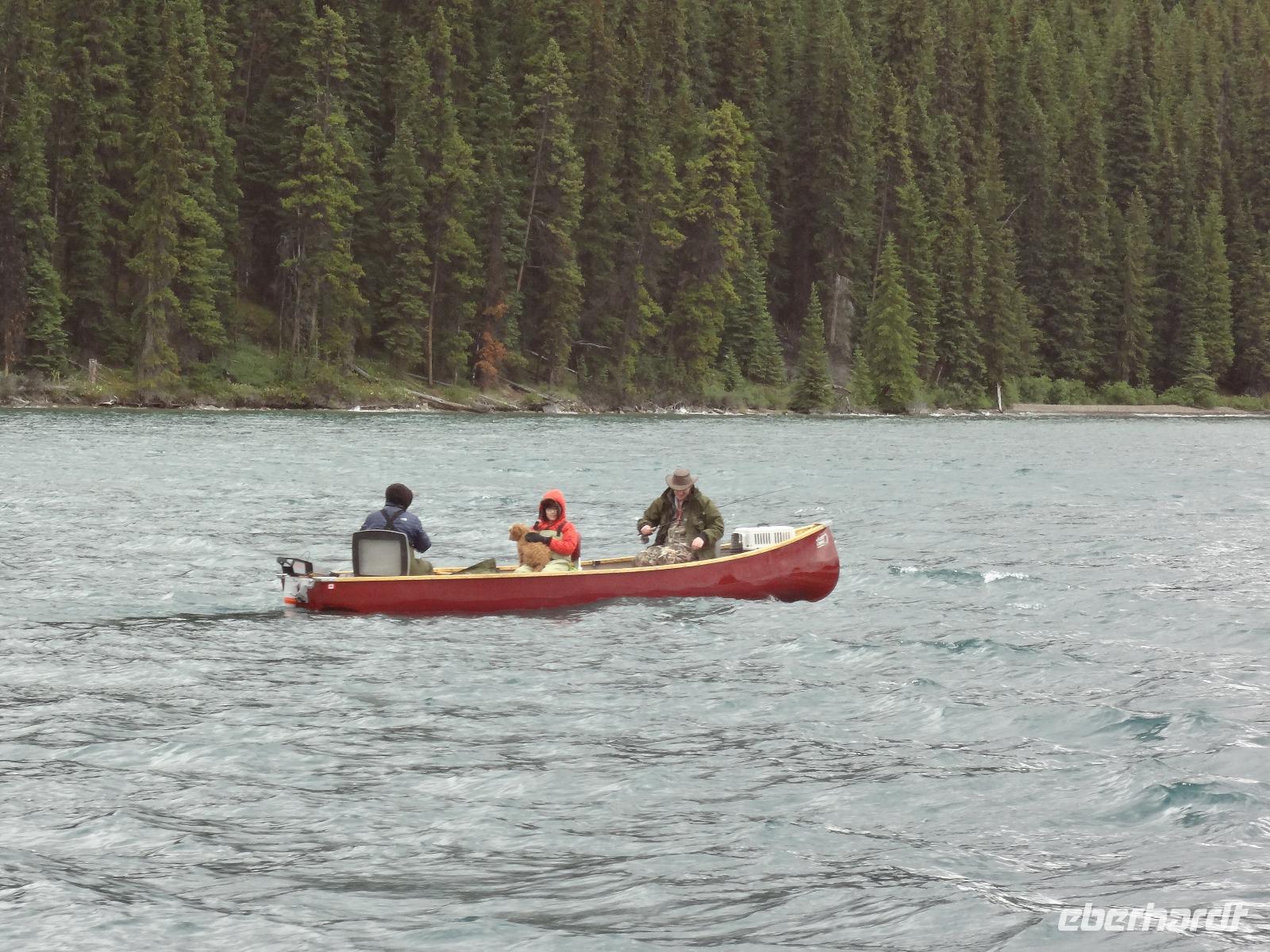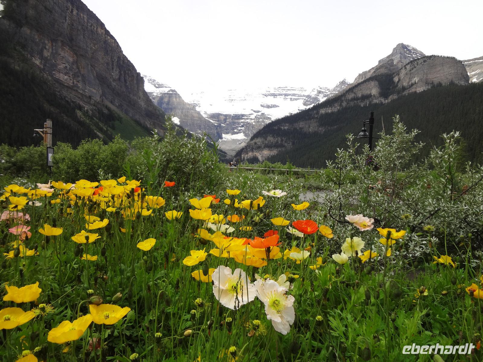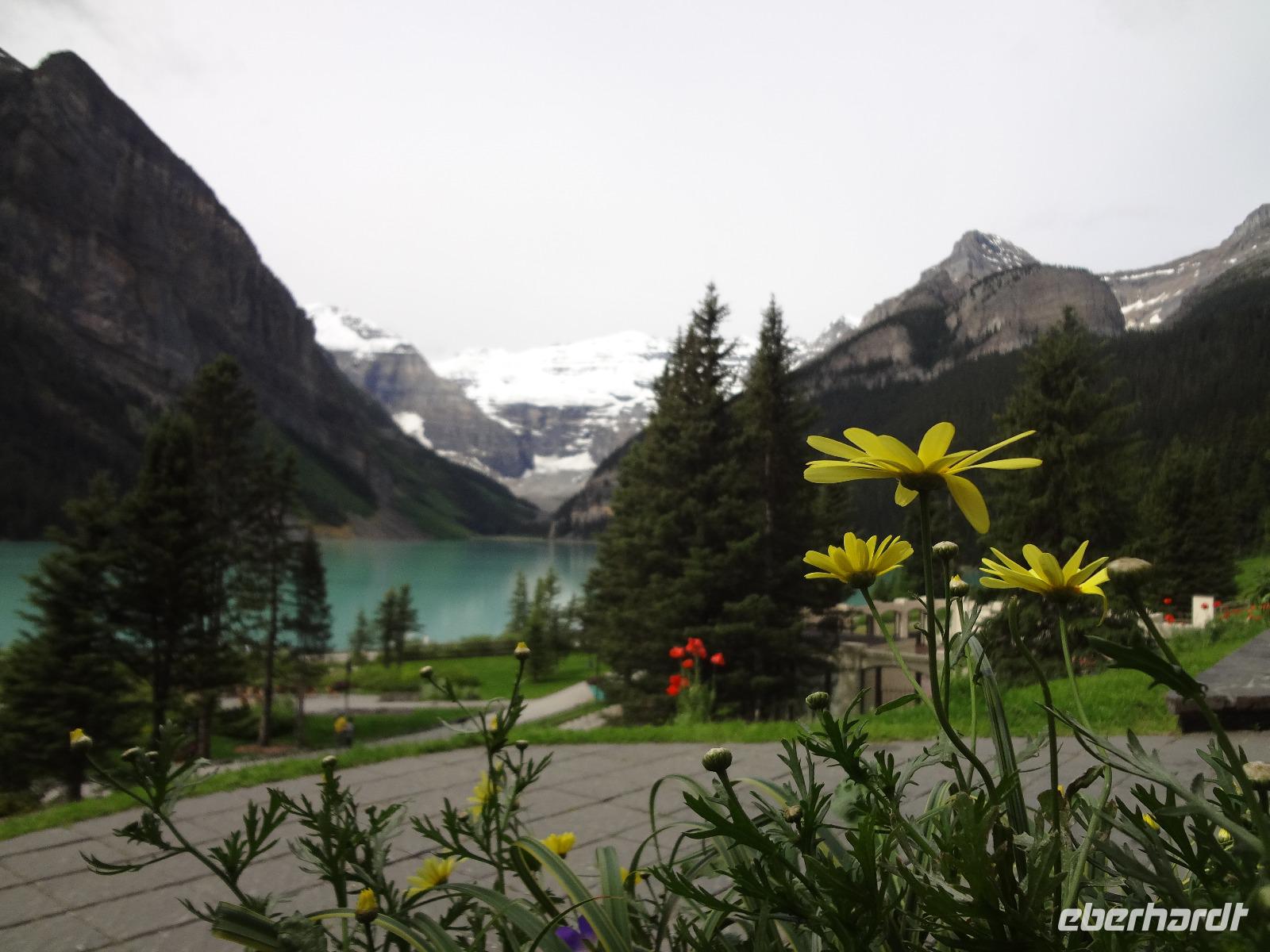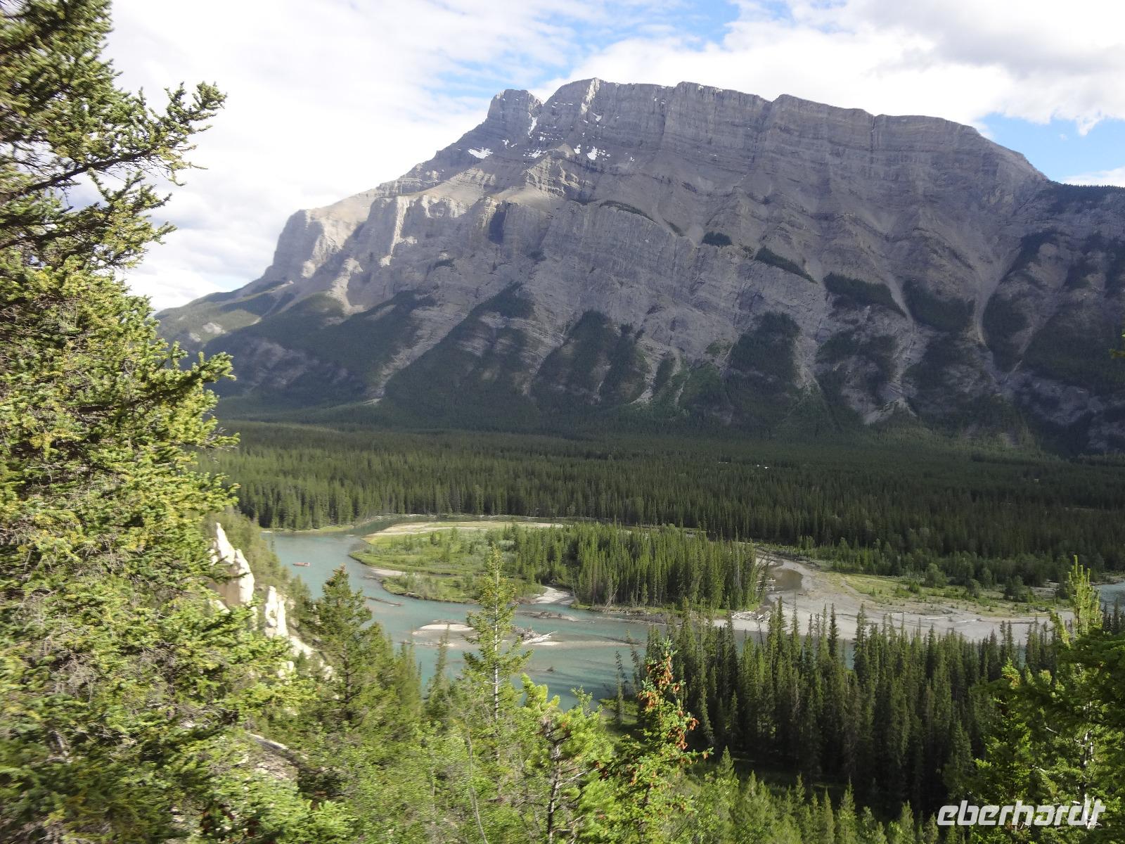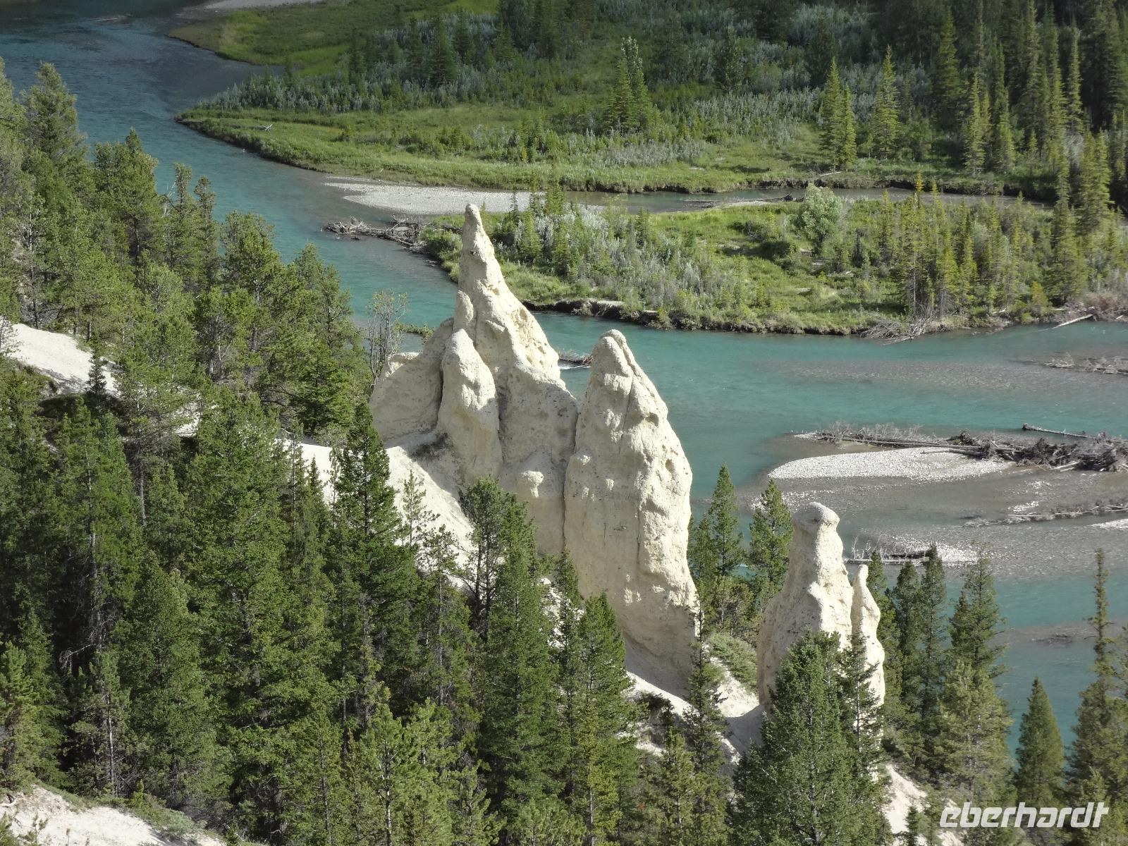 Dring, dring geht das Telefon schon um 6:30 ! Wir sind eh alle schon wach und warten bloss auf das Zeichen, dass wir bald schon an das feine Fruehstuecksmuesli kommen von welchem so geschwaermt wird. Nach dem tollen Fruehstueck gehts auf unseren Seen-Tag. Als erstes besuchen wir Lake Moraine. Nun verstehen wir auch, weshalb gerade dieser See auf der alten kanadischen 20 Dollar Note verewigt wurde. Ganz verzaubert fahren wir weiter zum Lake Louise wo wir als erstes natuerlich die Mona Lisa der Rocky Mountains von innen besuchen und das obligate Foto knipsen auf Elisabeth's Terrasse ! Wahrlich herrlich diese Aussicht, die Blumen leuchten, der Victoria Gletscher glitzert, der See liegt ruhig und die Sonne lacht, besser geht es gar nicht. Genau wie im Prospekt. Am Nachmittag haben wir noch vieles vor, vorerst schauen wir uns das Modell der Spiralen Tunnel an. Ein Fest der Ingenieure, nur leider kommt gerade kein Zug vorbei ! Es ist eben Kei-na-da! Im Yoho National Park besuchen wir den Emerald Lake und danach halten wir mitten im Wald an um uns den tobenden Kicking Horse River anzuschauen wie er unter einer natuerlichen Steinbruecke durchstoebt. Ein Energie geladener, toller Anblick. Die naechste Etappe sind die Takakawa Falls, mit 384 Meter, die 2. groessten Wasserfaelle Britisch Columbiens. Vor dieser imposanten Kulisse packen nun Goran und Elisabeth, die Party Zutaten aus. Kanadischen Weiss- und Rotwein sowie Kookanie Bier, Chips und Snacks werden aufgetischt und die Party kann beginnen. Lustig fahren wir wieder zurueck in den Banff National Park. Da in den Spiral Tunnels bewegt sich ein Zug. Die vielen Wagons fahren in den Berg und man sieht denselben Zug wieder aus einem anderen Tunnel hinausfahren ! Toll. Wir besuchen bei Banff die Hoodoos die wie Geister entlang des Tales dastehen und knipsen noch schoene Bilder vom beruehmten Banff Springs Hotel. Weiter geht die Fahrt nach Banff hinein, wo wir auch im Stau stecken bleiben. Ganze 5 Minuten !!! Es ist heute Feiertag und Banff ist zum bersten voll. Ein feines Abendessen in einem nahegelegenen Restaurant rundet diesen wunderschoenen Tag ab. Nur einige unter uns bleiben noch so lange wach um das Feuerwerk zu sehen.