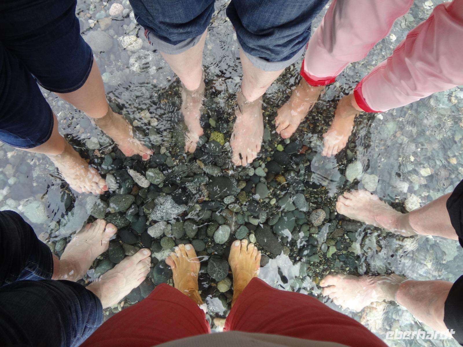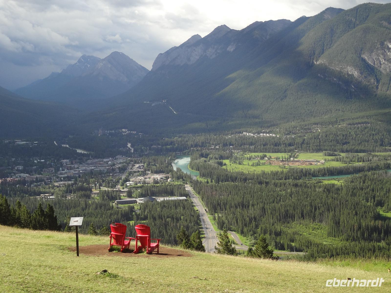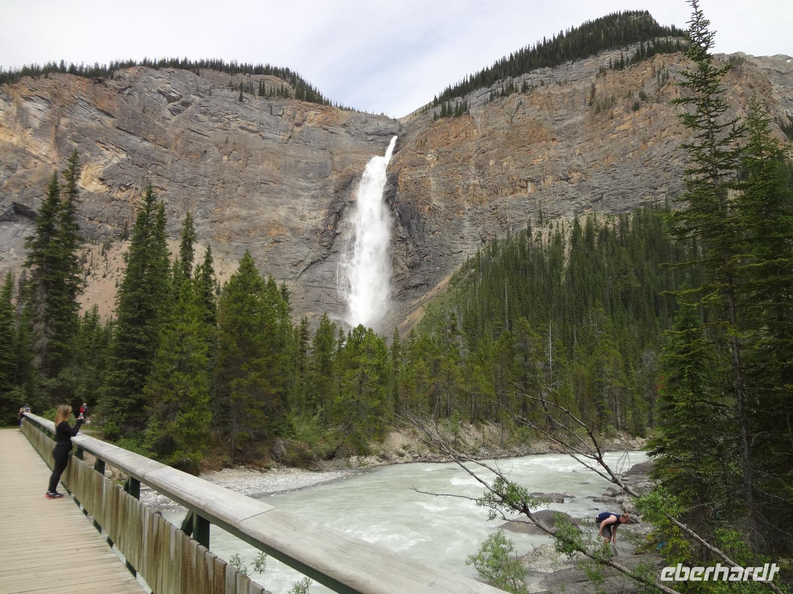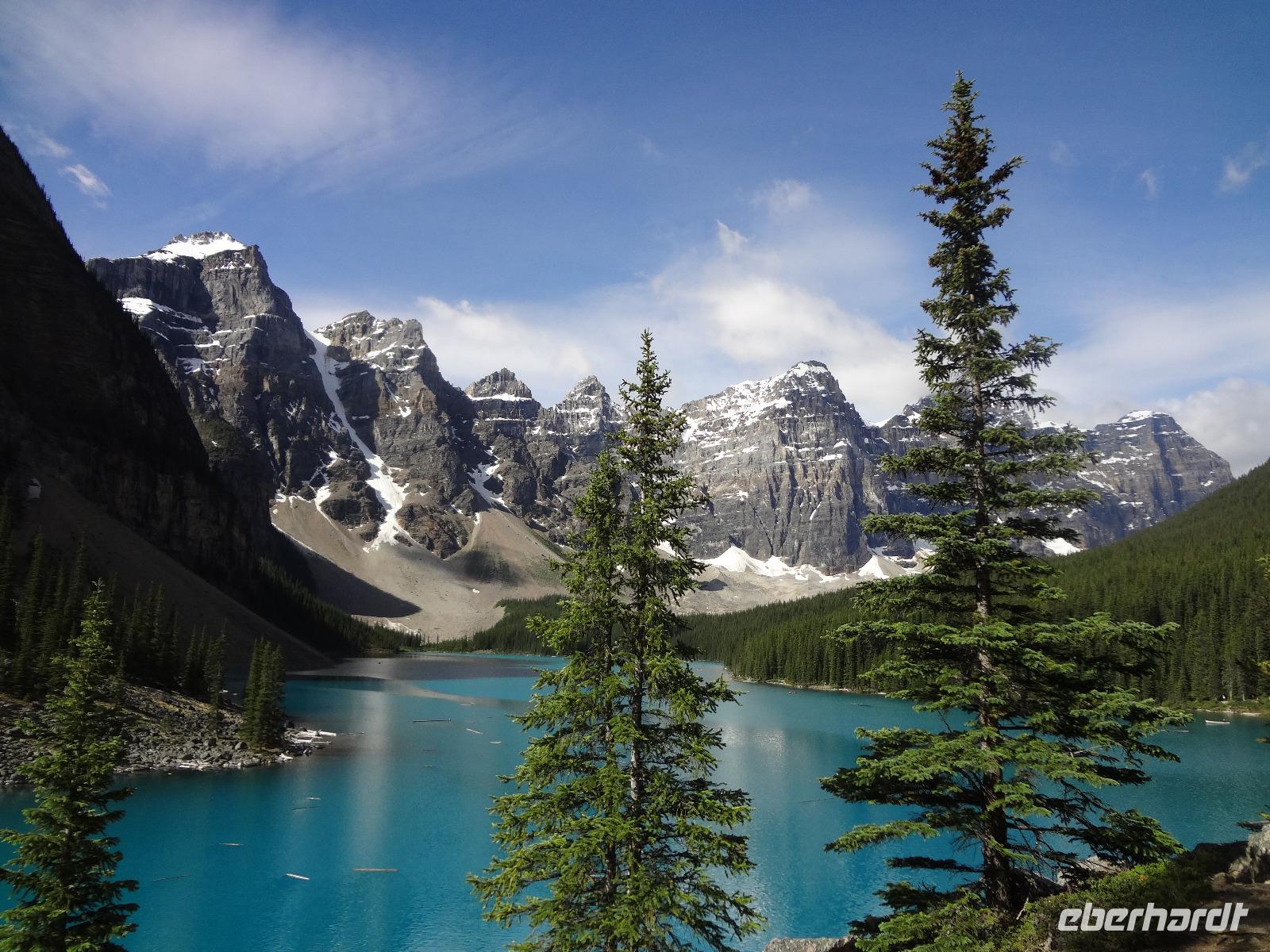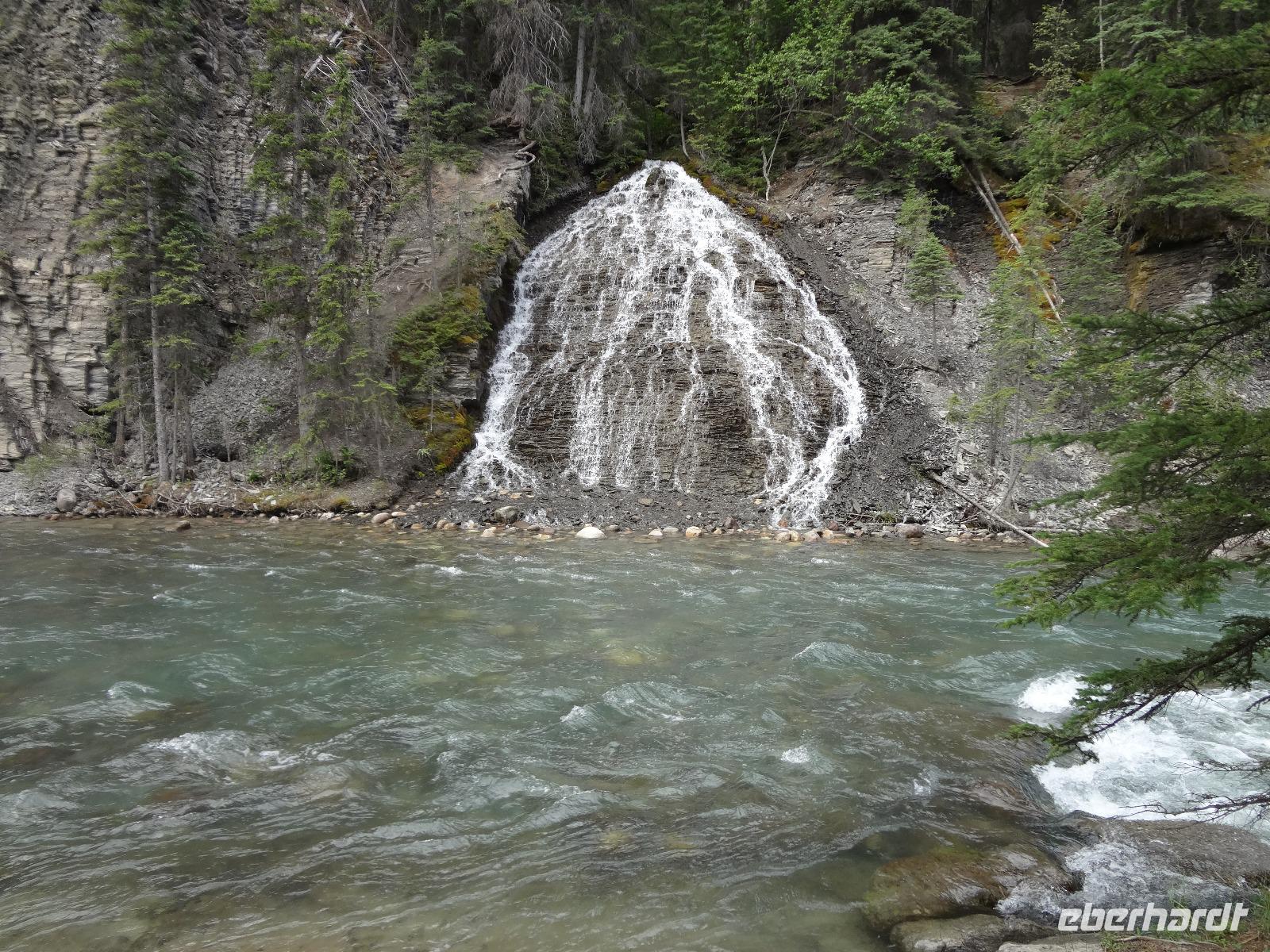 Dring, dring geht das Telefon schon um 6:30 ! Wir sind eh alle schon wach und warten bloss auf das Zeichen, dass wir bald schon an das feine Fruehstuecksmuesli kommen von welchem so geschwaermt wird. Nach dem tollen Fruehstueck gehts auf unseren Seen-Tag. Als erstes besuchen wir Lake Moraine. Nun verstehen wir auch, weshalb gerade dieser See auf der alten kanadischen 20 Dollar Note verewigt wurde. Ganz verzaubert fahren wir weiter zum Lake Louise wo wir als erstes natuerlich die Mona Lisa der Rocky Mountains von innen besuchen und das obligate Foto knipsen auf Elisabeth's Terrasse ! Wahrlich herrlich diese Aussicht, die Blumen leuchten, der Victoria Gletscher glitzert, der See liegt ruhig und die Sonne lacht, besser geht es gar nicht. Genau wie im Prospekt. Am Nachmittag haben wir noch vieles vor, vorerst schauen wir uns das Modell der Spiralen Tunnel an. Ein Fest der Ingenieure, nur leider kommt gerade kein Zug vorbei ! Es ist eben Kei-na-da! Im Yoho National Park besuchen wir den Emerald Lake und danach halten wir mitten im Wald an um uns den tobenden Kicking Horse River anzuschauen wie er unter einer natuerlichen Steinbruecke durchstoebt. Ein Energie geladener, toller Anblick. Die naechste Etappe sind die Takakawa Falls, mit 384 Meter, die 2. groessten Wasserfaelle Britisch Columbiens. Vor dieser imposanten Kulisse packen nun Goran und Elisabeth, die Party Zutaten aus. Kanadischen Weiss- und Rotwein sowie Kookanie Bier, Chips und Snacks werden aufgetischt und die Party kann beginnen. Lustig fahren wir wieder zurueck in den Banff National Park. Da in den Spiral Tunnels bewegt sich ein Zug. Die vielen Wagons fahren in den Berg und man sieht denselben Zug wieder aus einem anderen Tunnel hinausfahren ! Toll. Wir besuchen bei Banff die Hoodoos die wie Geister entlang des Tales dastehen und knipsen noch schoene Bilder vom beruehmten Banff Springs Hotel. Weiter geht die Fahrt nach Banff hinein, wo wir auch im Stau stecken bleiben. Ganze 5 Minuten !!! Es ist heute Feiertag und Banff ist zum bersten voll. Ein feines Abendessen in einem nahegelegenen Restaurant rundet diesen wunderschoenen Tag ab. Nur einige unter uns bleiben noch so lange wach um das Feuerwerk zu sehen.