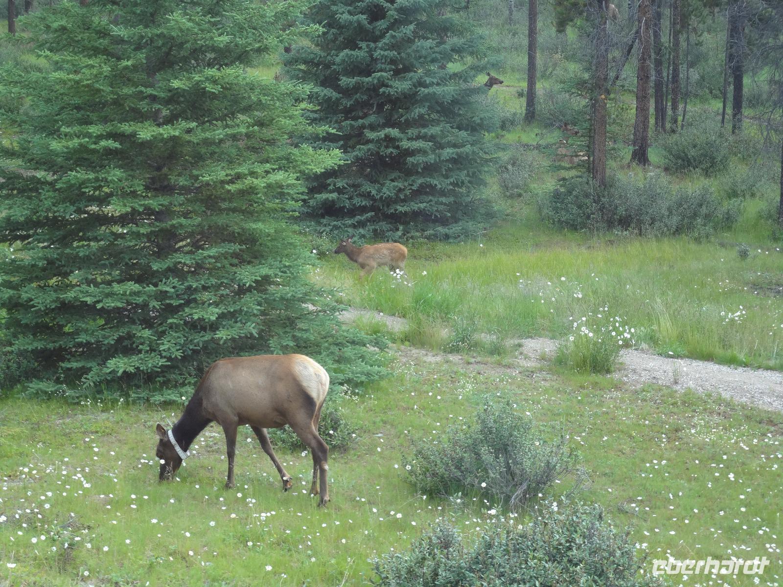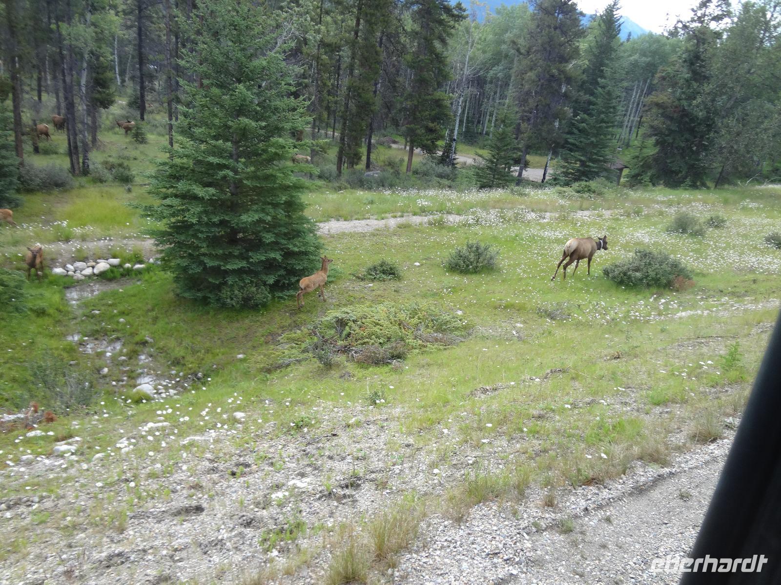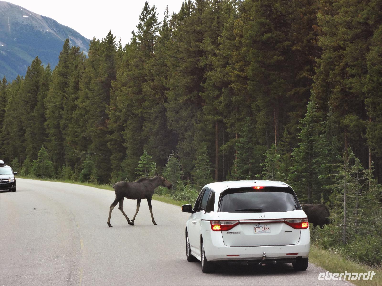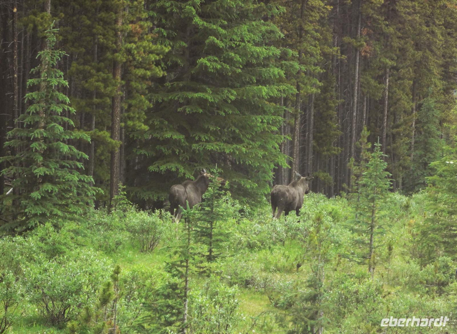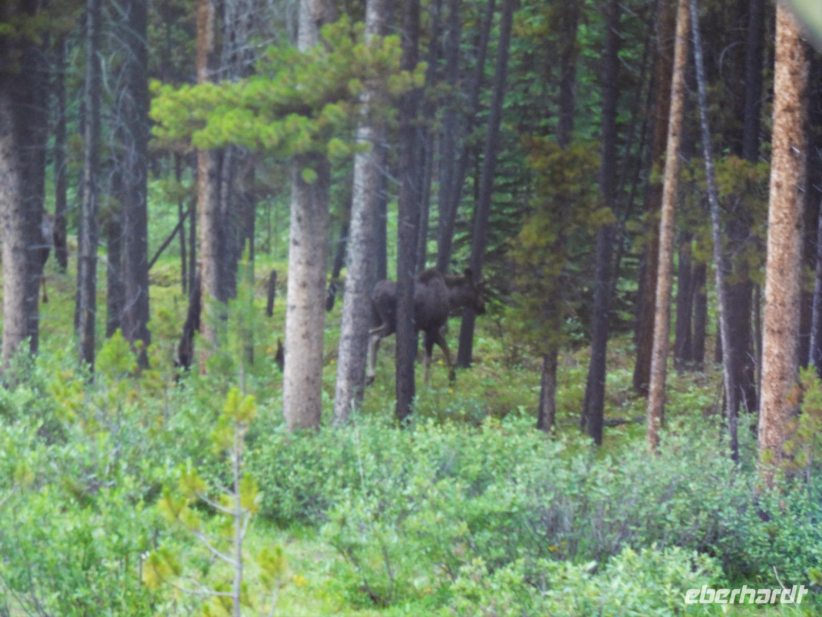 Die Sonne lacht, lacht nicht, lacht, lacht gar nicht, lacht wieder voll.....Es scheint, dass wenn wir im Bus sind regnet es und sobald wir aussteigen ist klarer Sonnenschein und so gehen wir heute auch auf eine schoene Wanderung der Maligne Schlucht entlang. Ehe wir in Jasper jedoch ankommen, sehen wir ploetzlich 4, nein 6, nein, ganz viele Wapitidamen mit ihren Kitz grasen. Sie stehen ganz gemuetlich neben der Hauptstrasse und lassen sich nicht aus der Ruhe bringen. Unterdessen stehen bereits 20 Autos und einige Busse da und die Leute knipsen alle wie wild um doch noch das allerbeste Bild zu ergattern. Auch wir schauen natuerlich zu und wissen noch nicht, dass nach einer halben Stunde Fahrt wir auf unseren ersten Schwarzbaeren treffen werden. Er ist noch ganz jung und hat ein glaenzendes schwarzes Fell, mit seinen niedlichen Ohren, erinnern wir uns gerne an Heidis Geschichten von gestern Abend. Gluecklich ueber diesen Wildbeobachtungs-Erfolg, geht es nun auf unsere Wanderung. Alle kommen mit und wir geniessen diese schoene Zeit. Im Kaffee, am Zielort schauen wir uns noch im Gift Shop um und fahren dann gleich weiter, dem Medicin Lake entlang bis zum Maligne See. Noch ein Schwarzbaer, dieses mal ein aelteres Tier zeigt sich und wir koennen unser Glueck kaum fassen. 2 Baeren. Mittagspause ist, ehe wir das Schiff besteigen um die beruehmte Spirit Island zu besuchen. Es ist kaum zu glauben, soeben regnete es wieder und alsbald wir bei der Insel anlegen, reisst der Himmel auf und die Sonne kommt wieder durch. Nach diesem besonderen Erlebnis fahren wir gemuetlich nach Jasper haben aber gleich wieder einen Wild-Erfolg zu verzeichnen. 2 Moose gehen gerade ueber die Strasse und einige von uns haben Zeit sie zu knipsen. Was fuer ein Glueck, Moose sind naemlich sehr scheu und zeigen sich nur sehr selten. Wieder in Jasper schauen wir uns dort noch um und fahren dann weiter zu den Athabasca Faellen wo wir unser Maskottchen (ausgestopftes Moose) auch taufen wollen. Wir haben uns auf den Namen Hardy Moosel geeinigt ! So wird Eberhardt, Moose und Elisabeth zusammengeschweisst. Nach der lustigen Taufe gehts zurueck zu unserer Lodge wo ein leckeres Abendessen auf uns wartet. Heute nacht werden wir alle von den 2 Schwarzbaeren, den Wapitihirschen und den 2 Moose traeumen. Es war ein wahrlich herrlicher Tag.