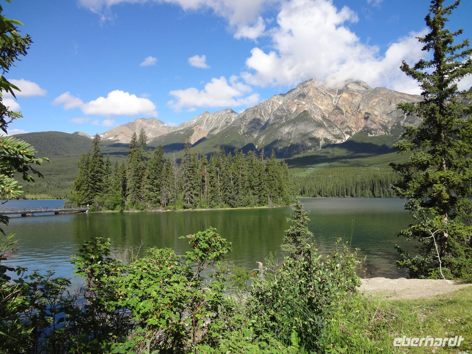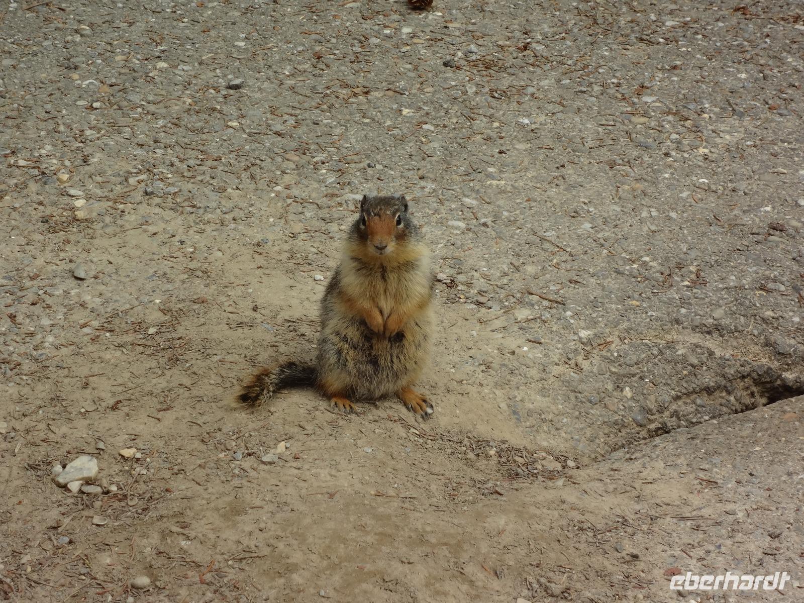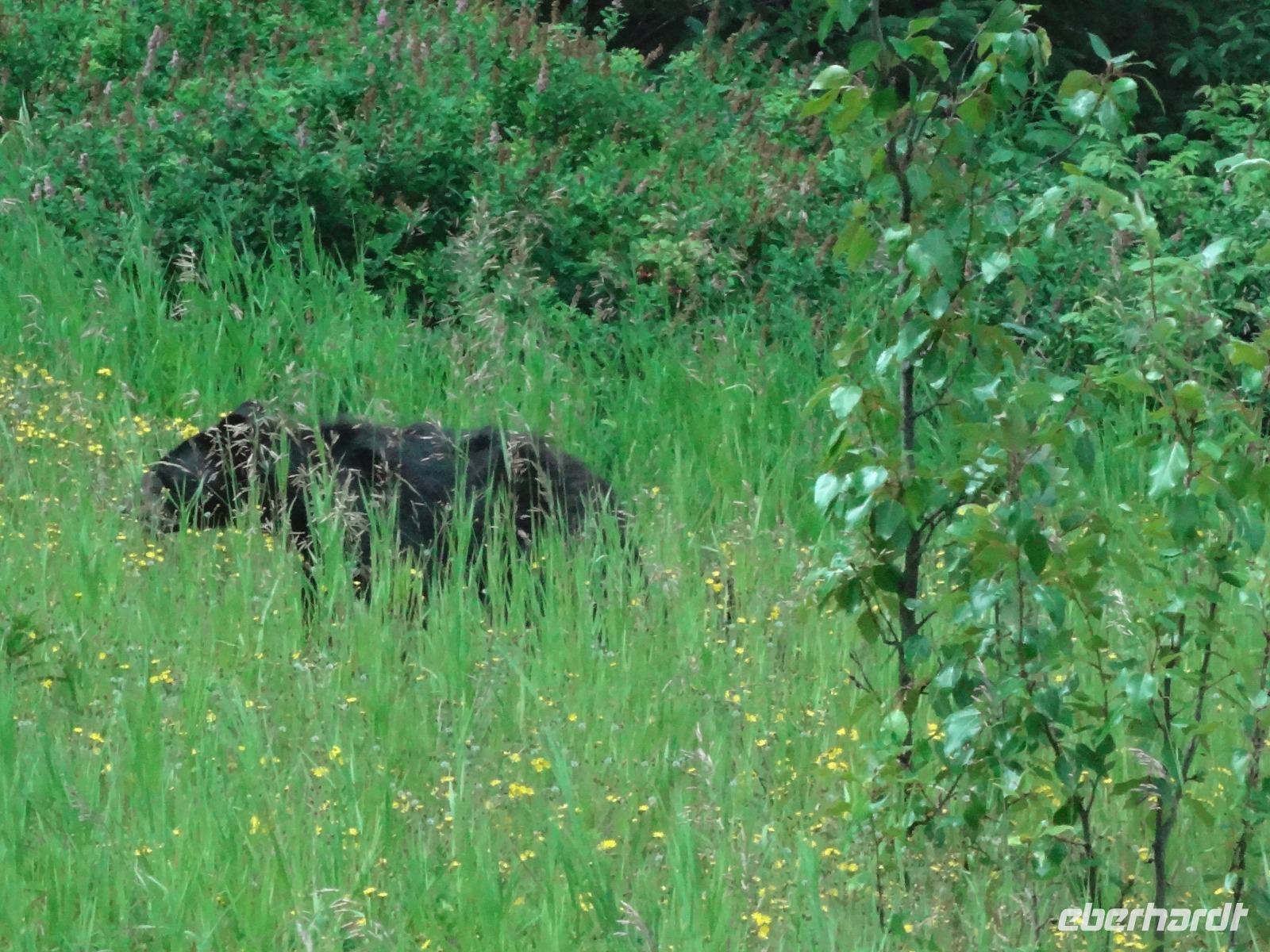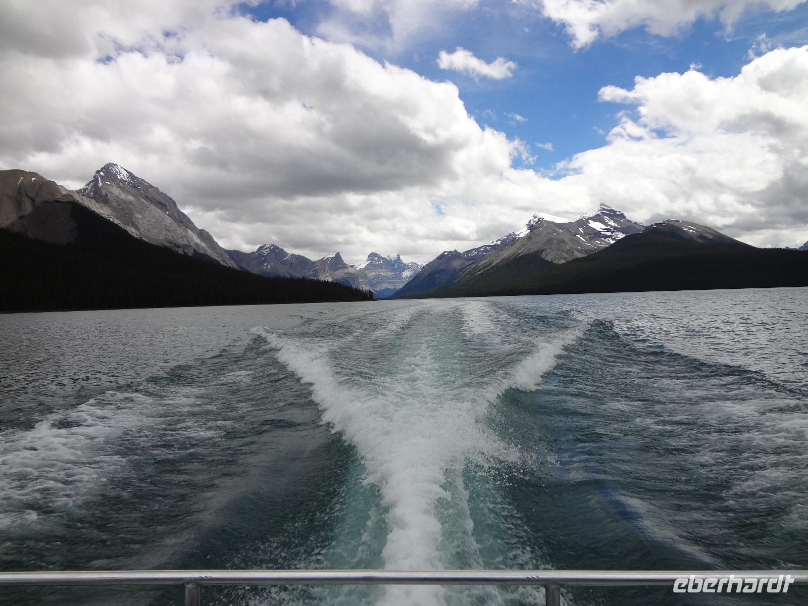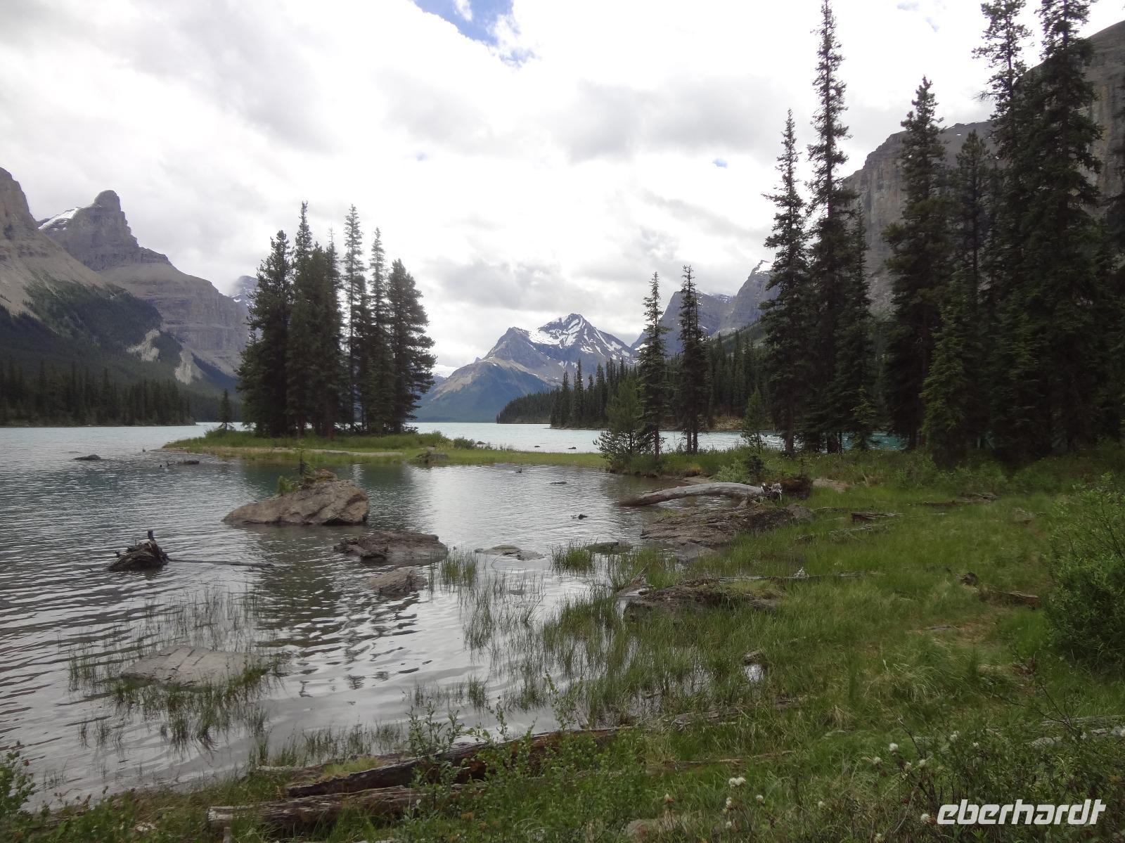 Die Sonne lacht, lacht nicht, lacht, lacht gar nicht, lacht wieder voll.....Es scheint, dass wenn wir im Bus sind regnet es und sobald wir aussteigen ist klarer Sonnenschein und so gehen wir heute auch auf eine schoene Wanderung der Maligne Schlucht entlang. Ehe wir in Jasper jedoch ankommen, sehen wir ploetzlich 4, nein 6, nein, ganz viele Wapitidamen mit ihren Kitz grasen. Sie stehen ganz gemuetlich neben der Hauptstrasse und lassen sich nicht aus der Ruhe bringen. Unterdessen stehen bereits 20 Autos und einige Busse da und die Leute knipsen alle wie wild um doch noch das allerbeste Bild zu ergattern. Auch wir schauen natuerlich zu und wissen noch nicht, dass nach einer halben Stunde Fahrt wir auf unseren ersten Schwarzbaeren treffen werden. Er ist noch ganz jung und hat ein glaenzendes schwarzes Fell, mit seinen niedlichen Ohren, erinnern wir uns gerne an Heidis Geschichten von gestern Abend. Gluecklich ueber diesen Wildbeobachtungs-Erfolg, geht es nun auf unsere Wanderung. Alle kommen mit und wir geniessen diese schoene Zeit. Im Kaffee, am Zielort schauen wir uns noch im Gift Shop um und fahren dann gleich weiter, dem Medicin Lake entlang bis zum Maligne See. Noch ein Schwarzbaer, dieses mal ein aelteres Tier zeigt sich und wir koennen unser Glueck kaum fassen. 2 Baeren. Mittagspause ist, ehe wir das Schiff besteigen um die beruehmte Spirit Island zu besuchen. Es ist kaum zu glauben, soeben regnete es wieder und alsbald wir bei der Insel anlegen, reisst der Himmel auf und die Sonne kommt wieder durch. Nach diesem besonderen Erlebnis fahren wir gemuetlich nach Jasper haben aber gleich wieder einen Wild-Erfolg zu verzeichnen. 2 Moose gehen gerade ueber die Strasse und einige von uns haben Zeit sie zu knipsen. Was fuer ein Glueck, Moose sind naemlich sehr scheu und zeigen sich nur sehr selten. Wieder in Jasper schauen wir uns dort noch um und fahren dann weiter zu den Athabasca Faellen wo wir unser Maskottchen (ausgestopftes Moose) auch taufen wollen. Wir haben uns auf den Namen Hardy Moosel geeinigt ! So wird Eberhardt, Moose und Elisabeth zusammengeschweisst. Nach der lustigen Taufe gehts zurueck zu unserer Lodge wo ein leckeres Abendessen auf uns wartet. Heute nacht werden wir alle von den 2 Schwarzbaeren, den Wapitihirschen und den 2 Moose traeumen. Es war ein wahrlich herrlicher Tag.