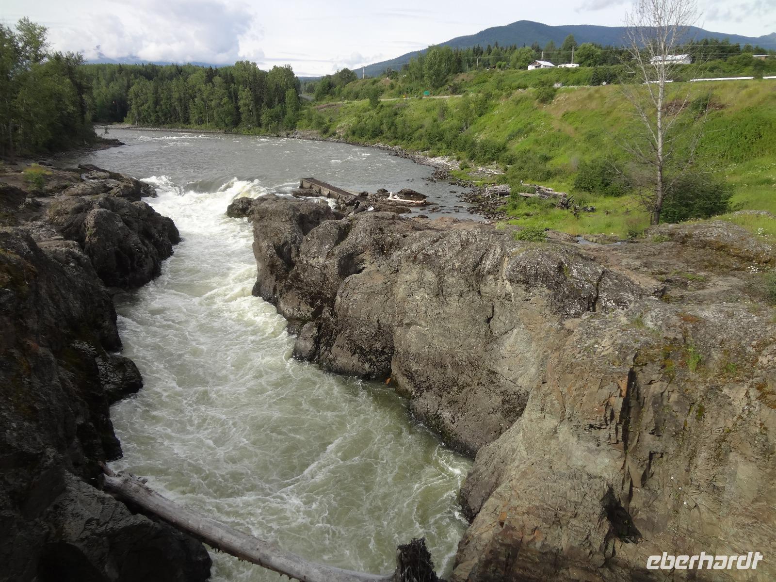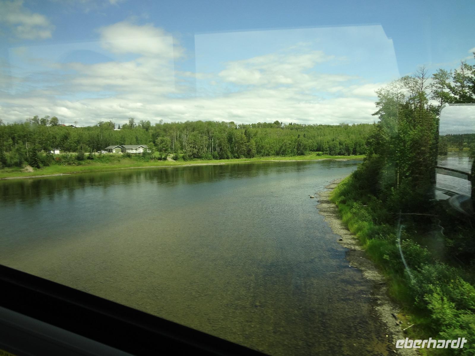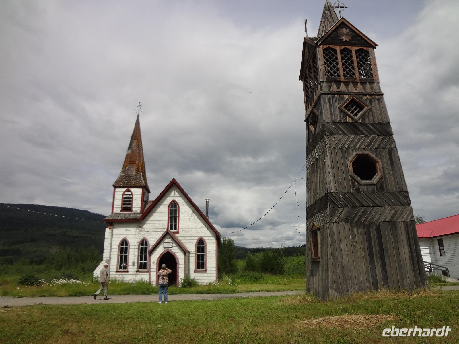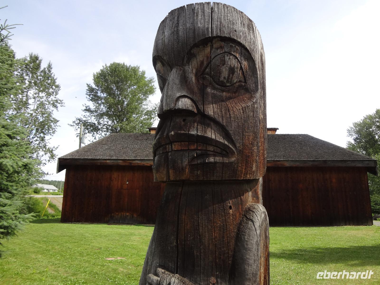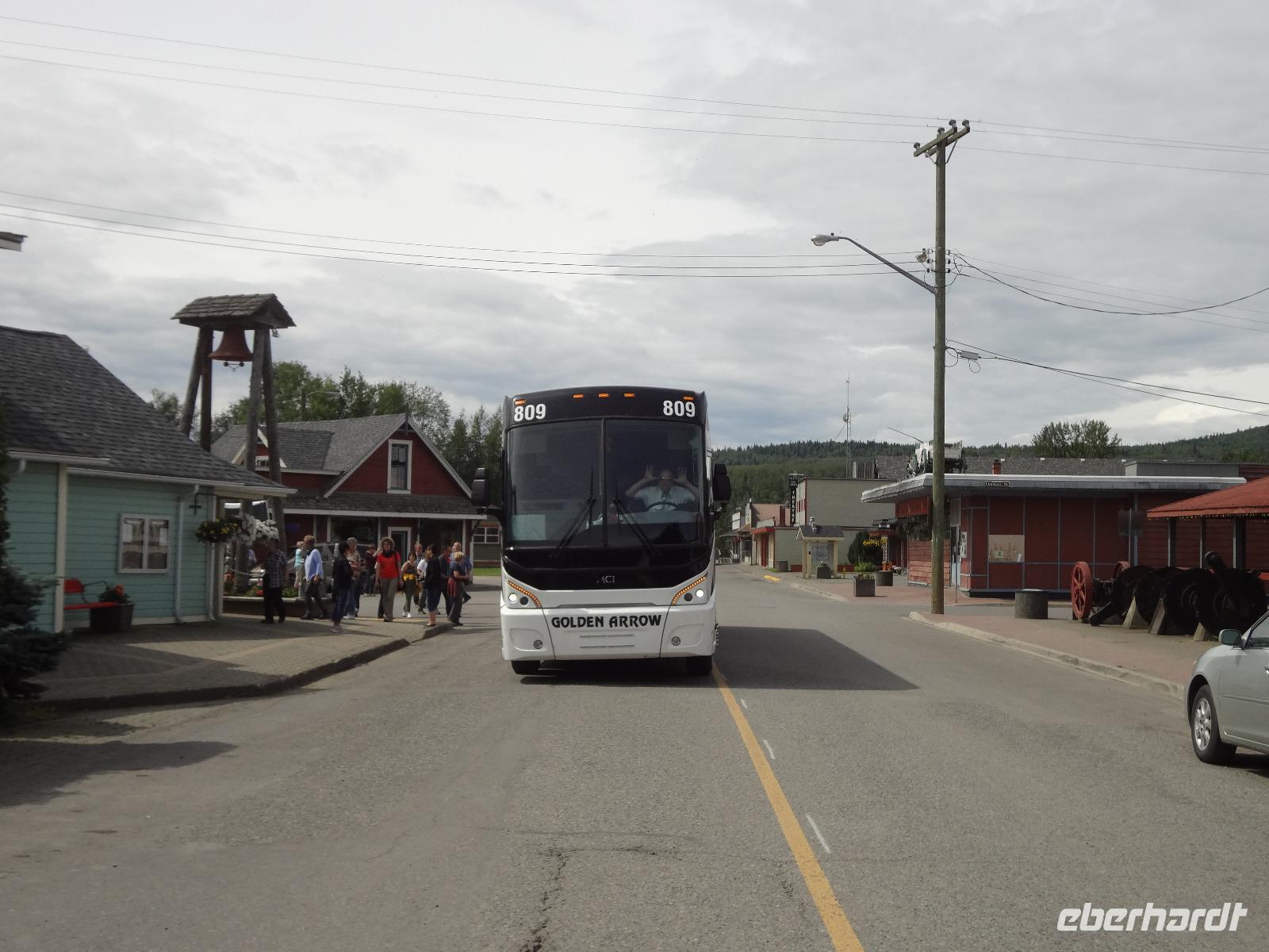 Bei Nebel wachen wir heute in Prince George auf aber das kanadische Fruehstueck wirkt Wunder. Blauer Himmel zeigt sich, sobald wir mit den Koffern den Bus beladen wollen. Heute ist unser Kolonialzeit-Tag. Wir erfahren Lebensgeschichten von Pionieren, besprechen die Goldgraeberzeit und besuchen das einmalige Fort St James, ein ehemaliger Handelsposten der Hudsons Bay Company. Dieses Freilichtmuseum haelt uns im Bann. Wir werden geradezu in die Welt von 1850 versetzt und besprechen den Preis eines Biebers mit der Lagerfrau, wundern uns ueber den langen Weg des geschriebenen Briefes nach Europa und schauen uns die Einschussloecher der Trapper an. Wir nehmen auch gleich unser Mittagessen im Fort ein. Zu Herrn Franz's Geburtstag stossen wir heute mit kanadischem Whiskey an, ehe wir mit unserem Bus durch das Reservat der Carrier Nation in Richtung Smithers fahren. Wir checken auch gleich ins Hotel ein, beziehen unsere Zimmer und treffen uns 10 Minuten spaeter zu einer Wanderung. Alle kommen mit, sogar unser Fahrer Goran strampelt mit seinem Fahrrad neben uns her. Die Lachse im Bulkley River koennen wir nicht sehen, da das Wasser aufgewirbelt und deshalb braun ist. Nach diesem willkommenenn Spaziergang, wandern wir gleich weiter zu einem grossen Supermarkt wo wir unser Picknick fuer Morgen einkaufen. Goran hat unterdessen mit seinem Fahrrad den Bus im Hotel geholt und kommt zum Supermarkt zur Abholung. Einige gehen nun gleich ins Dorf Smithers zum Abendbrot und jene die es dazugebucht haben werden zum Hotel gefahren. Das Abendessen wird naemlich im Hotel serviert. Das Haehnchen in dem Privatsaal schmeckt vorzueglich und der Gedicht Vortrag eines Gastes hat uns sehr gefallen.
