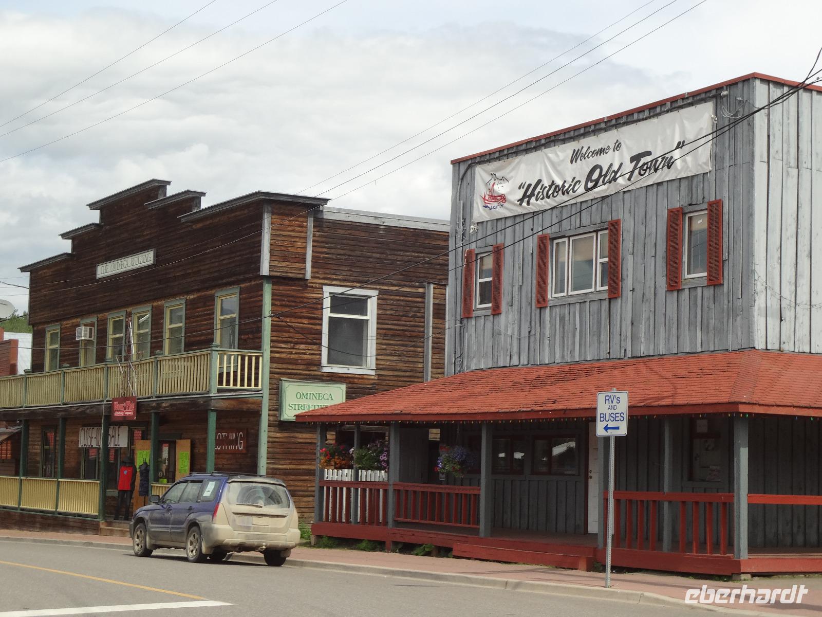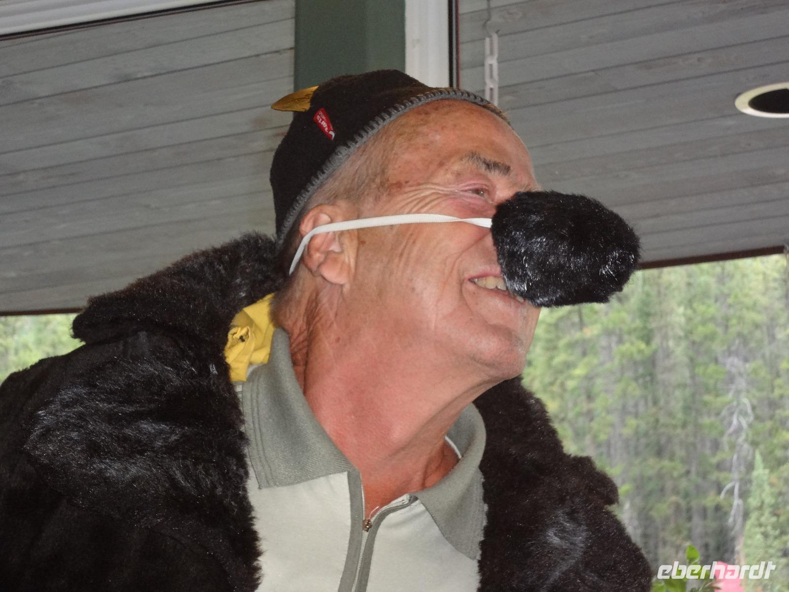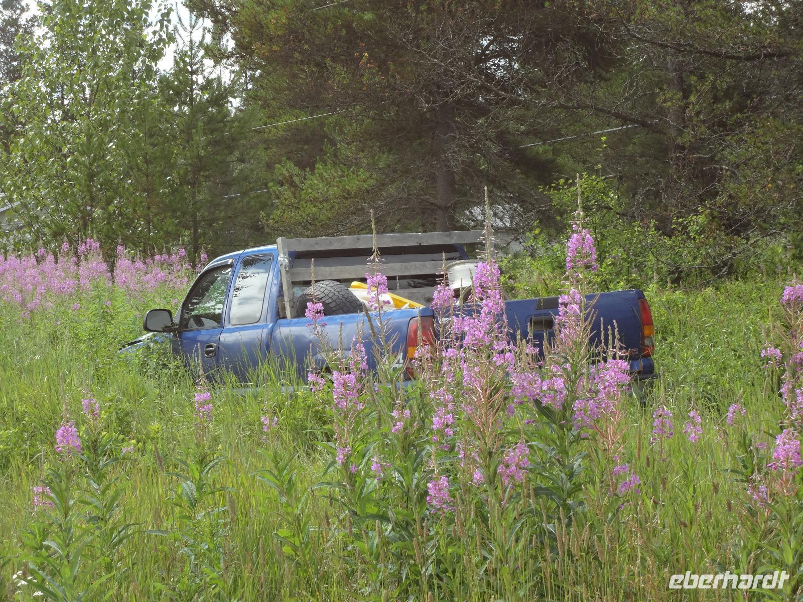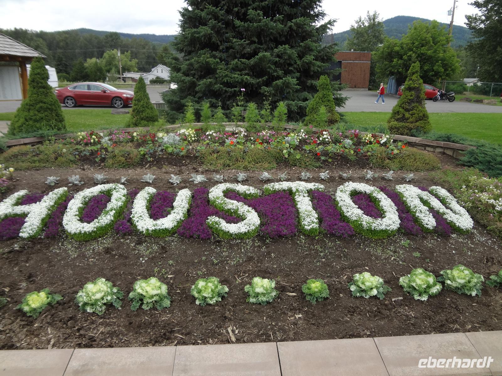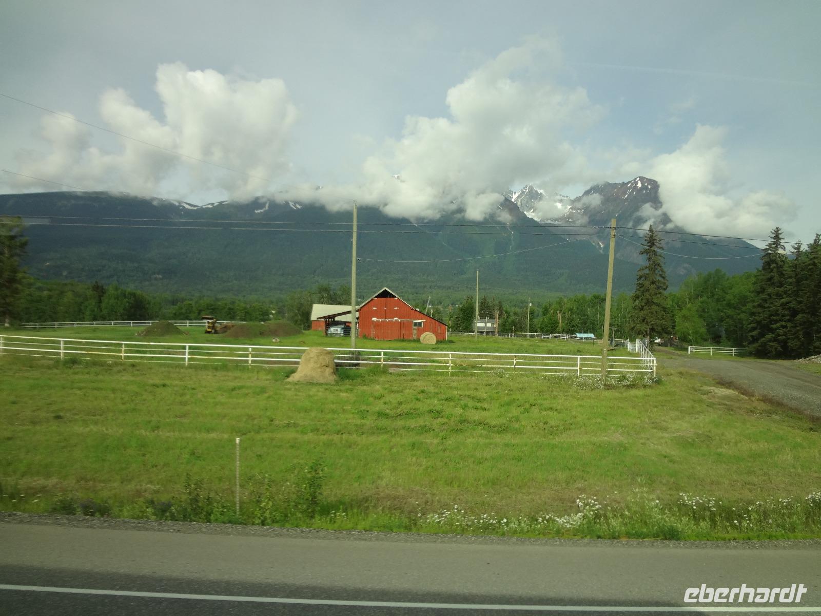 Bei Nebel wachen wir heute in Prince George auf aber das kanadische Fruehstueck wirkt Wunder. Blauer Himmel zeigt sich, sobald wir mit den Koffern den Bus beladen wollen. Heute ist unser Kolonialzeit-Tag. Wir erfahren Lebensgeschichten von Pionieren, besprechen die Goldgraeberzeit und besuchen das einmalige Fort St James, ein ehemaliger Handelsposten der Hudsons Bay Company. Dieses Freilichtmuseum haelt uns im Bann. Wir werden geradezu in die Welt von 1850 versetzt und besprechen den Preis eines Biebers mit der Lagerfrau, wundern uns ueber den langen Weg des geschriebenen Briefes nach Europa und schauen uns die Einschussloecher der Trapper an. Wir nehmen auch gleich unser Mittagessen im Fort ein. Zu Herrn Franz's Geburtstag stossen wir heute mit kanadischem Whiskey an, ehe wir mit unserem Bus durch das Reservat der Carrier Nation in Richtung Smithers fahren. Wir checken auch gleich ins Hotel ein, beziehen unsere Zimmer und treffen uns 10 Minuten spaeter zu einer Wanderung. Alle kommen mit, sogar unser Fahrer Goran strampelt mit seinem Fahrrad neben uns her. Die Lachse im Bulkley River koennen wir nicht sehen, da das Wasser aufgewirbelt und deshalb braun ist. Nach diesem willkommenenn Spaziergang, wandern wir gleich weiter zu einem grossen Supermarkt wo wir unser Picknick fuer Morgen einkaufen. Goran hat unterdessen mit seinem Fahrrad den Bus im Hotel geholt und kommt zum Supermarkt zur Abholung. Einige gehen nun gleich ins Dorf Smithers zum Abendbrot und jene die es dazugebucht haben werden zum Hotel gefahren. Das Abendessen wird naemlich im Hotel serviert. Das Haehnchen in dem Privatsaal schmeckt vorzueglich und der Gedicht Vortrag eines Gastes hat uns sehr gefallen.