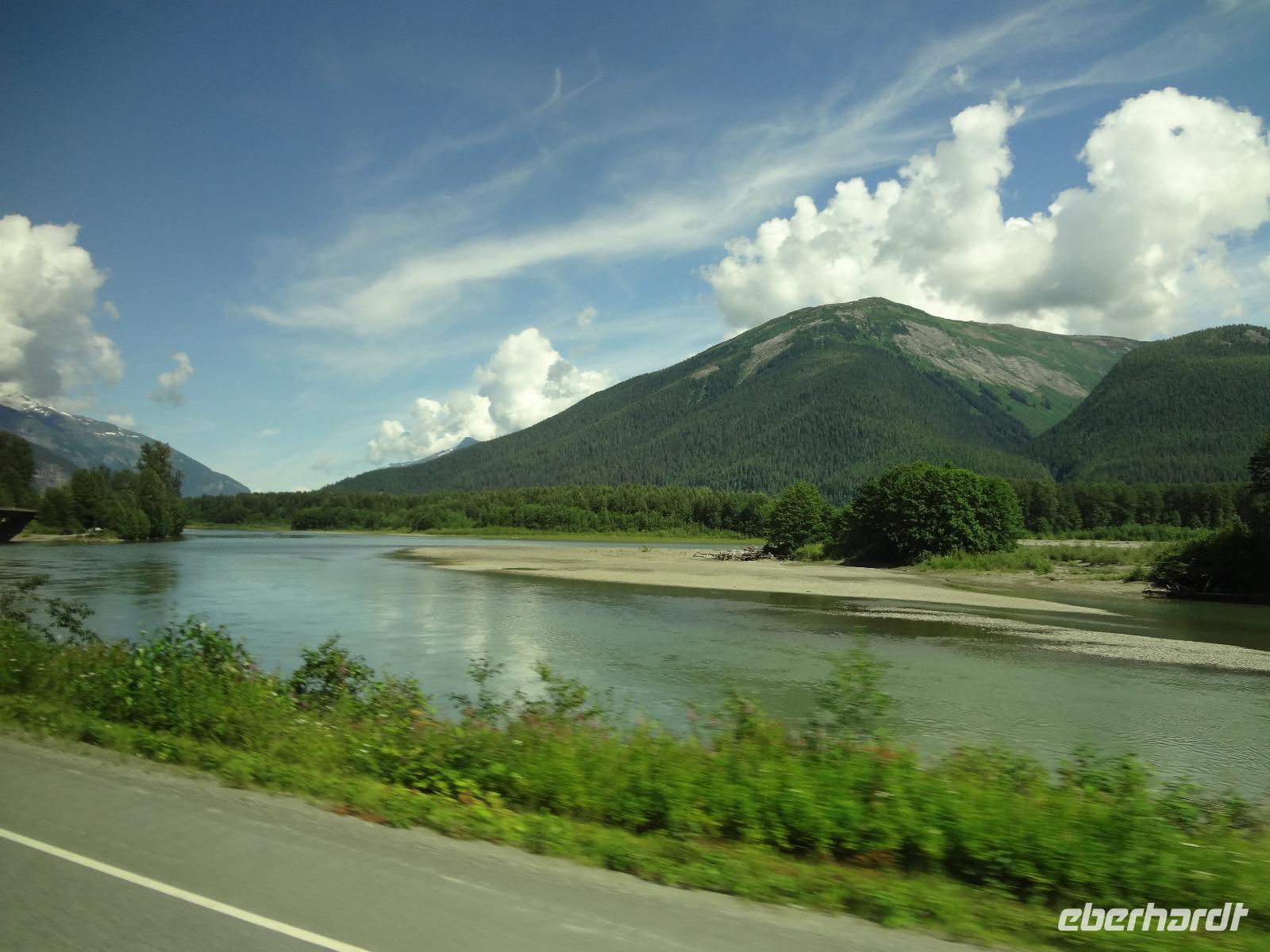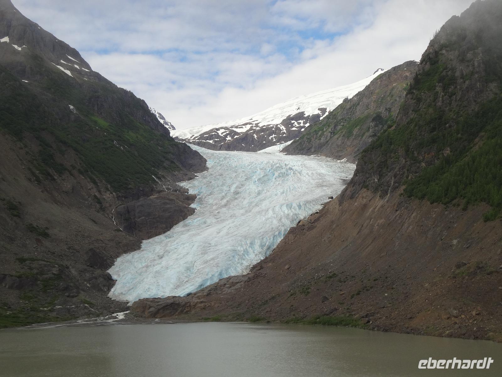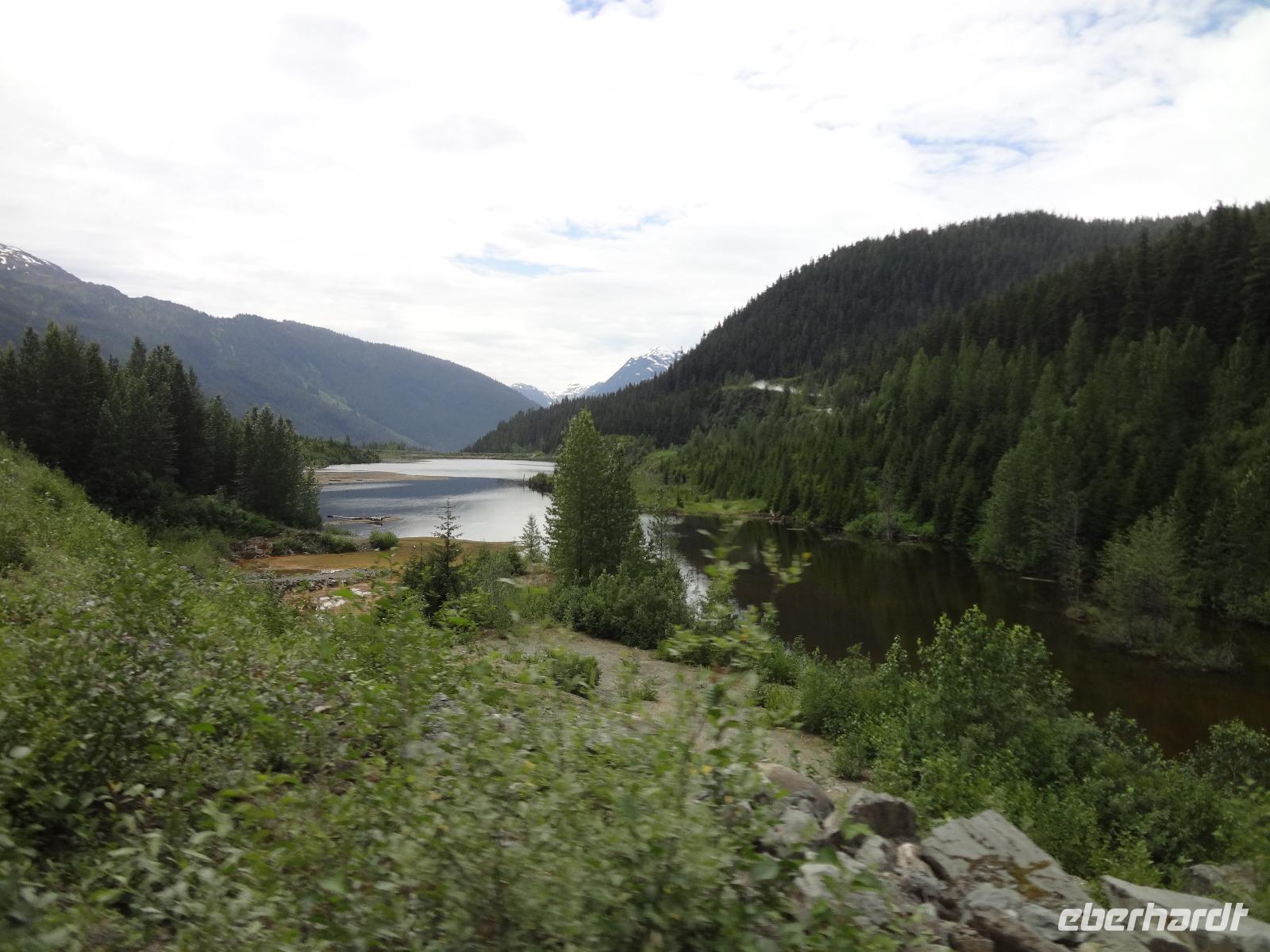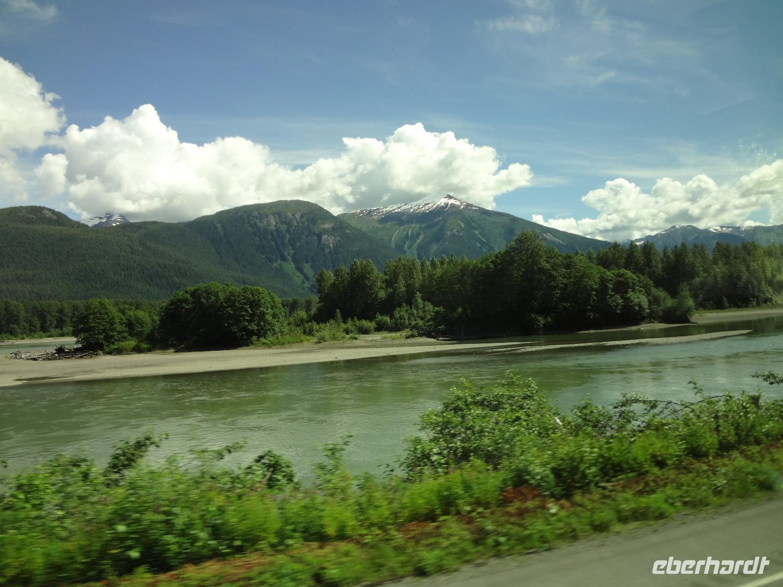Bei Sonnenschein fahren wir heute von Smithers nach Stewart. Es ist unser „Indianer Tag". Vorerst machen wir Halt bei einer Bruecke des Bulkley Flusses in Morricetown. Hier fischen die Erste Nationen mit Fangnetzen und alsbald kommt auch schon ein Fischer mit seinem 5 Meter langen Fangnetz vorbei und versucht sein Glueck in diesem reissenden Fluss einen Lachs heraus zu holen. Zuviel Wasser und noch wenige Lachse im Bulkley lassen ihn seine Kunst nach 10 Minuten abbrechen. Wir fahren weiter nach Ksan, einem Freilichtmuseum der Gitskan Erste Nationen. Auf dem Weg dorthin reden wir viel ueber die Kultur, Sprache, Leben und die Braeuche der Gitskan und anderen Nationen. Am Strassenrand sehen wir noch einen Schwarzbaeren der gerade Beeren im Stehen frisst. Bloss ein Ehepaar konnte ihn fotografieren. Es ist Herr Scholz der heute auch Geburtstag feiert. Der Aufenthalt in Ksan ist sehr interessant und wir koennen in alle diese Langen Haeuser gehen wo wir auf deutsch sehr schoen und musikalisch unterzeichnet aufgeklaert werden ueber das Leben hier im Dorf der Leute der Ksan. Unser Pick Nick nehmen wir heute am Ufer des Skeena Flusses ein, gleich neben einem alten Raddampfer in dem Hudsons Bay Doerfchen Old Hazelton. Nach dem Essen treffen wir uns wieder zur Geburtstagsfeier mit kanadischem Champagner stossen wir aufs Wohl des Geburtstagskindes an. Angeheitert gehen wir zu Fuss nun ueber eine Stahlbruecke des Hagwiglet Canyon. Alle haben es geschafft. Zurueck im Bus gehts nun weiter in Richtung Terrace. Da sehen wir poetzlich eine Baeren Mutter mit ihrem Baby. So ein suesser kurzer Anblick, wir haben wirklich viel Baerenglueck ! Nun verlassen wir jedoch die Hwy 16 und zweigen auf die Hwy 37 Richtung Alaska ab. Gleich danach bestaunen wir Kitwanga, ein indianer Dorf mit herrlichen geschichtserzaehlenden Pfaehlen, so nennt man nun die Totem, so ist es politish korrekt, wenn auch etwas kompliziert und langatmig. Viele Fotos werden geknipst, Schatzilein vor, neben und hinter dem Totem ! Auf der Weiterfahrt nach Stewart sehen wir noch 2 Schwarzbaeren. Wir halten bei Baer Gletscher und hoffen, dass wir es auch sehen werden, wie ein Stueck Eis abbricht. Hmmmm... wir haben doch sehr viel Glueck auf dieser Reise...aber wir wollen es auch nicht herausfordern. Angekommen in Stewart beziehen wir unsere Zimmer und haben dann noch Zeit fuer einen Spaziergang runter ans Wasser auf dem Hochsteg. Der Weisskopfadler wird jedoch nur von jenen gesichtet die auch bis zur amerikanischen Grenze wandern. Das Abendbrot im Hotel war ein Weltreise, jeder speisst ein Rippchen, welches auf einem riesen Teller serviert wird und doch noch überlappt. Wir gehen auch gleich nochmals spazieren da der dicke Rippchenbauch nun wieder abgestrampelt werden muss. Danach gehts ab auf einen Drink in der hauseigenen Bar.