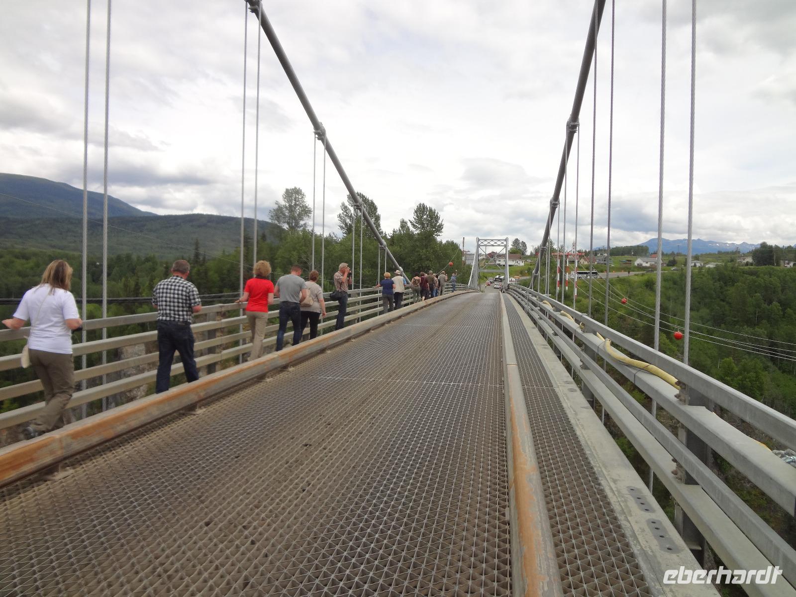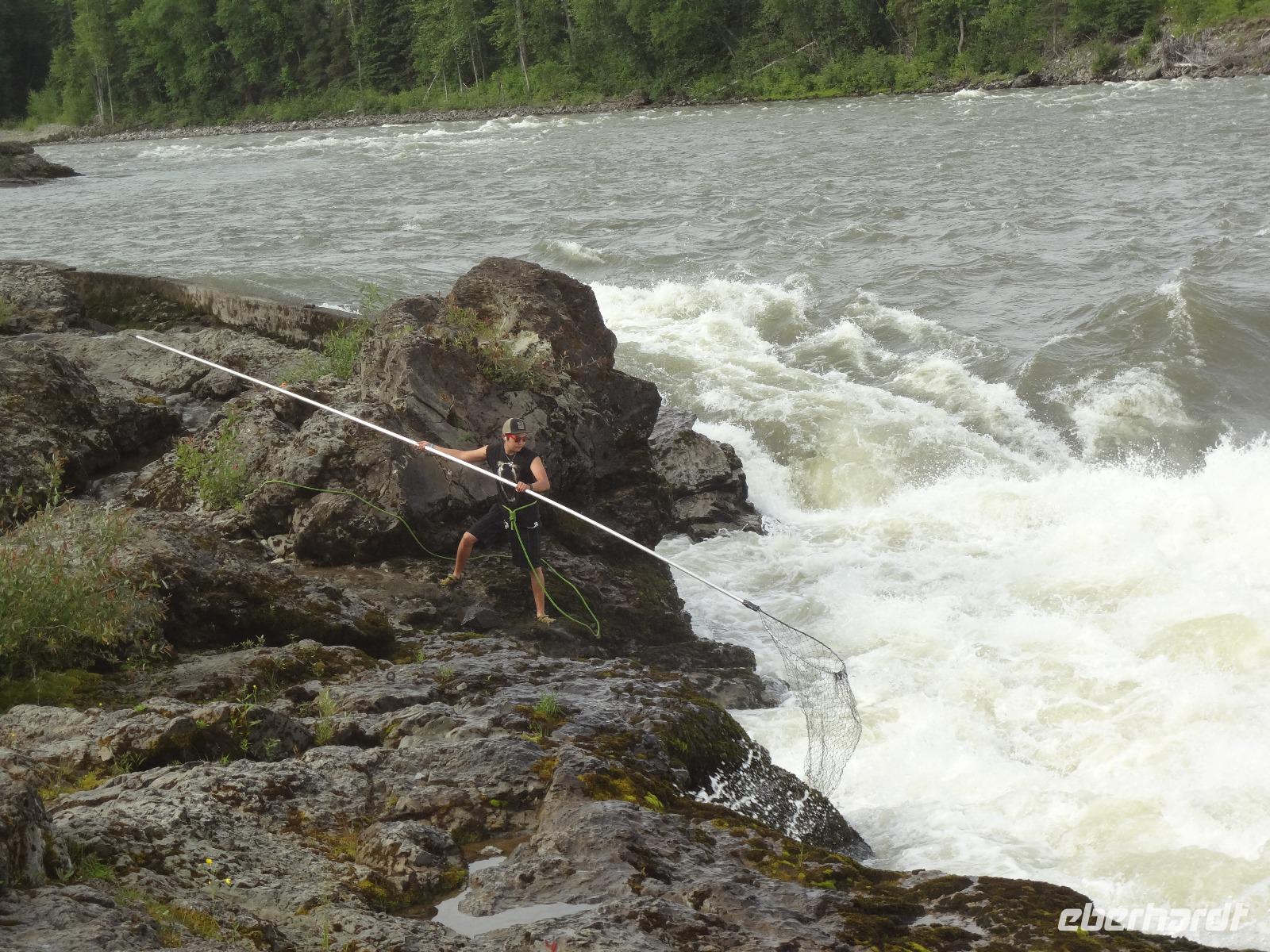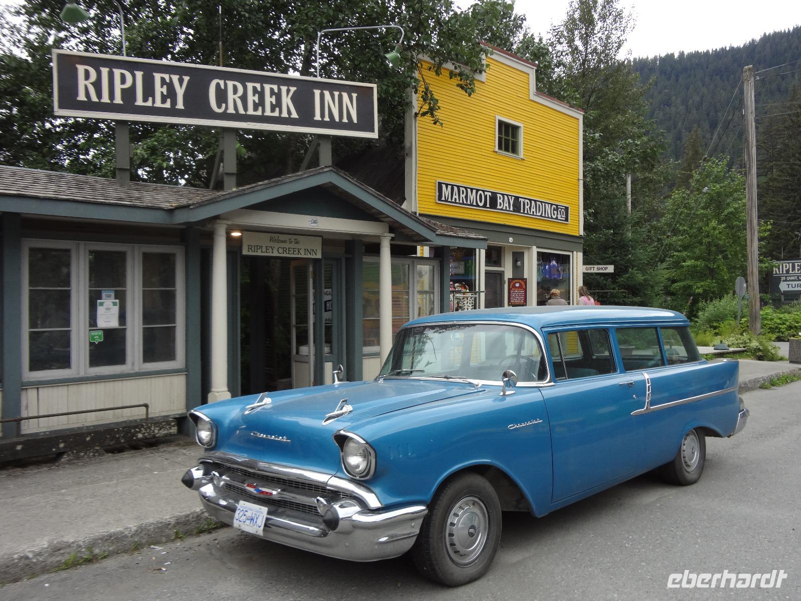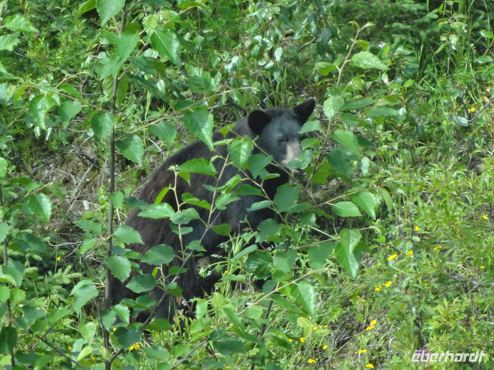 Bei Sonnenschein fahren wir heute von Smithers nach Stewart. Es ist unser „Indianer Tag". Vorerst machen wir Halt bei einer Bruecke des Bulkley Flusses in Morricetown. Hier fischen die Erste Nationen mit Fangnetzen und alsbald kommt auch schon ein Fischer mit seinem 5 Meter langen Fangnetz vorbei und versucht sein Glueck in diesem reissenden Fluss einen Lachs heraus zu holen. Zuviel Wasser und noch wenige Lachse im Bulkley lassen ihn seine Kunst nach 10 Minuten abbrechen. Wir fahren weiter nach Ksan, einem Freilichtmuseum der Gitskan Erste Nationen. Auf dem Weg dorthin reden wir viel ueber die Kultur, Sprache, Leben und die Braeuche der Gitskan und anderen Nationen. Am Strassenrand sehen wir noch einen Schwarzbaeren der gerade Beeren im Stehen frisst. Bloss ein Ehepaar konnte ihn fotografieren. Es ist Herr Scholz der heute auch Geburtstag feiert. Der Aufenthalt in Ksan ist sehr interessant und wir koennen in alle diese Langen Haeuser gehen wo wir auf deutsch sehr schoen und musikalisch unterzeichnet aufgeklaert werden ueber das Leben hier im Dorf der Leute der Ksan. Unser Pick Nick nehmen wir heute am Ufer des Skeena Flusses ein, gleich neben einem alten Raddampfer in dem Hudsons Bay Doerfchen Old Hazelton. Nach dem Essen treffen wir uns wieder zur Geburtstagsfeier mit kanadischem Champagner stossen wir aufs Wohl des Geburtstagskindes an. Angeheitert gehen wir zu Fuss nun ueber eine Stahlbruecke des Hagwiglet Canyon. Alle haben es geschafft. Zurueck im Bus gehts nun weiter in Richtung Terrace. Da sehen wir poetzlich eine Baeren Mutter mit ihrem Baby. So ein suesser kurzer Anblick, wir haben wirklich viel Baerenglueck ! Nun verlassen wir jedoch die Hwy 16 und zweigen auf die Hwy 37 Richtung Alaska ab. Gleich danach bestaunen wir Kitwanga, ein indianer Dorf mit herrlichen geschichtserzaehlenden Pfaehlen, so nennt man nun die Totem, so ist es politish korrekt, wenn auch etwas kompliziert und langatmig. Viele Fotos werden geknipst, Schatzilein vor, neben und hinter dem Totem ! Auf der Weiterfahrt nach Stewart sehen wir noch 2 Schwarzbaeren. Wir halten bei Baer Gletscher und hoffen, dass wir es auch sehen werden, wie ein Stueck Eis abbricht. Hmmmm... wir haben doch sehr viel Glueck auf dieser Reise...aber wir wollen es auch nicht herausfordern. Angekommen in Stewart beziehen wir unsere Zimmer und haben dann noch Zeit fuer einen Spaziergang runter ans Wasser auf dem Hochsteg. Der Weisskopfadler wird jedoch nur von jenen gesichtet die auch bis zur amerikanischen Grenze wandern. Das Abendbrot im Hotel war ein Weltreise, jeder speisst ein Rippchen, welches auf einem riesen Teller serviert wird und doch noch überlappt. Wir gehen auch gleich nochmals spazieren da der dicke Rippchenbauch nun wieder abgestrampelt werden muss. Danach gehts ab auf einen Drink in der hauseigenen Bar.