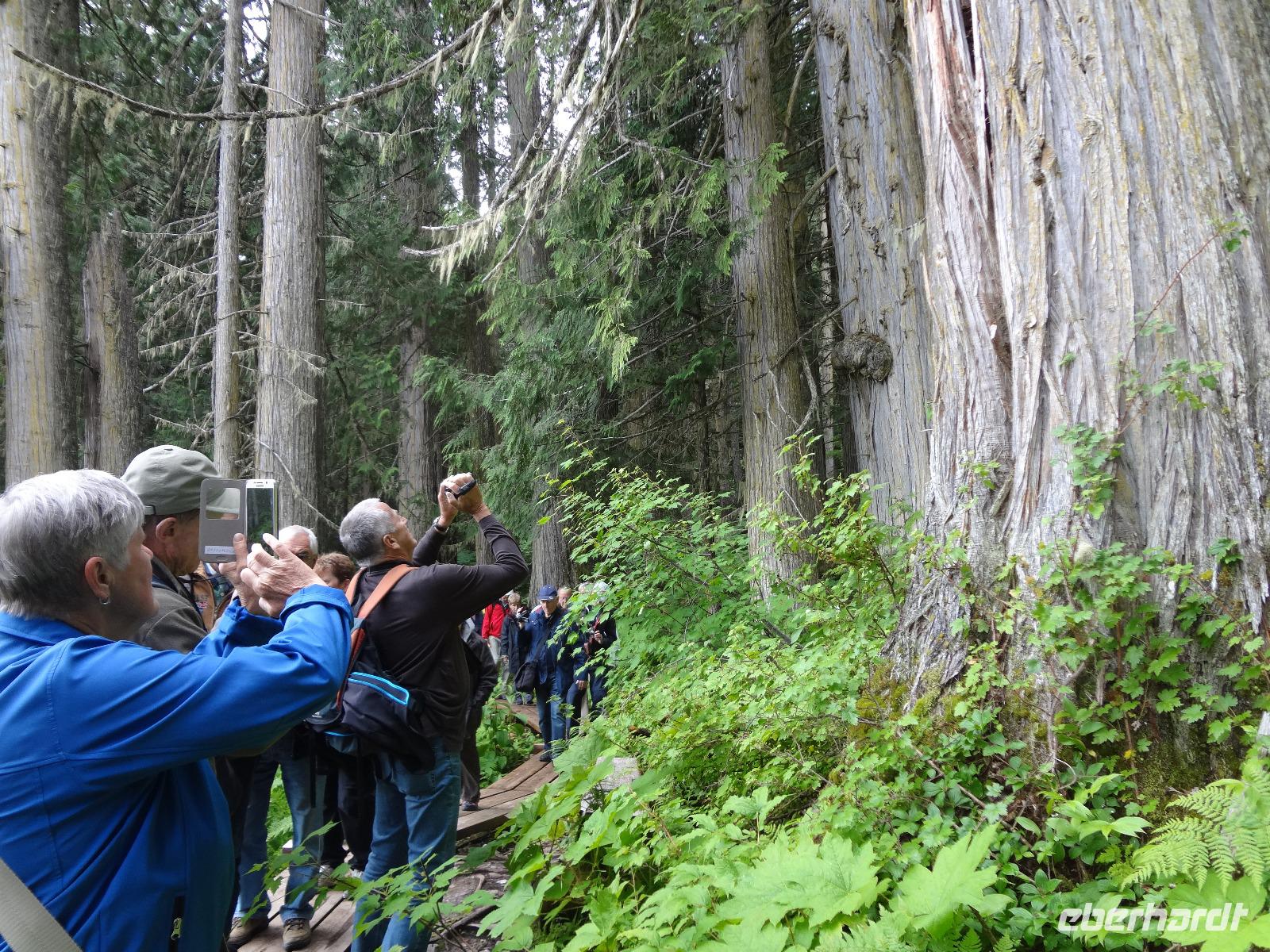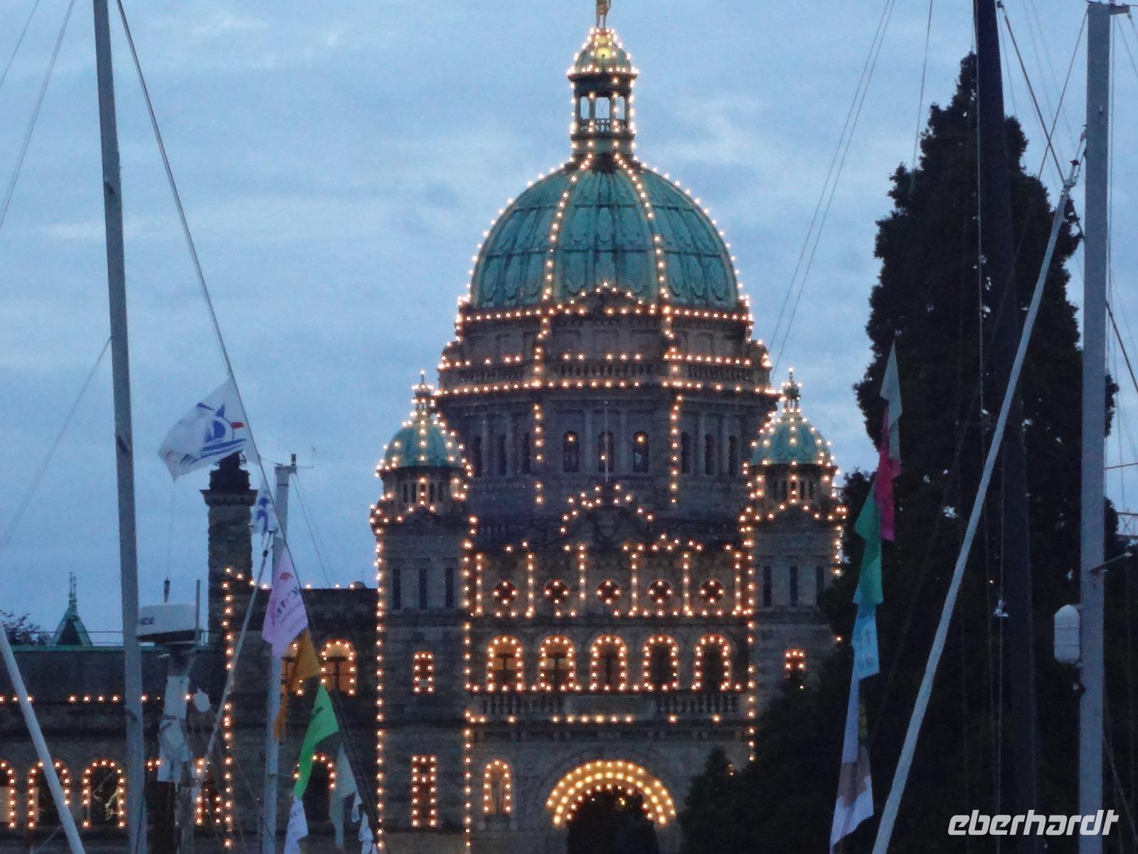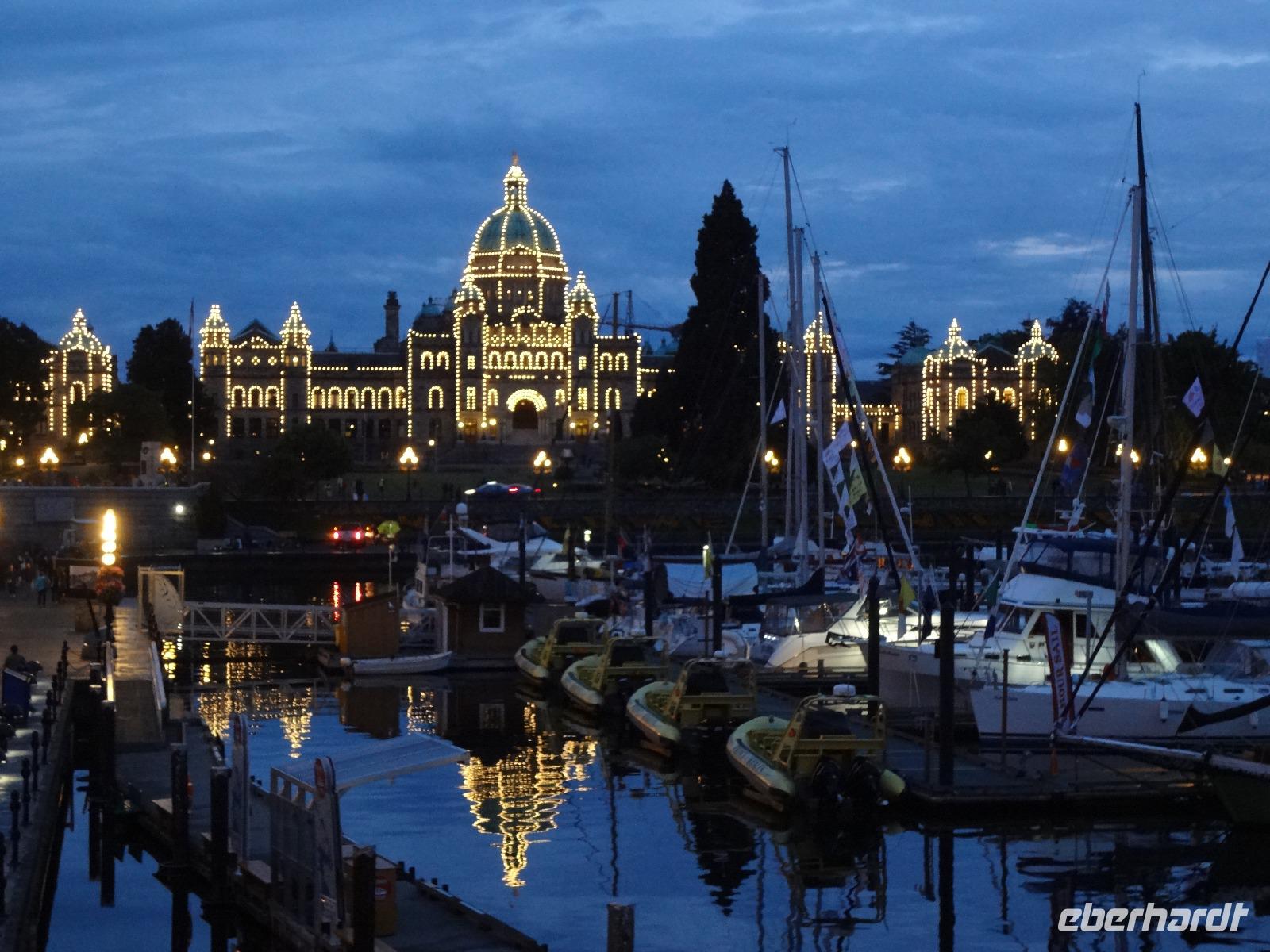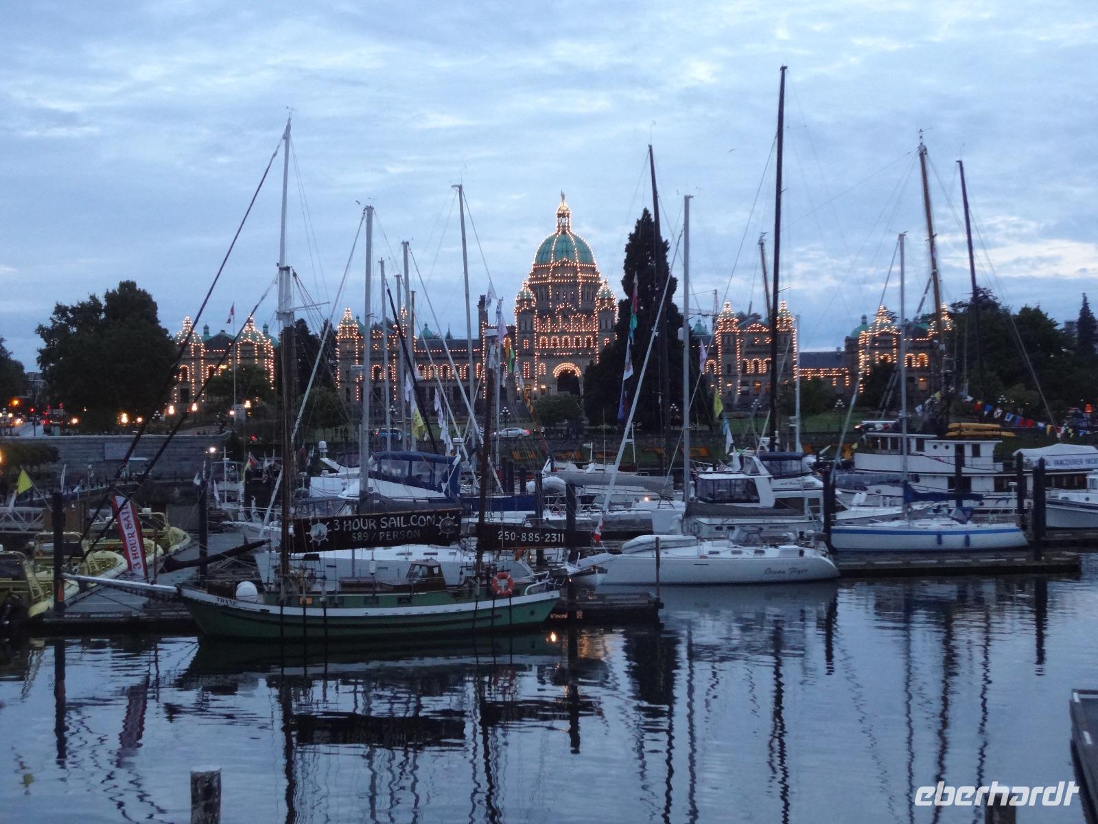 Heute haben wir eine weite Reise vor uns und fahren deshalb schon um 8 Uhr los. Wir koennen diese endlosen Waelder nochmal richtig geniessen und ausleben, ganze 4 Stunden lang ! Einige Geschichten, Anekdoten, Gesaenge und Schnarchgeraeusche spaeter halten wir auch in Cambpell River wo wir eine Kaffepause einlegen. Herrlich ist hier das Klima und Quadra Island blinzelt hinueber. Schoene Totem werden abgelichtet ehe wir zum Mittagessen weiterfahren. Ein Markt-Dorf erwartet uns. Der Markthalle Dach ist begruent und dort weiden auch Ziegen, vieles gibt es hier zu sehen, hoeren und kaufen, viele Objekte zu fotografieren. Nach einer Stunde gehts nun weiter zu unserem naechsten Ziel, Chemainus. Ein Freilichtmuseum. Die Hausmauern sind mit wunderschoenen Gemaelde bemalt welche die Geschichte Vancouver Island's festhalten. Wir gehen den gelben Fussspuren nach und staunen ueber die Kunstwerke und natuerlich auch ueber die vielen Holzstaemme die hier noch immer gefloesst werden. Am spaeteren Nachmittag kommen wir in Victoria, der Hauptstadt Britisch Kolumbiens, an. Die interessante Geschichte dieser Stadt und die Legenden ueber Rattenburry, Mc Donald, Lady Smith und Dr Helmecken machen uns schon ganz neugierig auf diese Stadt. Nach der Stadtrundfahrt checken wir auch gleich in unser schoenes, zentral gelegenes Hotel ein und sausen gleich los auf auf Erkundungstour. Abendessen ist heute fuer 16 Gaeste im Milestones Restaurant, gleich am Hafen. Das Essen ist wunderbar, das Empress Hotel, sowie das Parlament werden als Beilage beleuchtet und wir speisen wie die Koenige. Hat wirklich Eberhard das Parlament fuer uns beleuchtet ? Der Absacker ist heute im Irish Pub und irgendwie sind wir wieder die letzten Gaeste !