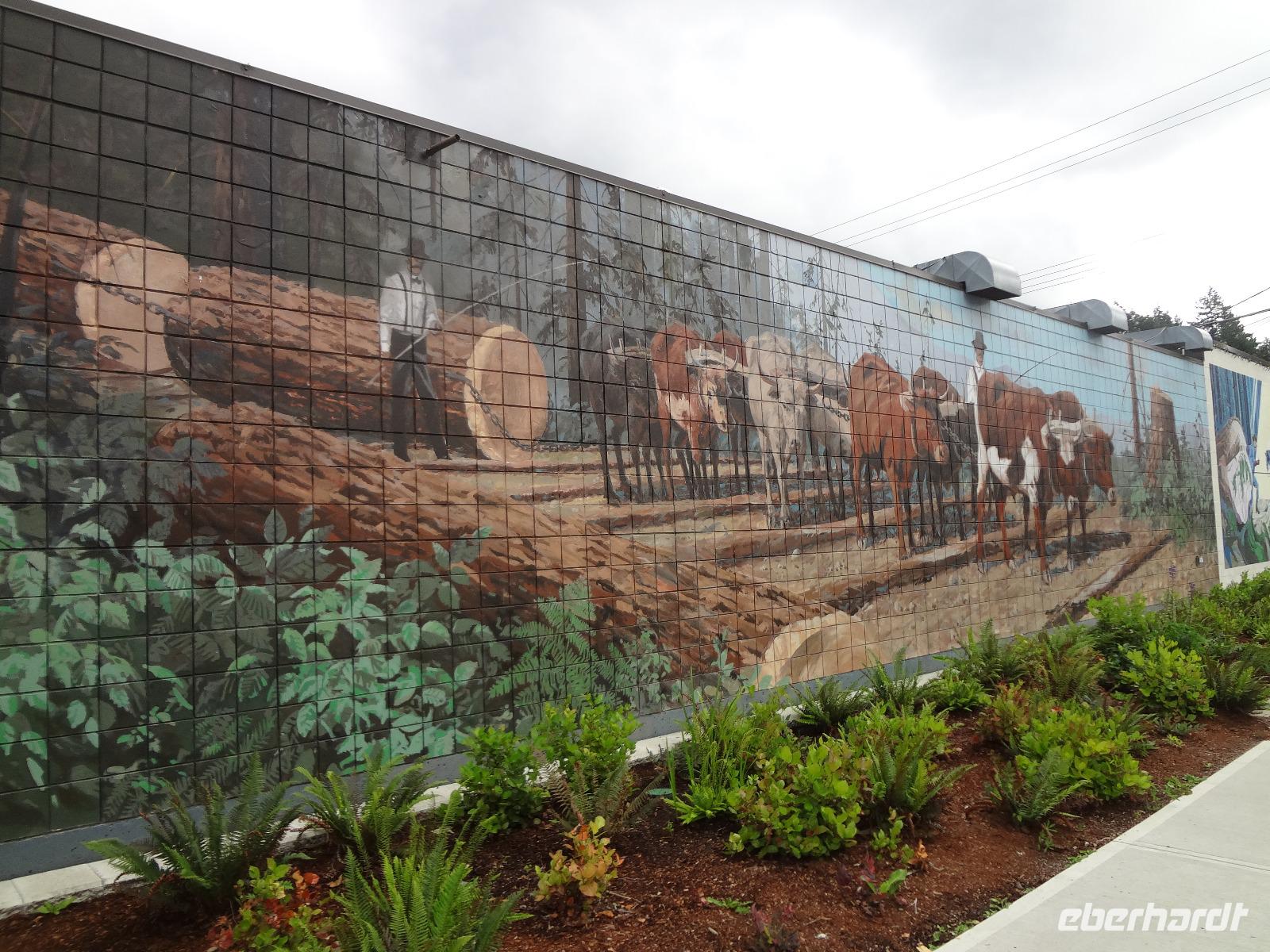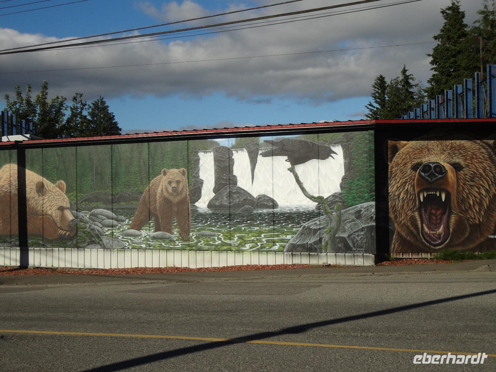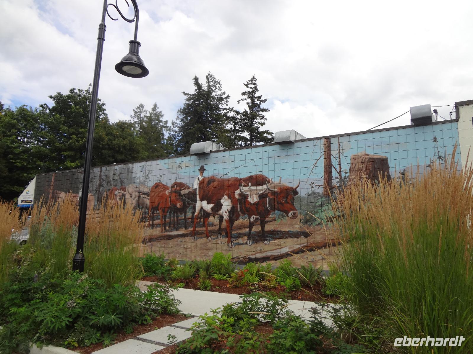 Heute haben wir eine weite Reise vor uns und fahren deshalb schon um 8 Uhr los. Wir koennen diese endlosen Waelder nochmal richtig geniessen und ausleben, ganze 4 Stunden lang ! Einige Geschichten, Anekdoten, Gesaenge und Schnarchgeraeusche spaeter halten wir auch in Cambpell River wo wir eine Kaffepause einlegen. Herrlich ist hier das Klima und Quadra Island blinzelt hinueber. Schoene Totem werden abgelichtet ehe wir zum Mittagessen weiterfahren. Ein Markt-Dorf erwartet uns. Der Markthalle Dach ist begruent und dort weiden auch Ziegen, vieles gibt es hier zu sehen, hoeren und kaufen, viele Objekte zu fotografieren. Nach einer Stunde gehts nun weiter zu unserem naechsten Ziel, Chemainus. Ein Freilichtmuseum. Die Hausmauern sind mit wunderschoenen Gemaelde bemalt welche die Geschichte Vancouver Island's festhalten. Wir gehen den gelben Fussspuren nach und staunen ueber die Kunstwerke und natuerlich auch ueber die vielen Holzstaemme die hier noch immer gefloesst werden. Am spaeteren Nachmittag kommen wir in Victoria, der Hauptstadt Britisch Kolumbiens, an. Die interessante Geschichte dieser Stadt und die Legenden ueber Rattenburry, Mc Donald, Lady Smith und Dr Helmecken machen uns schon ganz neugierig auf diese Stadt. Nach der Stadtrundfahrt checken wir auch gleich in unser schoenes, zentral gelegenes Hotel ein und sausen gleich los auf auf Erkundungstour. Abendessen ist heute fuer 16 Gaeste im Milestones Restaurant, gleich am Hafen. Das Essen ist wunderbar, das Empress Hotel, sowie das Parlament werden als Beilage beleuchtet und wir speisen wie die Koenige. Hat wirklich Eberhard das Parlament fuer uns beleuchtet ? Der Absacker ist heute im Irish Pub und irgendwie sind wir wieder die letzten Gaeste !