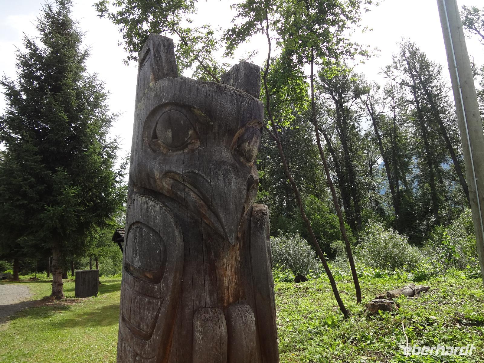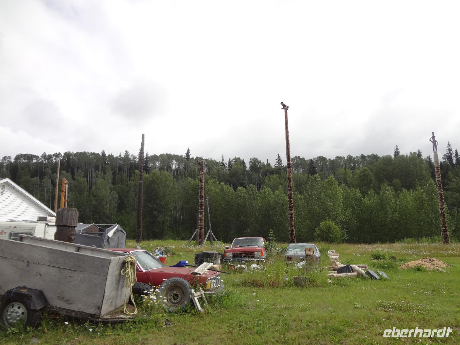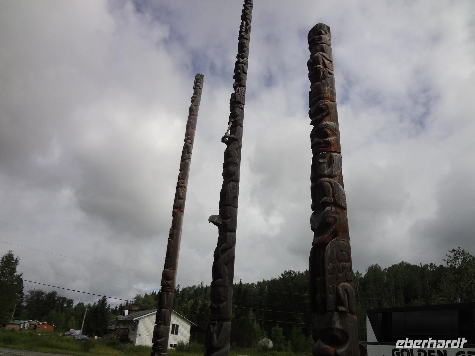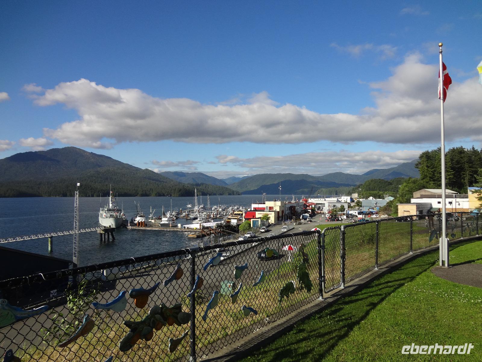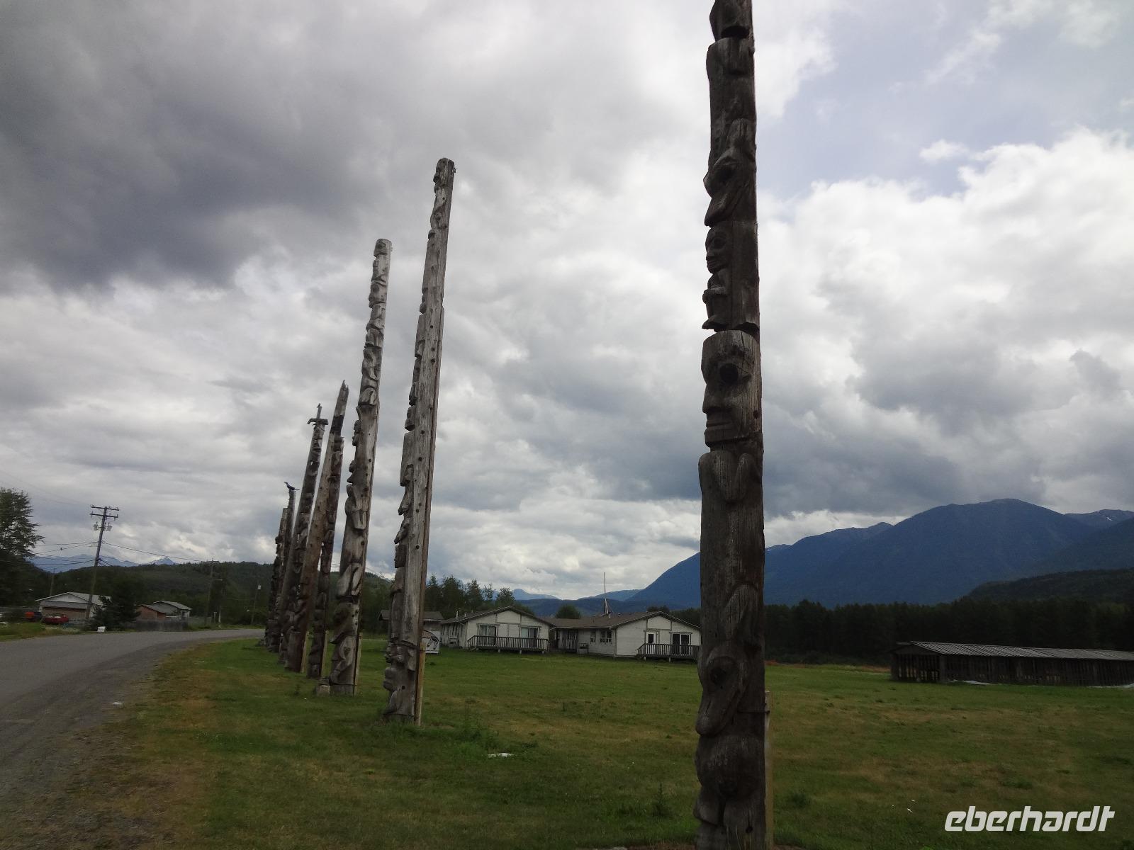 Nun verlassen wir das Staedtchen Stewart und winken noch allen Einwohner zu, die wir gestern kennengelernt haben. Es nieselt ein wenig und die Landschaft zeigt sich im Nebelkleid genauso wie sie von den Ersten Nationen gemalt und festgehalten wird. In Gitanyow machen wir Halt und haben auch genuegend Zeit uns dieses originelle Indianerdorf anzuschauen und von den Totem richtig schoene Aufnahmen zu machen. Wir wundern uns natuerlich auch ueber die Haeuser dieses Reservates und mancher schuettelt den Kopf beim Anblick der „Gaerten". Alles muss der Natur zurueckgegeben werden! Mittagessen nehmen wir heute echt kanadisch in einem Tim Hortons ein. Der Kaffee hat hier lustige Bezeichnungen, so bestellen einige eine Schwarze Suesse und andere einfach eine Blonde ! Dem weiten, majestaetischen Skeena Fluss fahren wir nun eine Stunde entlang und erfreuen uns der Schoenheit dieses Flusses und der steilen Kuestenberge. Die Sonne hat auch wieder ihren Weg durch die Wolken gefunden. Viele Fliegenfischer stehen am Ufer und Elisabeth wuenschte sich insgeheim, sie waere mit ihrer Angelrute unterwegs. Vor Prince Rupert halten wir noch einmal um diese wunderschoene Gegend auch bildlich festhalten zu koennen. Wir sehen in der Ferne auch schon die Silos wo das Getreide aus der Praerie kommend, verschifft wird. Schade, dass das Investorengeld von damals mit der Titanic untergangen ist, wir koennen uns vorstellen, wie dieses Staedtchen Prince Rupert den Namen Venedig des Nordens wuerdig gewesen waere. Wir moegen es trotzdem sehr, die Sonne lacht, die Haeuser sind bunt, der Hafen ist interessant mit seinen Fischkutter und die Alleen sind ein bisschen zu breit fuer die paar Autos die hier fahren. Nun aber gehts zu unserem unvergesslichen Abendbrot, jeder der dabei war wird sich in Zukunft schuetteln vor Lachen wenn er Ekmek auf der Speisekarte findet. So ziemlich alles geht heute Abend schief, so schief, dass wir 16 einen echten Lachkrampf erleiden. Der Bauch tut uns schon so weh, dass wir das, von Nachbar's Restaurant ausgeborgte Ekmek (griechische Suesspeise) kaum essen koennen. Heute muessen wir auch schnell schlafen gehen da es morgen schon sehr zeitig losgeht.