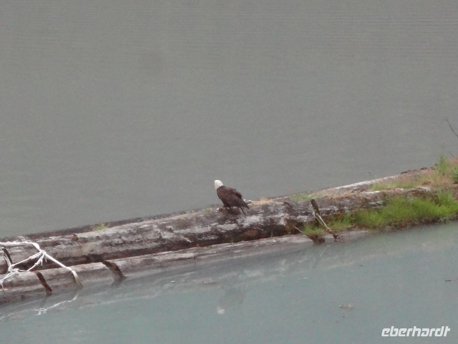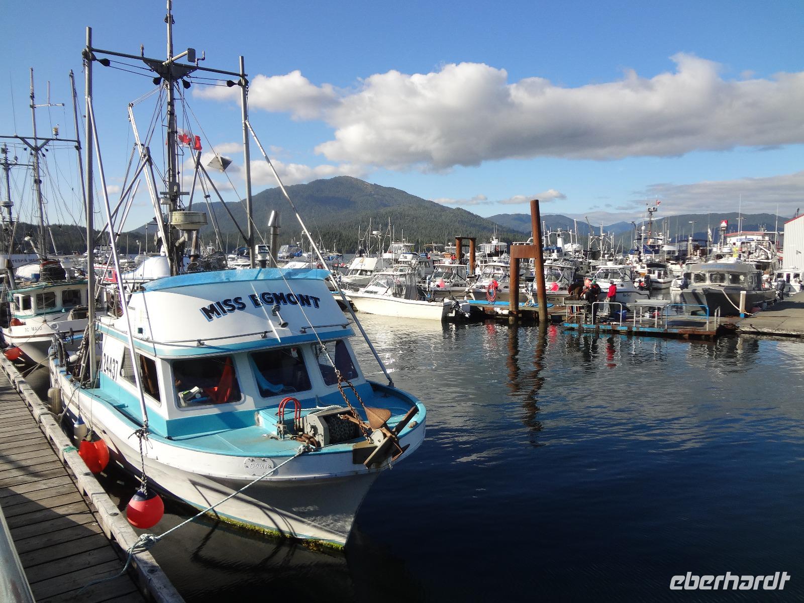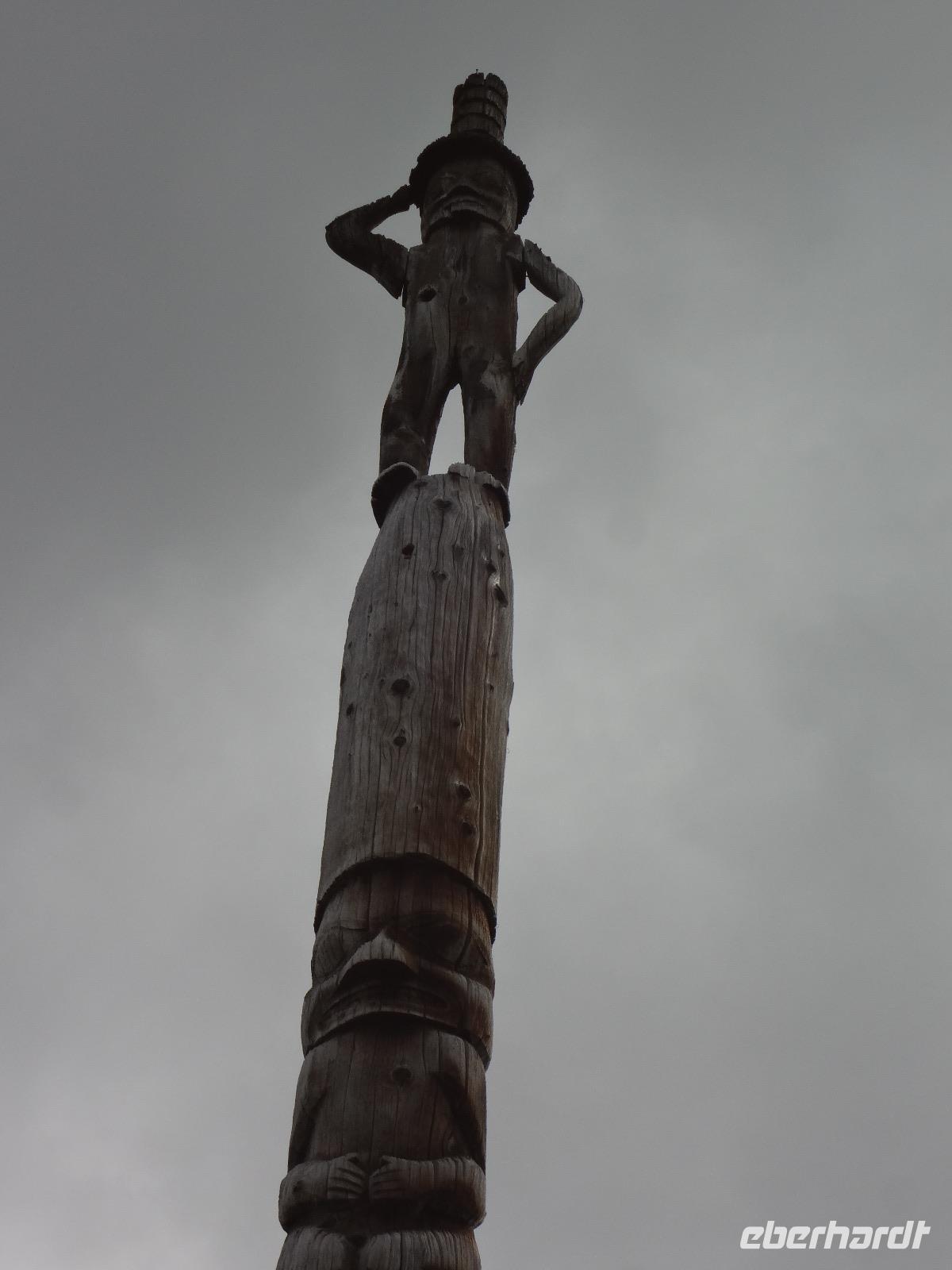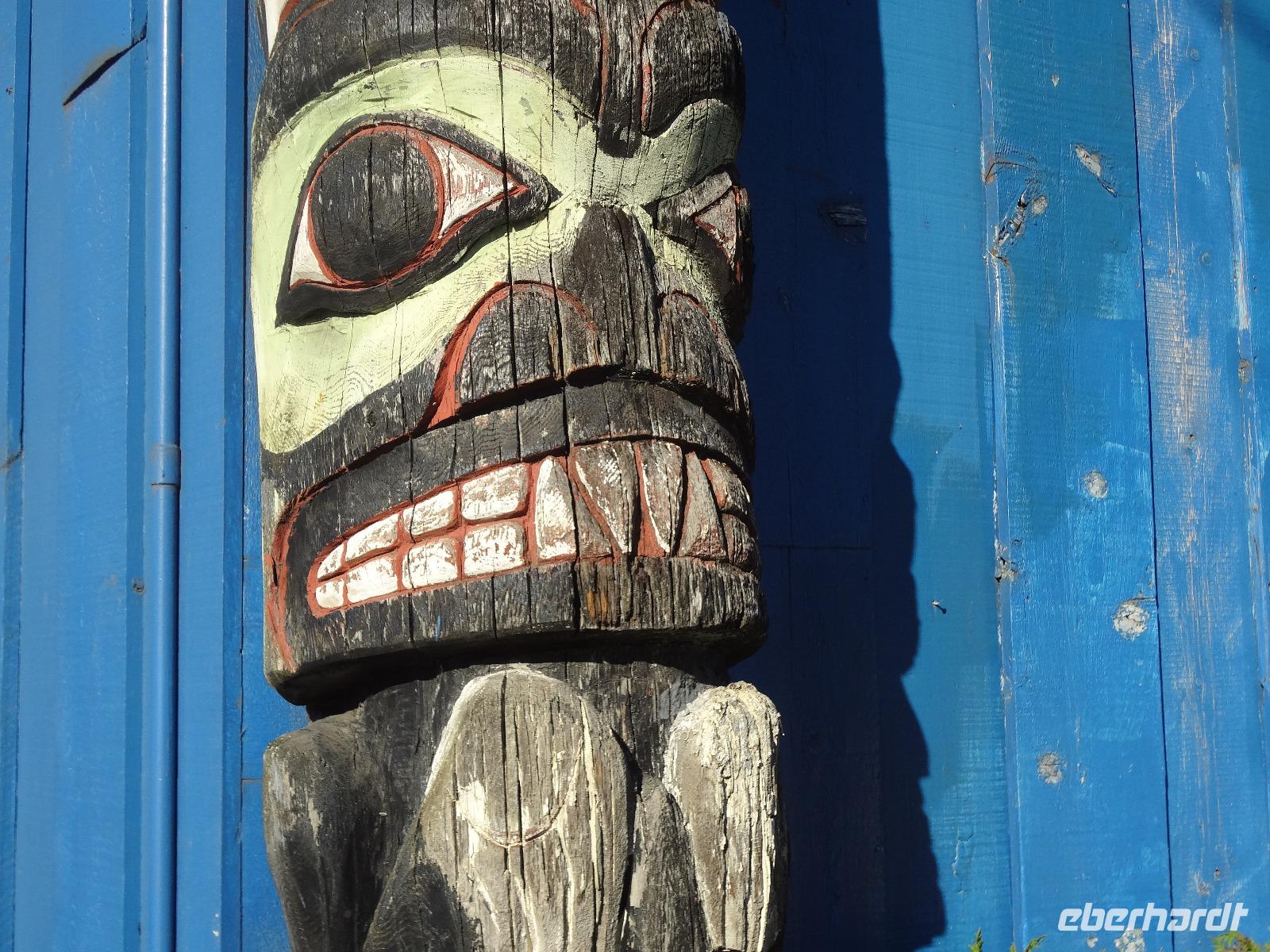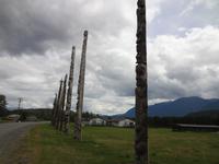 Nun verlassen wir das Staedtchen Stewart und winken noch allen Einwohner zu, die wir gestern kennengelernt haben. Es nieselt ein wenig und die Landschaft zeigt sich im Nebelkleid genauso wie sie von den Ersten Nationen gemalt und festgehalten wird. In Gitanyow machen wir Halt und haben auch genuegend Zeit uns dieses originelle Indianerdorf anzuschauen und von den Totem richtig schoene Aufnahmen zu machen. Wir wundern uns natuerlich auch ueber die Haeuser dieses Reservates und mancher schuettelt den Kopf beim Anblick der „Gaerten". Alles muss der Natur zurueckgegeben werden! Mittagessen nehmen wir heute echt kanadisch in einem Tim Hortons ein. Der Kaffee hat hier lustige Bezeichnungen, so bestellen einige eine Schwarze Suesse und andere einfach eine Blonde ! Dem weiten, majestaetischen Skeena Fluss fahren wir nun eine Stunde entlang und erfreuen uns der Schoenheit dieses Flusses und der steilen Kuestenberge. Die Sonne hat auch wieder ihren Weg durch die Wolken gefunden. Viele Fliegenfischer stehen am Ufer und Elisabeth wuenschte sich insgeheim, sie waere mit ihrer Angelrute unterwegs. Vor Prince Rupert halten wir noch einmal um diese wunderschoene Gegend auch bildlich festhalten zu koennen. Wir sehen in der Ferne auch schon die Silos wo das Getreide aus der Praerie kommend, verschifft wird. Schade, dass das Investorengeld von damals mit der Titanic untergangen ist, wir koennen uns vorstellen, wie dieses Staedtchen Prince Rupert den Namen Venedig des Nordens wuerdig gewesen waere. Wir moegen es trotzdem sehr, die Sonne lacht, die Haeuser sind bunt, der Hafen ist interessant mit seinen Fischkutter und die Alleen sind ein bisschen zu breit fuer die paar Autos die hier fahren. Nun aber gehts zu unserem unvergesslichen Abendbrot, jeder der dabei war wird sich in Zukunft schuetteln vor Lachen wenn er Ekmek auf der Speisekarte findet. So ziemlich alles geht heute Abend schief, so schief, dass wir 16 einen echten Lachkrampf erleiden. Der Bauch tut uns schon so weh, dass wir das, von Nachbar's Restaurant ausgeborgte Ekmek (griechische Suesspeise) kaum essen koennen. Heute muessen wir auch schnell schlafen gehen da es morgen schon sehr zeitig losgeht.