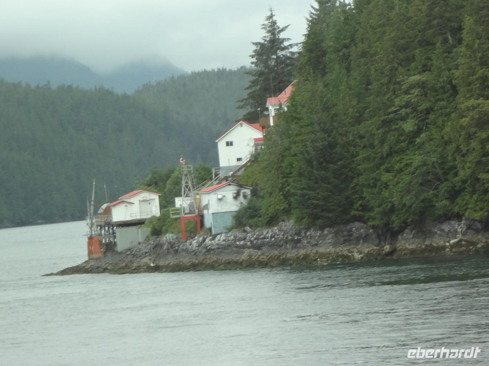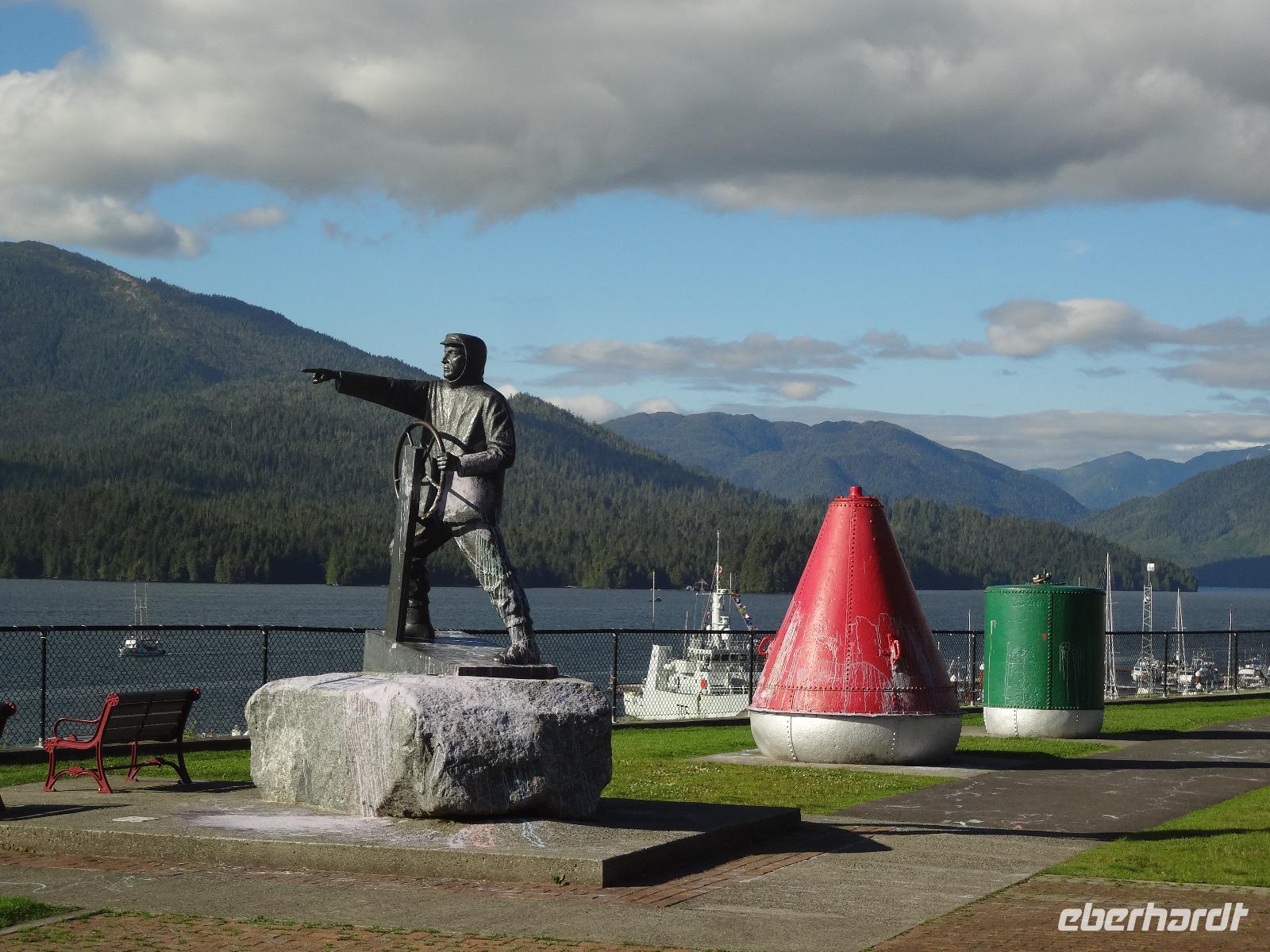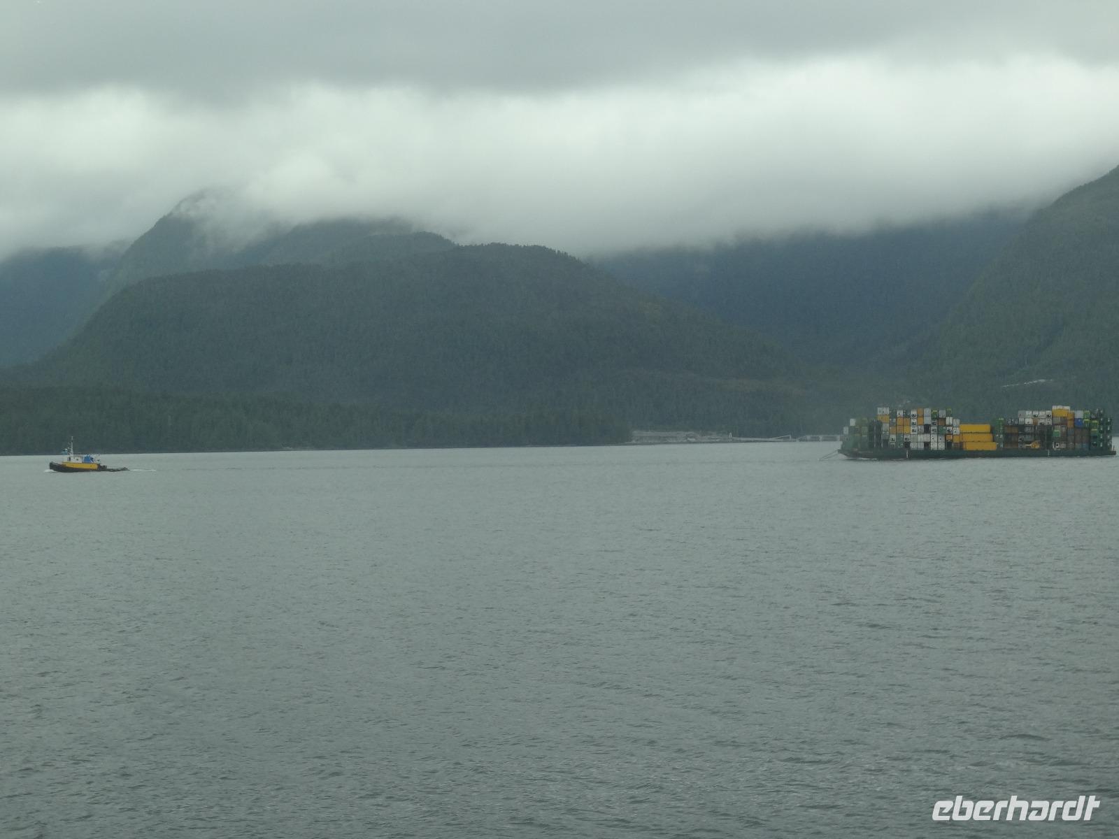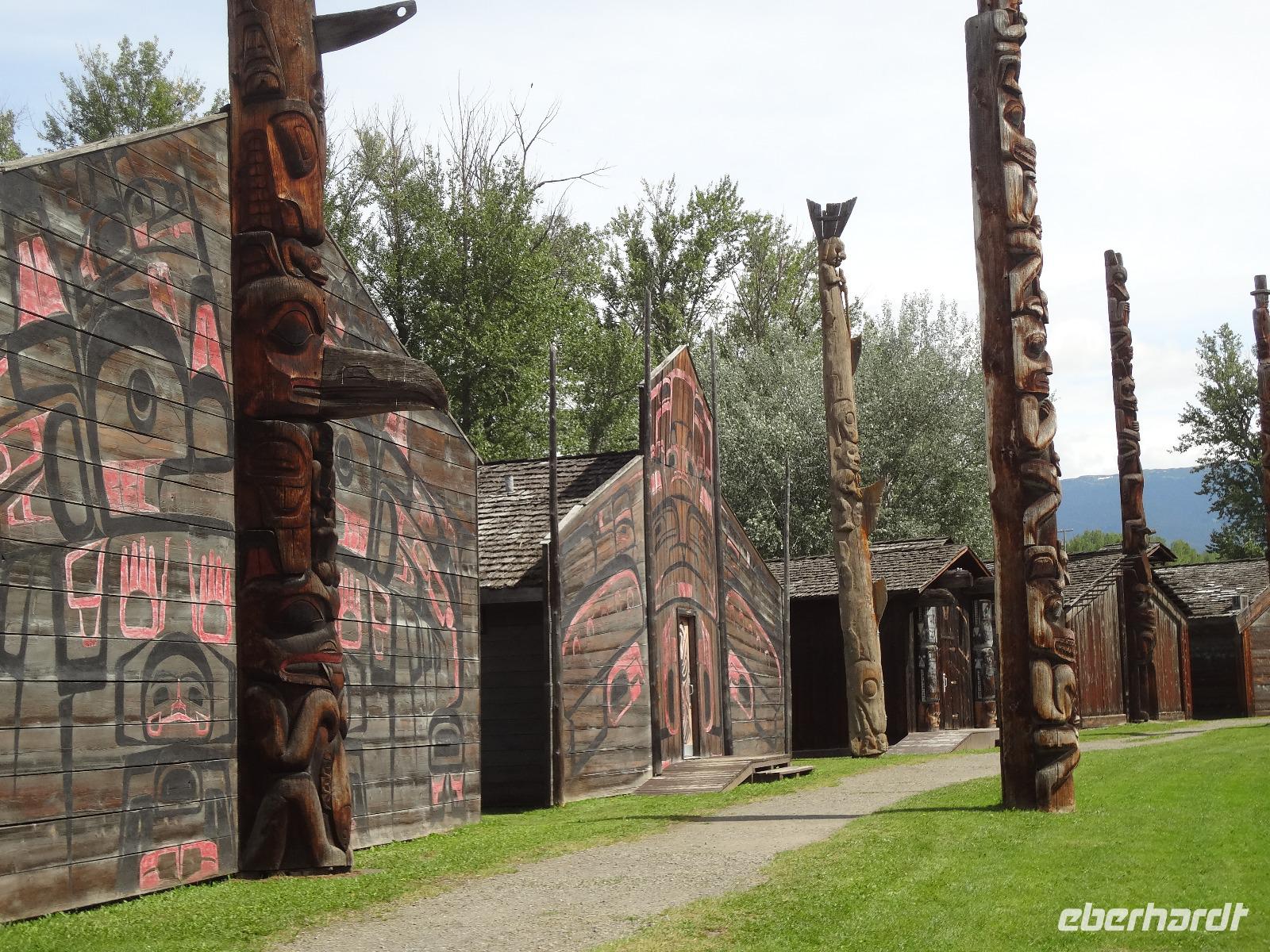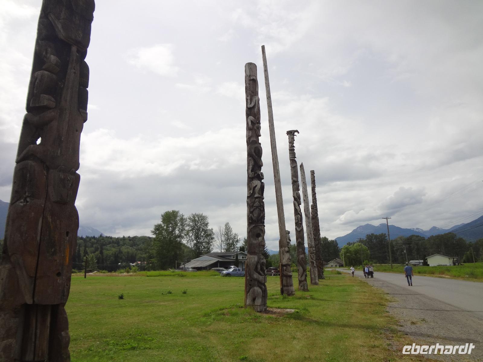 Nun verlassen wir das Staedtchen Stewart und winken noch allen Einwohner zu, die wir gestern kennengelernt haben. Es nieselt ein wenig und die Landschaft zeigt sich im Nebelkleid genauso wie sie von den Ersten Nationen gemalt und festgehalten wird. In Gitanyow machen wir Halt und haben auch genuegend Zeit uns dieses originelle Indianerdorf anzuschauen und von den Totem richtig schoene Aufnahmen zu machen. Wir wundern uns natuerlich auch ueber die Haeuser dieses Reservates und mancher schuettelt den Kopf beim Anblick der „Gaerten". Alles muss der Natur zurueckgegeben werden! Mittagessen nehmen wir heute echt kanadisch in einem Tim Hortons ein. Der Kaffee hat hier lustige Bezeichnungen, so bestellen einige eine Schwarze Suesse und andere einfach eine Blonde ! Dem weiten, majestaetischen Skeena Fluss fahren wir nun eine Stunde entlang und erfreuen uns der Schoenheit dieses Flusses und der steilen Kuestenberge. Die Sonne hat auch wieder ihren Weg durch die Wolken gefunden. Viele Fliegenfischer stehen am Ufer und Elisabeth wuenschte sich insgeheim, sie waere mit ihrer Angelrute unterwegs. Vor Prince Rupert halten wir noch einmal um diese wunderschoene Gegend auch bildlich festhalten zu koennen. Wir sehen in der Ferne auch schon die Silos wo das Getreide aus der Praerie kommend, verschifft wird. Schade, dass das Investorengeld von damals mit der Titanic untergangen ist, wir koennen uns vorstellen, wie dieses Staedtchen Prince Rupert den Namen Venedig des Nordens wuerdig gewesen waere. Wir moegen es trotzdem sehr, die Sonne lacht, die Haeuser sind bunt, der Hafen ist interessant mit seinen Fischkutter und die Alleen sind ein bisschen zu breit fuer die paar Autos die hier fahren. Nun aber gehts zu unserem unvergesslichen Abendbrot, jeder der dabei war wird sich in Zukunft schuetteln vor Lachen wenn er Ekmek auf der Speisekarte findet. So ziemlich alles geht heute Abend schief, so schief, dass wir 16 einen echten Lachkrampf erleiden. Der Bauch tut uns schon so weh, dass wir das, von Nachbar's Restaurant ausgeborgte Ekmek (griechische Suesspeise) kaum essen koennen. Heute muessen wir auch schnell schlafen gehen da es morgen schon sehr zeitig losgeht.