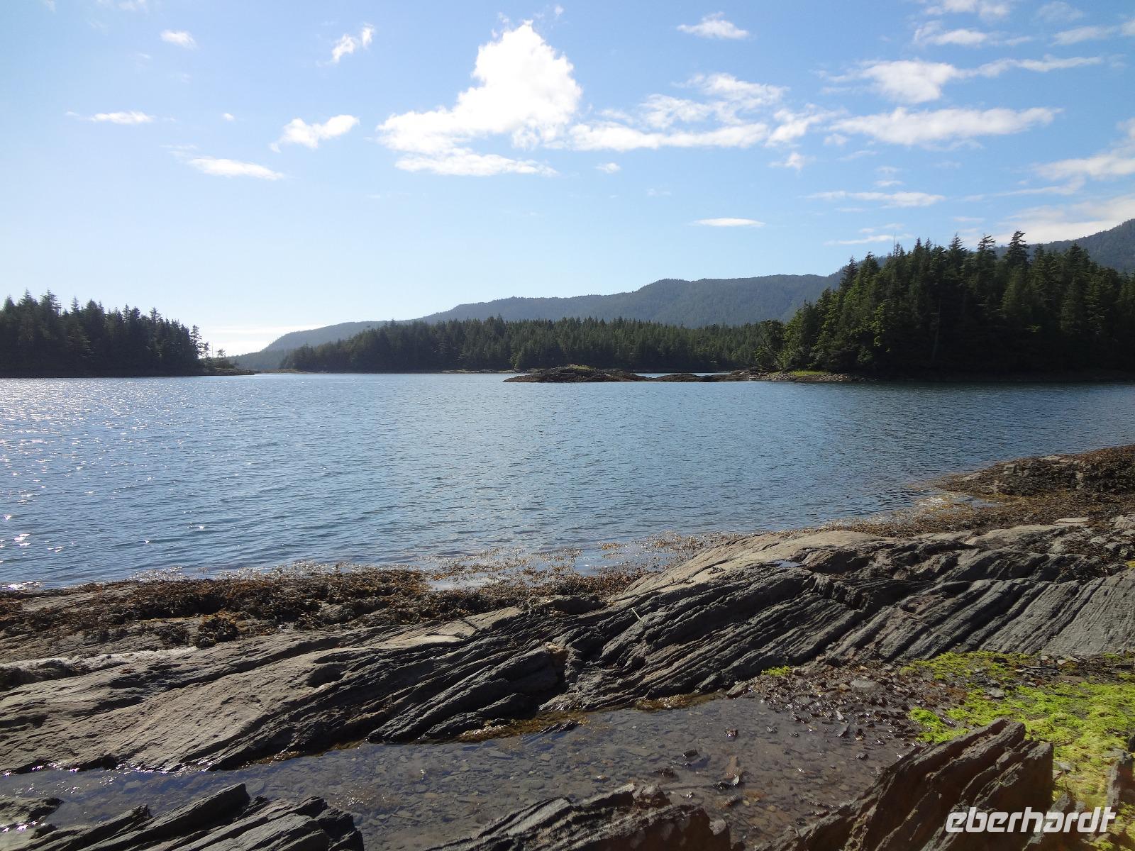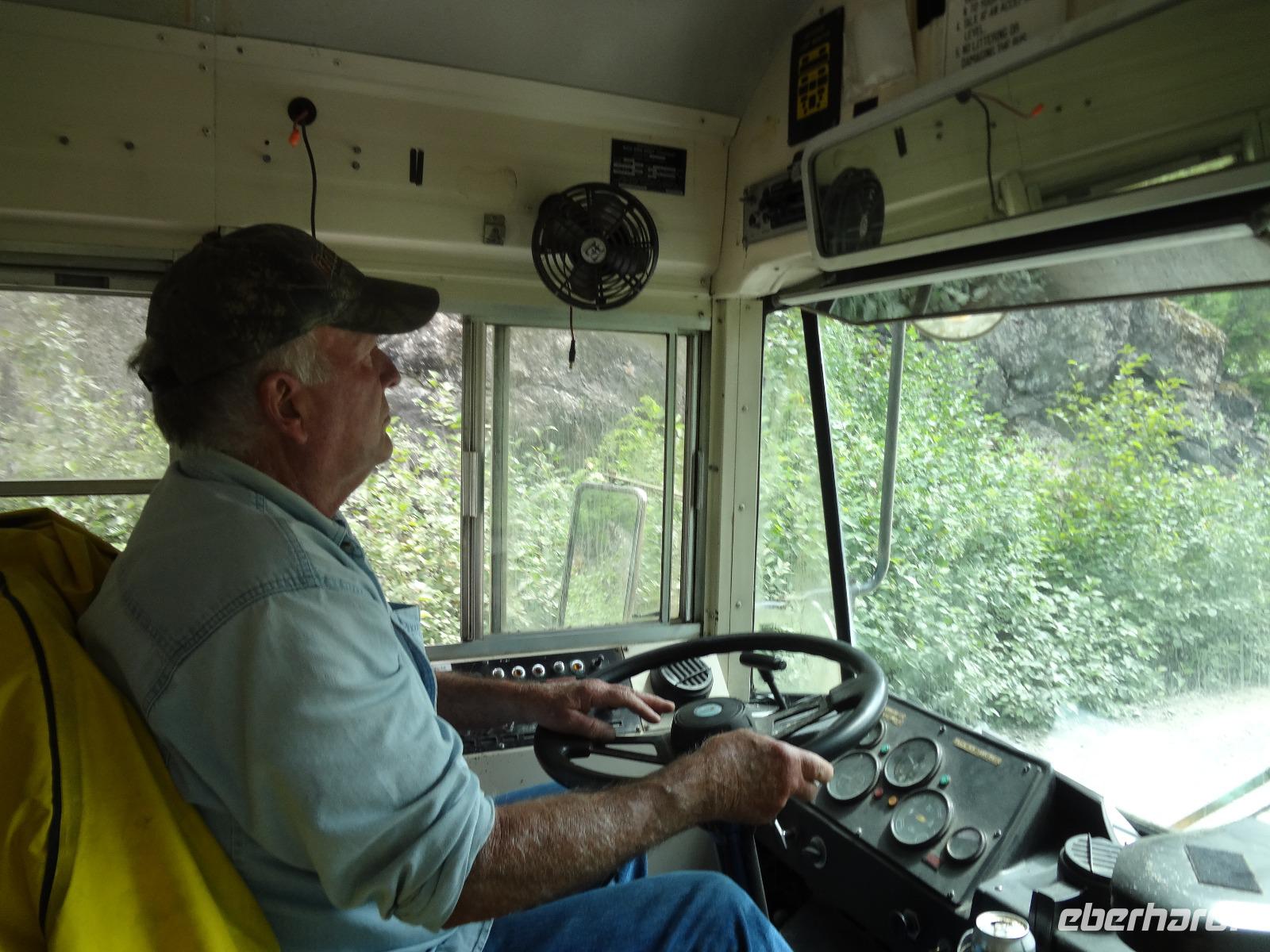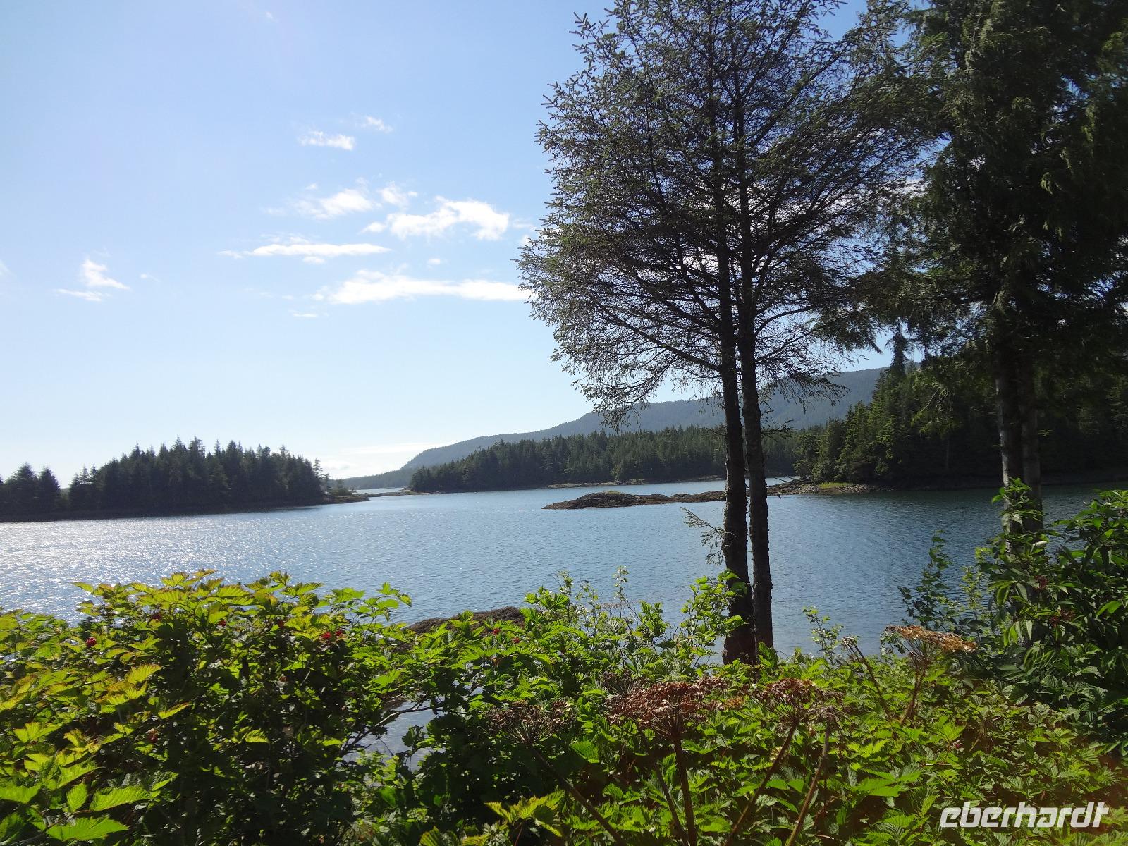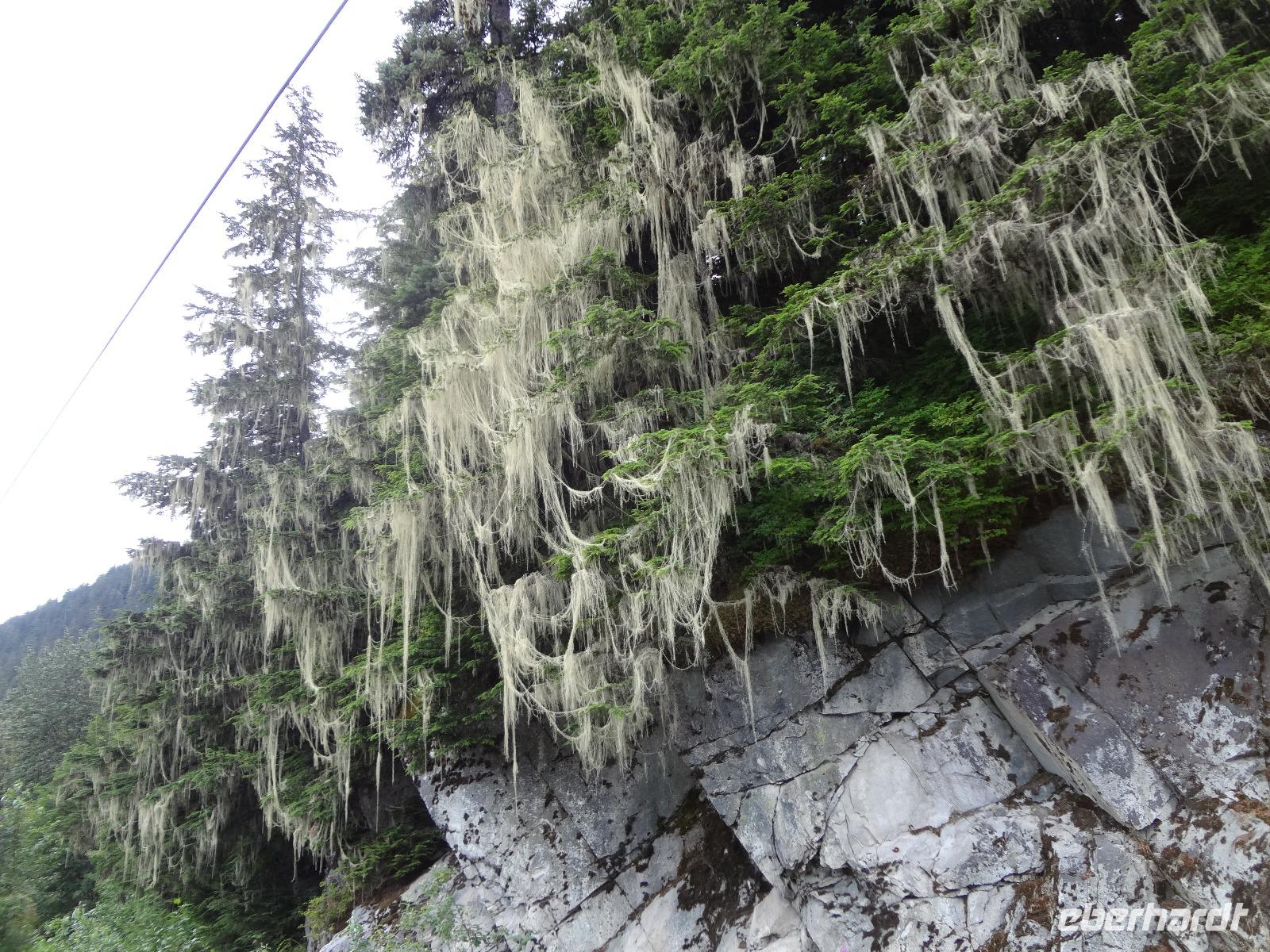 Nun verlassen wir das Staedtchen Stewart und winken noch allen Einwohner zu, die wir gestern kennengelernt haben. Es nieselt ein wenig und die Landschaft zeigt sich im Nebelkleid genauso wie sie von den Ersten Nationen gemalt und festgehalten wird. In Gitanyow machen wir Halt und haben auch genuegend Zeit uns dieses originelle Indianerdorf anzuschauen und von den Totem richtig schoene Aufnahmen zu machen. Wir wundern uns natuerlich auch ueber die Haeuser dieses Reservates und mancher schuettelt den Kopf beim Anblick der „Gaerten". Alles muss der Natur zurueckgegeben werden! Mittagessen nehmen wir heute echt kanadisch in einem Tim Hortons ein. Der Kaffee hat hier lustige Bezeichnungen, so bestellen einige eine Schwarze Suesse und andere einfach eine Blonde ! Dem weiten, majestaetischen Skeena Fluss fahren wir nun eine Stunde entlang und erfreuen uns der Schoenheit dieses Flusses und der steilen Kuestenberge. Die Sonne hat auch wieder ihren Weg durch die Wolken gefunden. Viele Fliegenfischer stehen am Ufer und Elisabeth wuenschte sich insgeheim, sie waere mit ihrer Angelrute unterwegs. Vor Prince Rupert halten wir noch einmal um diese wunderschoene Gegend auch bildlich festhalten zu koennen. Wir sehen in der Ferne auch schon die Silos wo das Getreide aus der Praerie kommend, verschifft wird. Schade, dass das Investorengeld von damals mit der Titanic untergangen ist, wir koennen uns vorstellen, wie dieses Staedtchen Prince Rupert den Namen Venedig des Nordens wuerdig gewesen waere. Wir moegen es trotzdem sehr, die Sonne lacht, die Haeuser sind bunt, der Hafen ist interessant mit seinen Fischkutter und die Alleen sind ein bisschen zu breit fuer die paar Autos die hier fahren. Nun aber gehts zu unserem unvergesslichen Abendbrot, jeder der dabei war wird sich in Zukunft schuetteln vor Lachen wenn er Ekmek auf der Speisekarte findet. So ziemlich alles geht heute Abend schief, so schief, dass wir 16 einen echten Lachkrampf erleiden. Der Bauch tut uns schon so weh, dass wir das, von Nachbar's Restaurant ausgeborgte Ekmek (griechische Suesspeise) kaum essen koennen. Heute muessen wir auch schnell schlafen gehen da es morgen schon sehr zeitig losgeht.