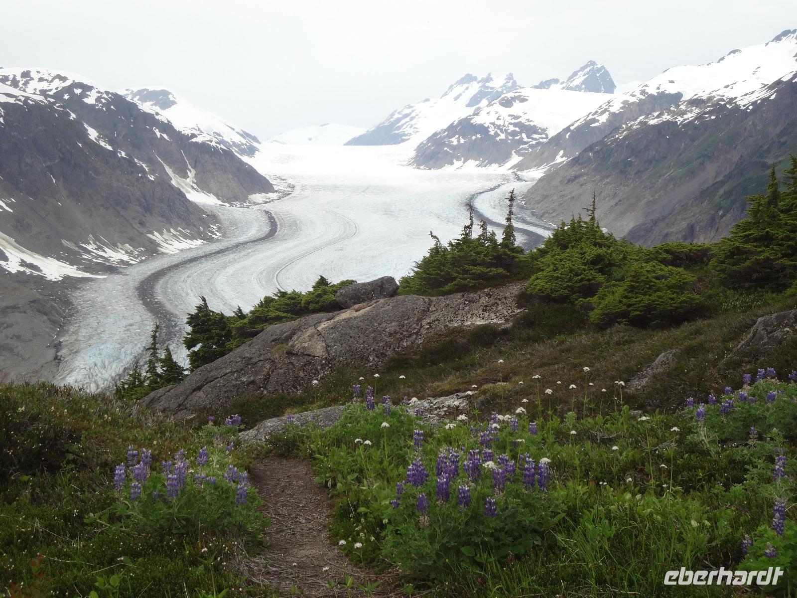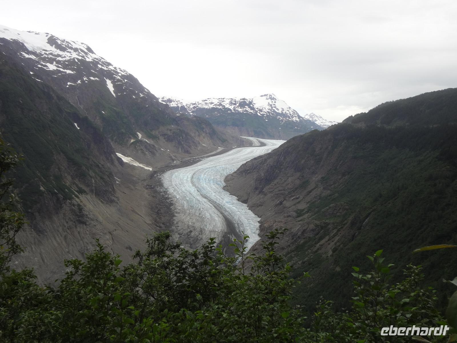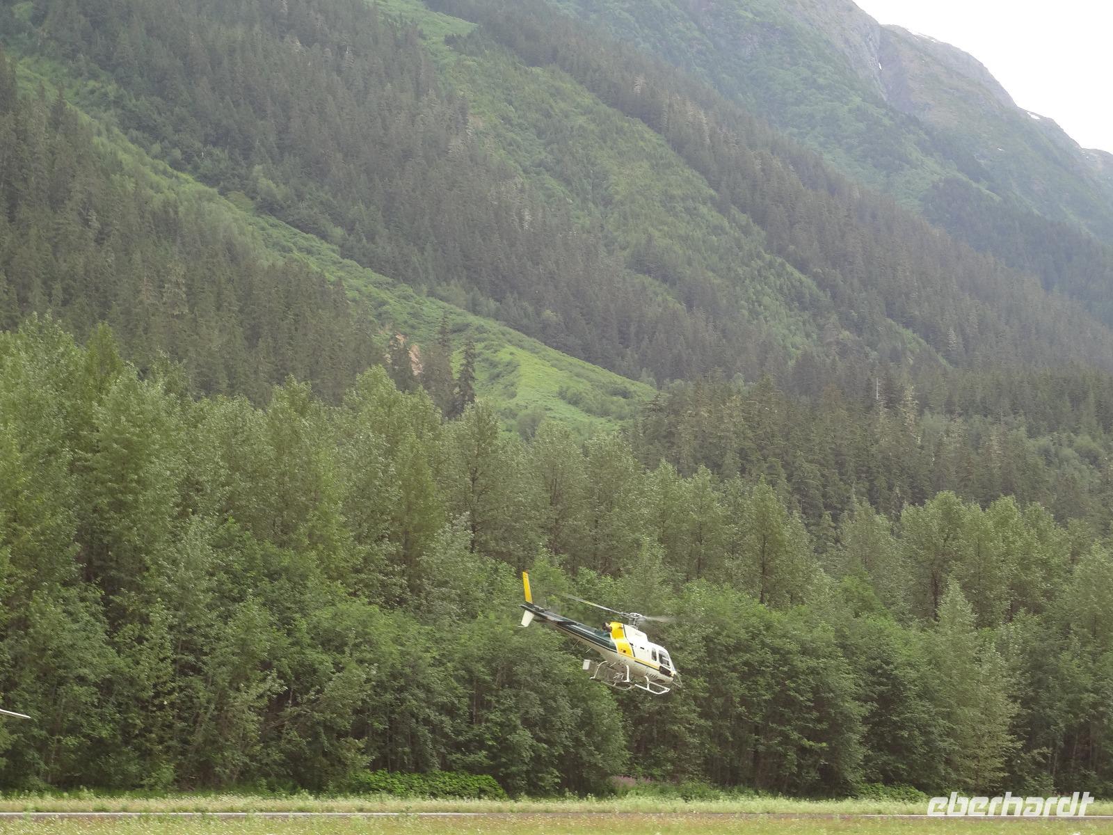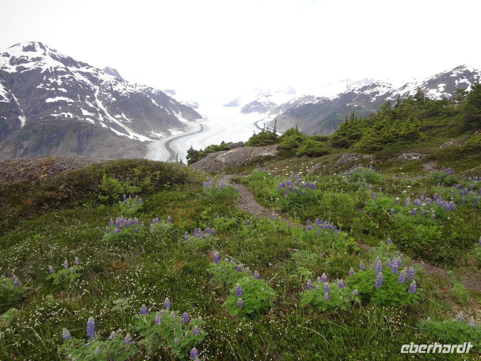 Heute in der Frueh wartet Goran mit unserem Bus auf uns, er ist glueckseelig, denn heute faehrt er uns bloss 3 Km an die amerikanische Grenze. Dort werden wir von Clint und seinem gelben Schulbus abgeholt. Wir sind nun in Hyder, in Amerika, in Alaska und es fuehlt sich ganz besonders an. Anscheinend sind vor 3 Tagen Lachse den Fish Creek River hinaufgeschwommen und 10 Grizzli haben sich an ihnen gelabt. Wir fahren also gleich zum Fish Creek und erfahren vom Ranger, dass seit 3 Tagen keine Lachse mehr gesichtet wurden, vielleicht sei der Fluss irgendwo unterbrochen, sie wuerden nachschauen heute Nachmittag. Also fahren wir weiter bis an unser Ziel. Auf einer Schotterstrasse, auf eine Moraine, fahren wir an Gold und Silberminen vorbei. Wir geniessen eine enorm-grandiose Sicht auf den Salmon Gletscher. Dieser Gletscher ist rund 60 Km lang und Clint geht immer neben uns her mit seinem Schiessgewehr. Er erwartet wohl unerwuenschten Besuch ! Nichts mit Besuch, keine Grizzli, das ist auch gut so. Wir bestaunen den Gletscher, kraxeln auf den Berg dahinter um die Wildblumen anzuschauen, machen Bekanntschaft mit den jungen Argentiniern die schon seit 2 Jahren in ihren VW Bussen unterwegs sind und essen dann unser ausgiebiges Picknick. Auf der Rueckfahrt halten wir nochmals bei Fish Creek. Es gäbe kein Unterbrechung, es sei bloss viel zu wenig Wasser im Fluss und daher kommen die Fische nicht hoch und die Baeren sind auch nicht da um sie zu fangen. Hyder ist ein fast ausgestorbenes Doerfchen. Wir speichern einige Bilder in unseren Fotoapparaten und fahren alsbald zur kanadischen Grenze. Nun muessen wir wieder einreisen und jeder bekommt noch einen Stempel in seinen Pass. Danach haben wir ein bisschen Verschnaufpause ehe es zu unserem nächsten Abenteuer auf geht. Viele haben uns fuer einen Helikopter Flug angemeldet und uns daran auch ergoetzt. Die Eisfelder, Gletscher und Fjorde sind einfach gigantisch. Alle treffen sich nach dem Abendbrot auf einen Absacker der heute bis ins Morgengrauen dauert.