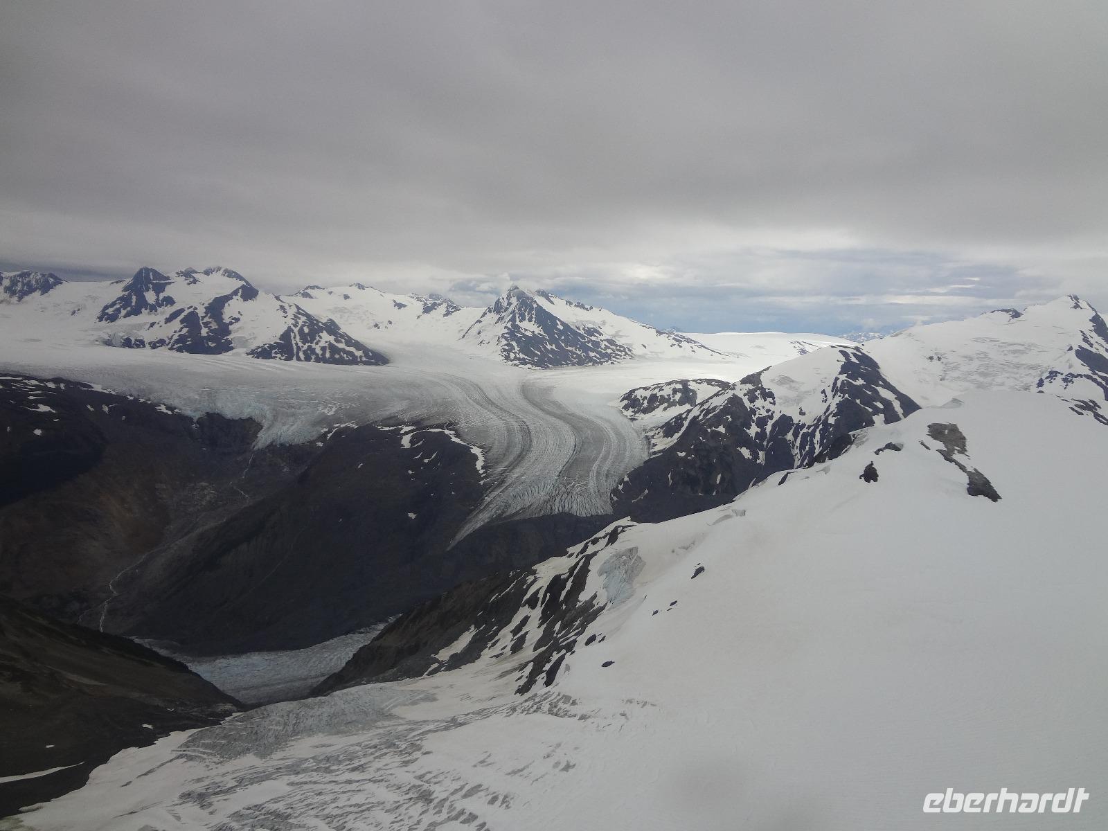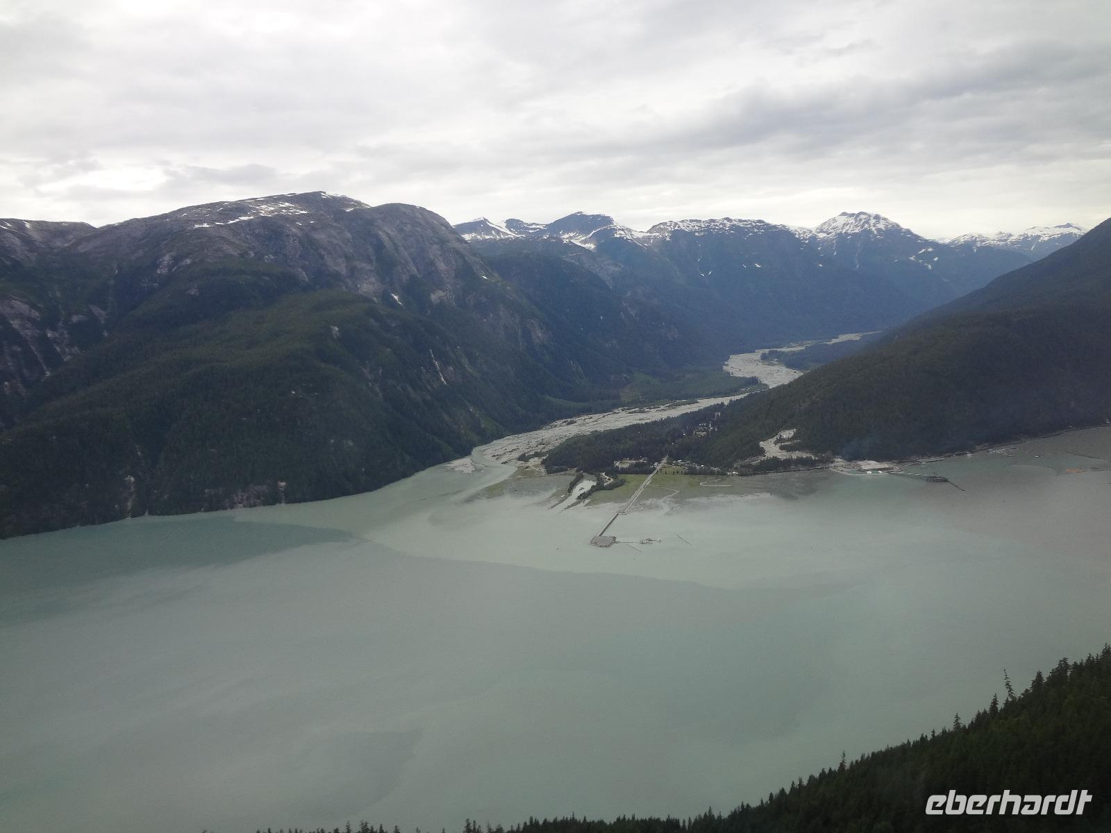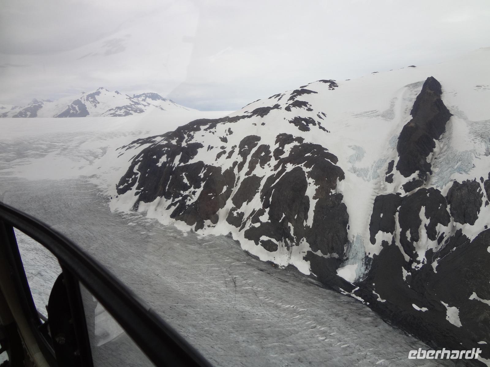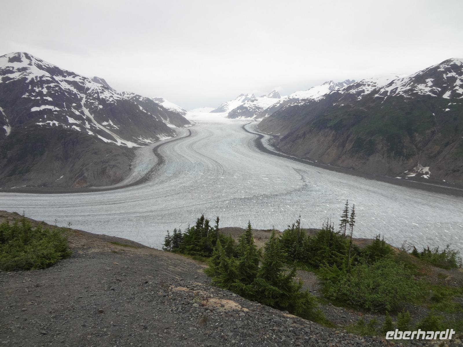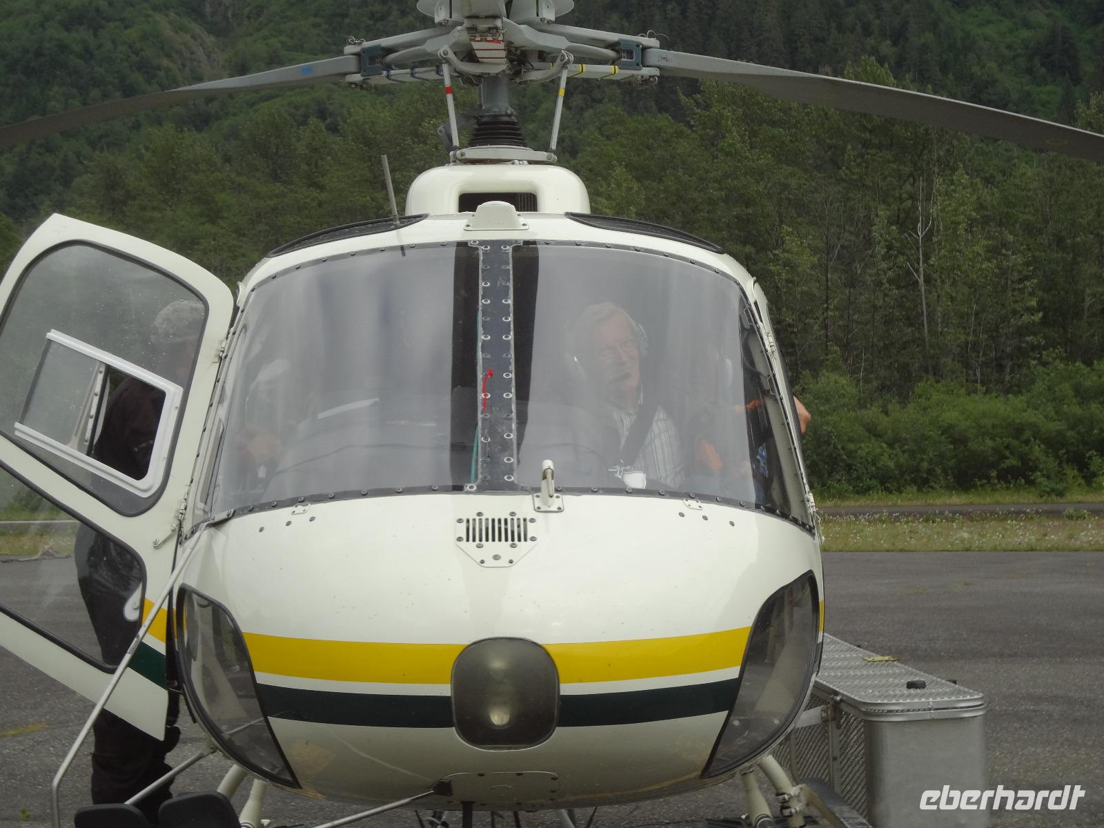 Heute in der Frueh wartet Goran mit unserem Bus auf uns, er ist glueckseelig, denn heute faehrt er uns bloss 3 Km an die amerikanische Grenze. Dort werden wir von Clint und seinem gelben Schulbus abgeholt. Wir sind nun in Hyder, in Amerika, in Alaska und es fuehlt sich ganz besonders an. Anscheinend sind vor 3 Tagen Lachse den Fish Creek River hinaufgeschwommen und 10 Grizzli haben sich an ihnen gelabt. Wir fahren also gleich zum Fish Creek und erfahren vom Ranger, dass seit 3 Tagen keine Lachse mehr gesichtet wurden, vielleicht sei der Fluss irgendwo unterbrochen, sie wuerden nachschauen heute Nachmittag. Also fahren wir weiter bis an unser Ziel. Auf einer Schotterstrasse, auf eine Moraine, fahren wir an Gold und Silberminen vorbei. Wir geniessen eine enorm-grandiose Sicht auf den Salmon Gletscher. Dieser Gletscher ist rund 60 Km lang und Clint geht immer neben uns her mit seinem Schiessgewehr. Er erwartet wohl unerwuenschten Besuch ! Nichts mit Besuch, keine Grizzli, das ist auch gut so. Wir bestaunen den Gletscher, kraxeln auf den Berg dahinter um die Wildblumen anzuschauen, machen Bekanntschaft mit den jungen Argentiniern die schon seit 2 Jahren in ihren VW Bussen unterwegs sind und essen dann unser ausgiebiges Picknick. Auf der Rueckfahrt halten wir nochmals bei Fish Creek. Es gäbe kein Unterbrechung, es sei bloss viel zu wenig Wasser im Fluss und daher kommen die Fische nicht hoch und die Baeren sind auch nicht da um sie zu fangen. Hyder ist ein fast ausgestorbenes Doerfchen. Wir speichern einige Bilder in unseren Fotoapparaten und fahren alsbald zur kanadischen Grenze. Nun muessen wir wieder einreisen und jeder bekommt noch einen Stempel in seinen Pass. Danach haben wir ein bisschen Verschnaufpause ehe es zu unserem nächsten Abenteuer auf geht. Viele haben uns fuer einen Helikopter Flug angemeldet und uns daran auch ergoetzt. Die Eisfelder, Gletscher und Fjorde sind einfach gigantisch. Alle treffen sich nach dem Abendbrot auf einen Absacker der heute bis ins Morgengrauen dauert.