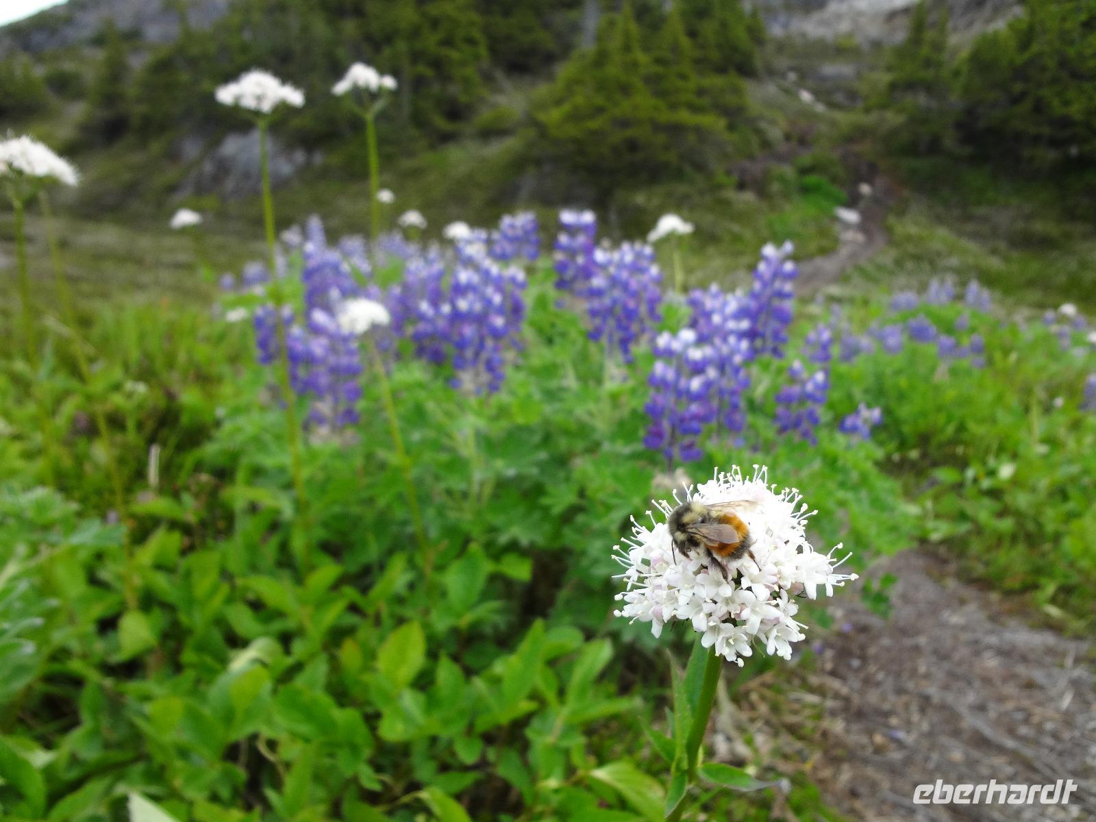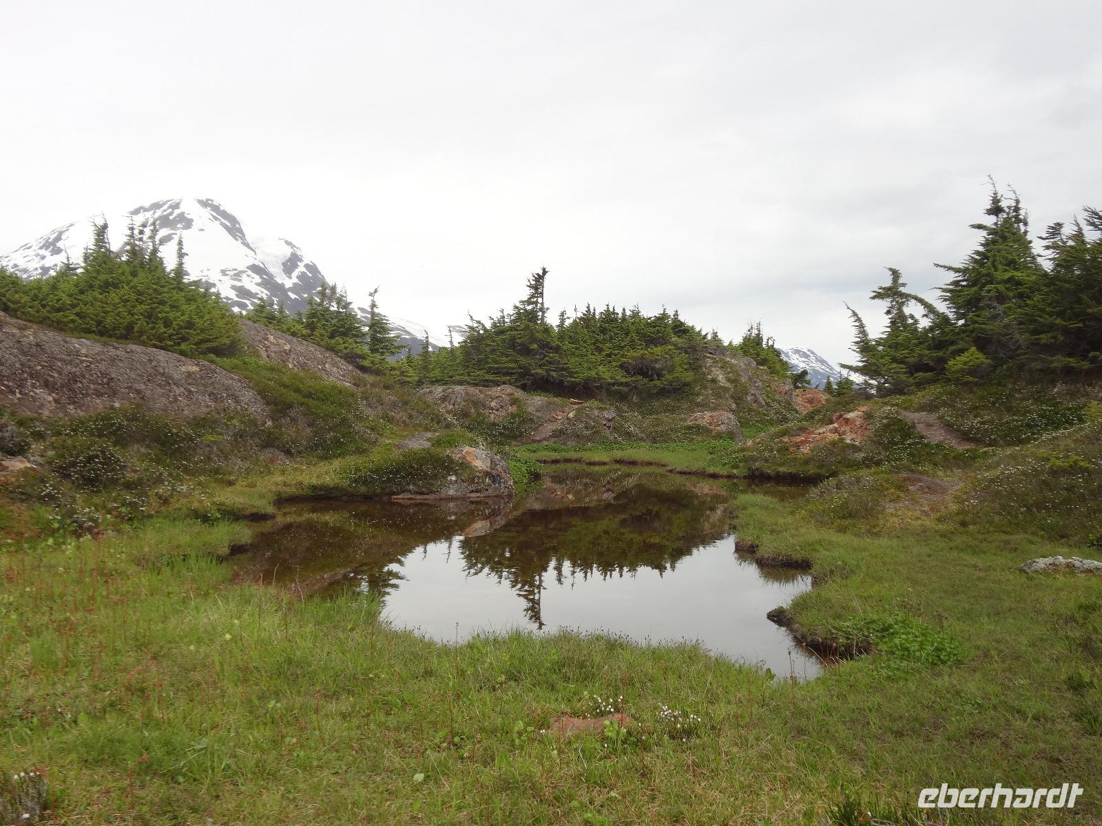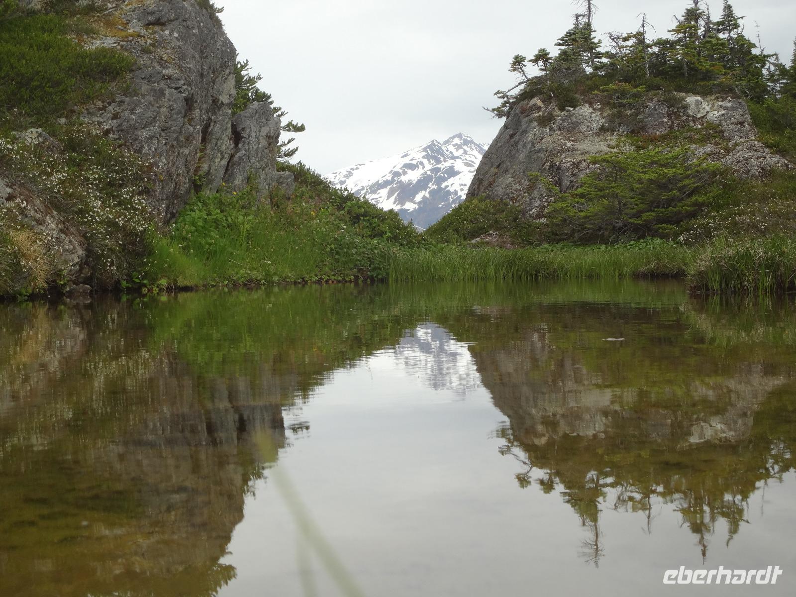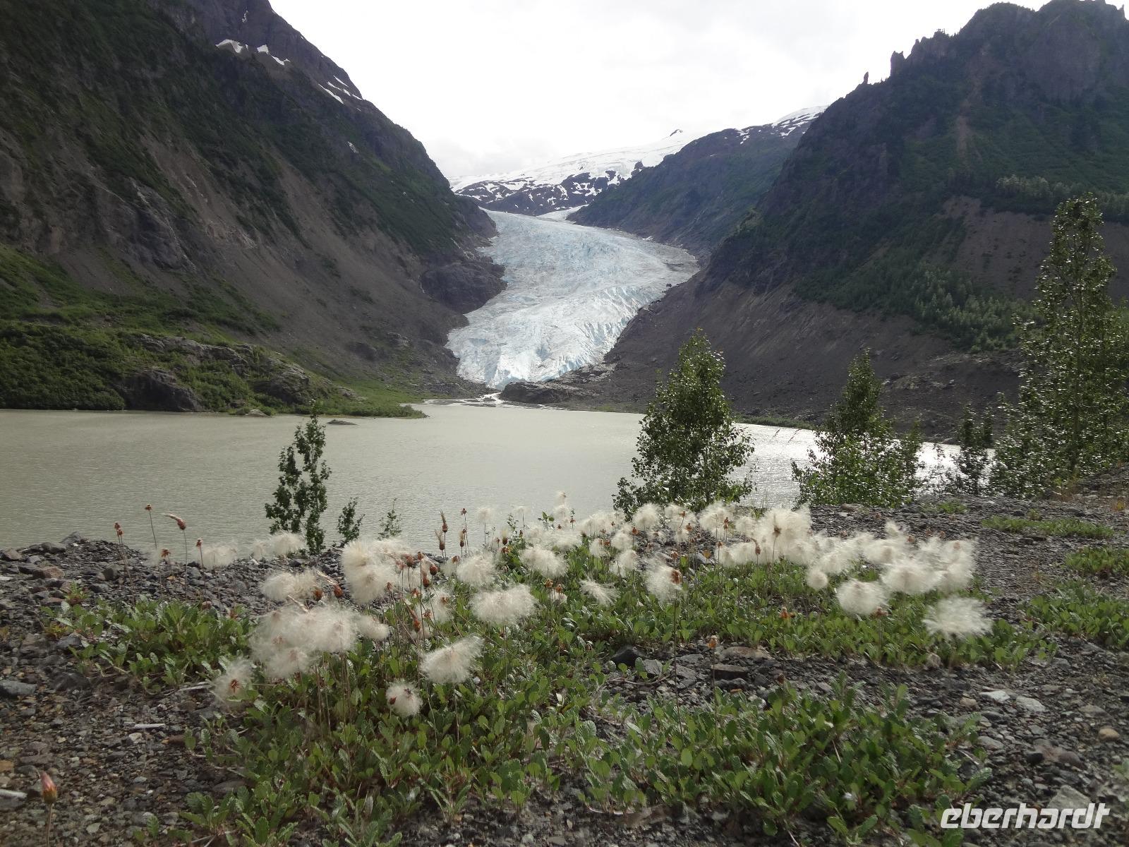 Heute in der Frueh wartet Goran mit unserem Bus auf uns, er ist glueckseelig, denn heute faehrt er uns bloss 3 Km an die amerikanische Grenze. Dort werden wir von Clint und seinem gelben Schulbus abgeholt. Wir sind nun in Hyder, in Amerika, in Alaska und es fuehlt sich ganz besonders an. Anscheinend sind vor 3 Tagen Lachse den Fish Creek River hinaufgeschwommen und 10 Grizzli haben sich an ihnen gelabt. Wir fahren also gleich zum Fish Creek und erfahren vom Ranger, dass seit 3 Tagen keine Lachse mehr gesichtet wurden, vielleicht sei der Fluss irgendwo unterbrochen, sie wuerden nachschauen heute Nachmittag. Also fahren wir weiter bis an unser Ziel. Auf einer Schotterstrasse, auf eine Moraine, fahren wir an Gold und Silberminen vorbei. Wir geniessen eine enorm-grandiose Sicht auf den Salmon Gletscher. Dieser Gletscher ist rund 60 Km lang und Clint geht immer neben uns her mit seinem Schiessgewehr. Er erwartet wohl unerwuenschten Besuch ! Nichts mit Besuch, keine Grizzli, das ist auch gut so. Wir bestaunen den Gletscher, kraxeln auf den Berg dahinter um die Wildblumen anzuschauen, machen Bekanntschaft mit den jungen Argentiniern die schon seit 2 Jahren in ihren VW Bussen unterwegs sind und essen dann unser ausgiebiges Picknick. Auf der Rueckfahrt halten wir nochmals bei Fish Creek. Es gäbe kein Unterbrechung, es sei bloss viel zu wenig Wasser im Fluss und daher kommen die Fische nicht hoch und die Baeren sind auch nicht da um sie zu fangen. Hyder ist ein fast ausgestorbenes Doerfchen. Wir speichern einige Bilder in unseren Fotoapparaten und fahren alsbald zur kanadischen Grenze. Nun muessen wir wieder einreisen und jeder bekommt noch einen Stempel in seinen Pass. Danach haben wir ein bisschen Verschnaufpause ehe es zu unserem nächsten Abenteuer auf geht. Viele haben uns fuer einen Helikopter Flug angemeldet und uns daran auch ergoetzt. Die Eisfelder, Gletscher und Fjorde sind einfach gigantisch. Alle treffen sich nach dem Abendbrot auf einen Absacker der heute bis ins Morgengrauen dauert.