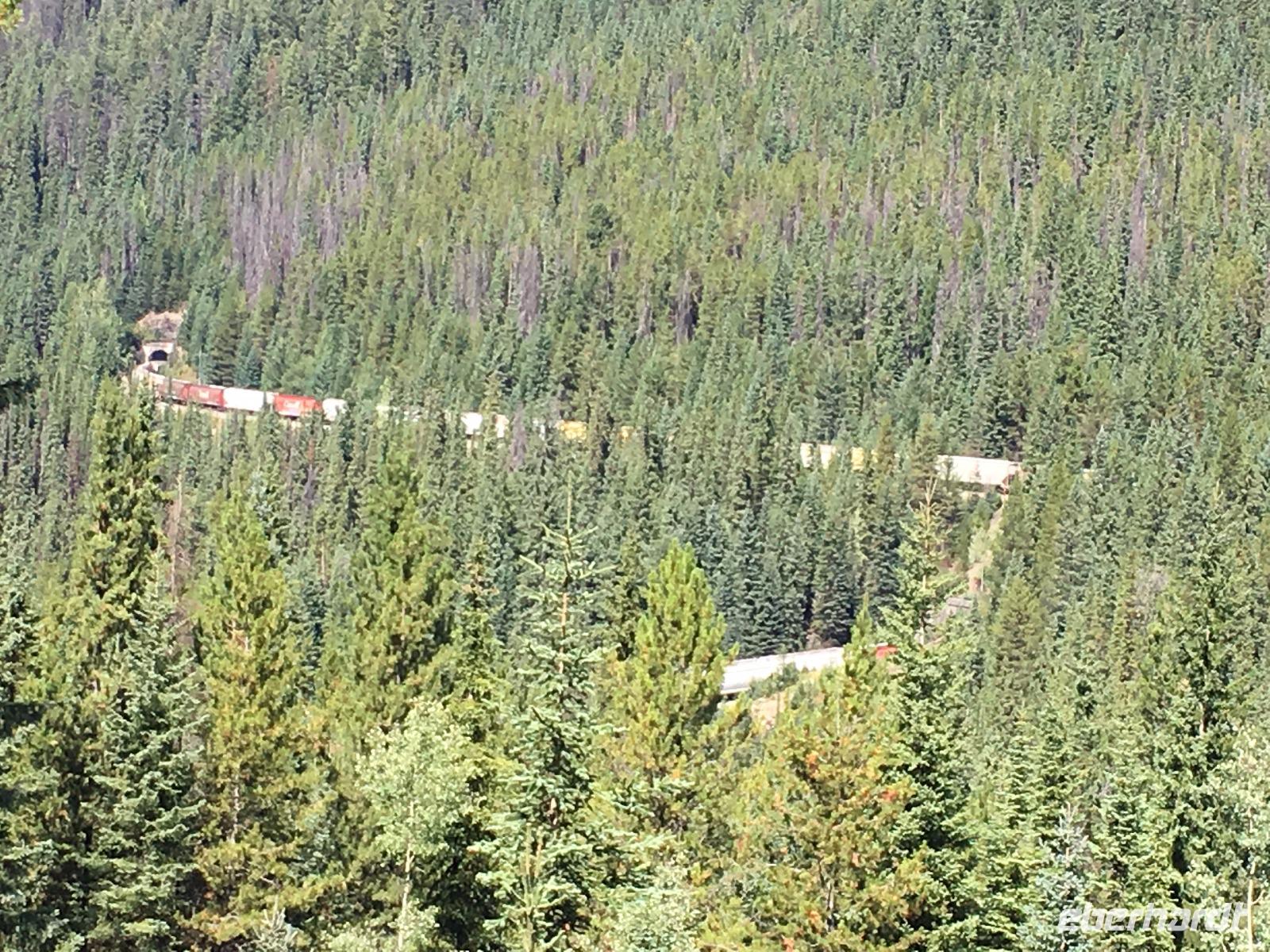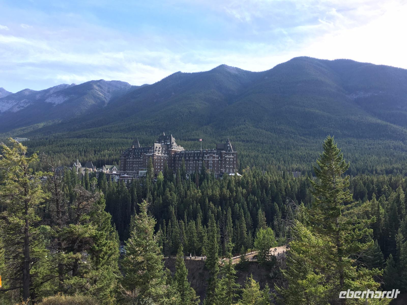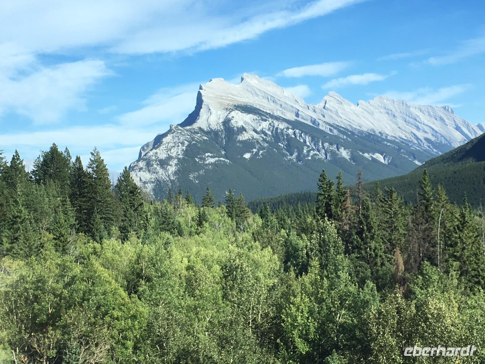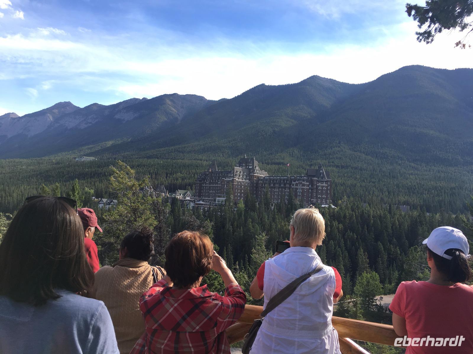 Ein wunderschoener Morgen erwartet uns und nach dem Genuss des Fruehstuecksbuffets fahren wir gleich los auf eine kurze Calgary Stadtrundfahrt. Wir sehen auch den Saddledome, wo jaehrlich die beruehmte Stampede abgehalten wird. So ein Rodeo muss eine Hetz sein. Die Stadt besteht bloss aus Glass-Hochhaeuser die sich ineinander spiegeln. Wir haben heute jedoch noch was anderes vor, denn die Rocky Montains warten schon auf uns. Nachdem wir noch kurz beim Olympischen Zentrum Calgarys aussteigen und hoffen Eddy the Eagle zu sehen, begruessen uns schon die maechtigen Berge. Wir fahren bei Banff vorbei gleich zum Lake Louise. Ein Fotostopp musste vorher noch sein, denn der praechtige Castle Mountain ist heute besondrs schoen beleuchtet. Das Gruppenbild wird sicher toll. Der tuerkisfarbene Lake Louise glitzert in der Sonne und Victoria Gletscher leuchtet im Hintergrund. Es ist eine wahre Pracht. Unsere Fahrt fuehrt uns in den Yoho Nationalpark und da halten wir auch bei den Spiraltunnel an und.... siehe da....ein Monsterzug von vielleicht 200 Wagons faehrt gerade in den einen Berg hinein. Wir bleiben offenen Mundes stehen, als wir denselben Zug ein paar Minuten danach wieder aus dem Berg hinausfahren sehen, wobei wir gleichzeitig die Wagons auch hineinfahren sehen. Die Zugspitze macht nun eine weitere Schlaufe und faehrt gleich unter uns durch wobei wir noch immer die hinteren Wagons in den Berg hinein und hinausfahren sehen. Ein Spektakel sondergleichen wird uns hier geboten. Bei Emerald Lake gehen wir spazieren ehe wir dem tosenden Kicking Horse River zuschauen wie er unter einer natuerlichen Steinbruecke durchbraust. So viele herrliche Eindruecke die koennen wir nun auf der Fahrt nach Banff verdauen denn dort machen wir noch eine kleine Rundfahrt um alles ueber Banff und seine Geschichte zu sehen und zu hoeren. Nach so einem vollen Tag sehnen wir uns nach einem gemuetlichen Abend und danach einem weichen Bett. Gute Nacht. Wir traeumen von endlosen Zuegen und smaragdgruenen Seen.