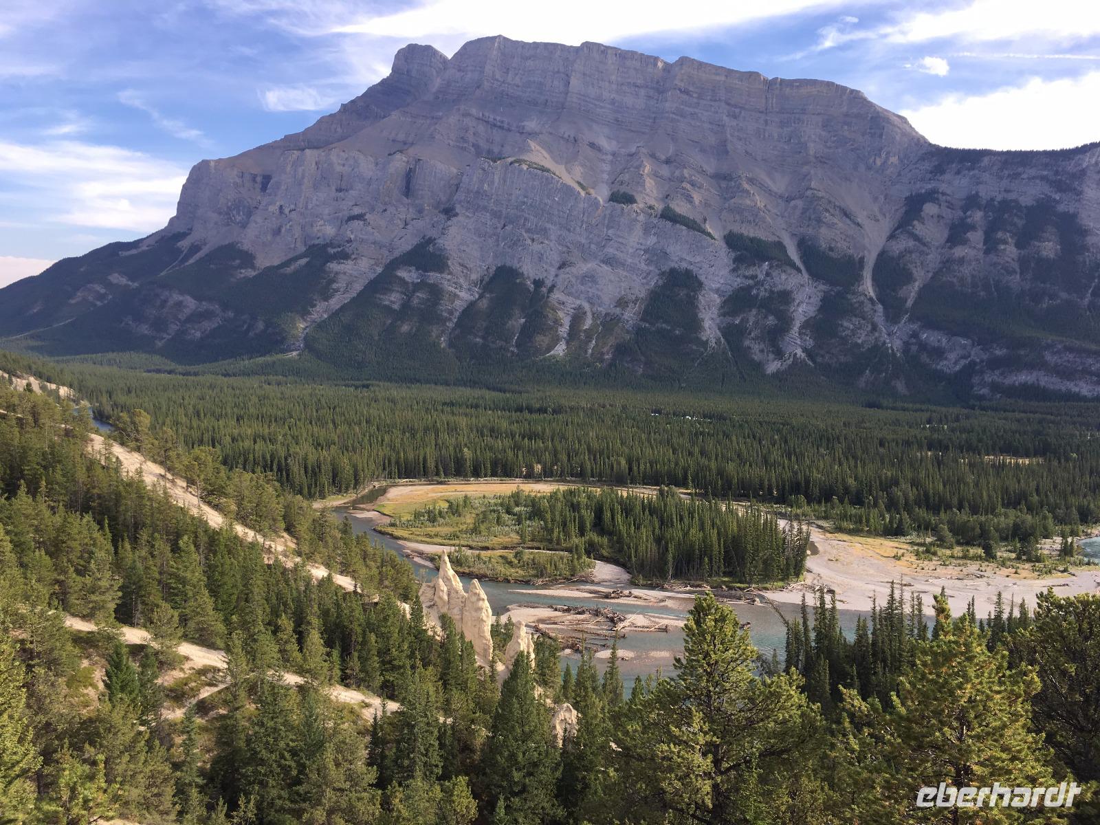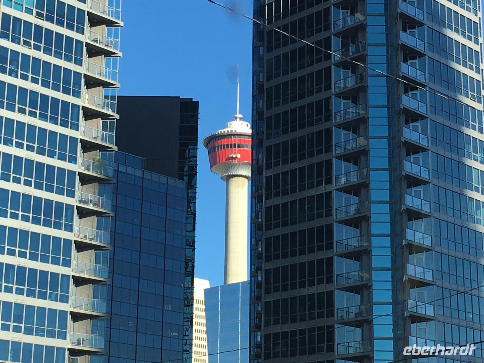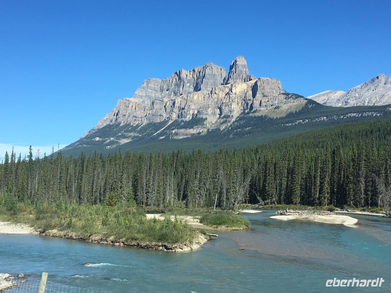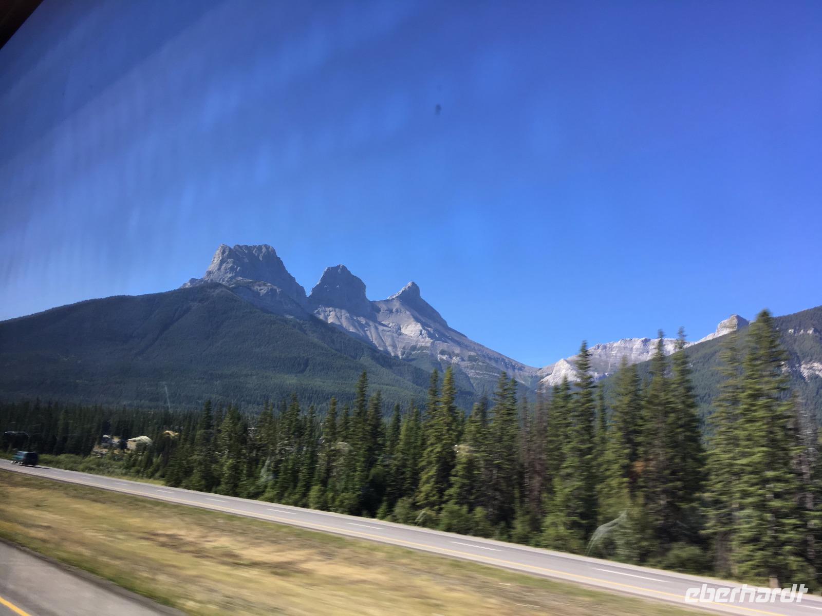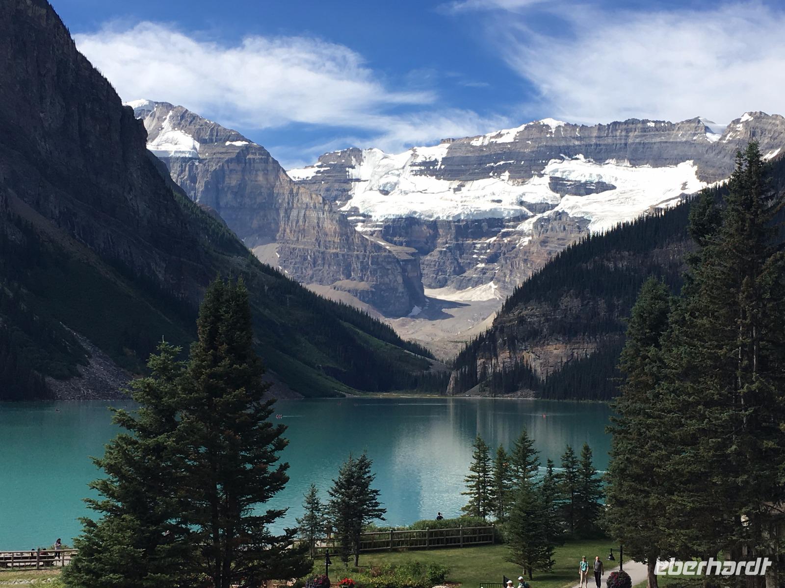Ein wunderschoener Morgen erwartet uns und nach dem Genuss des Fruehstuecksbuffets fahren wir gleich los auf eine kurze Calgary Stadtrundfahrt. Wir sehen auch den Saddledome, wo jaehrlich die beruehmte Stampede abgehalten wird. So ein Rodeo muss eine Hetz sein. Die Stadt besteht bloss aus Glass-Hochhaeuser die sich ineinander spiegeln. Wir haben heute jedoch noch was anderes vor, denn die Rocky Montains warten schon auf uns. Nachdem wir noch kurz beim Olympischen Zentrum Calgarys aussteigen und hoffen Eddy the Eagle zu sehen, begruessen uns schon die maechtigen Berge. Wir fahren bei Banff vorbei gleich zum Lake Louise. Ein Fotostopp musste vorher noch sein, denn der praechtige Castle Mountain ist heute besondrs schoen beleuchtet. Das Gruppenbild wird sicher toll. Der tuerkisfarbene Lake Louise glitzert in der Sonne und Victoria Gletscher leuchtet im Hintergrund. Es ist eine wahre Pracht. Unsere Fahrt fuehrt uns in den Yoho Nationalpark und da halten wir auch bei den Spiraltunnel an und.... siehe da....ein Monsterzug von vielleicht 200 Wagons faehrt gerade in den einen Berg hinein. Wir bleiben offenen Mundes stehen, als wir denselben Zug ein paar Minuten danach wieder aus dem Berg hinausfahren sehen, wobei wir gleichzeitig die Wagons auch hineinfahren sehen. Die Zugspitze macht nun eine weitere Schlaufe und faehrt gleich unter uns durch wobei wir noch immer die hinteren Wagons in den Berg hinein und hinausfahren sehen. Ein Spektakel sondergleichen wird uns hier geboten. Bei Emerald Lake gehen wir spazieren ehe wir dem tosenden Kicking Horse River zuschauen wie er unter einer natuerlichen Steinbruecke durchbraust. So viele herrliche Eindruecke die koennen wir nun auf der Fahrt nach Banff verdauen denn dort machen wir noch eine kleine Rundfahrt um alles ueber Banff und seine Geschichte zu sehen und zu hoeren. Nach so einem vollen Tag sehnen wir uns nach einem gemuetlichen Abend und danach einem weichen Bett. Gute Nacht. Wir traeumen von endlosen Zuegen und smaragdgruenen Seen.