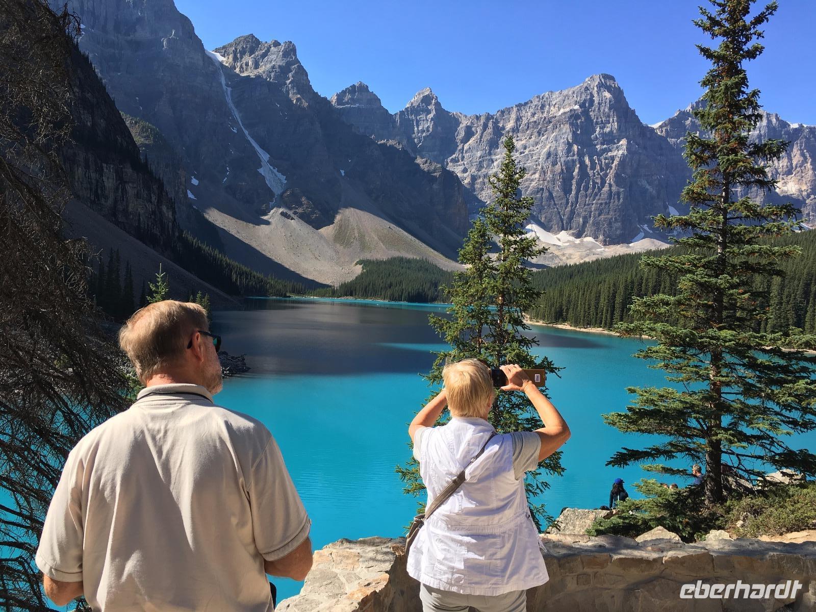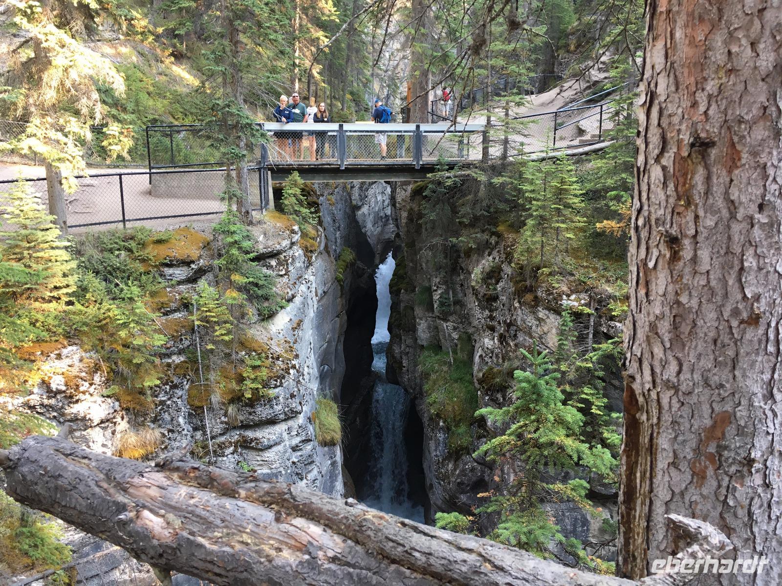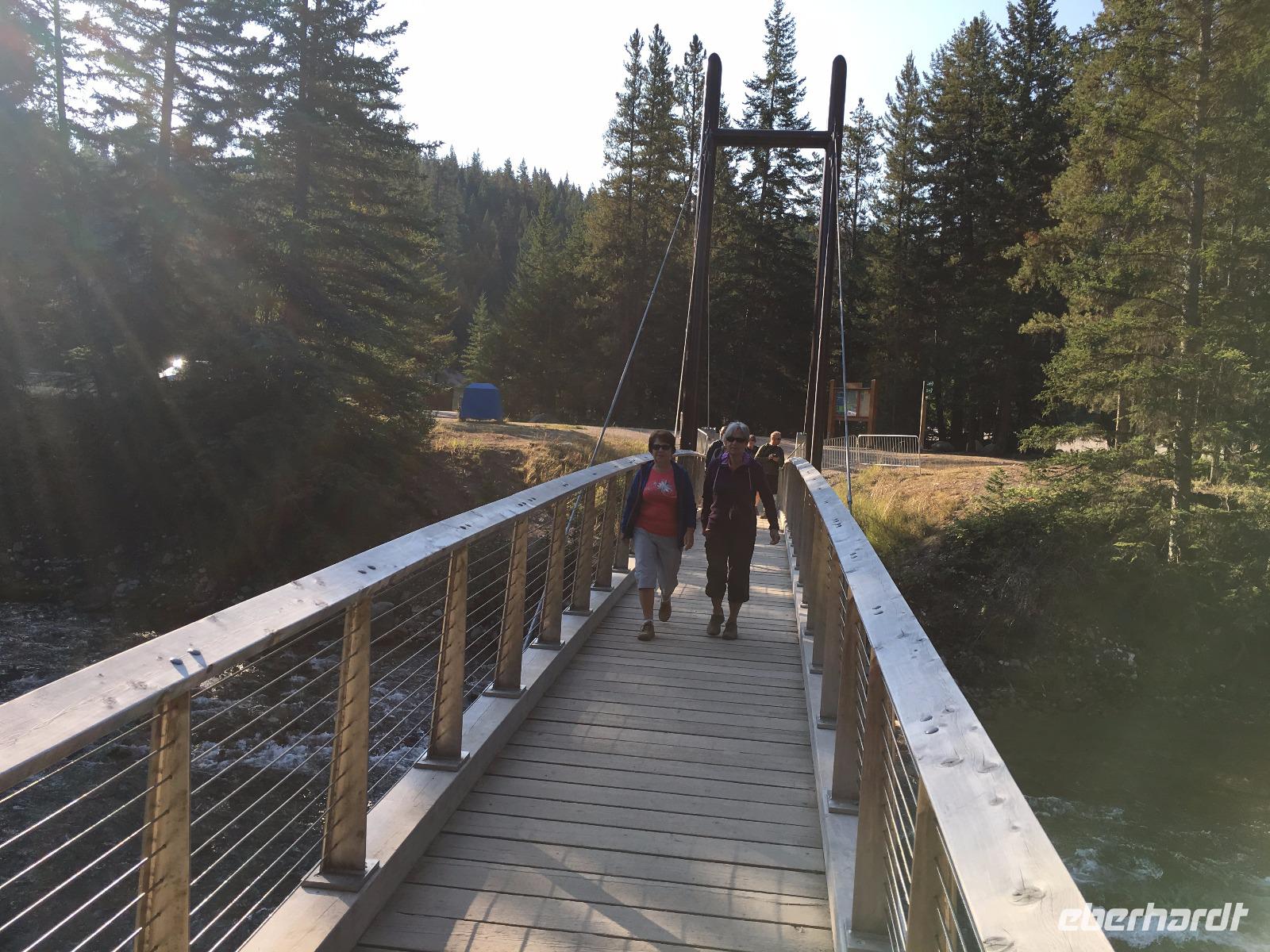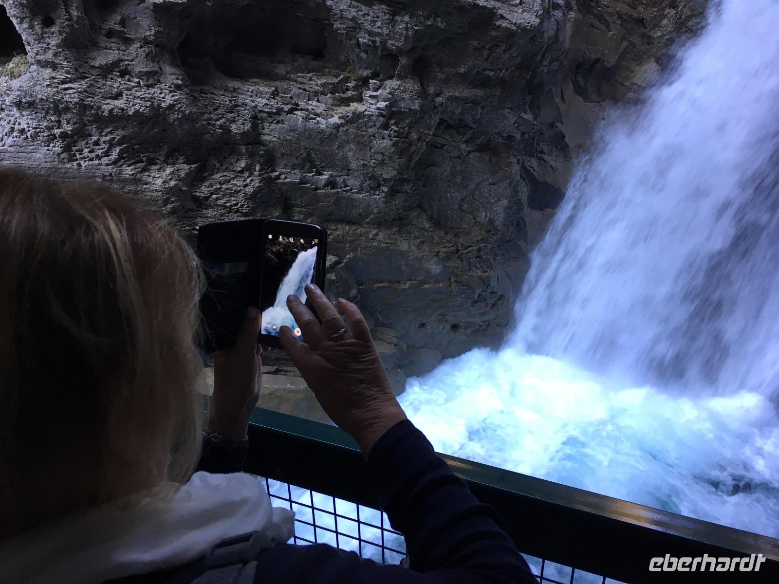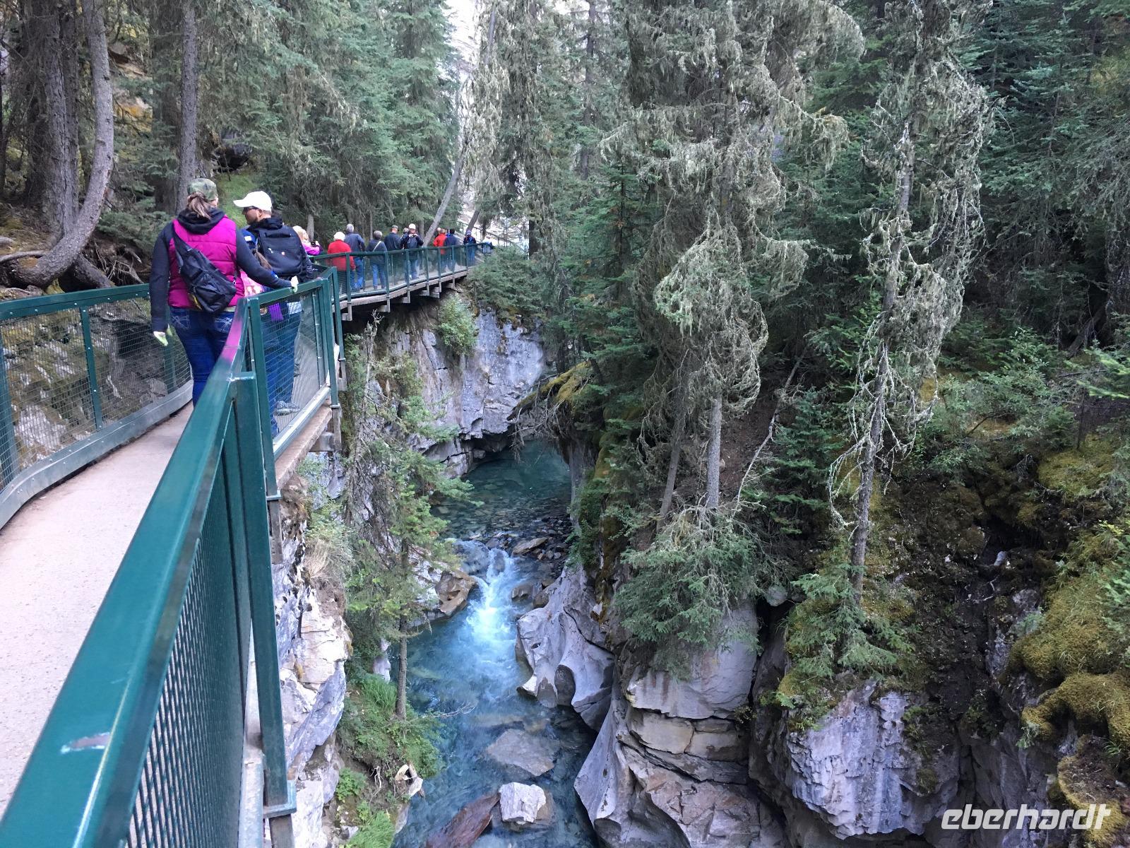 Auch heute scheint die Sonne wieder in unsere Zimmer was uns natuerlich gleich in Schwung bringt. Der Jet lag haelt uns noch immer einige Stunden pro Nacht wach, aber wir lassen uns nichts anmerken. Niemand sieht die Augenringe der anderen ! Auf gehts gleich zu einer kleiner Wanderung in einer Klamm. Der Johnston Canyon ist sehr beliebt und wir wandern die kurze Strecke bis zum Jacuzzi der Indianer und wieder zurueck. Eindruecklich ist dieser Canyon und bezaubernd sein Wasserfall. Nun gehts gleich weiter zu Lake Moraine. Die Aussicht, welche es sogar einemal auf eine 20 Dollar Note geschaft hat, geniessen wir in vollen Zuegen. So wunderschoen wie heute, zeigt sich dieser See nicht oft. Die paar roten Paddelboote darauf verschoenern das Bild dieses, von hohen Bergen eingerahmten, Sees. Heute wollen wir aber noch auf die beruehmte Icefield Parkway, die Prachtstrasse der Rocky Mountains. Erster Halt ist beim Crawfoot Gletscher, danach staunen wir ueber die Schoenheit des Bow Sees und seinem Gletscher und gleich danach bewundern wir Peto Lake, den Dackel. Hier, auf einmal sehen wir ihn, ein schoener ausgewachsenerSchwarzbaer laeuft am Strassenrand entlang. Wir sind die einzigen die ihn sehen, er hat ein wunderschoenes schwarzes glaenzendes Fell nur geht er leider auch bald wieder in den Wald hinein. Wir haben ihn bildlich festgehalten, was fuer eine Aufregung. Auf dem Seevogel See gibt es auch heute keine Entchen und so fahren wir weiter zur Mittagspause im Saskatchewan River Crossing. Waehrend der Fahrt hinauf zum Athabasca Gletscher sehen wir ploetzlich rechts oben auf der Boeschung 3 Krummhornschafe. Sie passen perfekt ins Landschaftsbild, man sieht sie kaum denn ihr Fell hat genau dieselbe Farbe wie ihre Umgebung. Nun gehts aber weiter zu unserer Gletscherfahrt. Auch dies ist ein Spektakel, bei warmen schoenen Wetter fahren wir mit einem Sondergefaehrt auf den Athabasca Gletscher, welcher Teil des Columbia Eisfeldes ist. Dort steigen wir oben auch aus. Eberhardt hat uns auf diesen Ausflug eingeladen, also stossen wir auch gebuehrend auf diese Einladung ein, mit kanadischem Whiskey. Dath Eisch wird immer rutschiger und lustig werden wir wieder zurueckgefahren wo Goran schon auf uns wartet damit er uns sicher in die Sunwapta Lodge bringen kann. Einige spazieren danach noch an die Wasserfaelle gleich neben dem Waldhotel und andere ruhen sich mal ein wenig aus. Das BBQ heute abend ist fantastisch und Kerstins lustige Erklaerungen ueber die Tierwelt der Rocky Mountains runden diesen schoenen Tag ab. Keiner braucht ein Gute-Nacht-Liedchen.