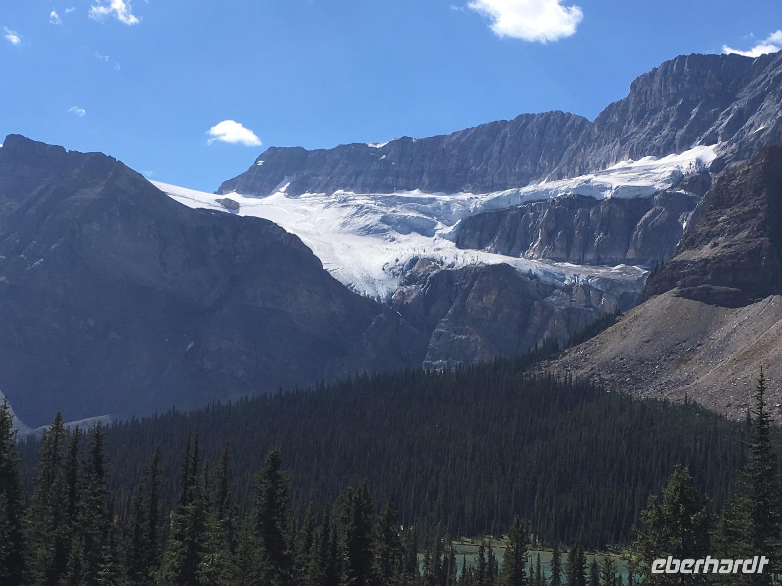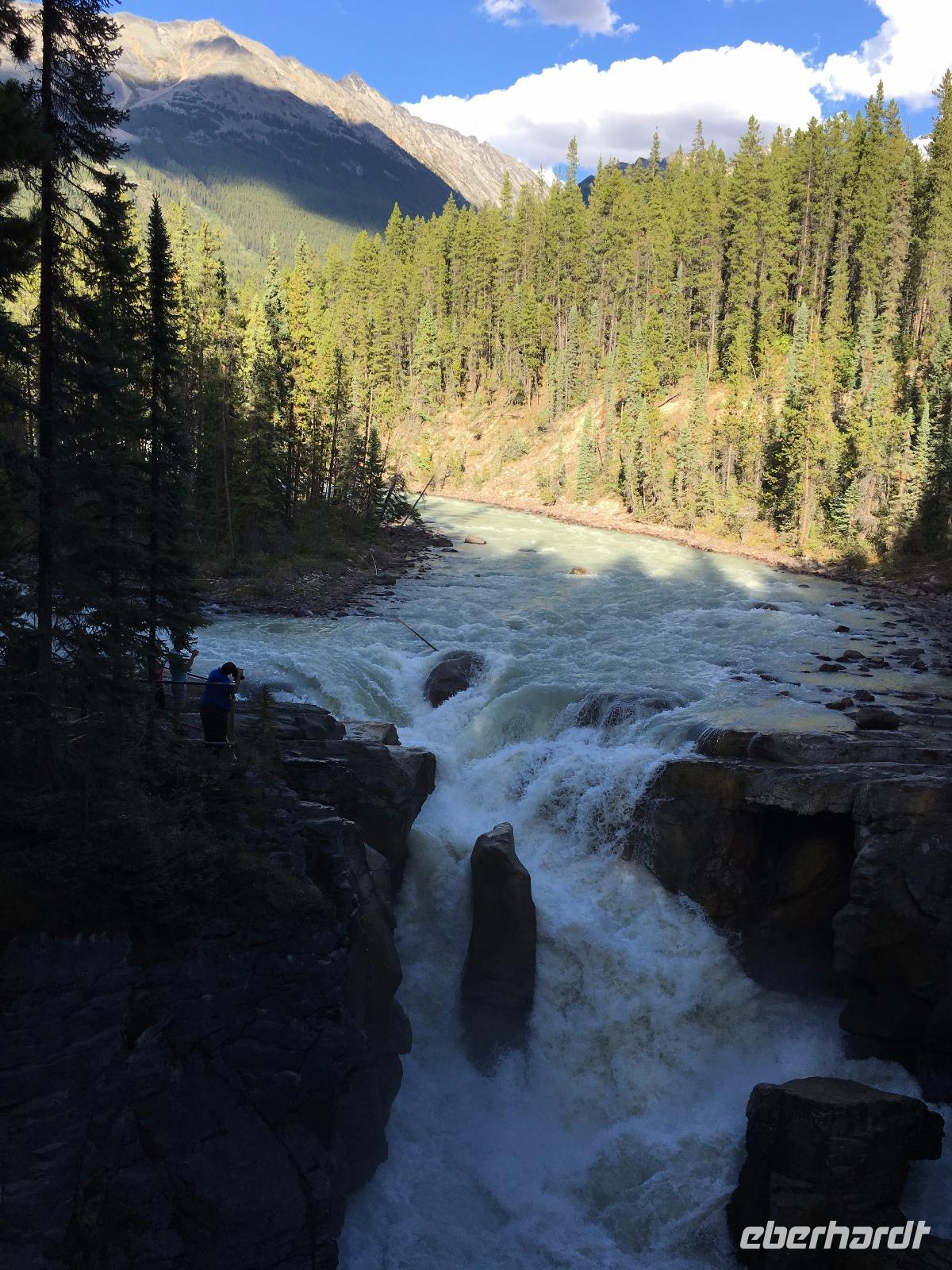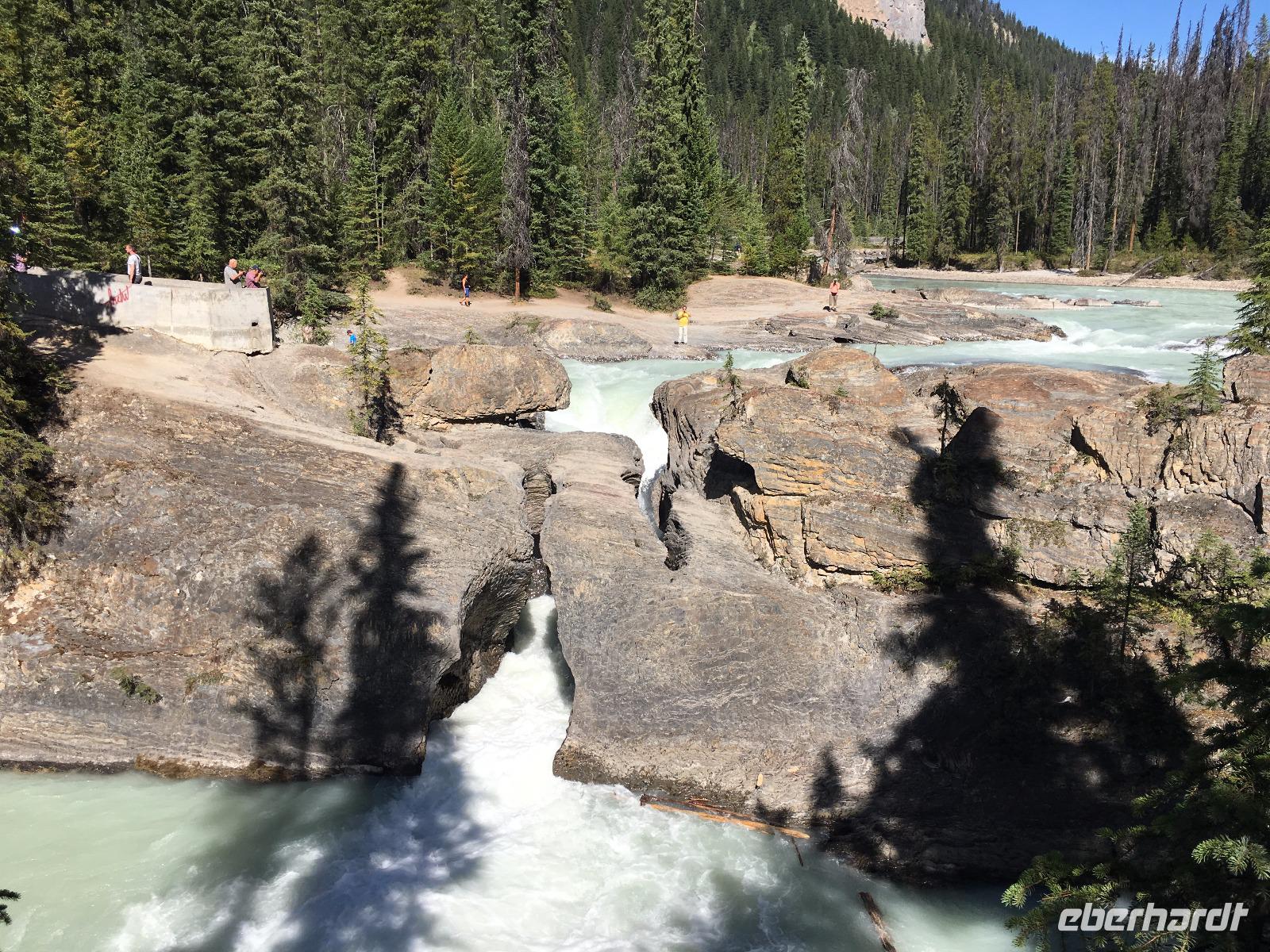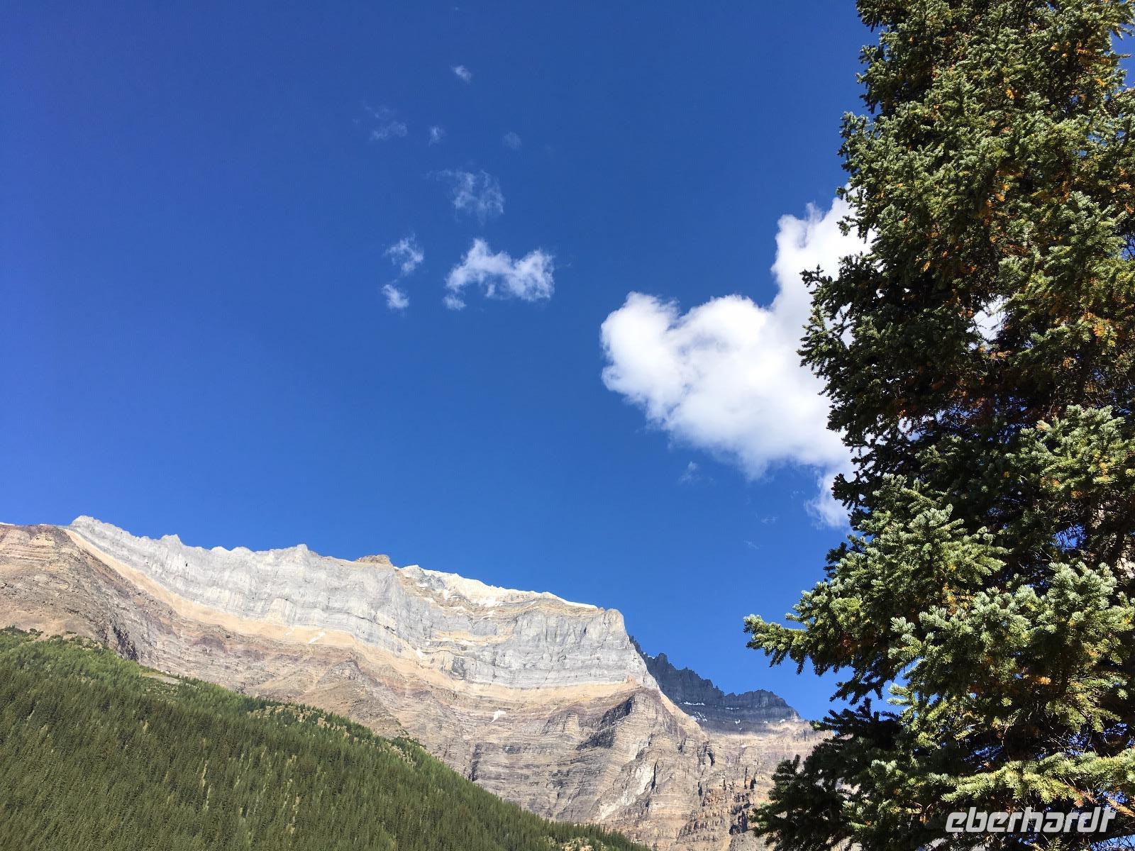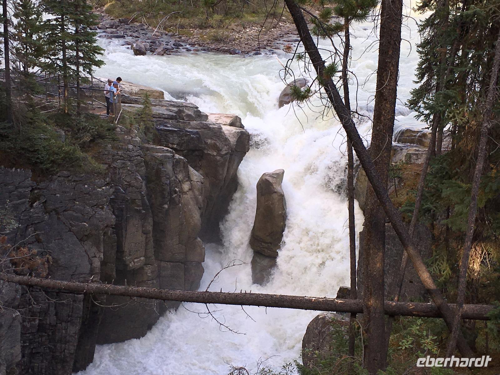 Auch heute scheint die Sonne wieder in unsere Zimmer was uns natuerlich gleich in Schwung bringt. Der Jet lag haelt uns noch immer einige Stunden pro Nacht wach, aber wir lassen uns nichts anmerken. Niemand sieht die Augenringe der anderen ! Auf gehts gleich zu einer kleiner Wanderung in einer Klamm. Der Johnston Canyon ist sehr beliebt und wir wandern die kurze Strecke bis zum Jacuzzi der Indianer und wieder zurueck. Eindruecklich ist dieser Canyon und bezaubernd sein Wasserfall. Nun gehts gleich weiter zu Lake Moraine. Die Aussicht, welche es sogar einemal auf eine 20 Dollar Note geschaft hat, geniessen wir in vollen Zuegen. So wunderschoen wie heute, zeigt sich dieser See nicht oft. Die paar roten Paddelboote darauf verschoenern das Bild dieses, von hohen Bergen eingerahmten, Sees. Heute wollen wir aber noch auf die beruehmte Icefield Parkway, die Prachtstrasse der Rocky Mountains. Erster Halt ist beim Crawfoot Gletscher, danach staunen wir ueber die Schoenheit des Bow Sees und seinem Gletscher und gleich danach bewundern wir Peto Lake, den Dackel. Hier, auf einmal sehen wir ihn, ein schoener ausgewachsenerSchwarzbaer laeuft am Strassenrand entlang. Wir sind die einzigen die ihn sehen, er hat ein wunderschoenes schwarzes glaenzendes Fell nur geht er leider auch bald wieder in den Wald hinein. Wir haben ihn bildlich festgehalten, was fuer eine Aufregung. Auf dem Seevogel See gibt es auch heute keine Entchen und so fahren wir weiter zur Mittagspause im Saskatchewan River Crossing. Waehrend der Fahrt hinauf zum Athabasca Gletscher sehen wir ploetzlich rechts oben auf der Boeschung 3 Krummhornschafe. Sie passen perfekt ins Landschaftsbild, man sieht sie kaum denn ihr Fell hat genau dieselbe Farbe wie ihre Umgebung. Nun gehts aber weiter zu unserer Gletscherfahrt. Auch dies ist ein Spektakel, bei warmen schoenen Wetter fahren wir mit einem Sondergefaehrt auf den Athabasca Gletscher, welcher Teil des Columbia Eisfeldes ist. Dort steigen wir oben auch aus. Eberhardt hat uns auf diesen Ausflug eingeladen, also stossen wir auch gebuehrend auf diese Einladung ein, mit kanadischem Whiskey. Dath Eisch wird immer rutschiger und lustig werden wir wieder zurueckgefahren wo Goran schon auf uns wartet damit er uns sicher in die Sunwapta Lodge bringen kann. Einige spazieren danach noch an die Wasserfaelle gleich neben dem Waldhotel und andere ruhen sich mal ein wenig aus. Das BBQ heute abend ist fantastisch und Kerstins lustige Erklaerungen ueber die Tierwelt der Rocky Mountains runden diesen schoenen Tag ab. Keiner braucht ein Gute-Nacht-Liedchen.
