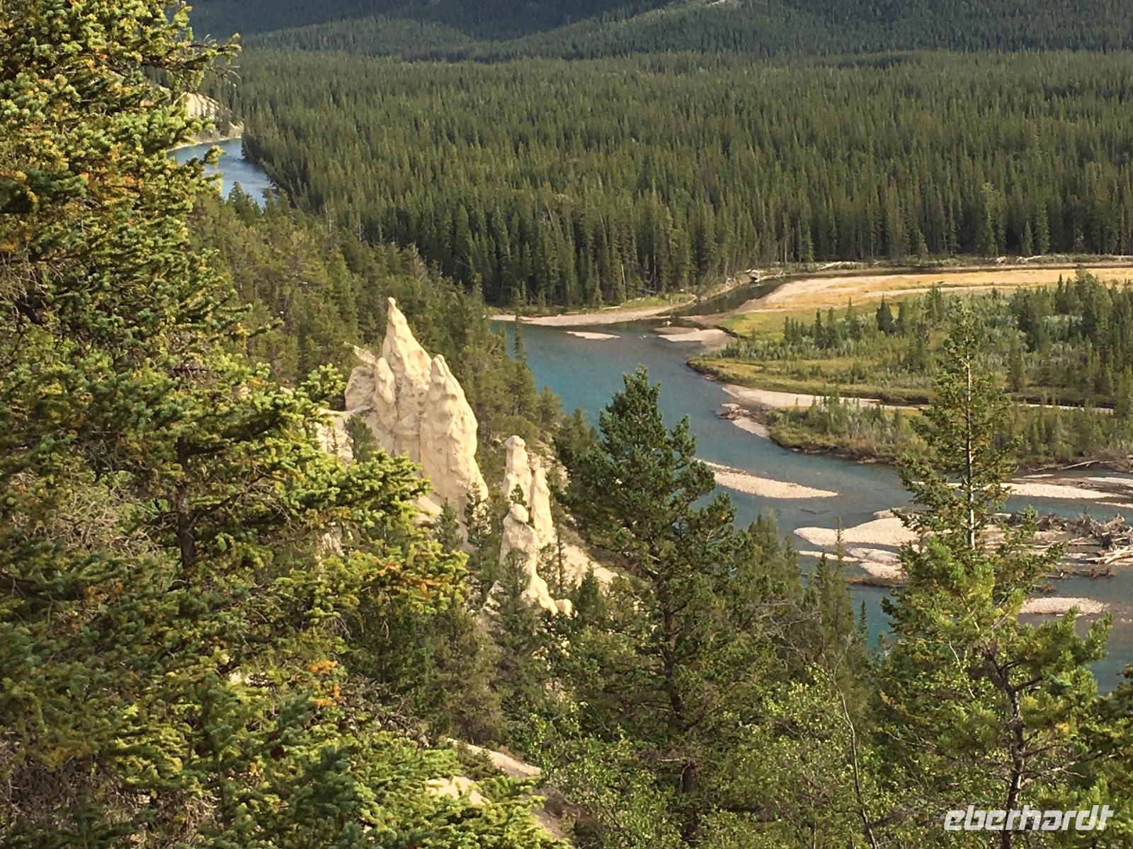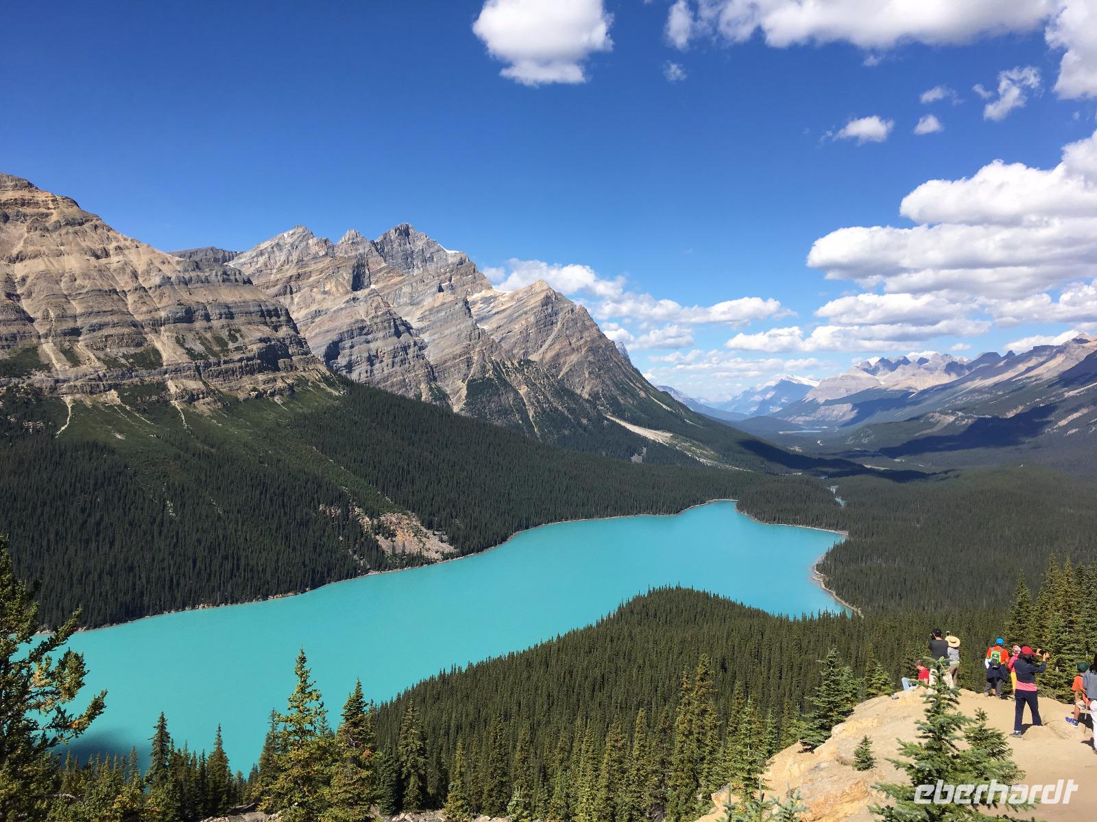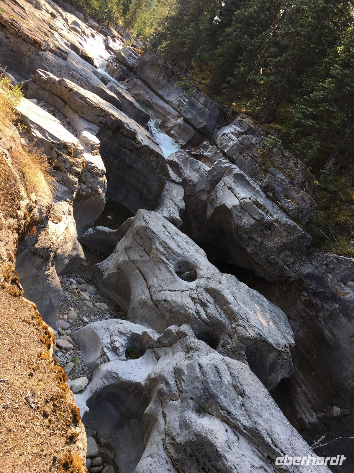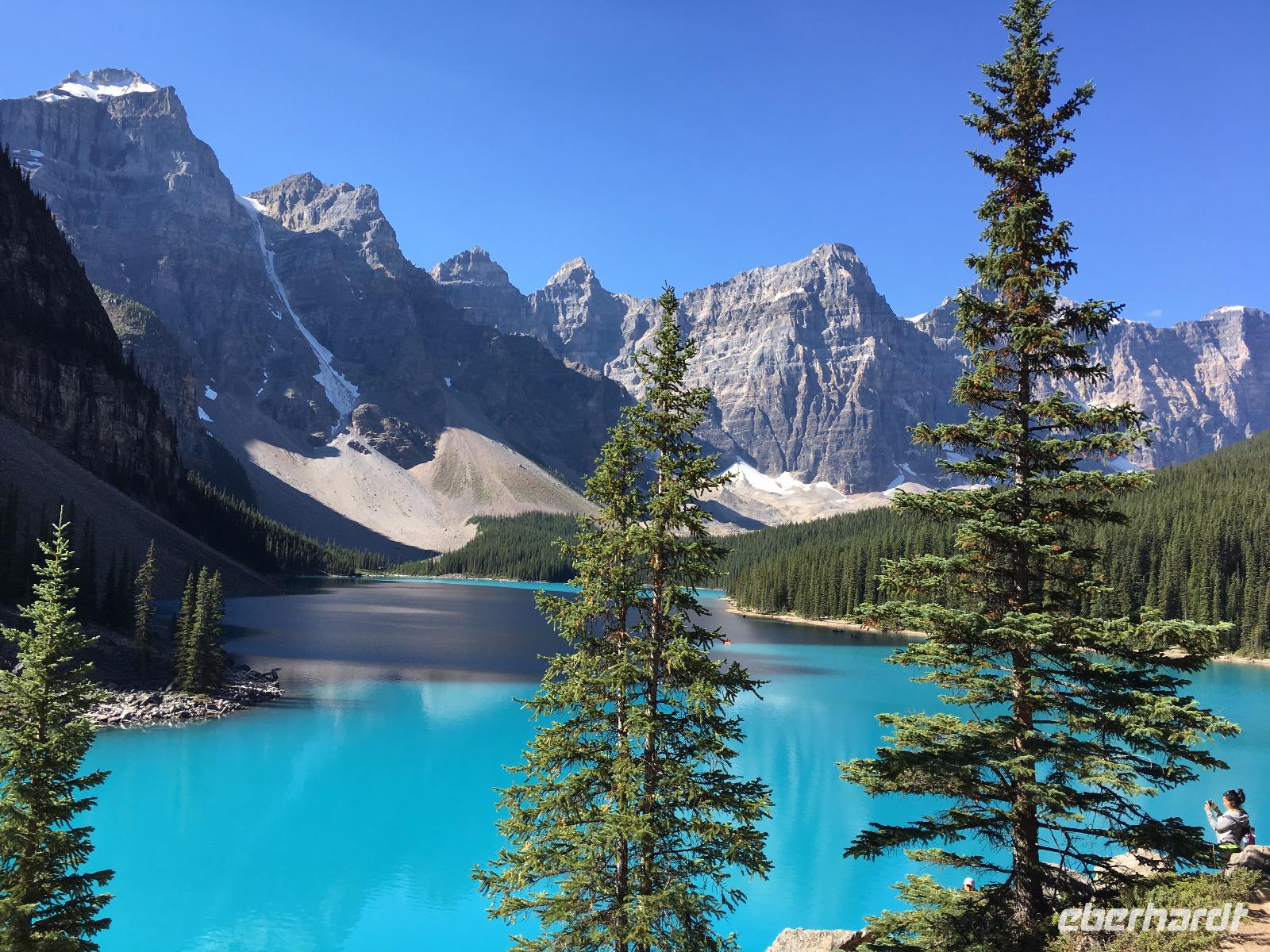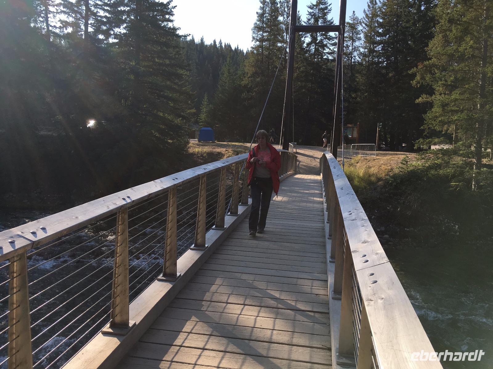 Auch heute scheint die Sonne wieder in unsere Zimmer was uns natuerlich gleich in Schwung bringt. Der Jet lag haelt uns noch immer einige Stunden pro Nacht wach, aber wir lassen uns nichts anmerken. Niemand sieht die Augenringe der anderen ! Auf gehts gleich zu einer kleiner Wanderung in einer Klamm. Der Johnston Canyon ist sehr beliebt und wir wandern die kurze Strecke bis zum Jacuzzi der Indianer und wieder zurueck. Eindruecklich ist dieser Canyon und bezaubernd sein Wasserfall. Nun gehts gleich weiter zu Lake Moraine. Die Aussicht, welche es sogar einemal auf eine 20 Dollar Note geschaft hat, geniessen wir in vollen Zuegen. So wunderschoen wie heute, zeigt sich dieser See nicht oft. Die paar roten Paddelboote darauf verschoenern das Bild dieses, von hohen Bergen eingerahmten, Sees. Heute wollen wir aber noch auf die beruehmte Icefield Parkway, die Prachtstrasse der Rocky Mountains. Erster Halt ist beim Crawfoot Gletscher, danach staunen wir ueber die Schoenheit des Bow Sees und seinem Gletscher und gleich danach bewundern wir Peto Lake, den Dackel. Hier, auf einmal sehen wir ihn, ein schoener ausgewachsenerSchwarzbaer laeuft am Strassenrand entlang. Wir sind die einzigen die ihn sehen, er hat ein wunderschoenes schwarzes glaenzendes Fell nur geht er leider auch bald wieder in den Wald hinein. Wir haben ihn bildlich festgehalten, was fuer eine Aufregung. Auf dem Seevogel See gibt es auch heute keine Entchen und so fahren wir weiter zur Mittagspause im Saskatchewan River Crossing. Waehrend der Fahrt hinauf zum Athabasca Gletscher sehen wir ploetzlich rechts oben auf der Boeschung 3 Krummhornschafe. Sie passen perfekt ins Landschaftsbild, man sieht sie kaum denn ihr Fell hat genau dieselbe Farbe wie ihre Umgebung. Nun gehts aber weiter zu unserer Gletscherfahrt. Auch dies ist ein Spektakel, bei warmen schoenen Wetter fahren wir mit einem Sondergefaehrt auf den Athabasca Gletscher, welcher Teil des Columbia Eisfeldes ist. Dort steigen wir oben auch aus. Eberhardt hat uns auf diesen Ausflug eingeladen, also stossen wir auch gebuehrend auf diese Einladung ein, mit kanadischem Whiskey. Dath Eisch wird immer rutschiger und lustig werden wir wieder zurueckgefahren wo Goran schon auf uns wartet damit er uns sicher in die Sunwapta Lodge bringen kann. Einige spazieren danach noch an die Wasserfaelle gleich neben dem Waldhotel und andere ruhen sich mal ein wenig aus. Das BBQ heute abend ist fantastisch und Kerstins lustige Erklaerungen ueber die Tierwelt der Rocky Mountains runden diesen schoenen Tag ab. Keiner braucht ein Gute-Nacht-Liedchen.