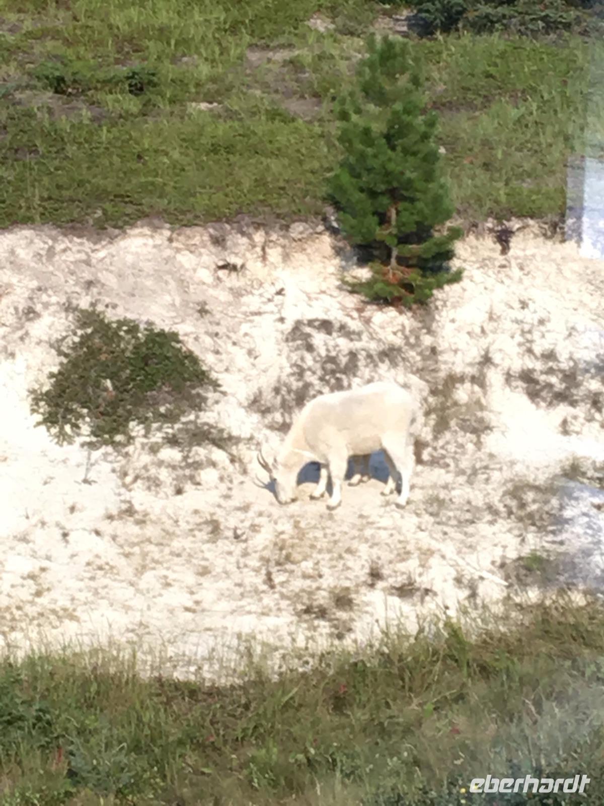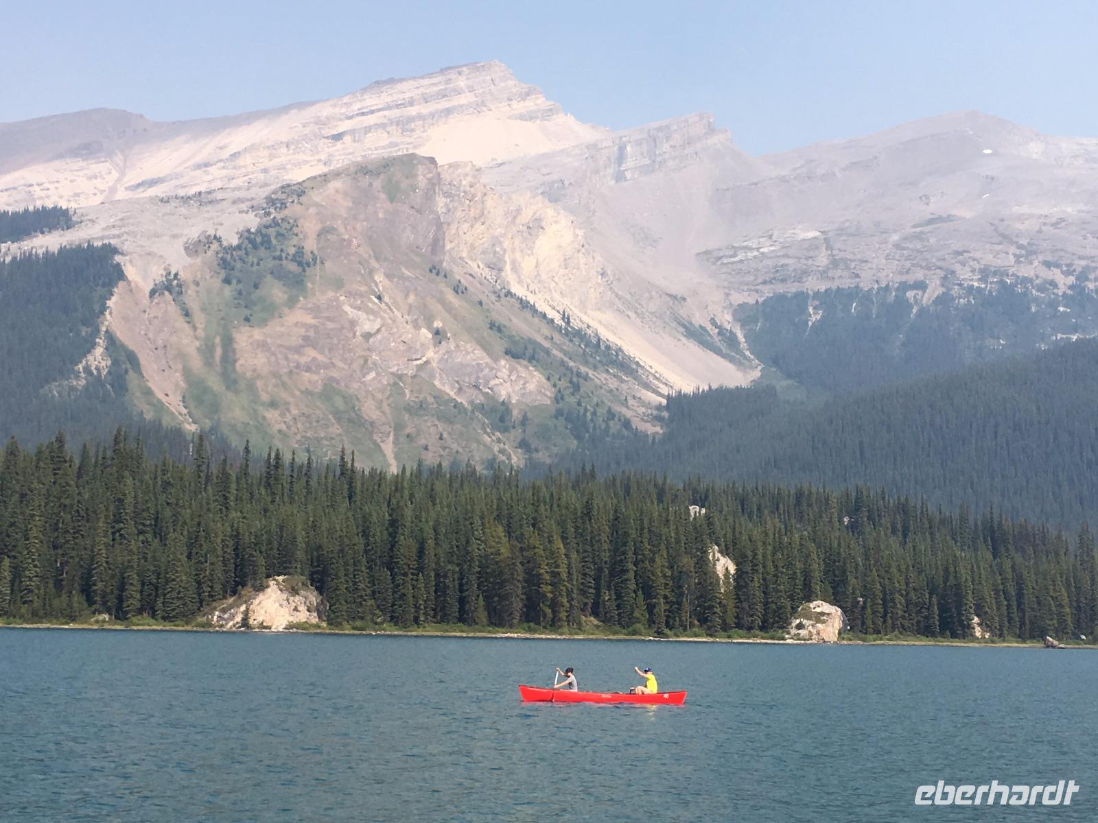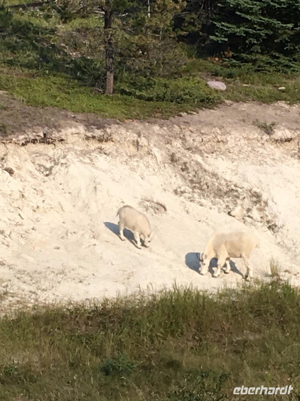 Strahlende Sonne und 7 Grad ist es heute in der Frueh. Die kurzen Hosen und das kleine T-Shirt sind jedoch genau die richtige Bekleidung fuer den heutigen Tag. Wir fahren nach dem genuesslichen Fruehstueck in Richtung Jasper, horchen der Geschichte der Hudson Bay Company zu und gelangen so in das Maligne Tal. Einige unter uns moechten gerne die Maligne Schlucht hinaufgehen, das ist ein Spaziergang von rund 1 ½ Stunden, viele Fotostopps inkludiert. Andere fahren mit dem Bus bis zum Kaffeehaus und gehen oben die kleinere Runde. Das Wasser des Maligne Flusses fasziniert uns, denn es verschwindet immer wieder durch unterirdische Gaenge und bekommt Zufluesse aus dem Felsen heraus. So ist der Wasserspiegel des Flusses immer verschieden. Der schoene Wasserfall, Weisser Ton, laedt zum verweilen ein. Unser Weg fuehrt uns weiter zu Medicin Lake. Auch hier sieht man im seichten See die Fluesse und sogar Tierspuren auf Seesgrund. Bald darauf werden wir aeusserst angenehm ueberrascht, ein Moose steht am Strassenrand und grast gemuetlich weiter. Dieses scheue Tier ziegt sich sehr selten und wir fuehlen uns wie auserkoren. Ein herrlicher Anblick und so nahe. Gluecklich kommen wir bei Maligne See an, wo sich jeder einen Inbiss auf der Terrasse mit Seeblick goennt. Um 13:45 legt unser Boot ab, wir fahren zu der beruehmten Spirit Island. Ach so schoen ist diese romantische Halbinsel umgeben von den riesengrossen Bergen. Viele Fotos spaeter fahren wir wieder zurueck, bestaunen die Gletscher und das Bergpanorama. Leider ist die Sicht nicht ganz so wie wir uns das wuenschen koennten, denn der Rauch der Waldbraende von Britisch Kolumbien zieht bis hierher. In Jasper machen wir dann nochmals Pause, denn nun brauchen wir ein Bierchen, muessen in die Drogerie, brauchen Briefmarken und wollen uns auch noch ein paar Geschaefte anschauen. Gifteln muss sein. Auf der Rueckfahrt in unsere Lodge sehen wir ploetzlich neben der Strasse auf einer ganz hellen Flaeche die wohl Salz enthaelt 4 Schneeziegen in ihrem wunderschoenen weissen Kleid. Sie haben bereits das Winterfell und schauen so putzig aus mit ihren schwarzen Hoerner. Man sieht sie kaum und viele Autos rasen einfach an ihnen vorbei. Schaut Euch die Fotos in der Galerie an, es schaut aus wie ein Suchbild. So einen vollen Tag haben wir heute erlebt und Moose und Schneeziegen gesehen, besser geht es nicht. Nun wartet noch das feine Abendessen mit Lachs oder Backhaehnchen auf uns und dann gehts ab, in die Welt der Traeume.
