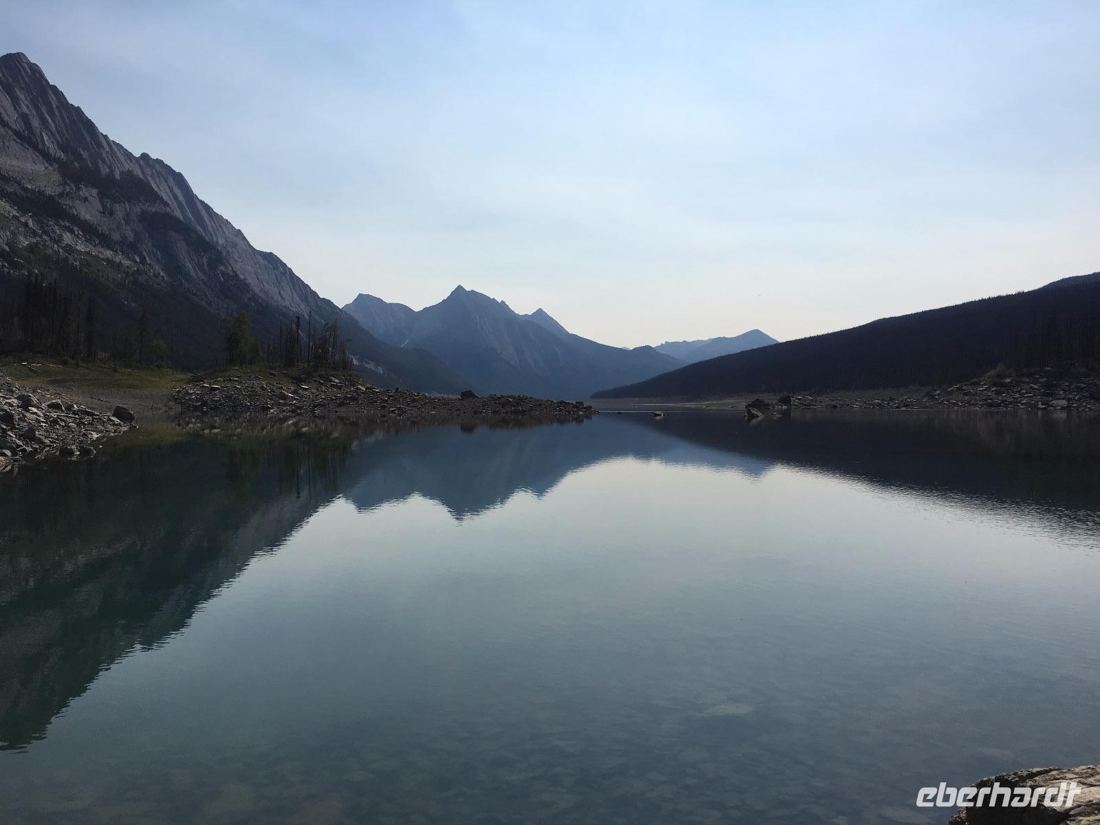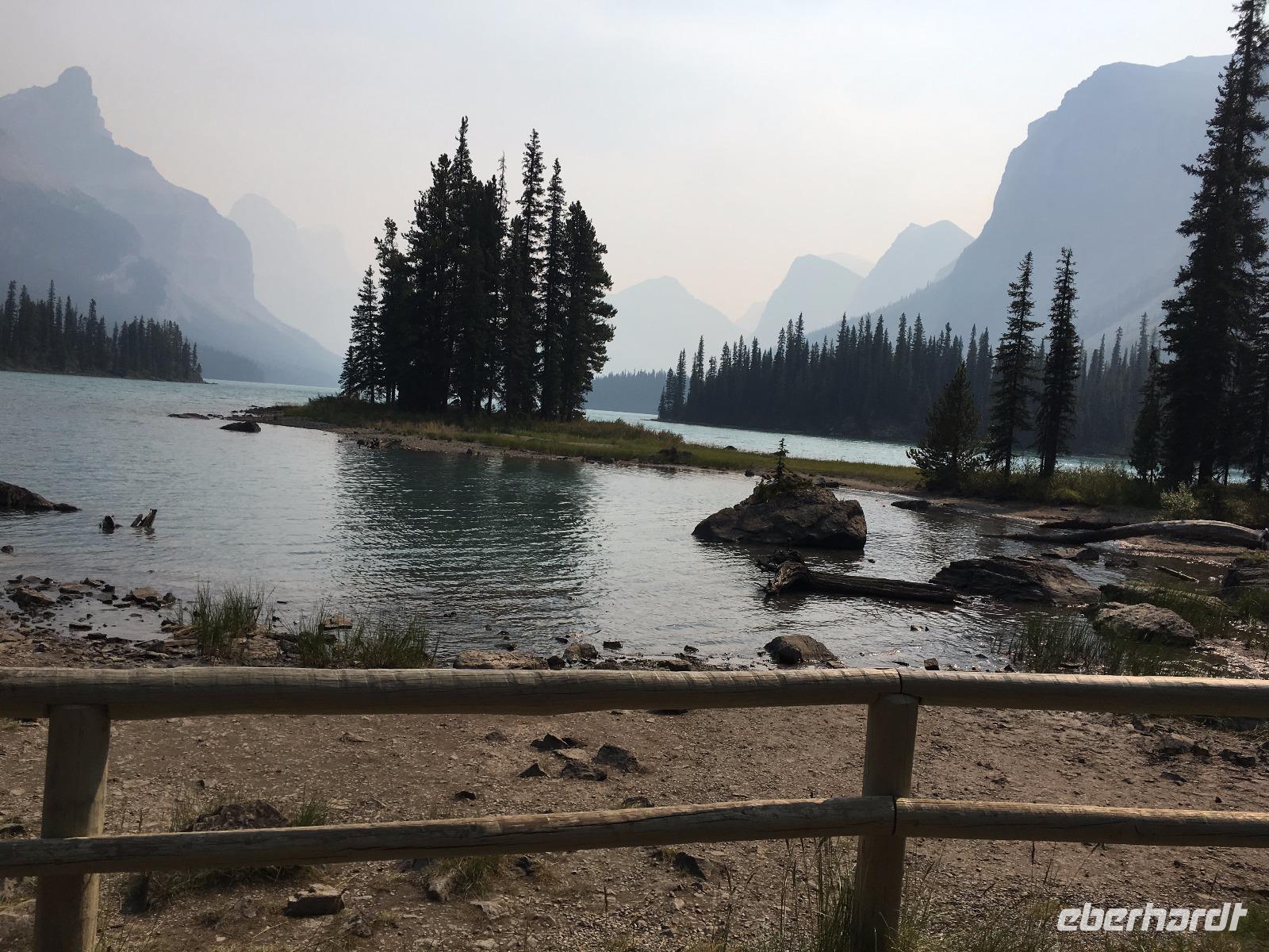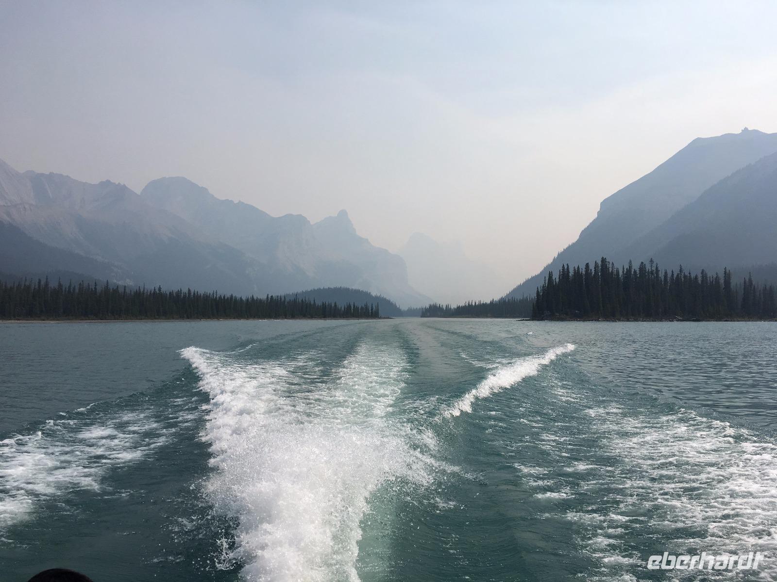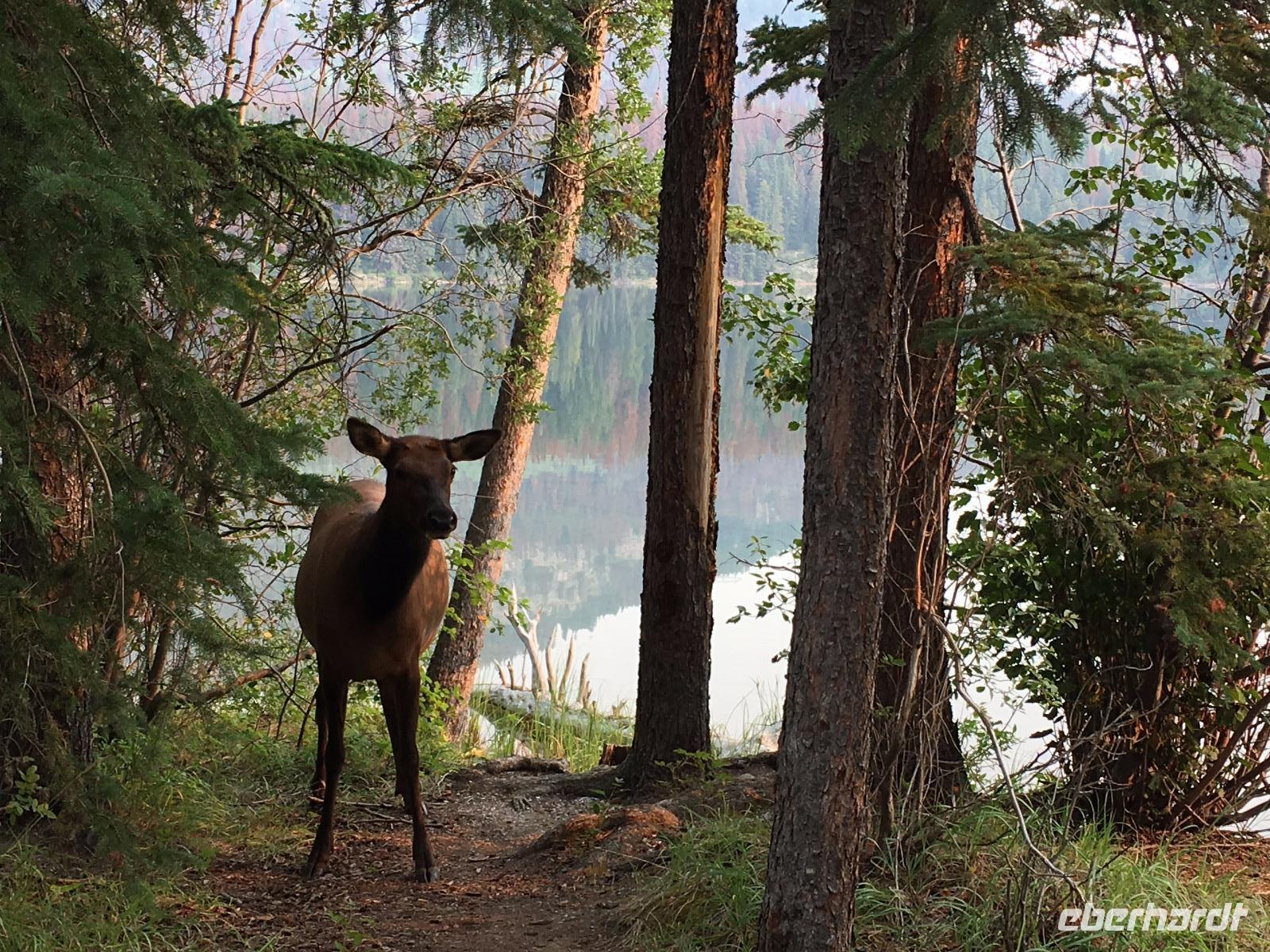 Strahlende Sonne und 7 Grad ist es heute in der Frueh. Die kurzen Hosen und das kleine T-Shirt sind jedoch genau die richtige Bekleidung fuer den heutigen Tag. Wir fahren nach dem genuesslichen Fruehstueck in Richtung Jasper, horchen der Geschichte der Hudson Bay Company zu und gelangen so in das Maligne Tal. Einige unter uns moechten gerne die Maligne Schlucht hinaufgehen, das ist ein Spaziergang von rund 1 ½ Stunden, viele Fotostopps inkludiert. Andere fahren mit dem Bus bis zum Kaffeehaus und gehen oben die kleinere Runde. Das Wasser des Maligne Flusses fasziniert uns, denn es verschwindet immer wieder durch unterirdische Gaenge und bekommt Zufluesse aus dem Felsen heraus. So ist der Wasserspiegel des Flusses immer verschieden. Der schoene Wasserfall, Weisser Ton, laedt zum verweilen ein. Unser Weg fuehrt uns weiter zu Medicin Lake. Auch hier sieht man im seichten See die Fluesse und sogar Tierspuren auf Seesgrund. Bald darauf werden wir aeusserst angenehm ueberrascht, ein Moose steht am Strassenrand und grast gemuetlich weiter. Dieses scheue Tier ziegt sich sehr selten und wir fuehlen uns wie auserkoren. Ein herrlicher Anblick und so nahe. Gluecklich kommen wir bei Maligne See an, wo sich jeder einen Inbiss auf der Terrasse mit Seeblick goennt. Um 13:45 legt unser Boot ab, wir fahren zu der beruehmten Spirit Island. Ach so schoen ist diese romantische Halbinsel umgeben von den riesengrossen Bergen. Viele Fotos spaeter fahren wir wieder zurueck, bestaunen die Gletscher und das Bergpanorama. Leider ist die Sicht nicht ganz so wie wir uns das wuenschen koennten, denn der Rauch der Waldbraende von Britisch Kolumbien zieht bis hierher. In Jasper machen wir dann nochmals Pause, denn nun brauchen wir ein Bierchen, muessen in die Drogerie, brauchen Briefmarken und wollen uns auch noch ein paar Geschaefte anschauen. Gifteln muss sein. Auf der Rueckfahrt in unsere Lodge sehen wir ploetzlich neben der Strasse auf einer ganz hellen Flaeche die wohl Salz enthaelt 4 Schneeziegen in ihrem wunderschoenen weissen Kleid. Sie haben bereits das Winterfell und schauen so putzig aus mit ihren schwarzen Hoerner. Man sieht sie kaum und viele Autos rasen einfach an ihnen vorbei. Schaut Euch die Fotos in der Galerie an, es schaut aus wie ein Suchbild. So einen vollen Tag haben wir heute erlebt und Moose und Schneeziegen gesehen, besser geht es nicht. Nun wartet noch das feine Abendessen mit Lachs oder Backhaehnchen auf uns und dann gehts ab, in die Welt der Traeume.