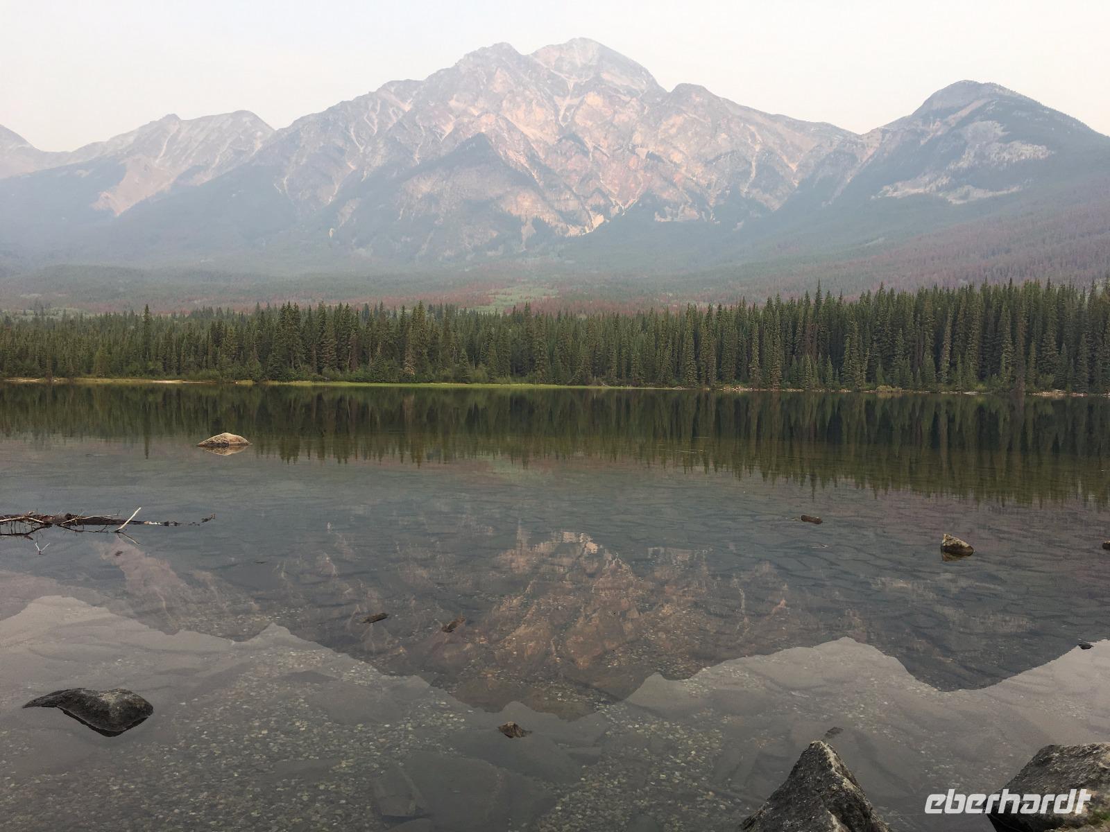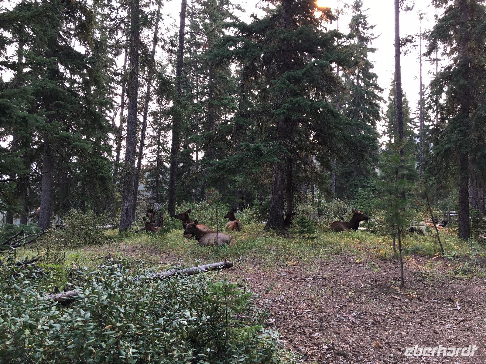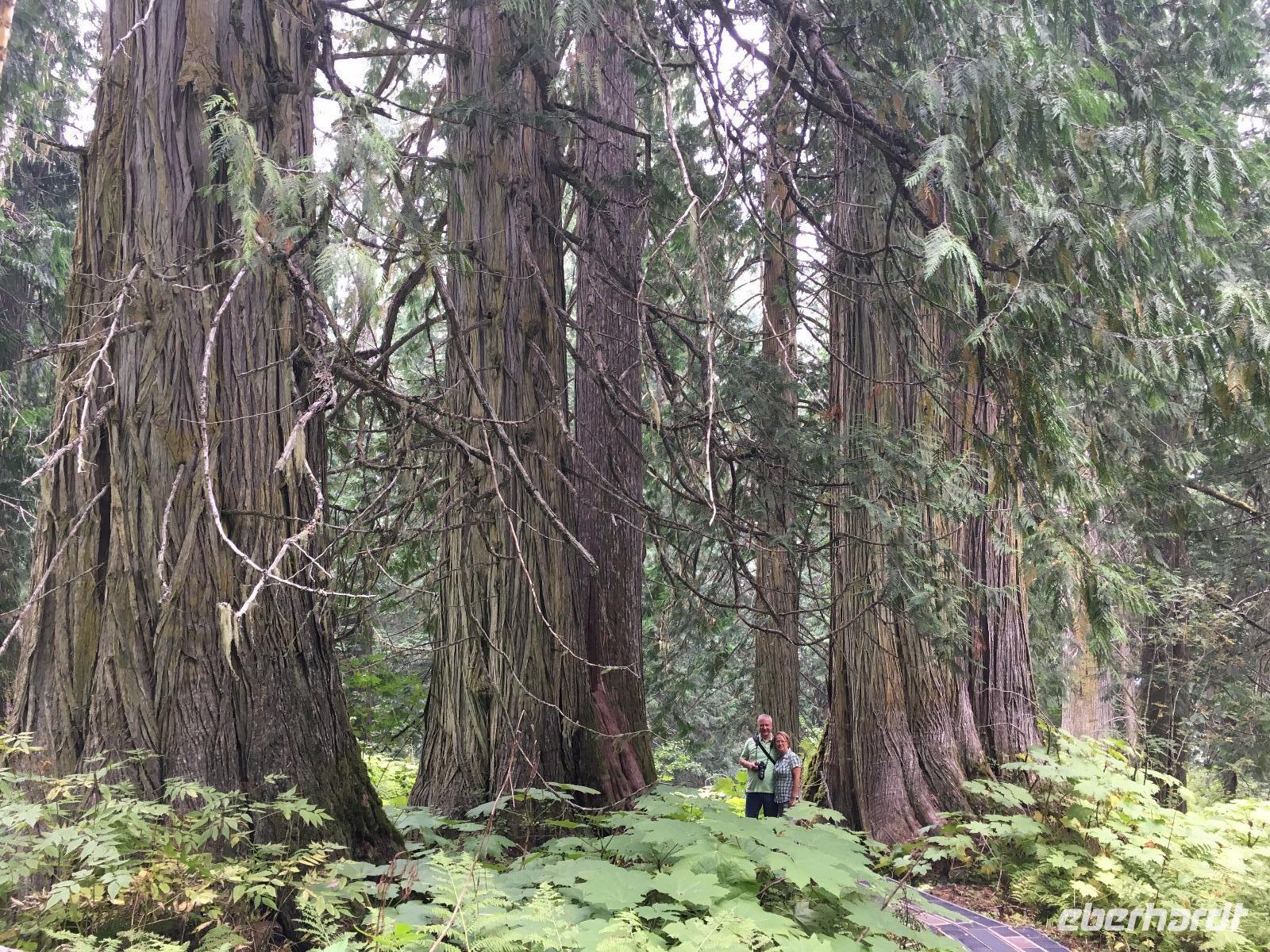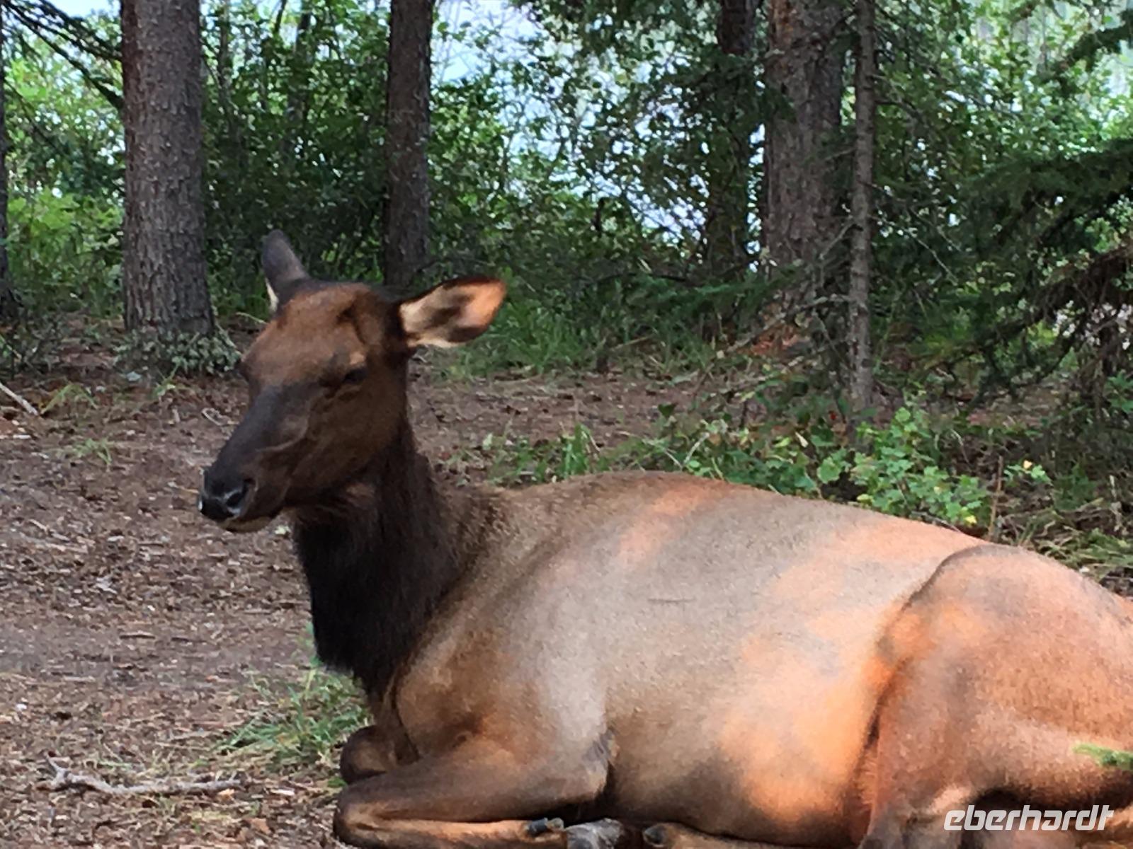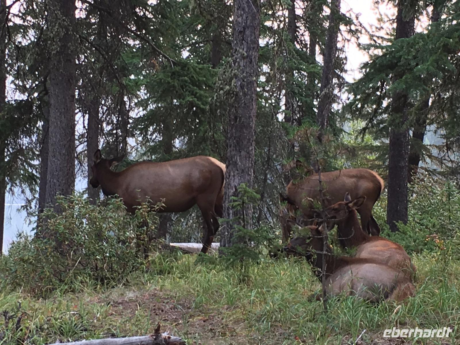 Ein wunderbarer Tag bricht an. Es ist zwar noch ein bischen diesig von den BC Rauchschwaden und die Temperaturen haben sich auf 12 Grad gesenkt. Es ist auch erst 7 Uhr in der Frueh und die kurzen Hosen lachen uns trotzdem schon aus dem Koffer an, denn die Wettervorhersage meint, es wuerde wie die vegangenen Tage, schoen warm. Vorerst besuchen wir die eindrucksvollen Athabasca Faelle. Koennte man doch bloss diese Momente einfangen ! Danach gibt es eine kleine Gesangseinlage, da sich jemand das rauschende Wasser zu lange angeschaut hat und in dessen Bann geraten war. Gerne helfen wir alle aus der Patsche und singen lauthals das ausgelesene Volkslied mit. Ein beruehmter Chor werden wir wohl nicht, aber Spass haben wir trotzdem viel. Dies und die Geschichte der CPR Eisenbahn bringen uns schnellstens zu unserem naechsten Ausflug zu Pyramid Lake. Auf der kleinen Insel stehen auf einmal etwa 8 Wapitis vor uns. WOW, ein bisschen eingeschuechtert sind wir schon und bleiben brav in der Gruppe. Langsam gehen wir an den weidenden und liegenden Tieren vorbei und knipsen natuerlich wie wild. Hoffentlich wird das Gruppenbild mit Wapitis im Hintergrund auch ein gutes Foto zur Erinnerung an dieses Erlebnis. Nun gehts aber weiter zum Patricia Lake und seiner kuriosen Habakuk Geschichte. Die Geschichte mit dem Eisschiff ist kaum zu glauben, bloss die Fotos erinnern an diesen Schildbuergerstreich des Krieges. Auf der Yellow Head Highway sehen wir ploetzlich auf dem linken Strassenrand ein ausgewachsener Wapitihirsch. Wir haben wirklich sehr viel Glueck mit der Sichtung von Wild. Der Tag hat heute 25 Stunden, also 1 Stunde mehr Spielzeit. Judihui. Mittagessen tun wir bei Mount Robson und da gibt es auch BC Wein zur Verkostung auf der schoenen grossen Terrasse mit Blick auf den grandiosen Mount Robson. Danke Eberhardt ! Nun muessen wir aber noch viele Km fahren bis nach Prince George. Eine Kaffeepause in McBride beim Bahnhof. Viele Antworten auf Allgemeinfragen spaeter, kommen wir bei einem kleinen Park mit Urbaeumen vorbei. Das laedt auf eine einstuendige Wanderung ein. Wir staunen ueber die Riesen die man hier hat stehen lassen. Die Zedern sind gigantisch und das Unterholz tiefgruen, kleine Baeche veredeln das perfekte Bild. Endlich, am Spaetnachmittag, kommen wir in Prince George, auch liebevoll PG gnannt (gleiche Abkuerzung wie fuer Pijama!) an. Wir kaufen unser Picknick fuer morgen ein, ziehen in unser schoenes Coast Hotel ein, bedauern die Rauchschwaden der Waldbraende die das Atmen beschweren und geniessen ein feines Abendessen. Gute Nacht PG.