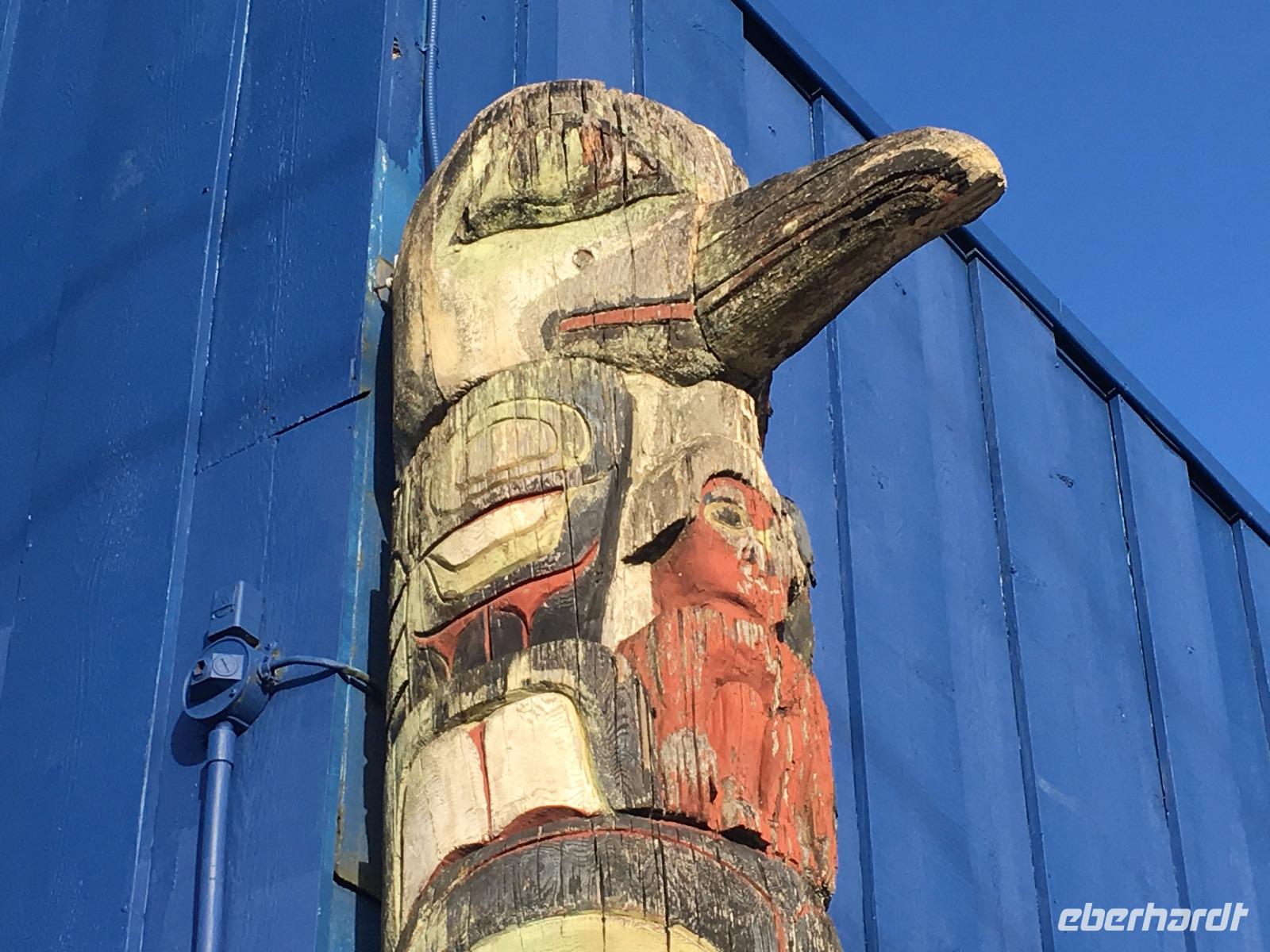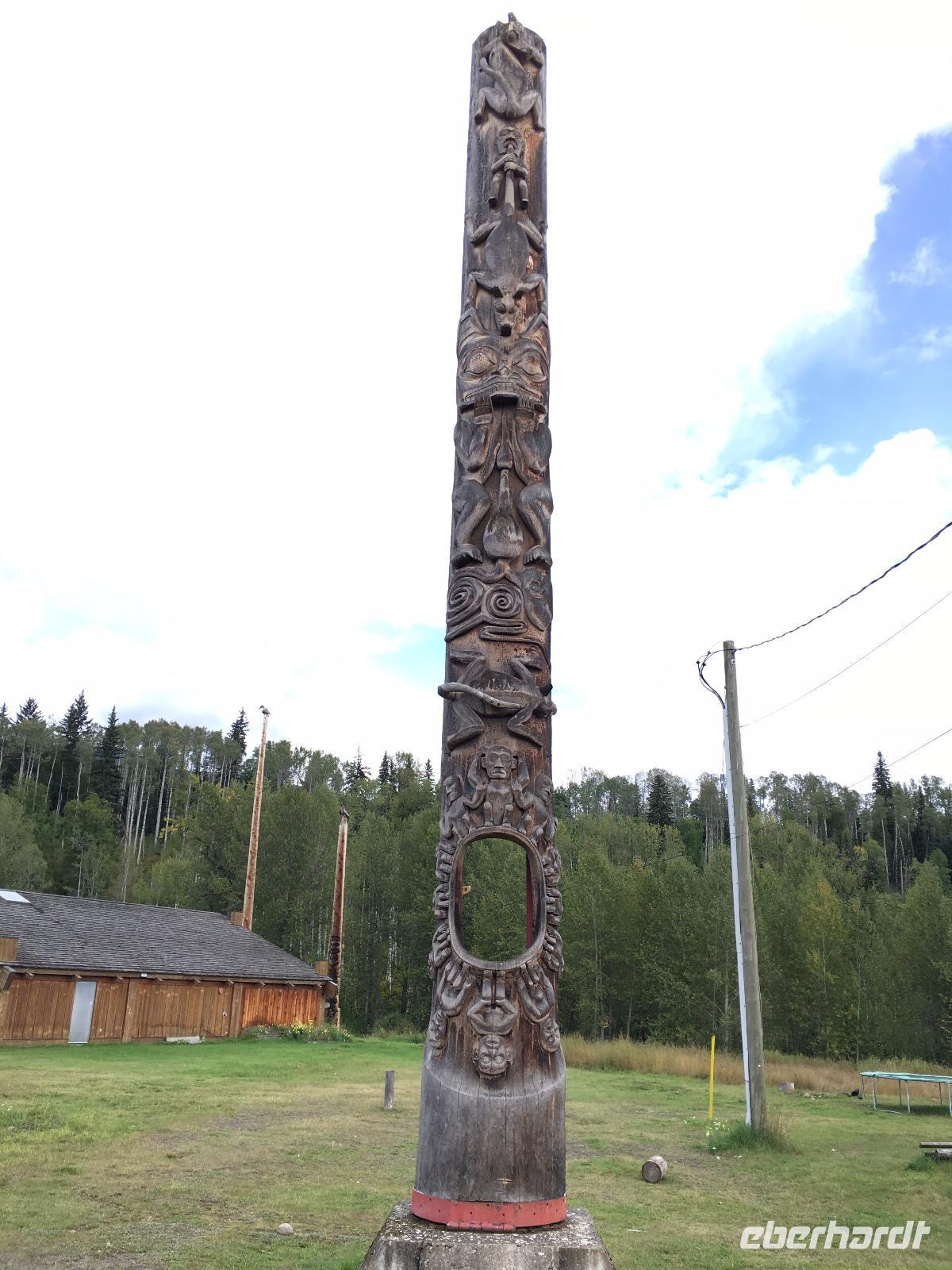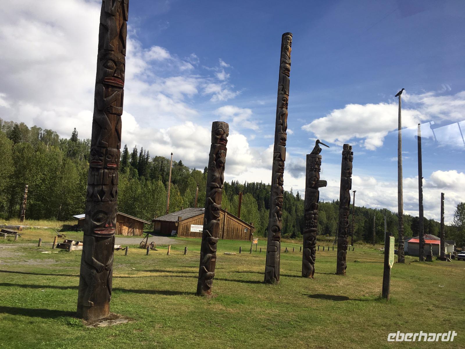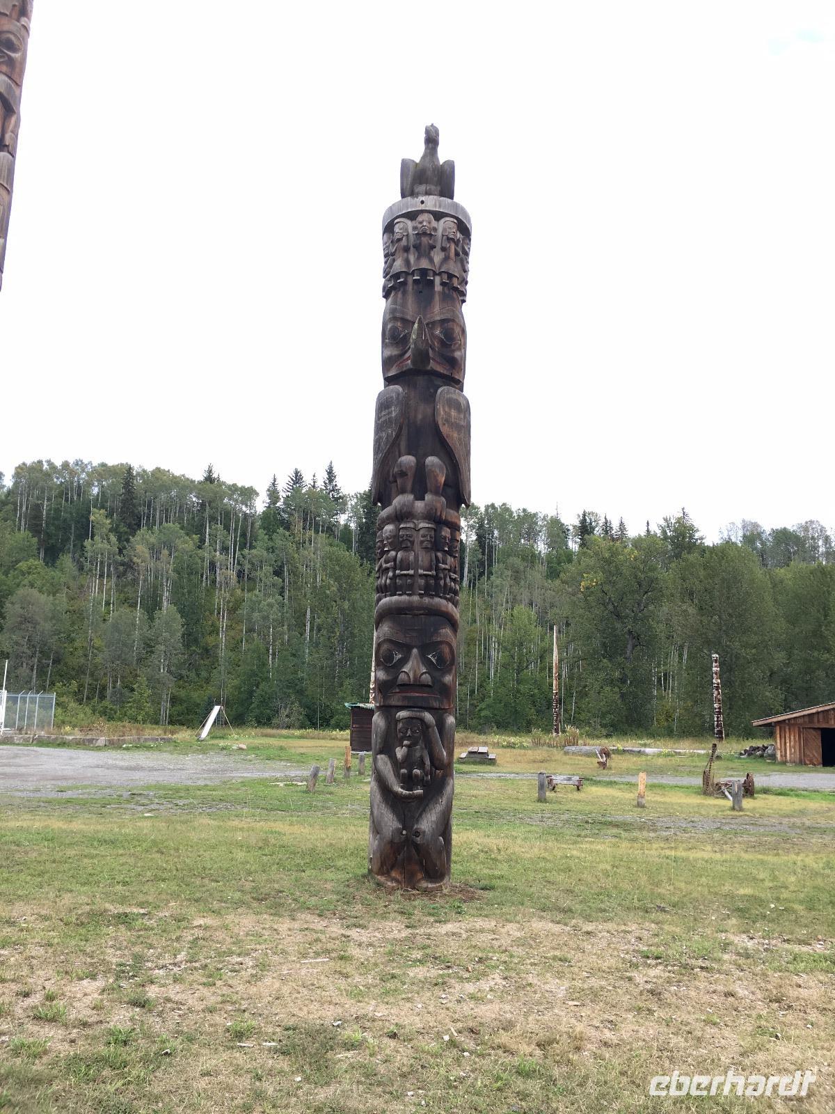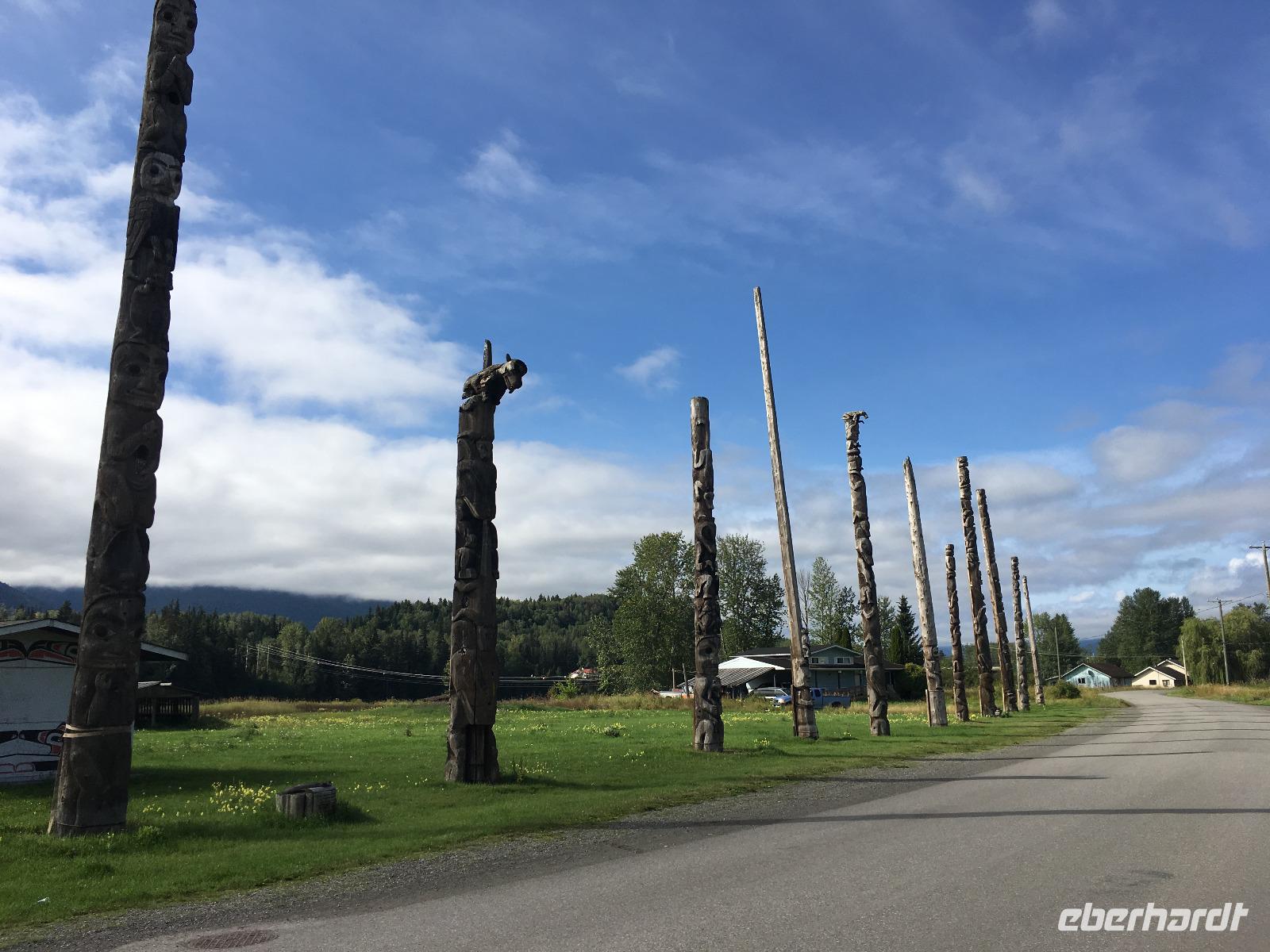 Strahlende Sonne scheint in unsere Zimmer und vielleicht wird das auch in der hiesigen Zeitung vermerkt, da dies so selten vorkommt. Zeitig verlassen wir Stewart und fahren gemuetlich bis zur Kreuzung der Gelbkopfstrasse und der Highway 37 auf der wir nun unterwegs waren. Die 37-er Strasse ist auch die Cassiar Highway die einzige Strasse nach Alaska. Hier koennen wirv das obligate Foto von der Anzeigetafel knipsen, ein Eis essen, einen Kaffee trinken und vorallem die Haeuschen aufsuchen ;-) Einen Abstecher nach Kitwanga goennen wir uns schon denn bloss hier und in Gitwangow stehen so viele Geschichtserzaehlende Pfaehle im Dorf. Hier sehen wir auch einen Pfahl der sich gespalten hat waehrend des Schnitzens und deshalb auf dem Grass liegengeblieben ist. Ein ganz alter Pfahl wartet im hohen Grass auf seine Verwesung. Alles kommt von der Erde und muss deshalb der Erde auch wiedergegeben werden. Die Kirche von Kitwanga wird auch bildlich festgehalten sowie den Holzturm daneben........ding, ding, ding......ja es ist ein Glockenturm und wir haben es herausgefunden, an dem Seile ziehend. UUUPS, sorry ! Niemand kommt uns nachgelaufen und gluecklich fahren wir ein Stuendchen weiter bis nach Terrace, wo wir unsere Mittagspause machen. Nachdem wir nun erfahren haben, wie man mit selbstgemachten Fliegen Fische faengt und wie man den Fliegen das fliegen beibringt koennen wir getrost an dem Skeena Fluss 2 Stunden entlangfahren und den vielen Fliegenfischer verstaendnisvoll zuschauen. Am spaeteren Nachmittag kommen wir in Prince Rupert an. Nach der kurzen Stadtrundfahrt checken wir in unser Hotel ein und gehen auf einen Spaziergang. Das Staedtchen, auch Wien des Nordens genannt, ist sehr von den Ersten Nationen und der Fischerei gepraegt. Ruhig und etwas verschlafen liegt es am Pacific. Wir geniessen das schoene Wetter und die bunten Haeuser. Nach dem Abendbrot im Hotel gehen wir auch etwas frueher schlafen denn Morgen - Au Weh !