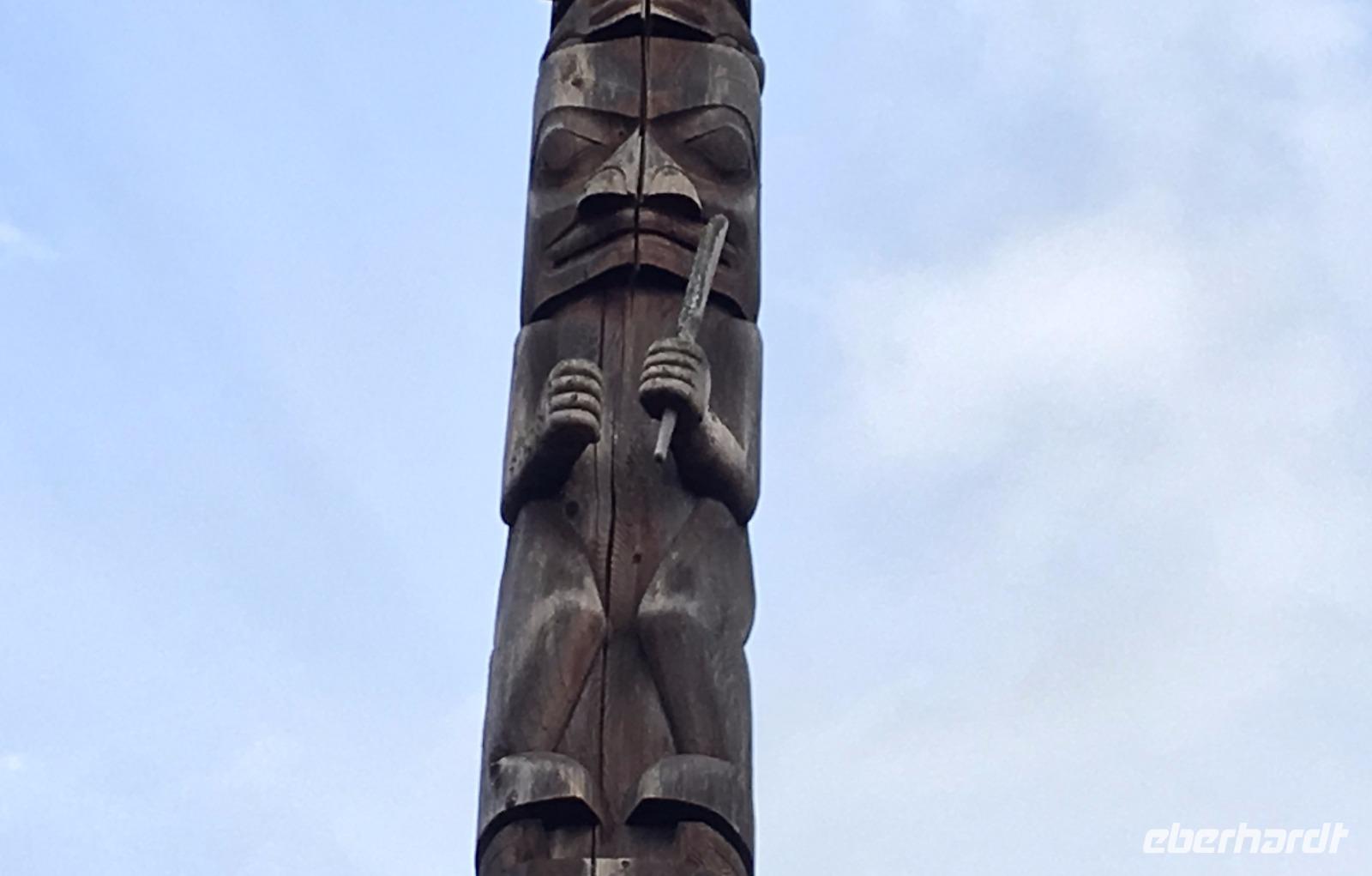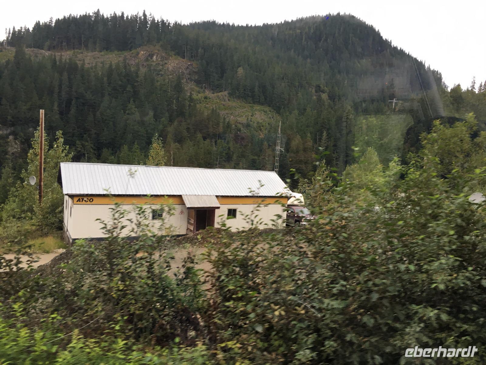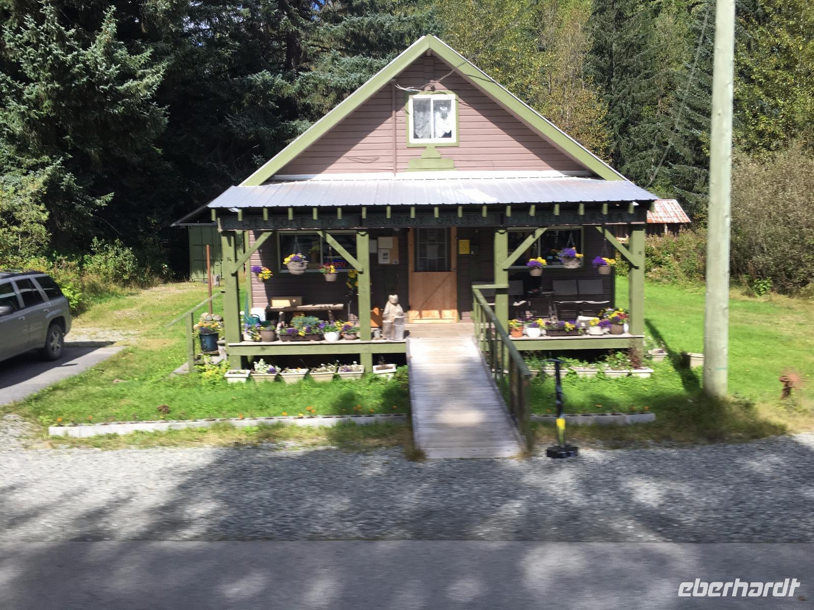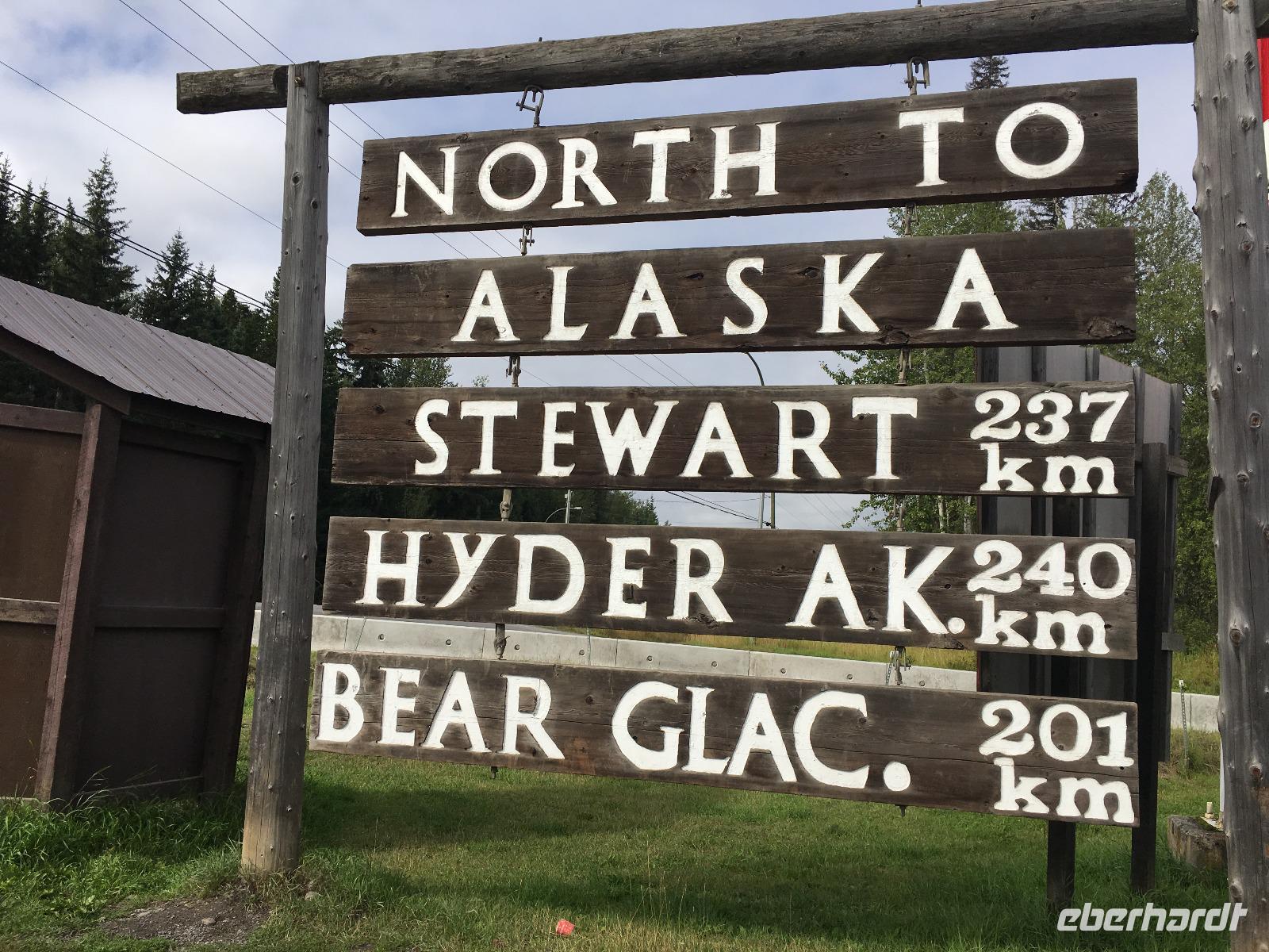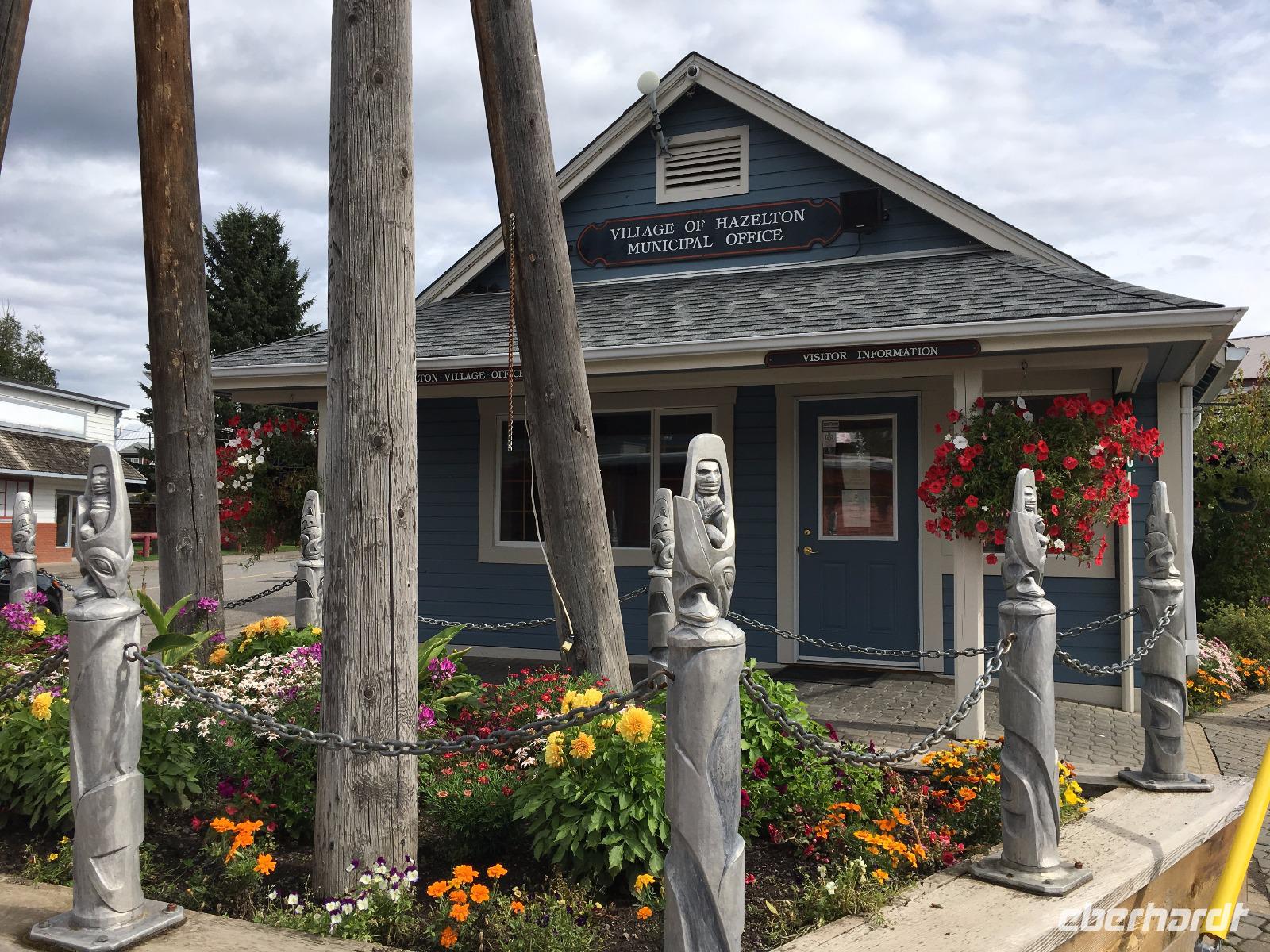 Strahlende Sonne scheint in unsere Zimmer und vielleicht wird das auch in der hiesigen Zeitung vermerkt, da dies so selten vorkommt. Zeitig verlassen wir Stewart und fahren gemuetlich bis zur Kreuzung der Gelbkopfstrasse und der Highway 37 auf der wir nun unterwegs waren. Die 37-er Strasse ist auch die Cassiar Highway die einzige Strasse nach Alaska. Hier koennen wirv das obligate Foto von der Anzeigetafel knipsen, ein Eis essen, einen Kaffee trinken und vorallem die Haeuschen aufsuchen ;-) Einen Abstecher nach Kitwanga goennen wir uns schon denn bloss hier und in Gitwangow stehen so viele Geschichtserzaehlende Pfaehle im Dorf. Hier sehen wir auch einen Pfahl der sich gespalten hat waehrend des Schnitzens und deshalb auf dem Grass liegengeblieben ist. Ein ganz alter Pfahl wartet im hohen Grass auf seine Verwesung. Alles kommt von der Erde und muss deshalb der Erde auch wiedergegeben werden. Die Kirche von Kitwanga wird auch bildlich festgehalten sowie den Holzturm daneben........ding, ding, ding......ja es ist ein Glockenturm und wir haben es herausgefunden, an dem Seile ziehend. UUUPS, sorry ! Niemand kommt uns nachgelaufen und gluecklich fahren wir ein Stuendchen weiter bis nach Terrace, wo wir unsere Mittagspause machen. Nachdem wir nun erfahren haben, wie man mit selbstgemachten Fliegen Fische faengt und wie man den Fliegen das fliegen beibringt koennen wir getrost an dem Skeena Fluss 2 Stunden entlangfahren und den vielen Fliegenfischer verstaendnisvoll zuschauen. Am spaeteren Nachmittag kommen wir in Prince Rupert an. Nach der kurzen Stadtrundfahrt checken wir in unser Hotel ein und gehen auf einen Spaziergang. Das Staedtchen, auch Wien des Nordens genannt, ist sehr von den Ersten Nationen und der Fischerei gepraegt. Ruhig und etwas verschlafen liegt es am Pacific. Wir geniessen das schoene Wetter und die bunten Haeuser. Nach dem Abendbrot im Hotel gehen wir auch etwas frueher schlafen denn Morgen - Au Weh !