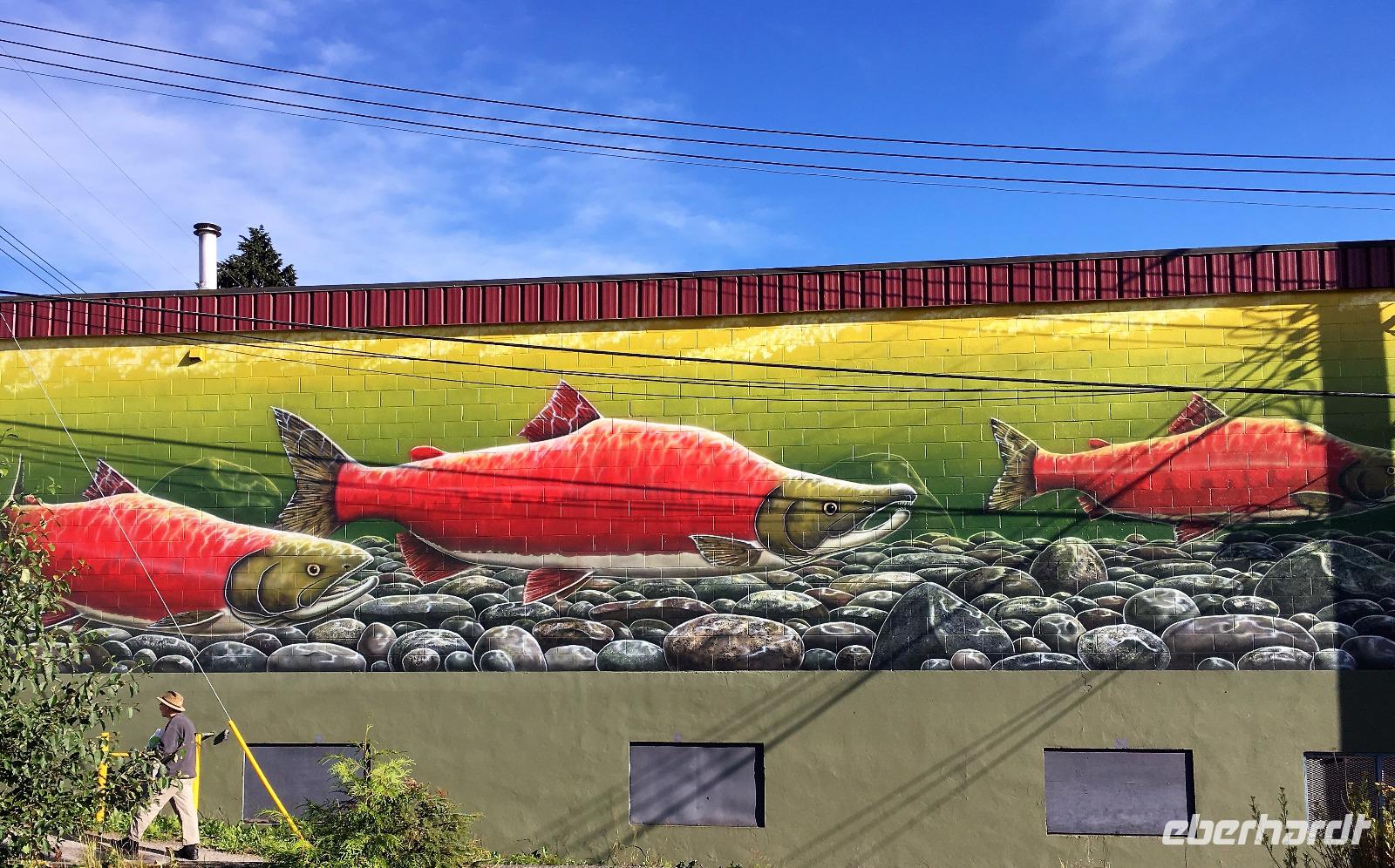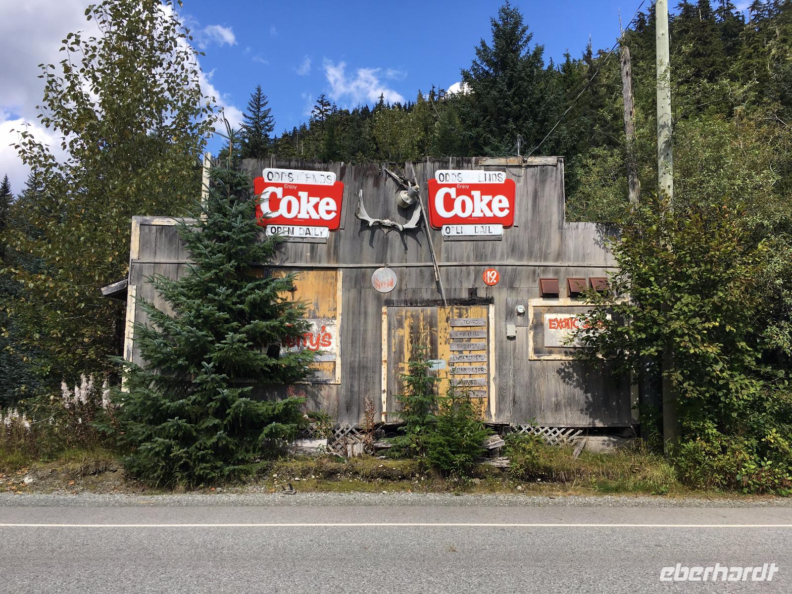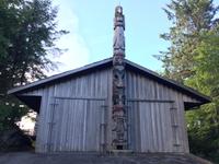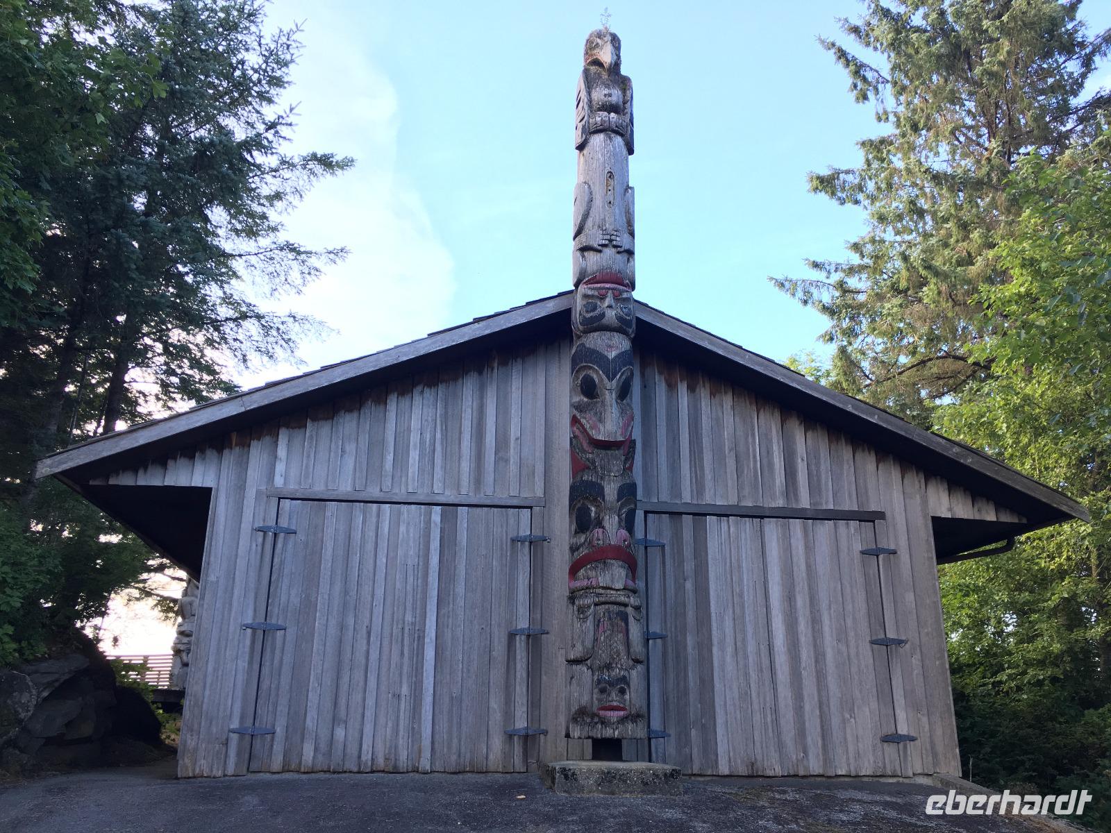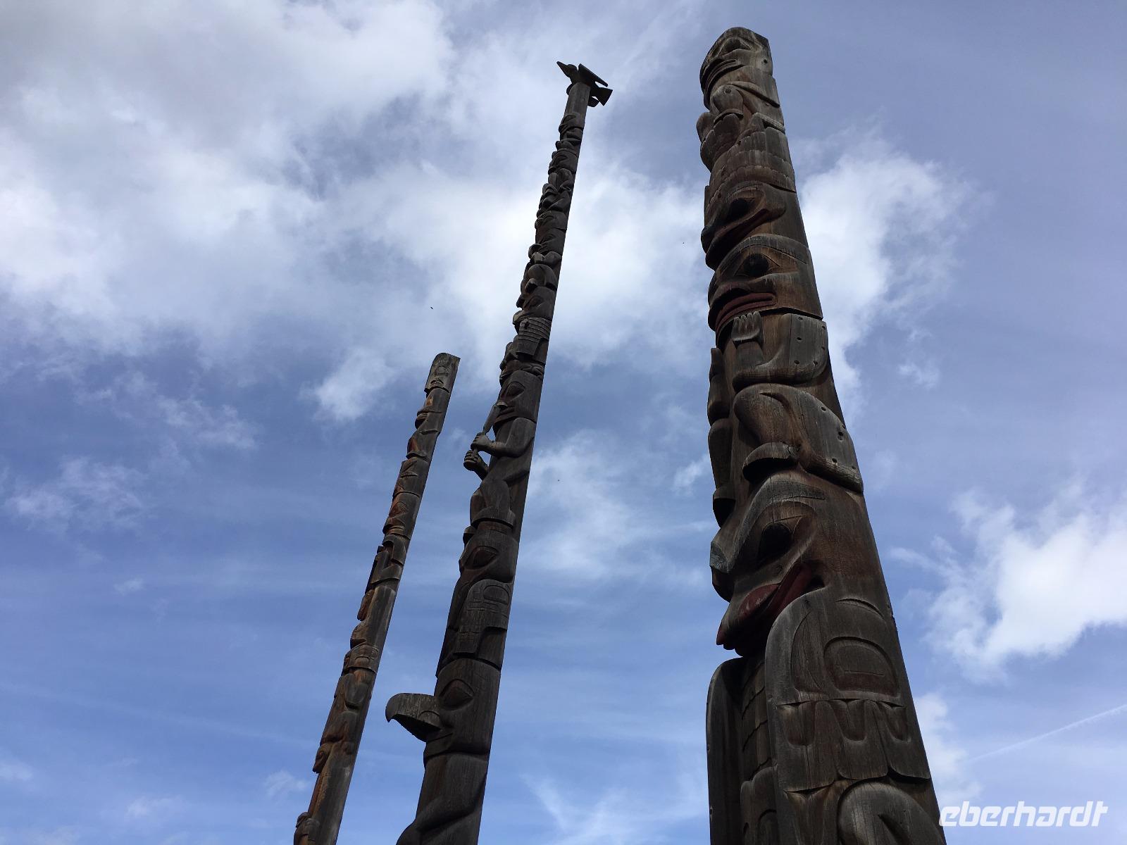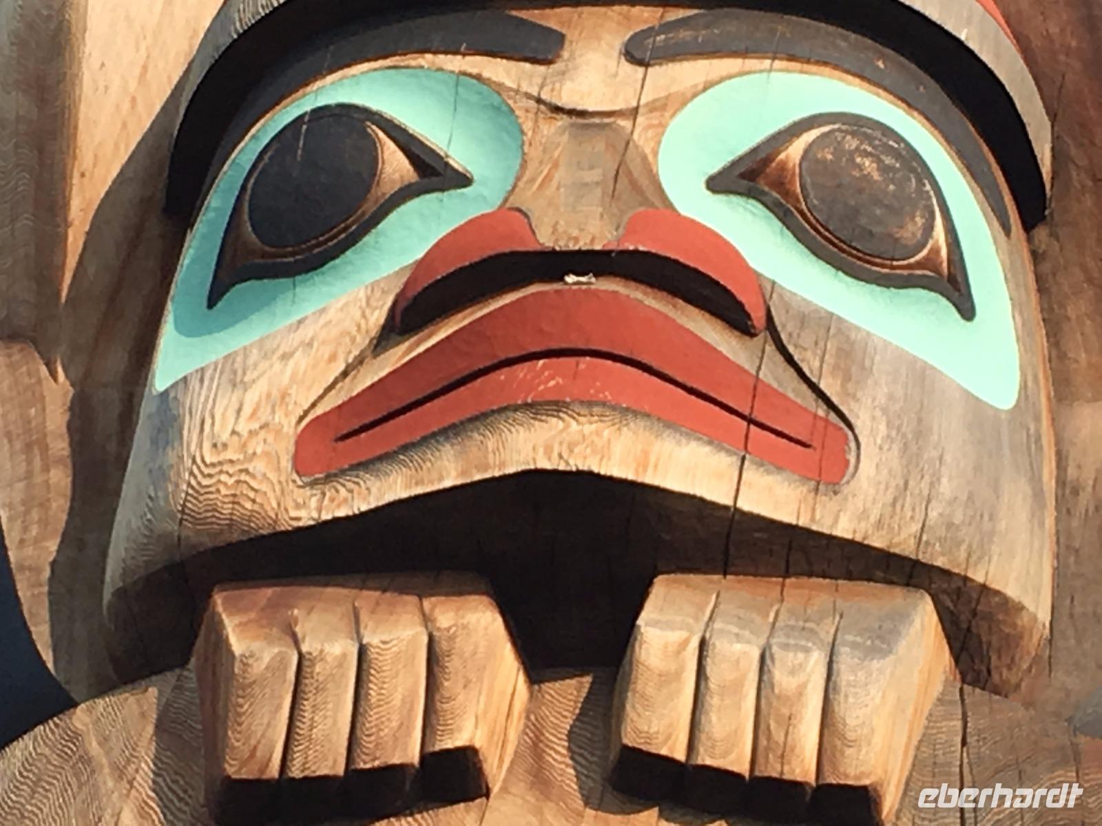 Strahlende Sonne scheint in unsere Zimmer und vielleicht wird das auch in der hiesigen Zeitung vermerkt, da dies so selten vorkommt. Zeitig verlassen wir Stewart und fahren gemuetlich bis zur Kreuzung der Gelbkopfstrasse und der Highway 37 auf der wir nun unterwegs waren. Die 37-er Strasse ist auch die Cassiar Highway die einzige Strasse nach Alaska. Hier koennen wirv das obligate Foto von der Anzeigetafel knipsen, ein Eis essen, einen Kaffee trinken und vorallem die Haeuschen aufsuchen ;-) Einen Abstecher nach Kitwanga goennen wir uns schon denn bloss hier und in Gitwangow stehen so viele Geschichtserzaehlende Pfaehle im Dorf. Hier sehen wir auch einen Pfahl der sich gespalten hat waehrend des Schnitzens und deshalb auf dem Grass liegengeblieben ist. Ein ganz alter Pfahl wartet im hohen Grass auf seine Verwesung. Alles kommt von der Erde und muss deshalb der Erde auch wiedergegeben werden. Die Kirche von Kitwanga wird auch bildlich festgehalten sowie den Holzturm daneben........ding, ding, ding......ja es ist ein Glockenturm und wir haben es herausgefunden, an dem Seile ziehend. UUUPS, sorry ! Niemand kommt uns nachgelaufen und gluecklich fahren wir ein Stuendchen weiter bis nach Terrace, wo wir unsere Mittagspause machen. Nachdem wir nun erfahren haben, wie man mit selbstgemachten Fliegen Fische faengt und wie man den Fliegen das fliegen beibringt koennen wir getrost an dem Skeena Fluss 2 Stunden entlangfahren und den vielen Fliegenfischer verstaendnisvoll zuschauen. Am spaeteren Nachmittag kommen wir in Prince Rupert an. Nach der kurzen Stadtrundfahrt checken wir in unser Hotel ein und gehen auf einen Spaziergang. Das Staedtchen, auch Wien des Nordens genannt, ist sehr von den Ersten Nationen und der Fischerei gepraegt. Ruhig und etwas verschlafen liegt es am Pacific. Wir geniessen das schoene Wetter und die bunten Haeuser. Nach dem Abendbrot im Hotel gehen wir auch etwas frueher schlafen denn Morgen - Au Weh !