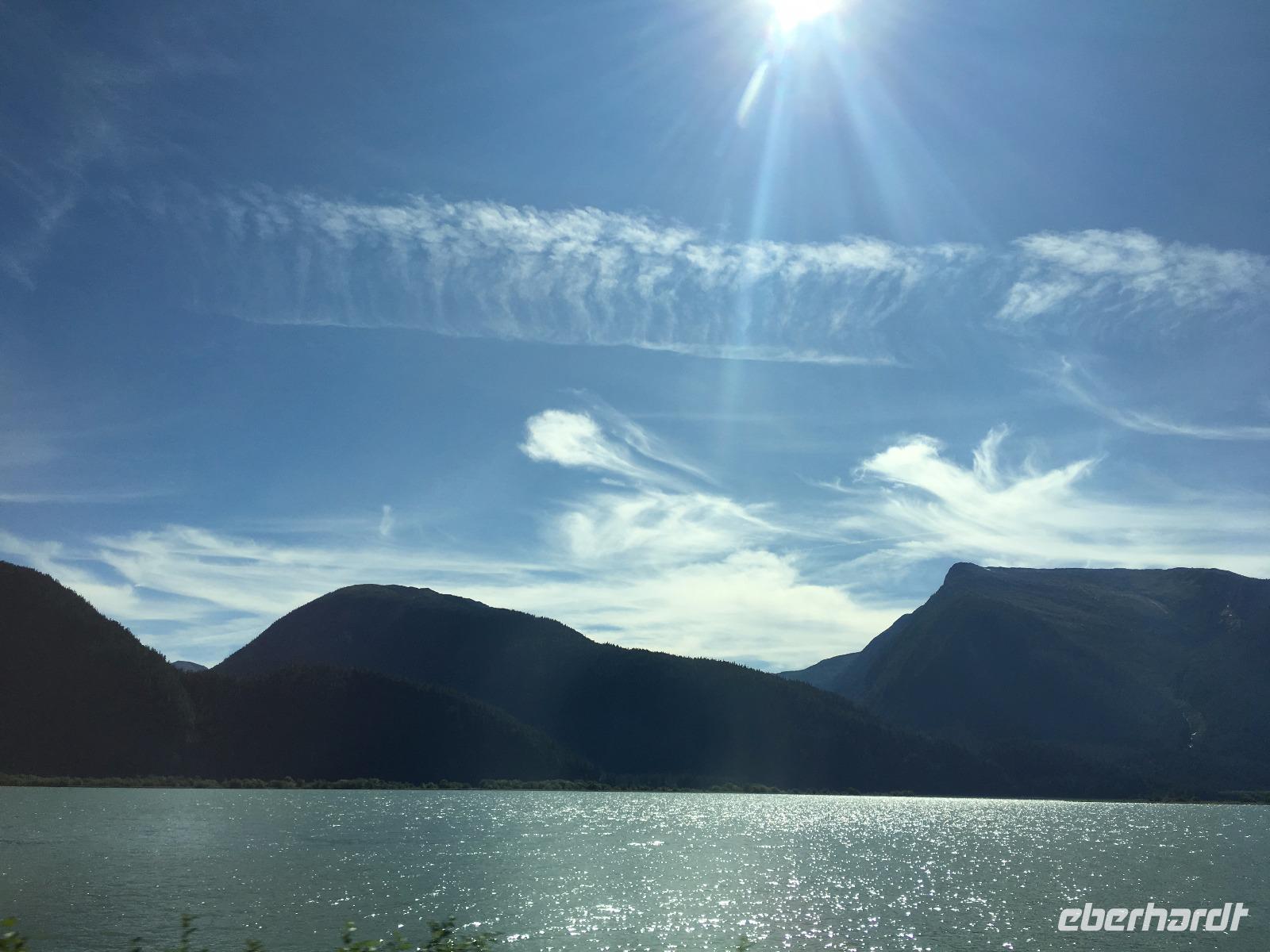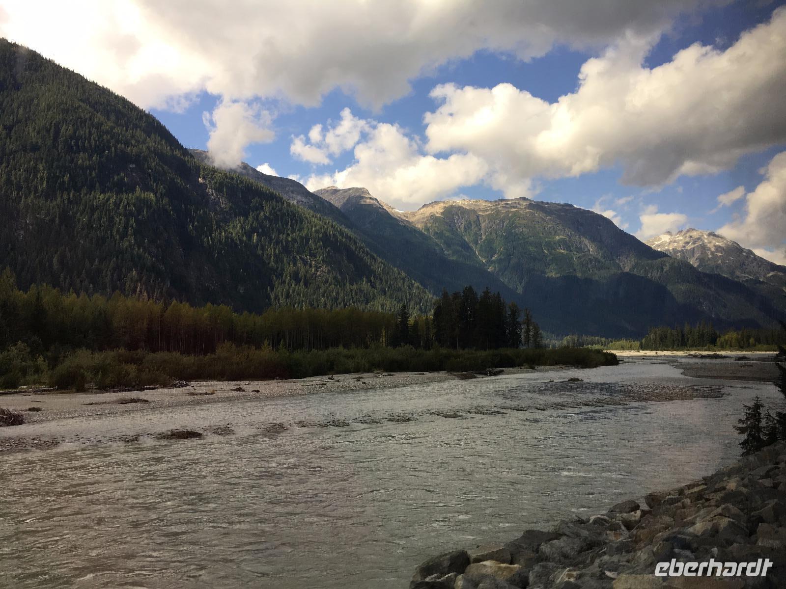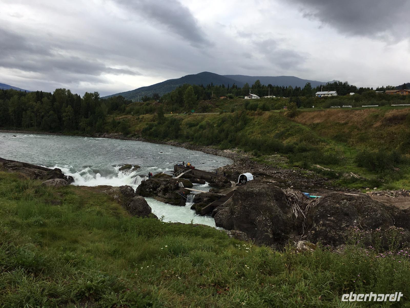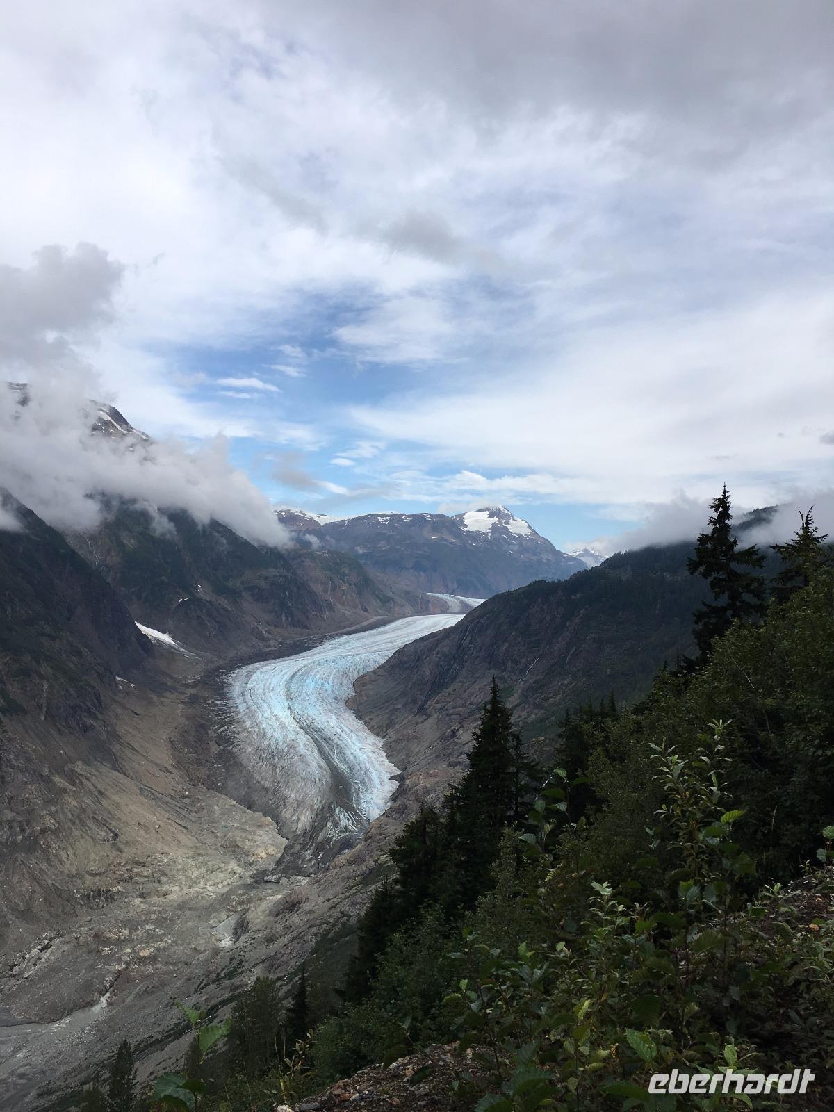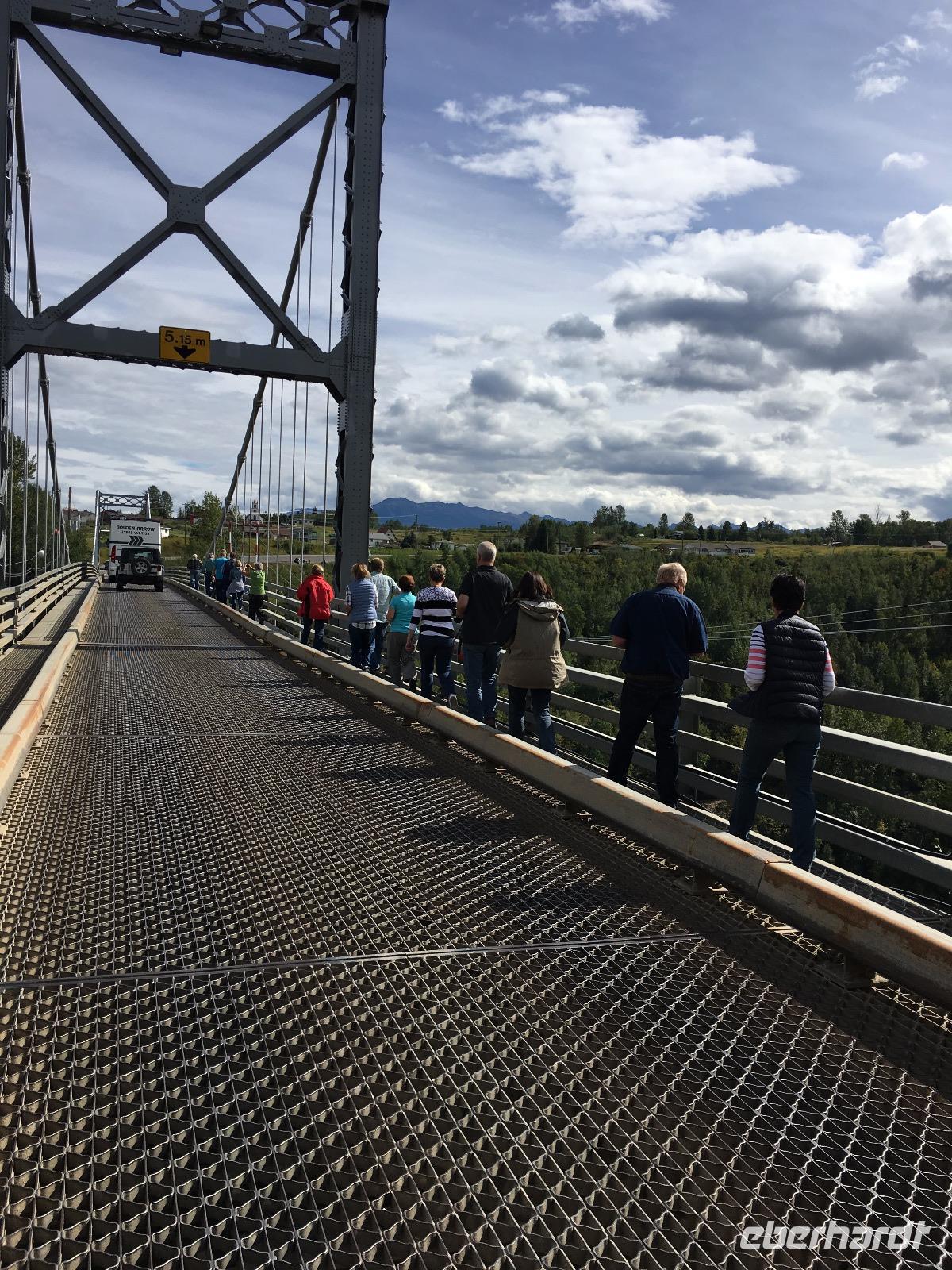 Oh Woelkchen, das erste mal dass wir auch Wolken in Kanada sehen. Also gibts die hier auch ! Heute haben wir unseren « Erste Nationen Tag «. Das wird interessant denn als erstes gibt es ein richtig europaeisches Fruehstueck ! Danach aber sehen wir bei der Schnelle des Bulkley Rivers viele Leute unten am Fluss stehen. Ja, die ersten Lachse sind eben gerade hochgekommen und die Ersten Nationen fischen nun gleich neben dem Wasserfall. Sie haben ererbte Fischrechte und fischen mit langen Stangen die vorne runde Netze angebracht haben. So ausgeruestet stehen 2 Indianer angemacht an ihren Seilen auf 2 Felsvorspruengen und versuchen die Lachse aus dem Bulkley herauszuholen. Die beiden Fischer sind auch sehr erfolgreich und wir koennen zuschauen und fotografieren wie sie Lachse fischen. Alles ist sehr interessant. Wir verlassen den tobenden Bulkley denn wir wollen nach Ksan um die Geschichte der Giksan-Sippe kennenzulernen. Ksan ist ein Indianer Museums Dorf und wir duerfen in die verschiedenen Lang-Haeuser hinein wo wir ueber Audio ueber das Leben und die Feste der Giksan aufgeklaert werden. Nun machen wir noch einen kleinen Abstecher nach Old Hazelton wo nun fast keine Leute mehr wohnen. Diese fast- Geisterstadt schaut aus, als wuerde gerade ein Film gedreht, der echte Wilde Westen. Die Leute der Hudsons Bay Company die im 1840 Old Hazelton gegruendet haben, mussten alle ueber den tobenden Bulkley Fluss mittels einer Haengebruecke aus Zedernholz. Nun gibt es eine sehr hohe Stahlbruecke ueber die einige mutige unter uns zu Fuss hinuebergehen. Ach, es ist Mittag geworden also knurrt der Magen wieder, nichts wie ab nach New Hazelton zum Mittagessen. Am Nachmittag gibt es noch einen interessanten Abstecher in ein echtes Indianerdorf mit seinen vielen Totempfaehlen. Gitwangow heisst dieses Dorf. Von hier sind es bloss noch 1 ½ Stunden bis Stewart. Wir schlafen alle wie die Herrgoettchen. Ein Spaziergang durchs Dorf und weiter auf dem Holzweg bis zum Meer unternehmen die meisten ehe wir uns zum Abendbrot im Hotel wiedersehen. Wieder neigt sich ein ereignisreicher Tag dem Ende zu und voller Erwartung auf den naechsten Tag verfallen wir dem Tiefschlaf.
