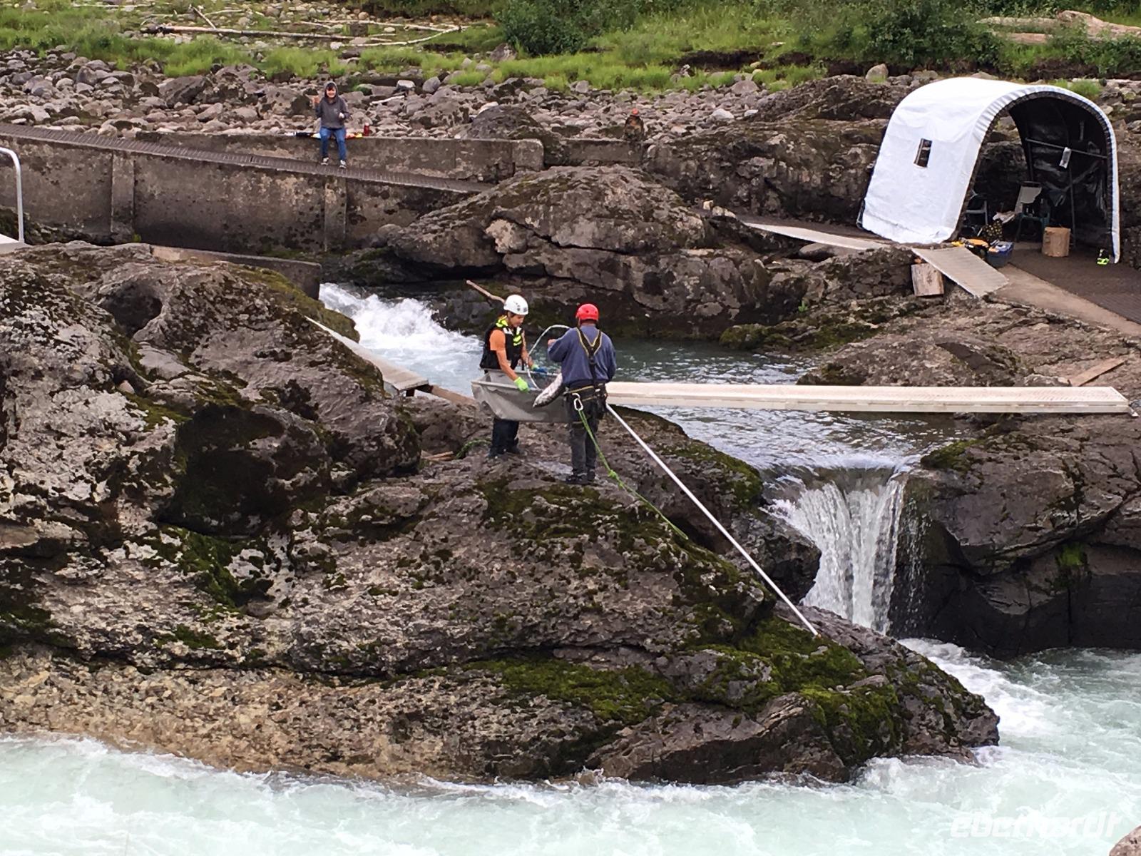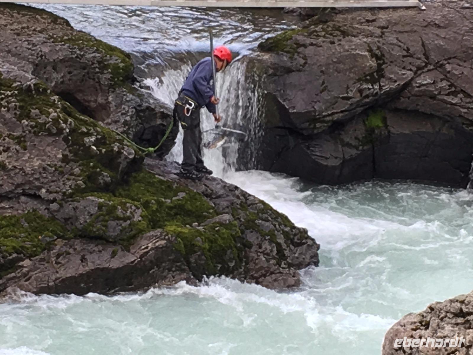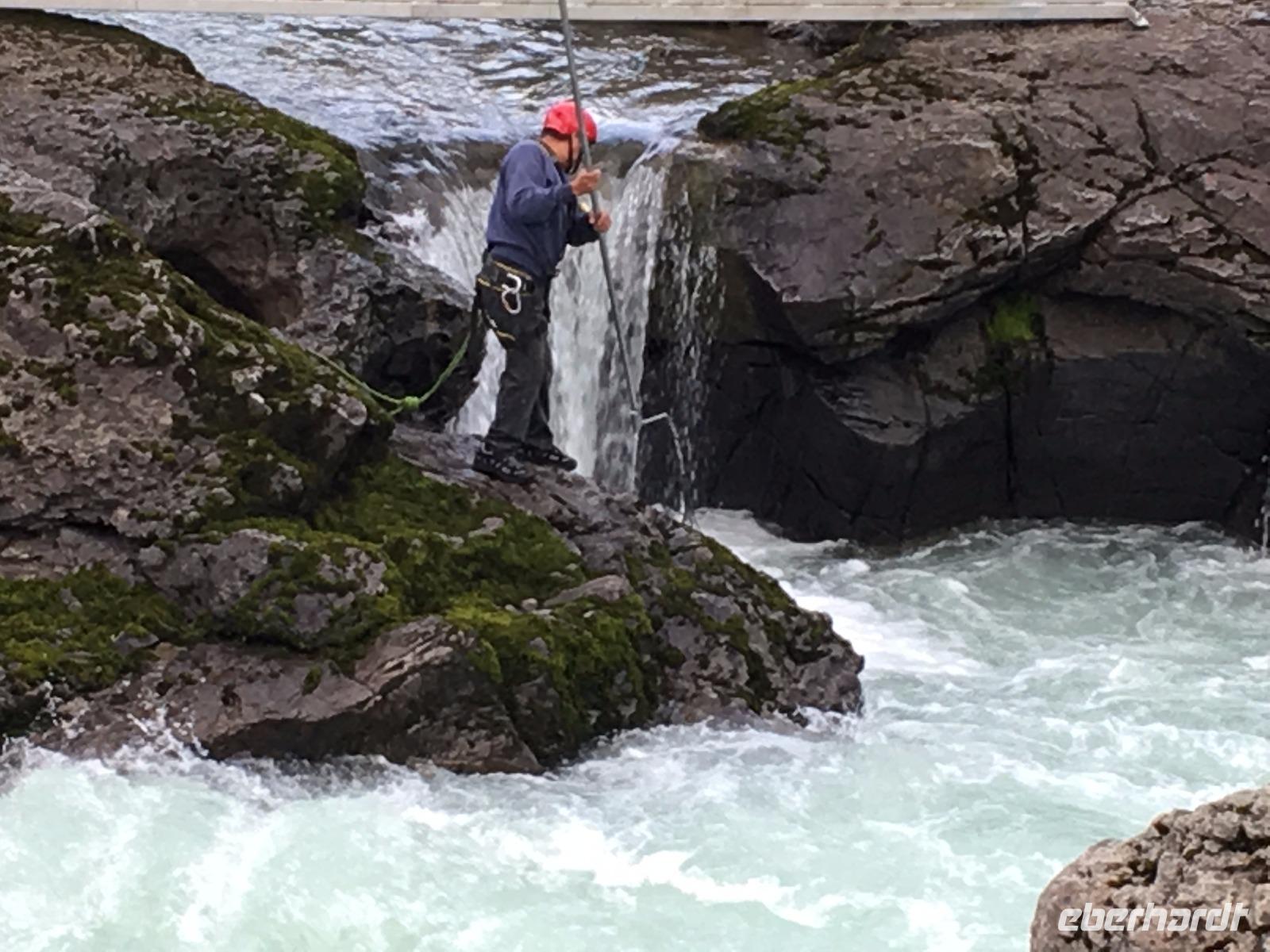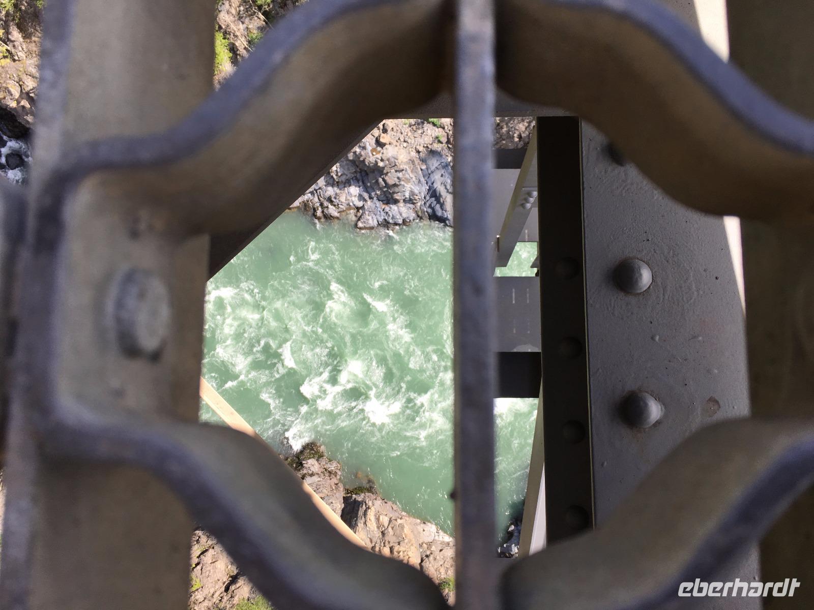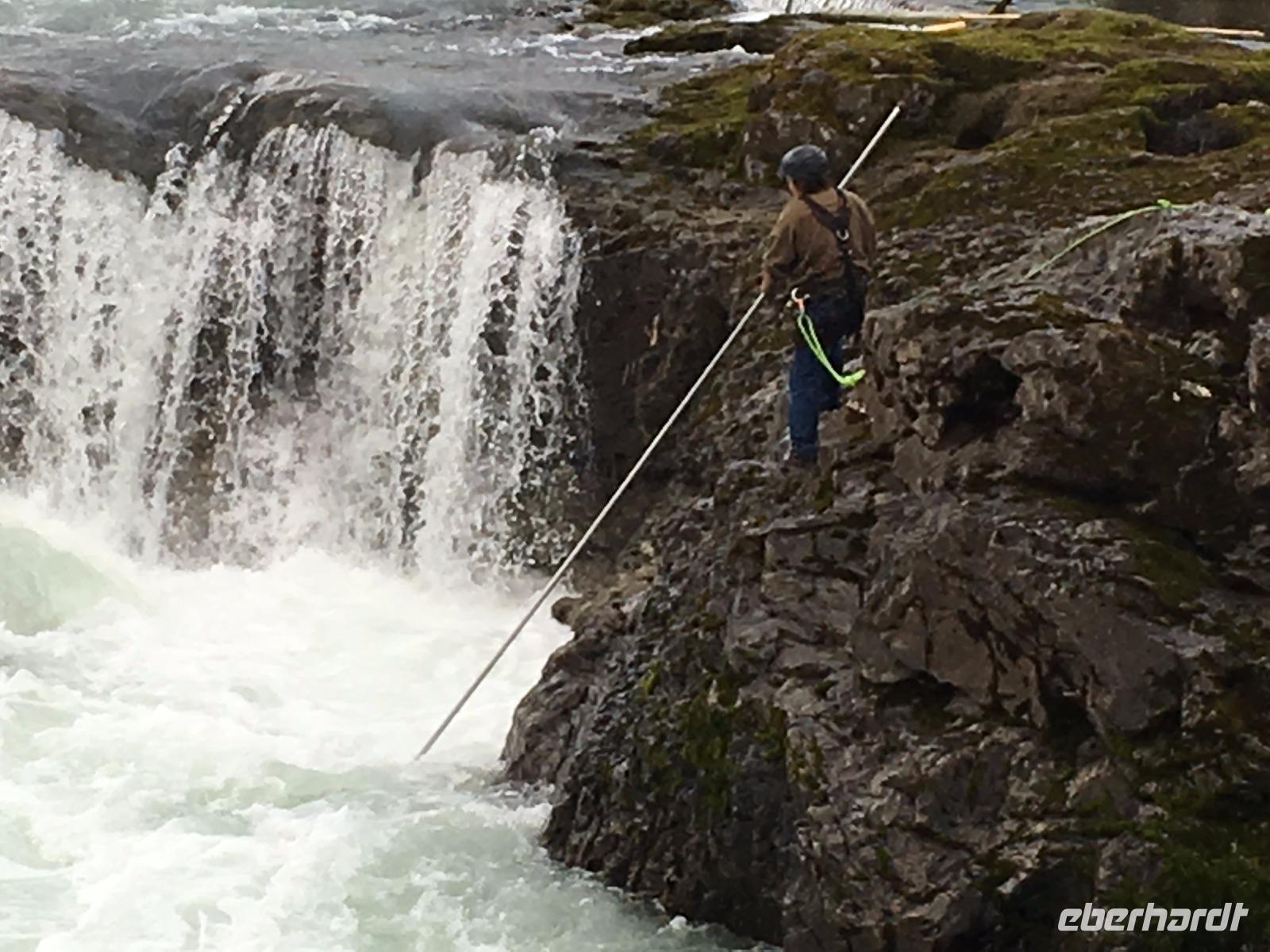 Oh Woelkchen, das erste mal dass wir auch Wolken in Kanada sehen. Also gibts die hier auch ! Heute haben wir unseren « Erste Nationen Tag «. Das wird interessant denn als erstes gibt es ein richtig europaeisches Fruehstueck ! Danach aber sehen wir bei der Schnelle des Bulkley Rivers viele Leute unten am Fluss stehen. Ja, die ersten Lachse sind eben gerade hochgekommen und die Ersten Nationen fischen nun gleich neben dem Wasserfall. Sie haben ererbte Fischrechte und fischen mit langen Stangen die vorne runde Netze angebracht haben. So ausgeruestet stehen 2 Indianer angemacht an ihren Seilen auf 2 Felsvorspruengen und versuchen die Lachse aus dem Bulkley herauszuholen. Die beiden Fischer sind auch sehr erfolgreich und wir koennen zuschauen und fotografieren wie sie Lachse fischen. Alles ist sehr interessant. Wir verlassen den tobenden Bulkley denn wir wollen nach Ksan um die Geschichte der Giksan-Sippe kennenzulernen. Ksan ist ein Indianer Museums Dorf und wir duerfen in die verschiedenen Lang-Haeuser hinein wo wir ueber Audio ueber das Leben und die Feste der Giksan aufgeklaert werden. Nun machen wir noch einen kleinen Abstecher nach Old Hazelton wo nun fast keine Leute mehr wohnen. Diese fast- Geisterstadt schaut aus, als wuerde gerade ein Film gedreht, der echte Wilde Westen. Die Leute der Hudsons Bay Company die im 1840 Old Hazelton gegruendet haben, mussten alle ueber den tobenden Bulkley Fluss mittels einer Haengebruecke aus Zedernholz. Nun gibt es eine sehr hohe Stahlbruecke ueber die einige mutige unter uns zu Fuss hinuebergehen. Ach, es ist Mittag geworden also knurrt der Magen wieder, nichts wie ab nach New Hazelton zum Mittagessen. Am Nachmittag gibt es noch einen interessanten Abstecher in ein echtes Indianerdorf mit seinen vielen Totempfaehlen. Gitwangow heisst dieses Dorf. Von hier sind es bloss noch 1 ½ Stunden bis Stewart. Wir schlafen alle wie die Herrgoettchen. Ein Spaziergang durchs Dorf und weiter auf dem Holzweg bis zum Meer unternehmen die meisten ehe wir uns zum Abendbrot im Hotel wiedersehen. Wieder neigt sich ein ereignisreicher Tag dem Ende zu und voller Erwartung auf den naechsten Tag verfallen wir dem Tiefschlaf.