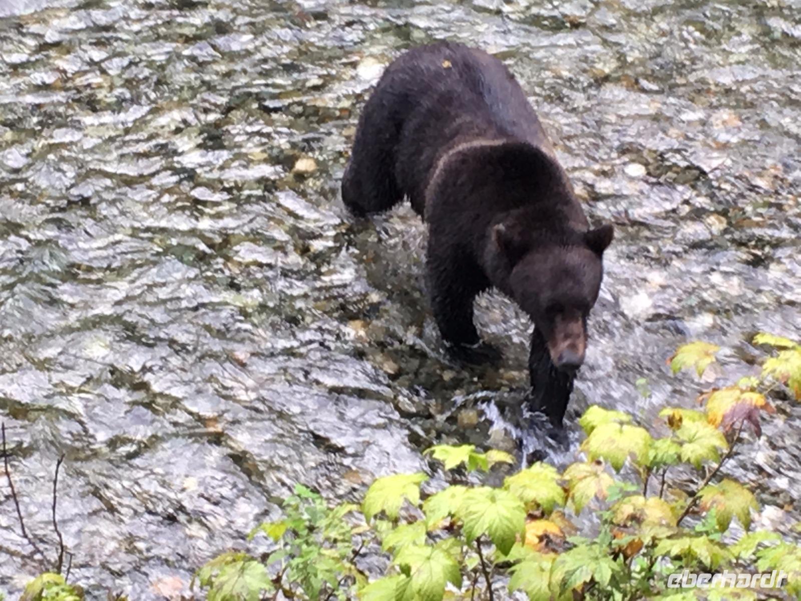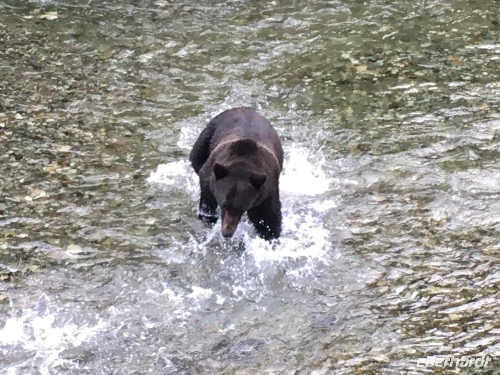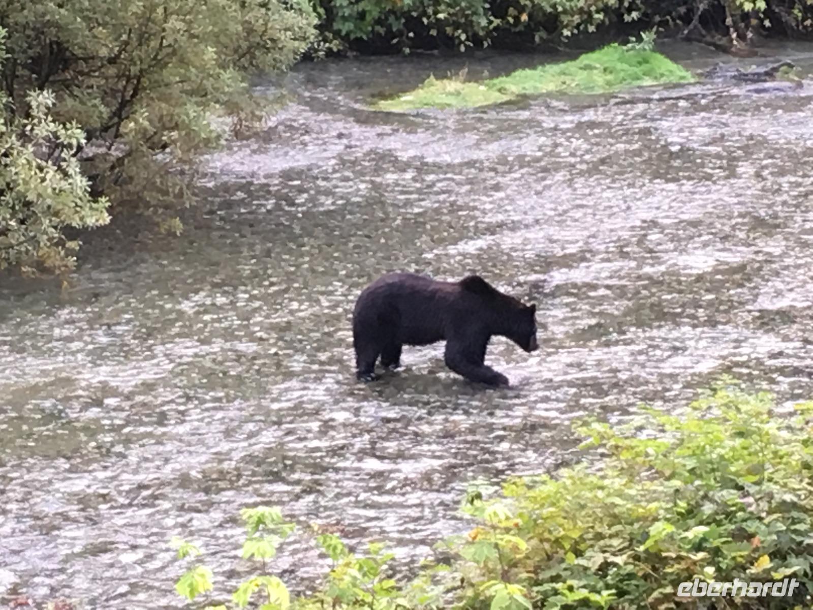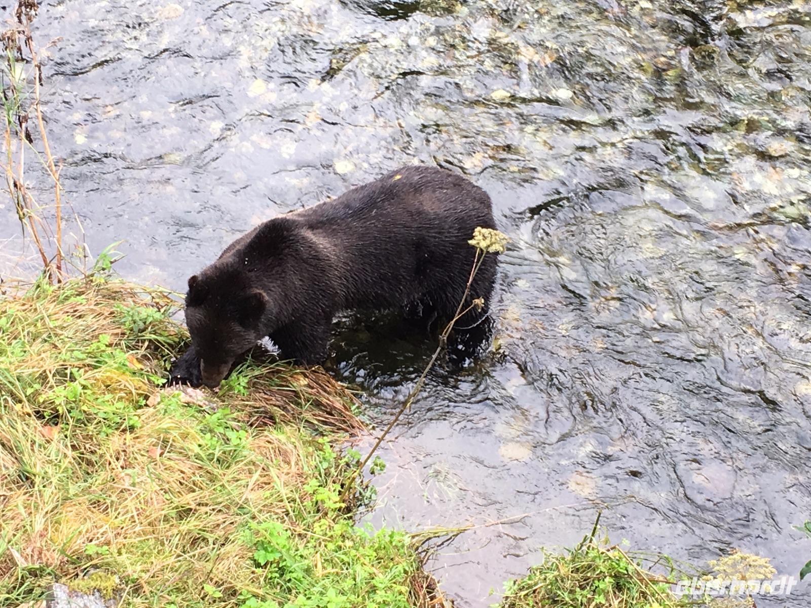 Och, wir wachen auf und der Nebel haengt ganz tief. Der Wetterbericht meint hingegen es sei ein sonniger Tag, also lassen wir uns ueberraschen und verzweifeln nicht instant. Nach dem Fruehstuecksbuffet fahren wir gleich los, ueber die Grenze, nach Hyder in Alaska. Der erste Halt ist am Fish Creek........WOW, siehe da, ein riesengrosser schwarzer Grizzly steht in dem seichten Fluss und fischt nach Chum Lachse. Er will ihnen die Haut abziehen, denn die Chums schmecken ihm am allerbesten. Wir schauen ihm lange zu, wie er staendig den Lachsen hinterherrennt um sie mit seinen riesen Tatzen zu fangen. Wenn er bloss einen Spring Lachs faengt, frisst er bloss die Eier davon und laesst den Rest einfach im Wasser liegen. Dieses Spektakel ist hoechst interessant und nimmt uns fuer ein einhalb Stunden in ihren Bann. Erst wenn er gut ernaehrt, sich langsam entfernt koennen wir uns von dem Schauspiel loesen und in den Bus zurueckkehren. Goran faehrt uns nun auf einer Schotterstrasse einem breiten Tal entlang welches von einem Fluss durchzogen ist. Immer wieder sehen wir Weisskopfadler die wohl auch auf die Lachse warten. Vorbei an neuen und alt- angesessenen Goldminen fahren wir bis hoch hinan. Die Strasse haengt an der Seite eines steilen Berges. Unten im Tal sehen wir den Kopf eines riesen Gletschers und oben auf den Bergen glitzern Schneefelder und Gletscher in unterschiedlichen Groessen und Formen auf uns hinunter. Das Wetter ist nun wie im Wetterbericht. Schoen, sonnig und windlos, keine Spur mehr von dem Nebel. In einer Strassenkurve gibt es eine grosse Ausbuchtung wo wir auch anhalten um den Rest dieses enormen Gletschers zu bestaunen. Der Salmon Gletscher ist maechtig und wuchtig, seine Gletscherspalten blitzen hellblau und der Staub auf dem Gletscher schaut aus wie eine graue Strasse. Einige unter uns entpuppen sich als Kletterer und so kraxeln wir auf den Berg nahe des Parkplatzes. ½ Stunde spaeter stehen wir oben und schauen auf unseren Bus und den Rest unserer Gruppe hinunter. Der Salmon Gletscher wirkt von hier oben noch groesser, denn man sieht seinen Ursprung, das Schneefeld. Nun nehmen wir das Picknick ein und fahren dann wieder hinunter zum Fish Creek. Da tummelt sich nun ein brauner Grizzly im Wasser. Er ist etwas weiter weg und taucht auch immer wieder unter. Manchmal sehen wir ihn auf dem Ruecken schwimmend und mit den Beinen strampelnd und manchmal steht er im Wasser auf und streckt seinen Kopf hoch, wohl um uns zu beobachten. Sind wir nun die Beobachter oder die zu beobachtenden. Jetzt geht es aber weiter zum naechsten Highlight, denn viele unter uns haben sich zu einem Helikopterflug entschieden. Bei dem super Wetter sieht die Welt von oben noch schoener aus, wir fliegen ueber Fjorde, Gletscher, Schneefelder, sehen Goldminen, Seen und Bergziegen. Es ist ein echtes Erlebnis welches wir so schnell nicht vergssen werden. Ehe wir nochmals zum Fish Creek fahren um dort 3 jungen Schwarzbaeren zuzuschauen gibt es noch ein feines Abendbrot mit .....Lachs natuerlich. Todmuede und voller schoener Eindruecke suchen wir nun unsere Zimmer auf. Gute Nacht, bis Morgen.
