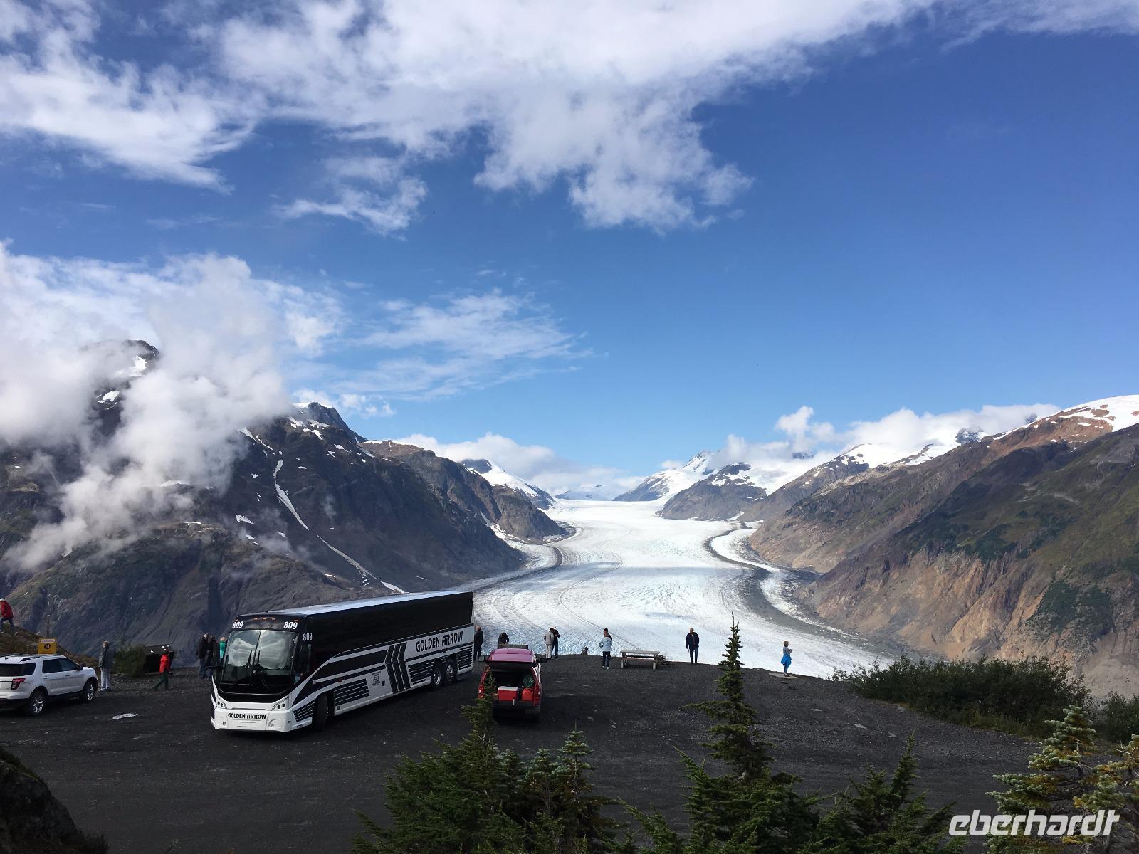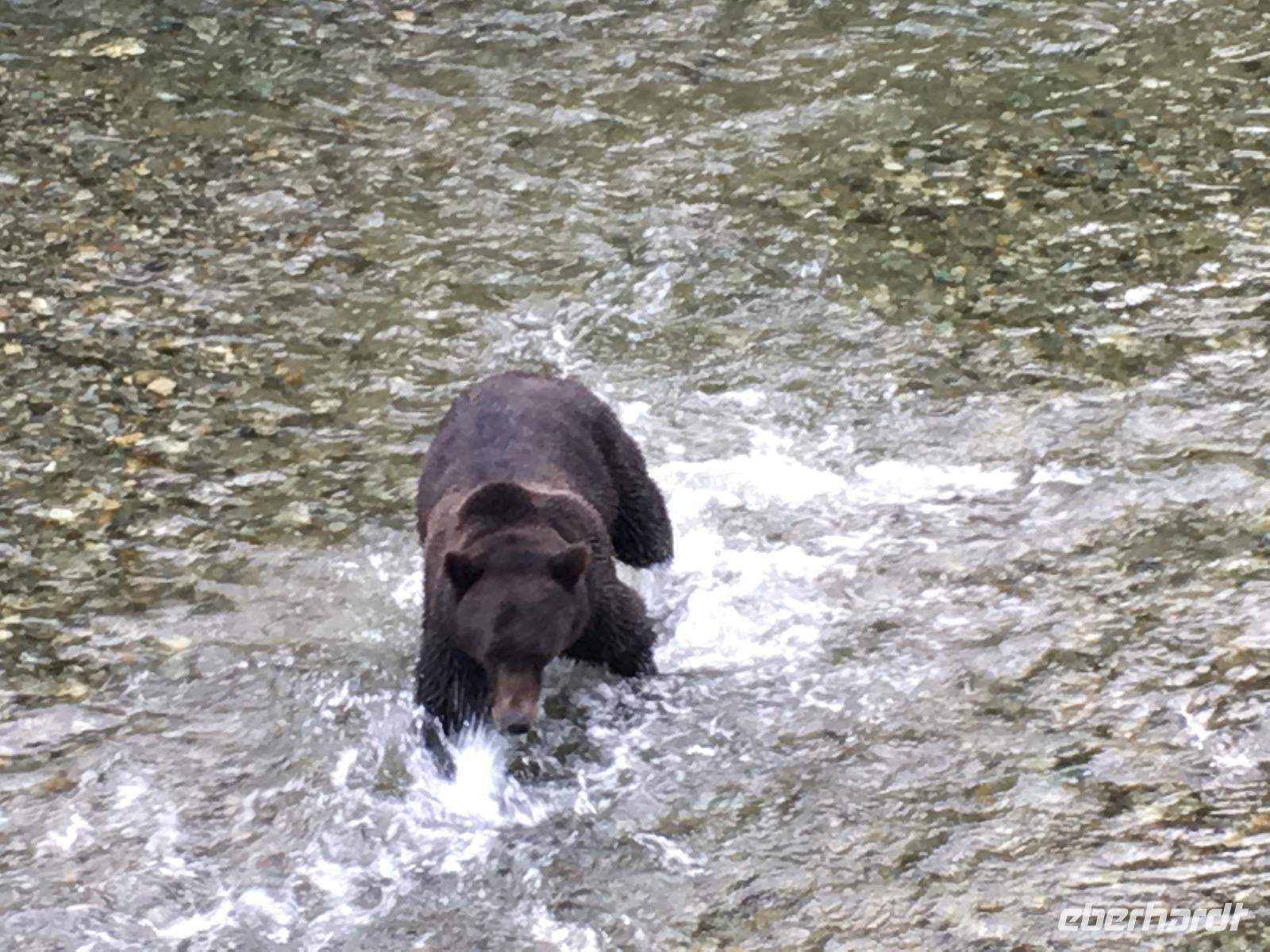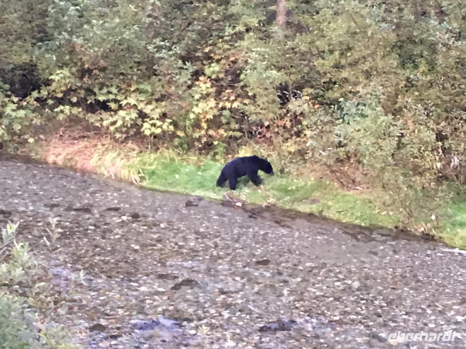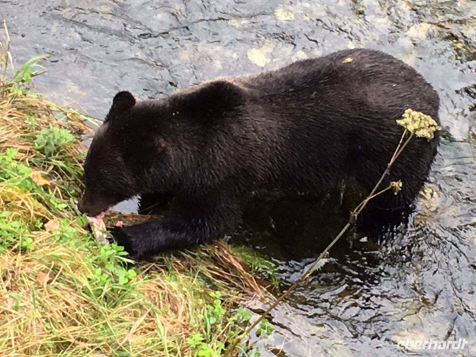 Och, wir wachen auf und der Nebel haengt ganz tief. Der Wetterbericht meint hingegen es sei ein sonniger Tag, also lassen wir uns ueberraschen und verzweifeln nicht instant. Nach dem Fruehstuecksbuffet fahren wir gleich los, ueber die Grenze, nach Hyder in Alaska. Der erste Halt ist am Fish Creek........WOW, siehe da, ein riesengrosser schwarzer Grizzly steht in dem seichten Fluss und fischt nach Chum Lachse. Er will ihnen die Haut abziehen, denn die Chums schmecken ihm am allerbesten. Wir schauen ihm lange zu, wie er staendig den Lachsen hinterherrennt um sie mit seinen riesen Tatzen zu fangen. Wenn er bloss einen Spring Lachs faengt, frisst er bloss die Eier davon und laesst den Rest einfach im Wasser liegen. Dieses Spektakel ist hoechst interessant und nimmt uns fuer ein einhalb Stunden in ihren Bann. Erst wenn er gut ernaehrt, sich langsam entfernt koennen wir uns von dem Schauspiel loesen und in den Bus zurueckkehren. Goran faehrt uns nun auf einer Schotterstrasse einem breiten Tal entlang welches von einem Fluss durchzogen ist. Immer wieder sehen wir Weisskopfadler die wohl auch auf die Lachse warten. Vorbei an neuen und alt- angesessenen Goldminen fahren wir bis hoch hinan. Die Strasse haengt an der Seite eines steilen Berges. Unten im Tal sehen wir den Kopf eines riesen Gletschers und oben auf den Bergen glitzern Schneefelder und Gletscher in unterschiedlichen Groessen und Formen auf uns hinunter. Das Wetter ist nun wie im Wetterbericht. Schoen, sonnig und windlos, keine Spur mehr von dem Nebel. In einer Strassenkurve gibt es eine grosse Ausbuchtung wo wir auch anhalten um den Rest dieses enormen Gletschers zu bestaunen. Der Salmon Gletscher ist maechtig und wuchtig, seine Gletscherspalten blitzen hellblau und der Staub auf dem Gletscher schaut aus wie eine graue Strasse. Einige unter uns entpuppen sich als Kletterer und so kraxeln wir auf den Berg nahe des Parkplatzes. ½ Stunde spaeter stehen wir oben und schauen auf unseren Bus und den Rest unserer Gruppe hinunter. Der Salmon Gletscher wirkt von hier oben noch groesser, denn man sieht seinen Ursprung, das Schneefeld. Nun nehmen wir das Picknick ein und fahren dann wieder hinunter zum Fish Creek. Da tummelt sich nun ein brauner Grizzly im Wasser. Er ist etwas weiter weg und taucht auch immer wieder unter. Manchmal sehen wir ihn auf dem Ruecken schwimmend und mit den Beinen strampelnd und manchmal steht er im Wasser auf und streckt seinen Kopf hoch, wohl um uns zu beobachten. Sind wir nun die Beobachter oder die zu beobachtenden. Jetzt geht es aber weiter zum naechsten Highlight, denn viele unter uns haben sich zu einem Helikopterflug entschieden. Bei dem super Wetter sieht die Welt von oben noch schoener aus, wir fliegen ueber Fjorde, Gletscher, Schneefelder, sehen Goldminen, Seen und Bergziegen. Es ist ein echtes Erlebnis welches wir so schnell nicht vergssen werden. Ehe wir nochmals zum Fish Creek fahren um dort 3 jungen Schwarzbaeren zuzuschauen gibt es noch ein feines Abendbrot mit .....Lachs natuerlich. Todmuede und voller schoener Eindruecke suchen wir nun unsere Zimmer auf. Gute Nacht, bis Morgen.