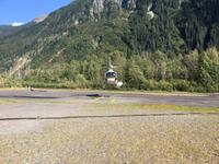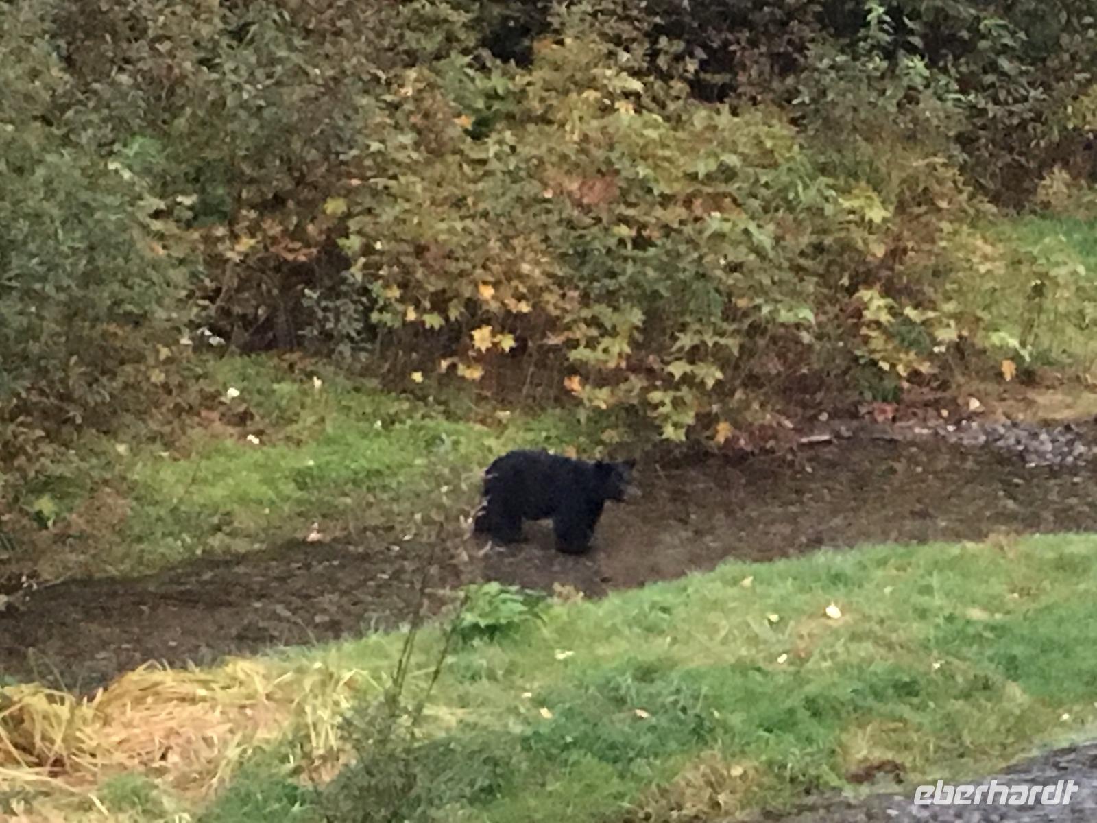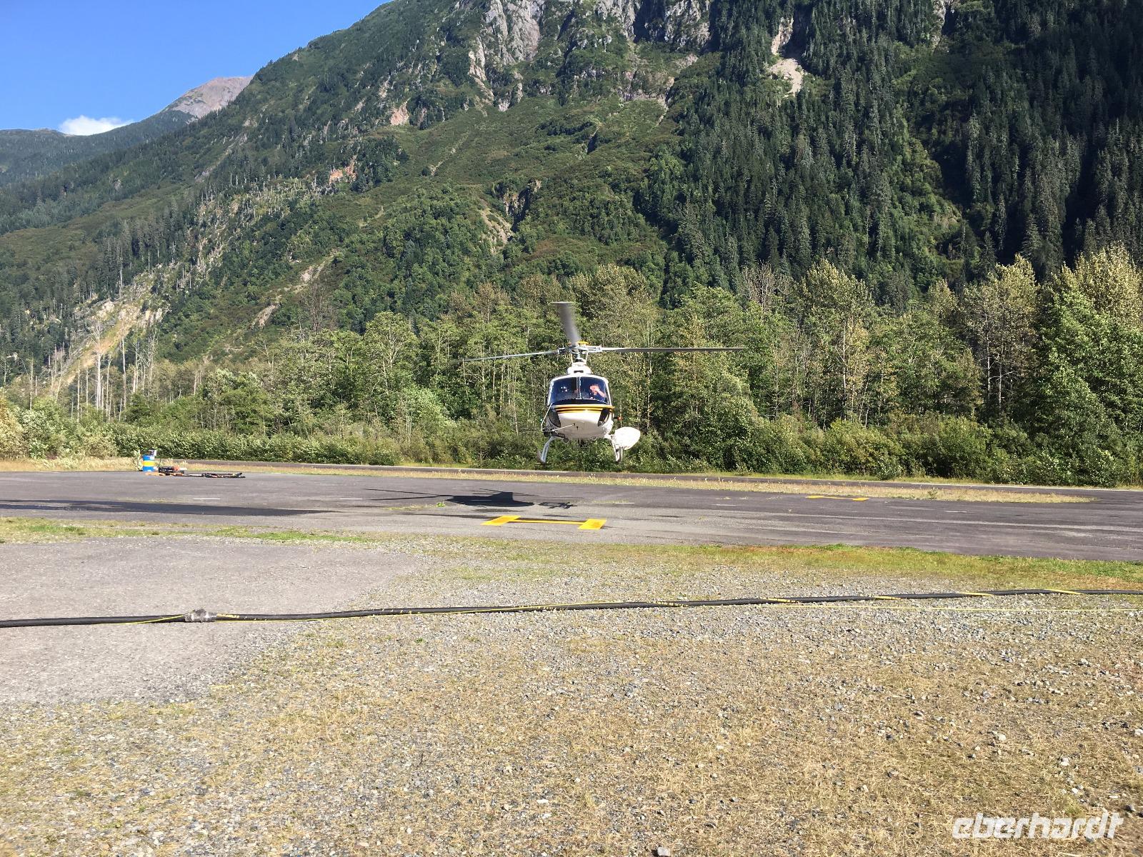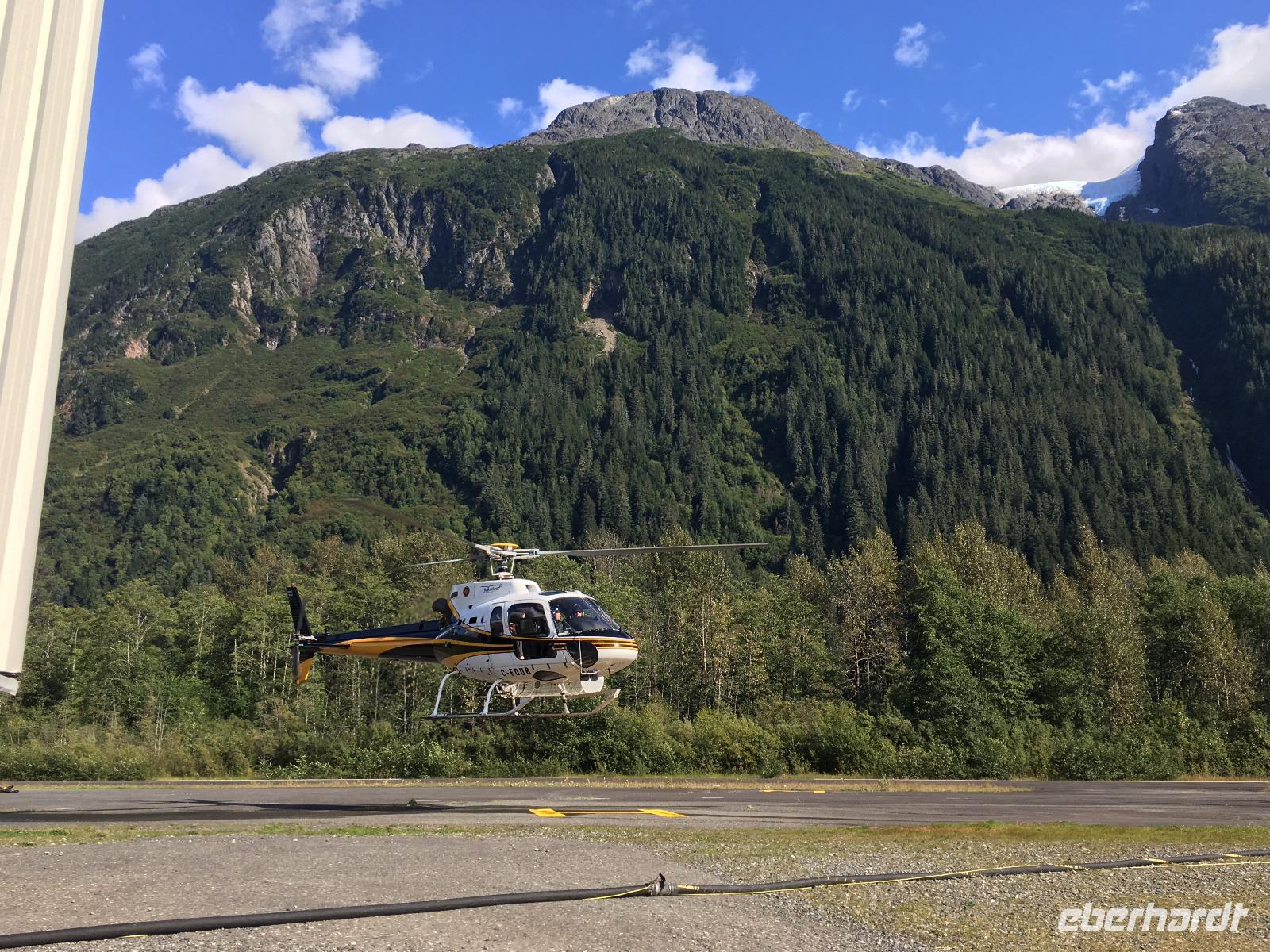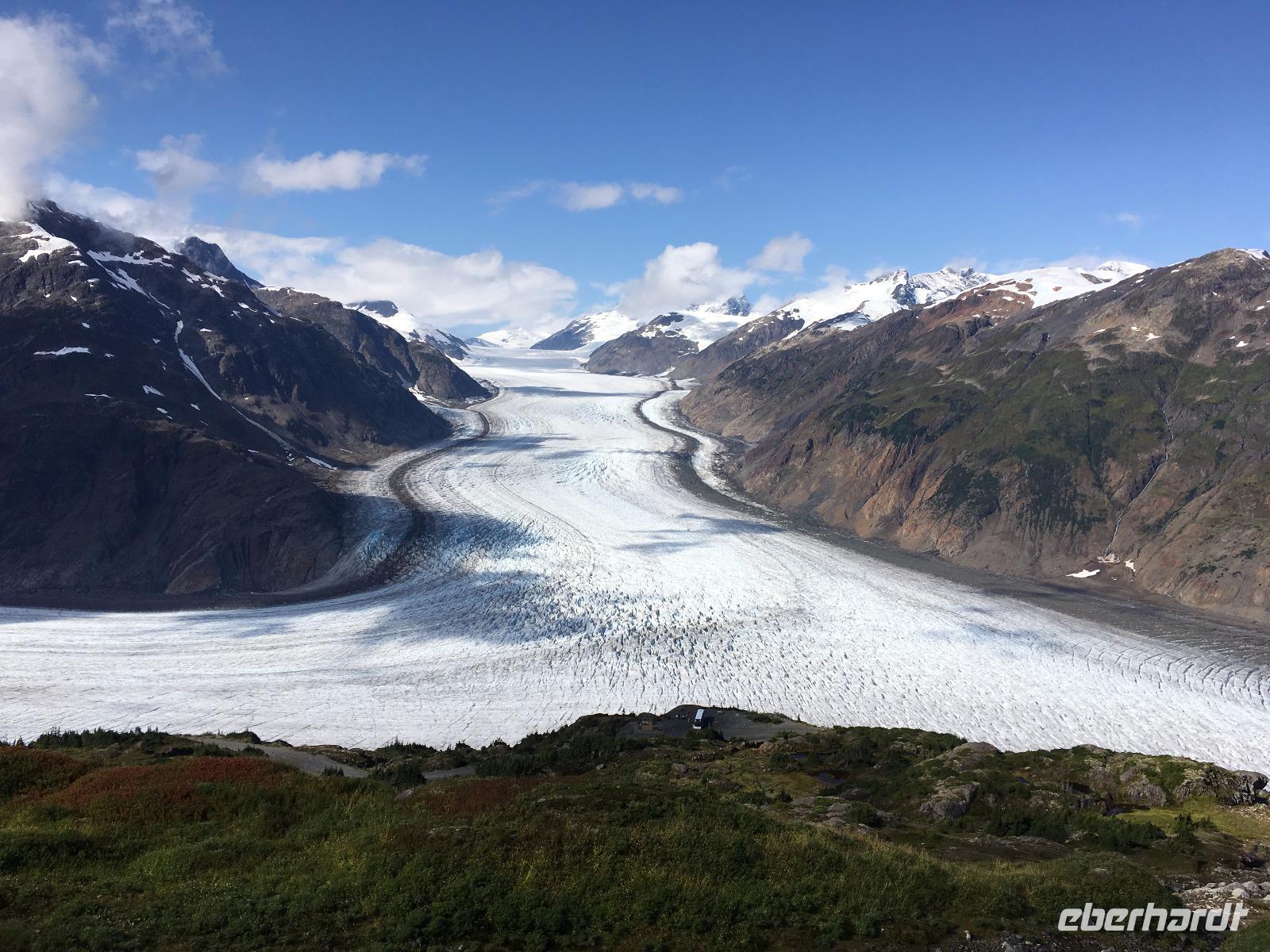 Och, wir wachen auf und der Nebel haengt ganz tief. Der Wetterbericht meint hingegen es sei ein sonniger Tag, also lassen wir uns ueberraschen und verzweifeln nicht instant. Nach dem Fruehstuecksbuffet fahren wir gleich los, ueber die Grenze, nach Hyder in Alaska. Der erste Halt ist am Fish Creek........WOW, siehe da, ein riesengrosser schwarzer Grizzly steht in dem seichten Fluss und fischt nach Chum Lachse. Er will ihnen die Haut abziehen, denn die Chums schmecken ihm am allerbesten. Wir schauen ihm lange zu, wie er staendig den Lachsen hinterherrennt um sie mit seinen riesen Tatzen zu fangen. Wenn er bloss einen Spring Lachs faengt, frisst er bloss die Eier davon und laesst den Rest einfach im Wasser liegen. Dieses Spektakel ist hoechst interessant und nimmt uns fuer ein einhalb Stunden in ihren Bann. Erst wenn er gut ernaehrt, sich langsam entfernt koennen wir uns von dem Schauspiel loesen und in den Bus zurueckkehren. Goran faehrt uns nun auf einer Schotterstrasse einem breiten Tal entlang welches von einem Fluss durchzogen ist. Immer wieder sehen wir Weisskopfadler die wohl auch auf die Lachse warten. Vorbei an neuen und alt- angesessenen Goldminen fahren wir bis hoch hinan. Die Strasse haengt an der Seite eines steilen Berges. Unten im Tal sehen wir den Kopf eines riesen Gletschers und oben auf den Bergen glitzern Schneefelder und Gletscher in unterschiedlichen Groessen und Formen auf uns hinunter. Das Wetter ist nun wie im Wetterbericht. Schoen, sonnig und windlos, keine Spur mehr von dem Nebel. In einer Strassenkurve gibt es eine grosse Ausbuchtung wo wir auch anhalten um den Rest dieses enormen Gletschers zu bestaunen. Der Salmon Gletscher ist maechtig und wuchtig, seine Gletscherspalten blitzen hellblau und der Staub auf dem Gletscher schaut aus wie eine graue Strasse. Einige unter uns entpuppen sich als Kletterer und so kraxeln wir auf den Berg nahe des Parkplatzes. ½ Stunde spaeter stehen wir oben und schauen auf unseren Bus und den Rest unserer Gruppe hinunter. Der Salmon Gletscher wirkt von hier oben noch groesser, denn man sieht seinen Ursprung, das Schneefeld. Nun nehmen wir das Picknick ein und fahren dann wieder hinunter zum Fish Creek. Da tummelt sich nun ein brauner Grizzly im Wasser. Er ist etwas weiter weg und taucht auch immer wieder unter. Manchmal sehen wir ihn auf dem Ruecken schwimmend und mit den Beinen strampelnd und manchmal steht er im Wasser auf und streckt seinen Kopf hoch, wohl um uns zu beobachten. Sind wir nun die Beobachter oder die zu beobachtenden. Jetzt geht es aber weiter zum naechsten Highlight, denn viele unter uns haben sich zu einem Helikopterflug entschieden. Bei dem super Wetter sieht die Welt von oben noch schoener aus, wir fliegen ueber Fjorde, Gletscher, Schneefelder, sehen Goldminen, Seen und Bergziegen. Es ist ein echtes Erlebnis welches wir so schnell nicht vergssen werden. Ehe wir nochmals zum Fish Creek fahren um dort 3 jungen Schwarzbaeren zuzuschauen gibt es noch ein feines Abendbrot mit .....Lachs natuerlich. Todmuede und voller schoener Eindruecke suchen wir nun unsere Zimmer auf. Gute Nacht, bis Morgen.