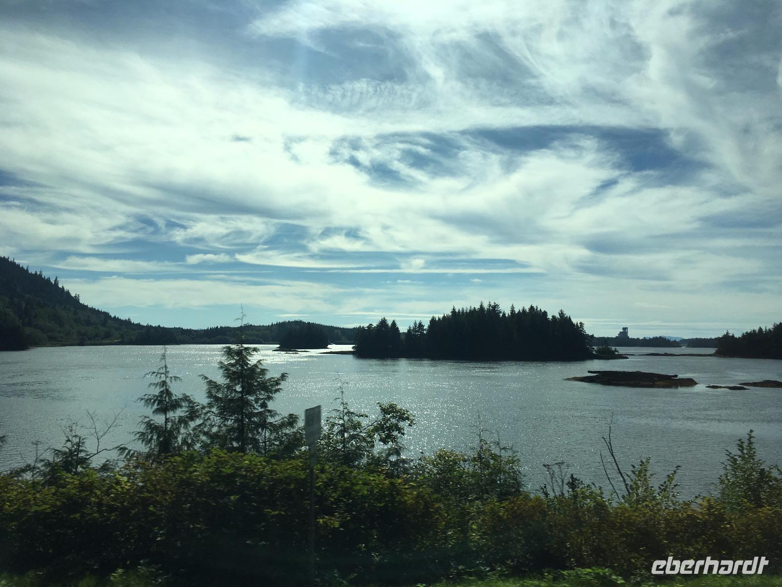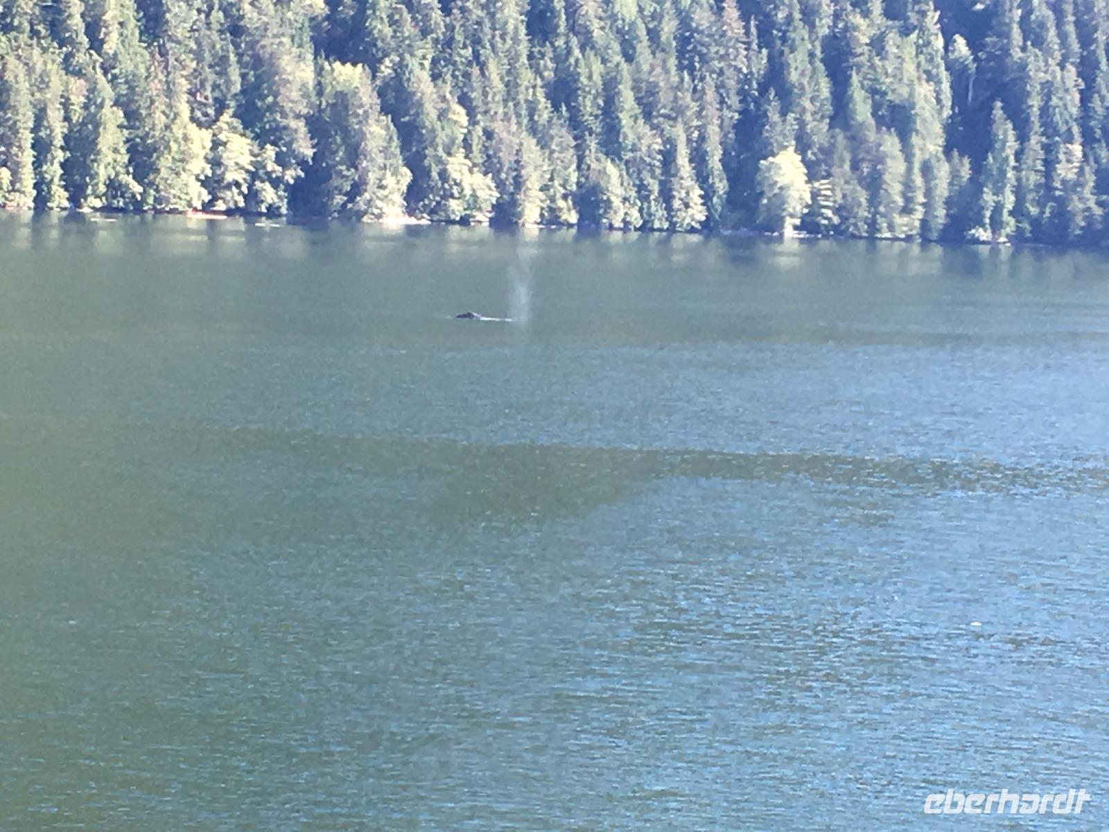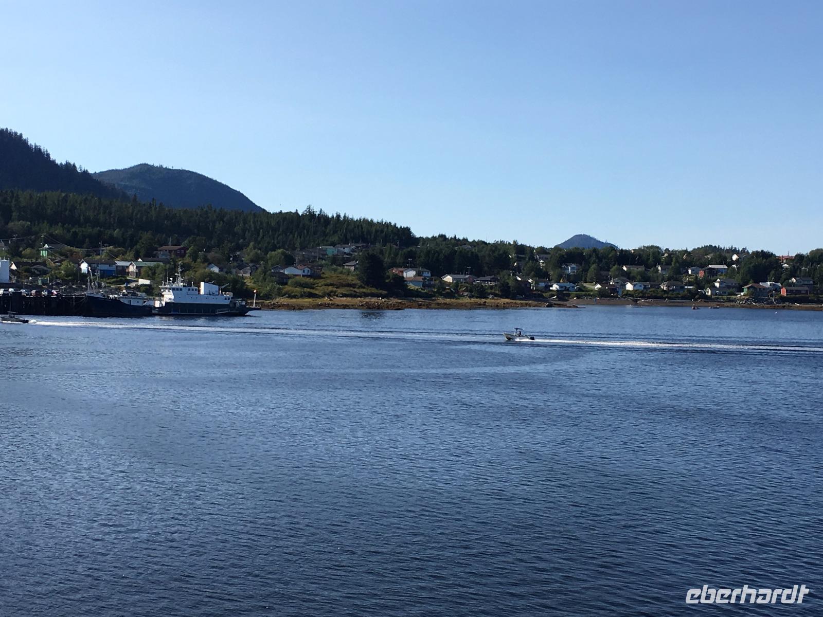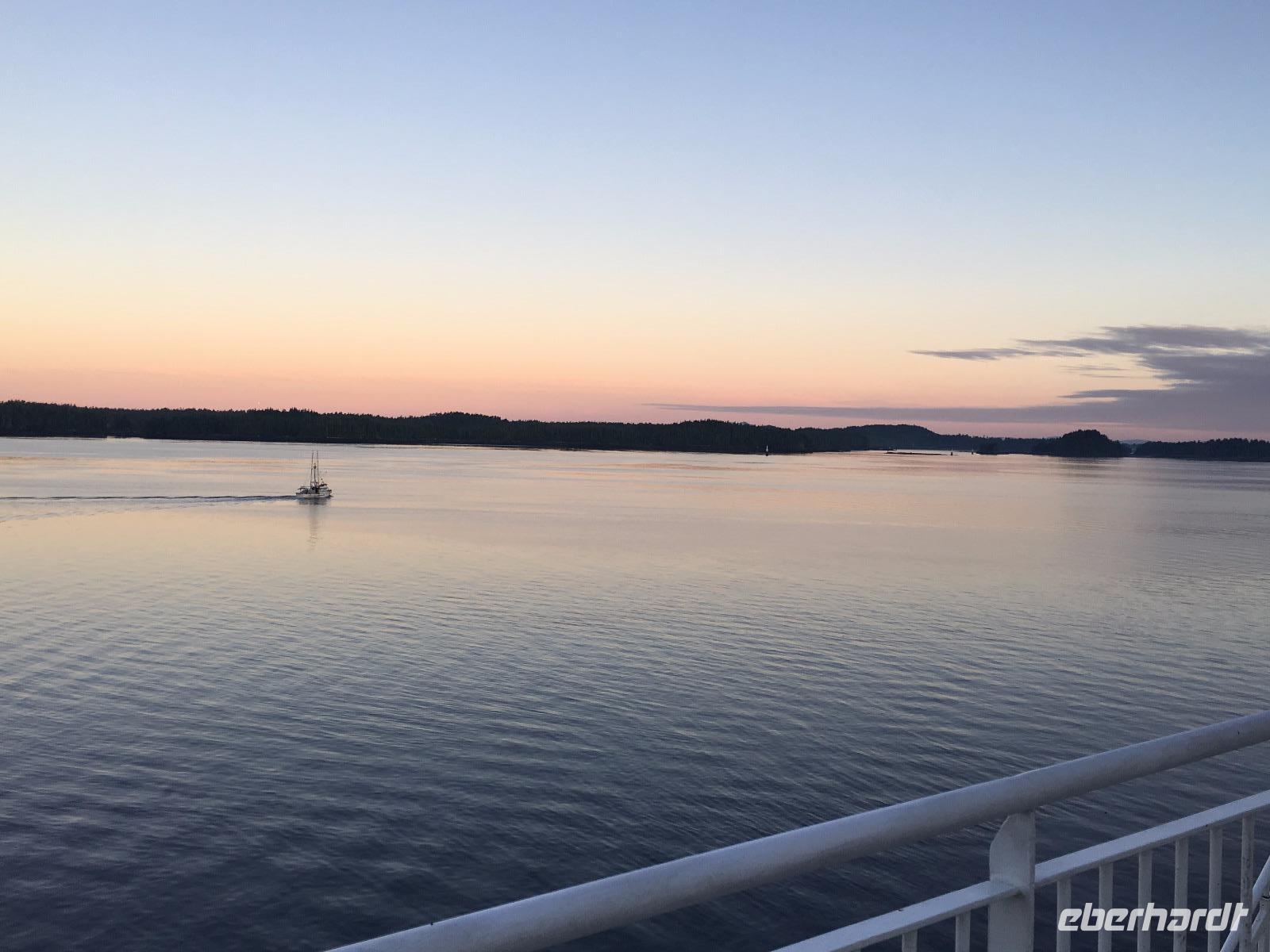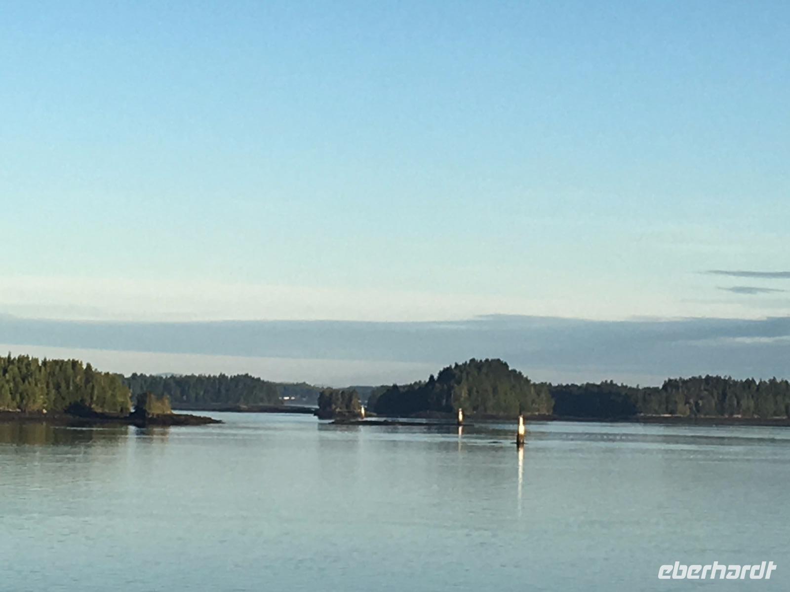 Au Weh ist richtig, denn es klingelt bereits um 5 Uhr in der Frueh ! Nur gut, dass wir die Koffer schon gestern abend in den Bus gestellt haben und bloss mit einem Handgepaeck bestueckt sind. Bald fahren wir mit dem Bus auf die Faehre, wir stehen ganz vorne und das ist fein, denn bei Ankunft in der Nacht, fahren wir auch wieder als erste raus. Die Inside Passage koennen wir so richtig schoen geniessen, 18 Stunden lang, was sich nach ein bisschen lange anhorchen mag, bei diesem herrlichen Wetter und den warmen Temperaturen jedoch sehr schnell vergeht. Wir haben ja auch mal Zeit, die Ansichtskarten zu schreiben, zu lesen, auszuruhen und diese wunderschoene Gegend auch von den vielen Aussendecks zu geniessen. Immer wieder gibt es einen Wasserfall oder ein Leuchturm zu sehen und dann kommt immer wieder die Aufregung......ein Ansage......Wale rechts, Wale links und alle rennen natuerlich auf die angegebene Seite, sodass der Steuermannn diese Gewichtsverschiebung jeweils ausgleichen muss. Wir werden auch auf die Bruecke eingeladen. Diese Faehre kommt aus Flensburg und der Heilige Nikolaus passt auf dieses Schiff auf. Alle Hebel, Knoepfe und Bildschirme werden uns erklaert und die Offiziere laecheln uns freundlich zu. Wir segeln mit der Flut und deshalb sind wir etwas frueher in Bella Bella wo einige Passagiere aus und zusteigen. Wir nutzen diese Gelegenheit fuer unsere Party auf Deck 4. Spaeter geniessen wir das feine Buffet im Restaurant Vista und immer wieder wird die Mahlzeit durch Walsichtung kurz unterbrochen. Manche Wale sind auch aus HOLZ ! Die Aufregung ist jedoch immer sehr amuesant. So vertreiben wir uns die Zeit auf sehr angenehme Art und Weise. In Port Hardy angekommen fahren wir gleich zum nahegelegenen Hotel und verschwinden lautlos in unsere Zimmer. Es war ein wahrlich herrlicher Tag.