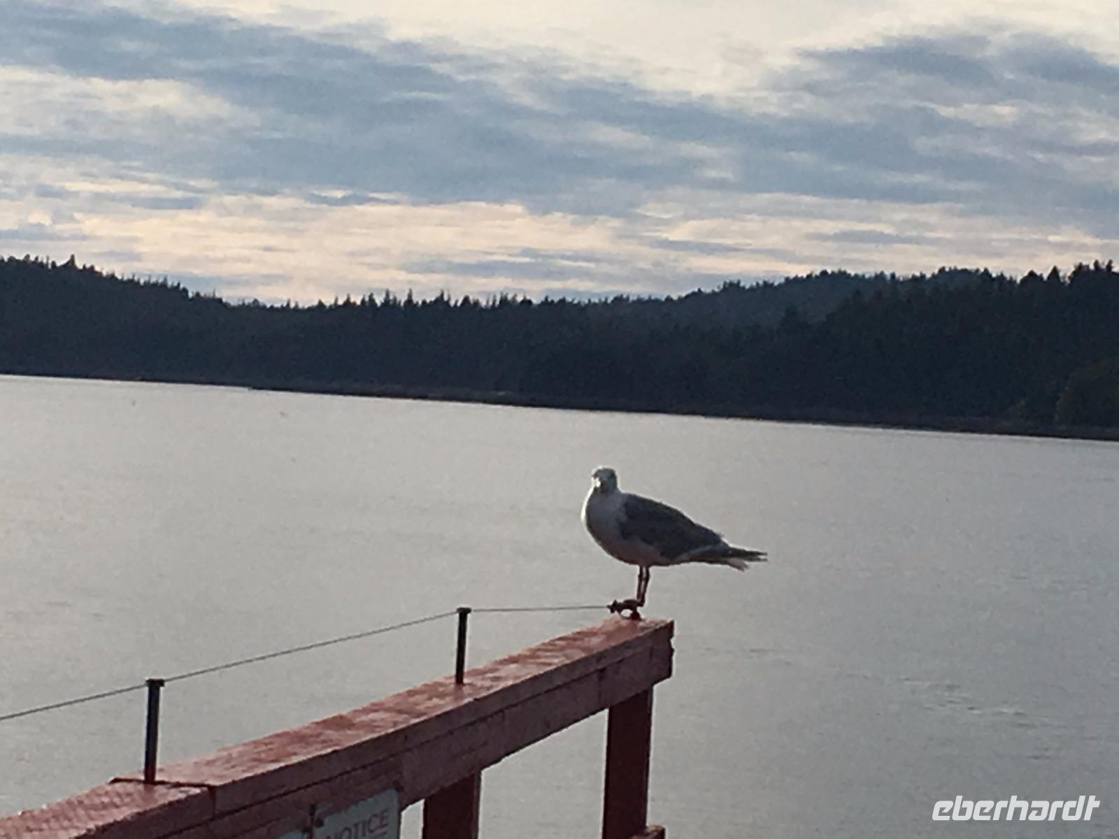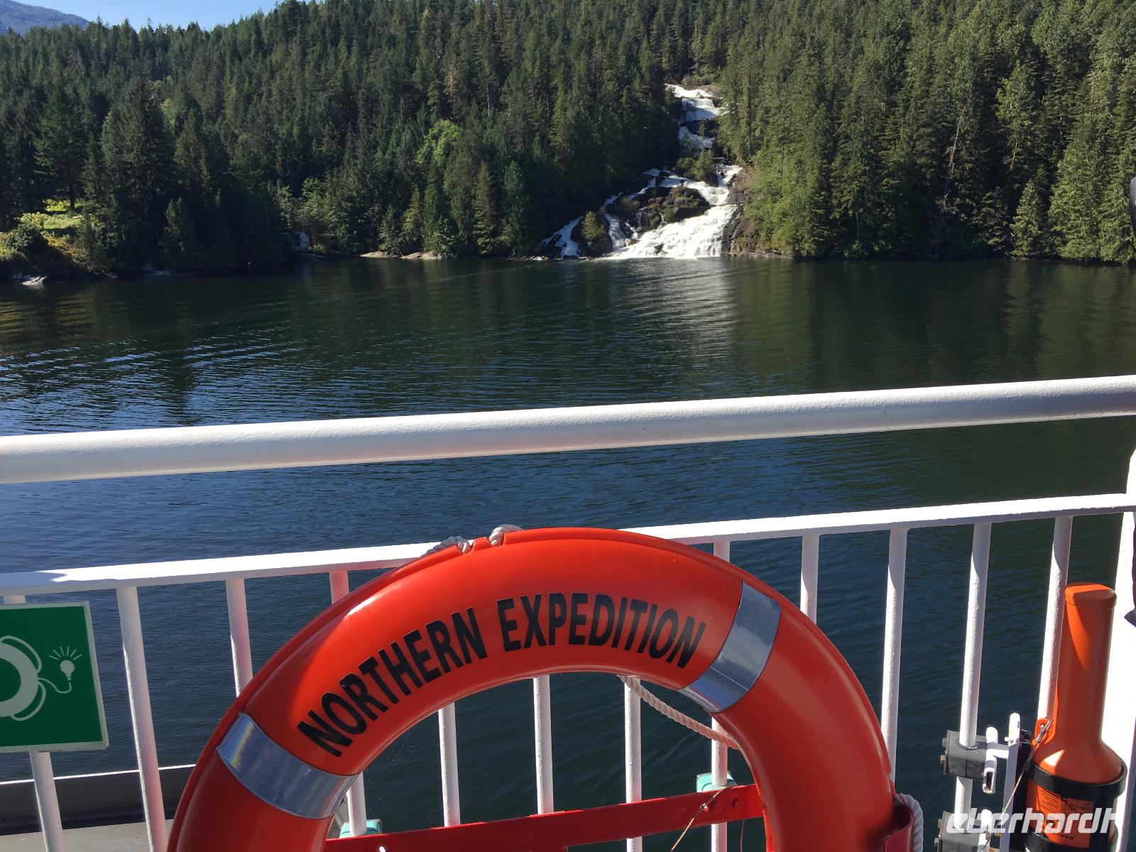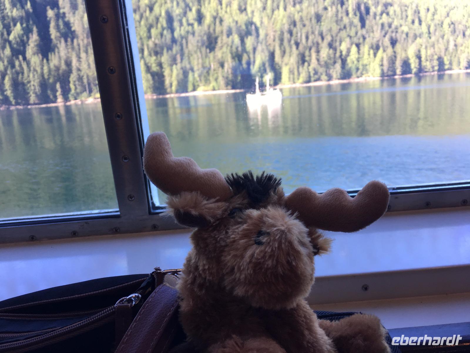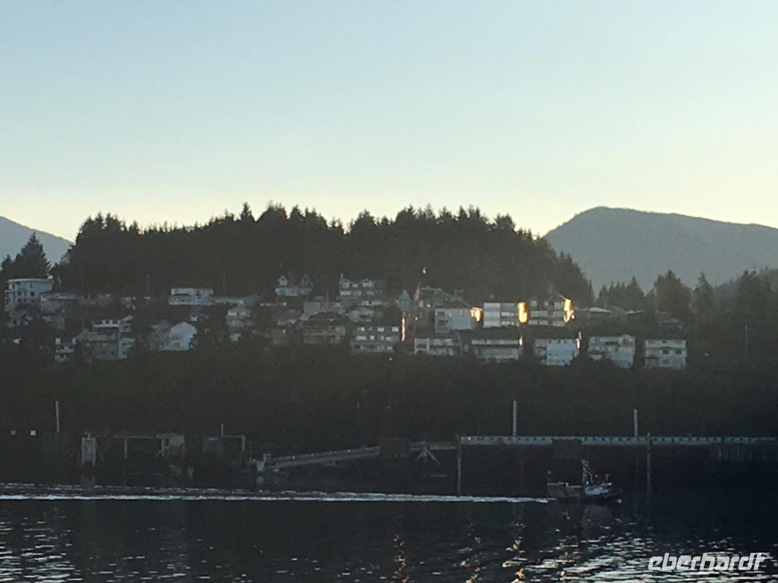 Au Weh ist richtig, denn es klingelt bereits um 5 Uhr in der Frueh ! Nur gut, dass wir die Koffer schon gestern abend in den Bus gestellt haben und bloss mit einem Handgepaeck bestueckt sind. Bald fahren wir mit dem Bus auf die Faehre, wir stehen ganz vorne und das ist fein, denn bei Ankunft in der Nacht, fahren wir auch wieder als erste raus. Die Inside Passage koennen wir so richtig schoen geniessen, 18 Stunden lang, was sich nach ein bisschen lange anhorchen mag, bei diesem herrlichen Wetter und den warmen Temperaturen jedoch sehr schnell vergeht. Wir haben ja auch mal Zeit, die Ansichtskarten zu schreiben, zu lesen, auszuruhen und diese wunderschoene Gegend auch von den vielen Aussendecks zu geniessen. Immer wieder gibt es einen Wasserfall oder ein Leuchturm zu sehen und dann kommt immer wieder die Aufregung......ein Ansage......Wale rechts, Wale links und alle rennen natuerlich auf die angegebene Seite, sodass der Steuermannn diese Gewichtsverschiebung jeweils ausgleichen muss. Wir werden auch auf die Bruecke eingeladen. Diese Faehre kommt aus Flensburg und der Heilige Nikolaus passt auf dieses Schiff auf. Alle Hebel, Knoepfe und Bildschirme werden uns erklaert und die Offiziere laecheln uns freundlich zu. Wir segeln mit der Flut und deshalb sind wir etwas frueher in Bella Bella wo einige Passagiere aus und zusteigen. Wir nutzen diese Gelegenheit fuer unsere Party auf Deck 4. Spaeter geniessen wir das feine Buffet im Restaurant Vista und immer wieder wird die Mahlzeit durch Walsichtung kurz unterbrochen. Manche Wale sind auch aus HOLZ ! Die Aufregung ist jedoch immer sehr amuesant. So vertreiben wir uns die Zeit auf sehr angenehme Art und Weise. In Port Hardy angekommen fahren wir gleich zum nahegelegenen Hotel und verschwinden lautlos in unsere Zimmer. Es war ein wahrlich herrlicher Tag.