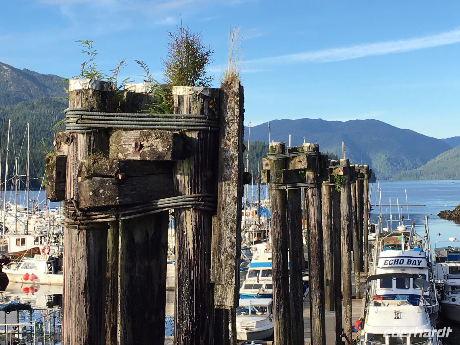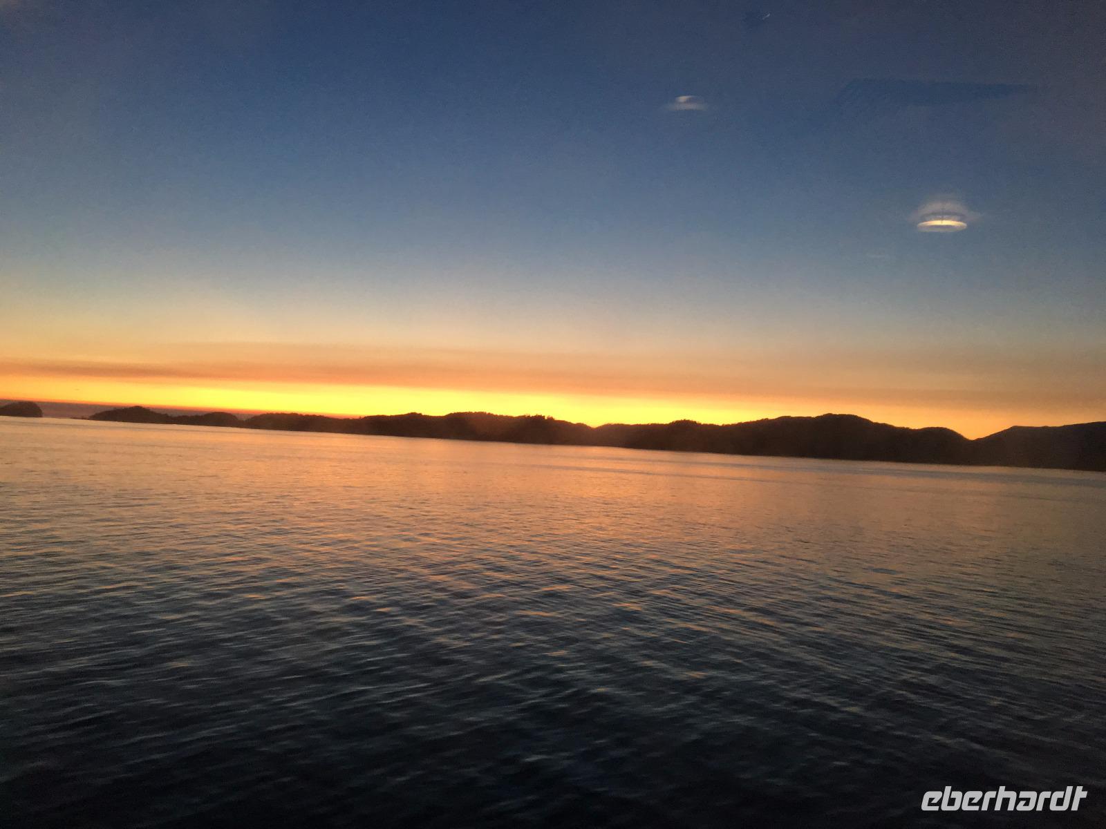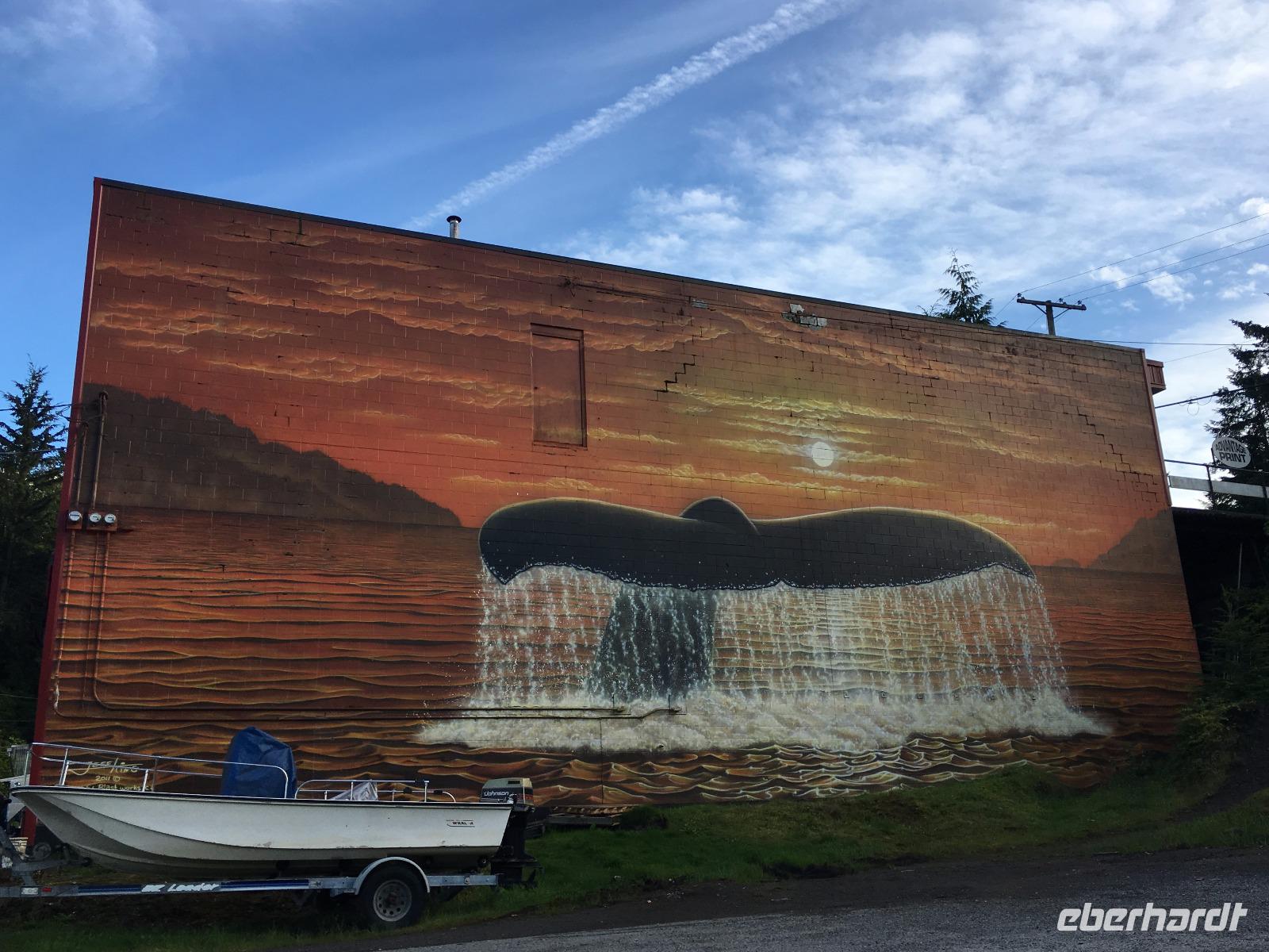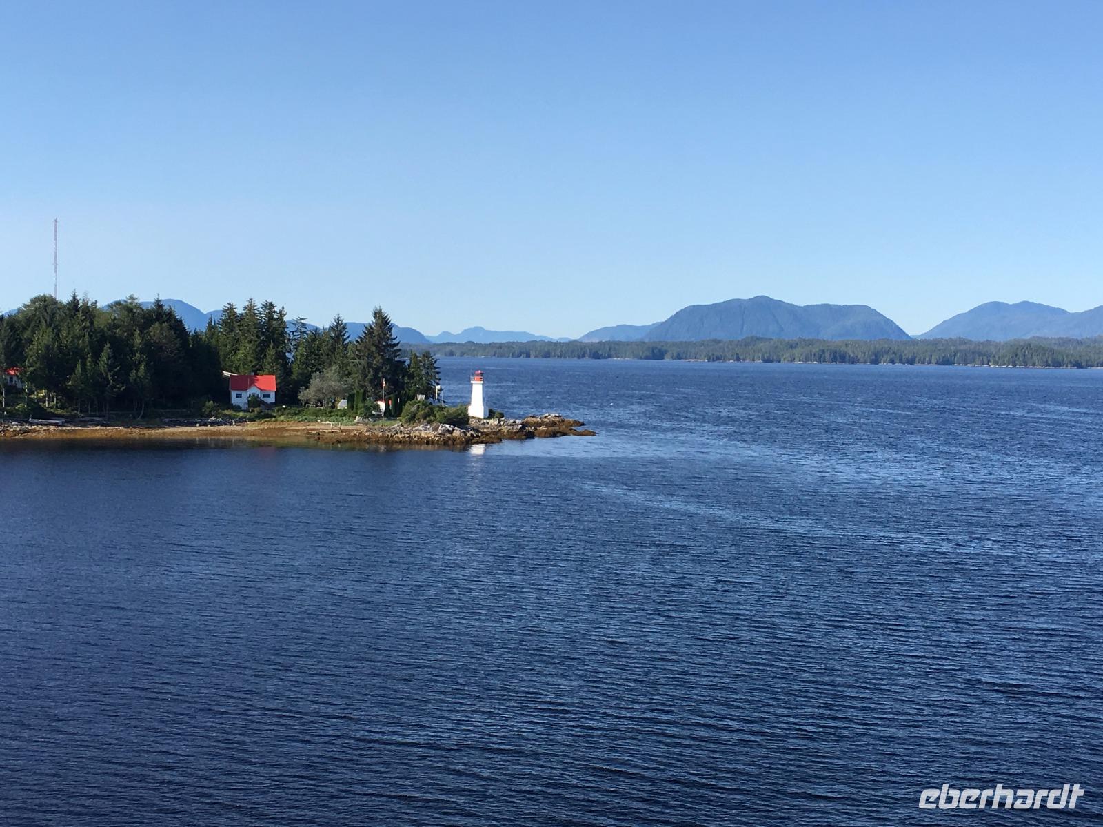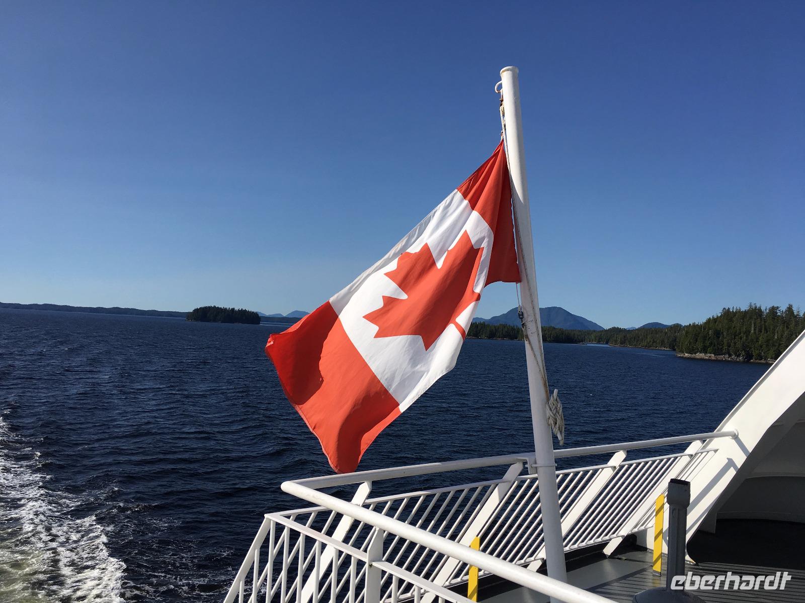 Au Weh ist richtig, denn es klingelt bereits um 5 Uhr in der Frueh ! Nur gut, dass wir die Koffer schon gestern abend in den Bus gestellt haben und bloss mit einem Handgepaeck bestueckt sind. Bald fahren wir mit dem Bus auf die Faehre, wir stehen ganz vorne und das ist fein, denn bei Ankunft in der Nacht, fahren wir auch wieder als erste raus. Die Inside Passage koennen wir so richtig schoen geniessen, 18 Stunden lang, was sich nach ein bisschen lange anhorchen mag, bei diesem herrlichen Wetter und den warmen Temperaturen jedoch sehr schnell vergeht. Wir haben ja auch mal Zeit, die Ansichtskarten zu schreiben, zu lesen, auszuruhen und diese wunderschoene Gegend auch von den vielen Aussendecks zu geniessen. Immer wieder gibt es einen Wasserfall oder ein Leuchturm zu sehen und dann kommt immer wieder die Aufregung......ein Ansage......Wale rechts, Wale links und alle rennen natuerlich auf die angegebene Seite, sodass der Steuermannn diese Gewichtsverschiebung jeweils ausgleichen muss. Wir werden auch auf die Bruecke eingeladen. Diese Faehre kommt aus Flensburg und der Heilige Nikolaus passt auf dieses Schiff auf. Alle Hebel, Knoepfe und Bildschirme werden uns erklaert und die Offiziere laecheln uns freundlich zu. Wir segeln mit der Flut und deshalb sind wir etwas frueher in Bella Bella wo einige Passagiere aus und zusteigen. Wir nutzen diese Gelegenheit fuer unsere Party auf Deck 4. Spaeter geniessen wir das feine Buffet im Restaurant Vista und immer wieder wird die Mahlzeit durch Walsichtung kurz unterbrochen. Manche Wale sind auch aus HOLZ ! Die Aufregung ist jedoch immer sehr amuesant. So vertreiben wir uns die Zeit auf sehr angenehme Art und Weise. In Port Hardy angekommen fahren wir gleich zum nahegelegenen Hotel und verschwinden lautlos in unsere Zimmer. Es war ein wahrlich herrlicher Tag.