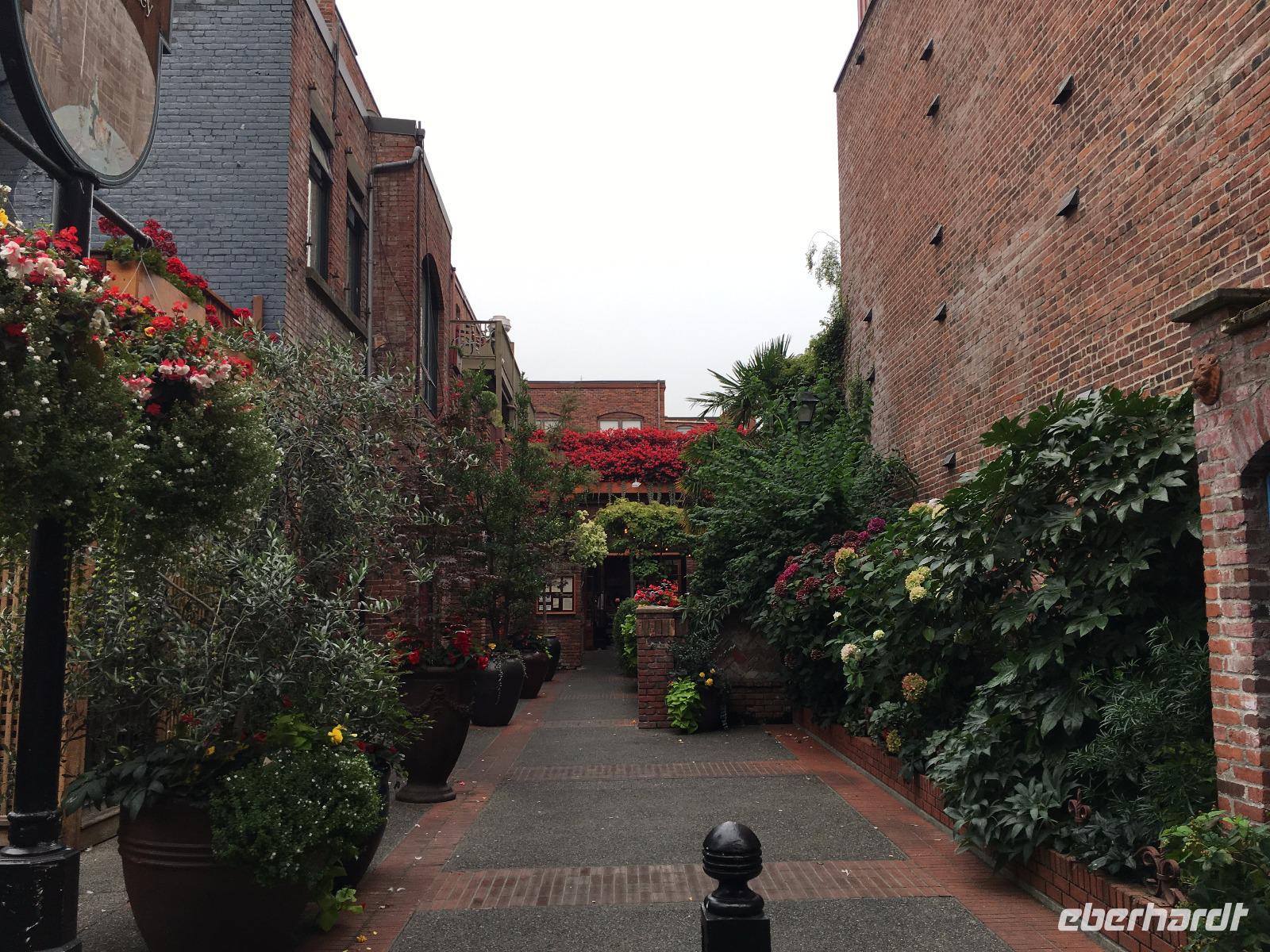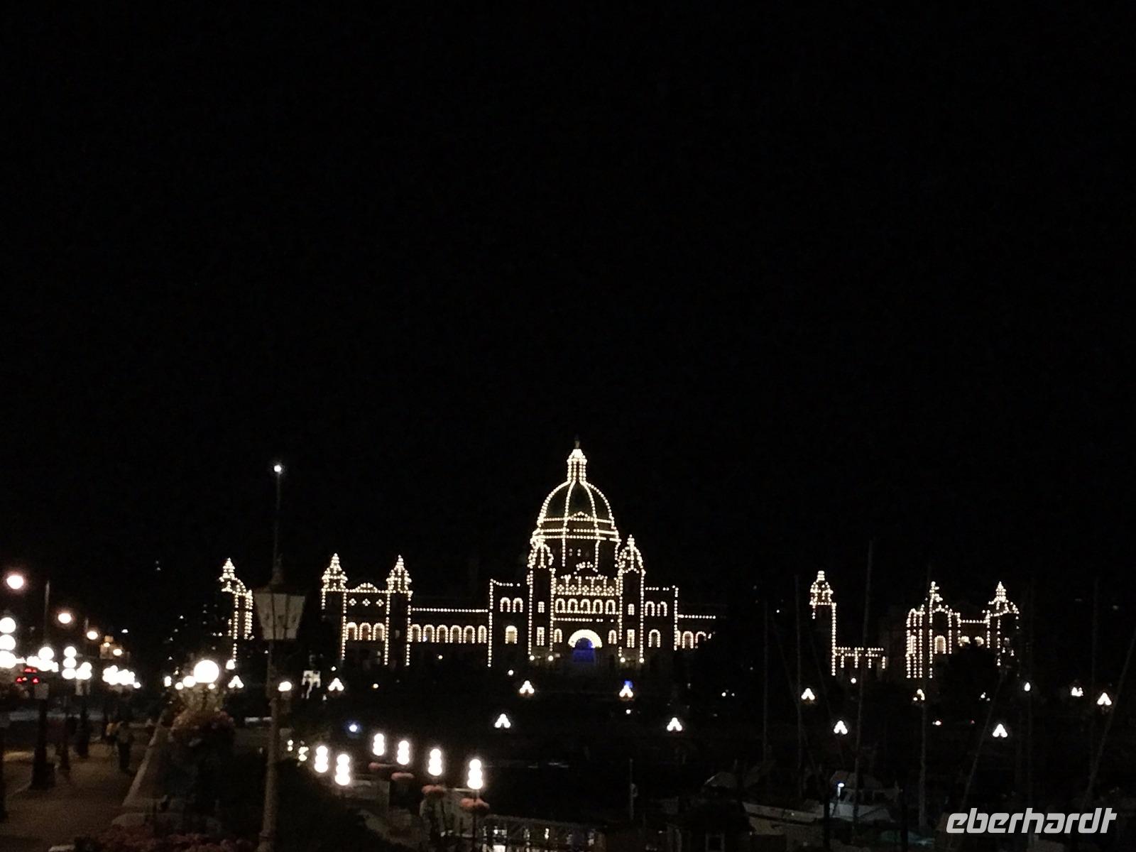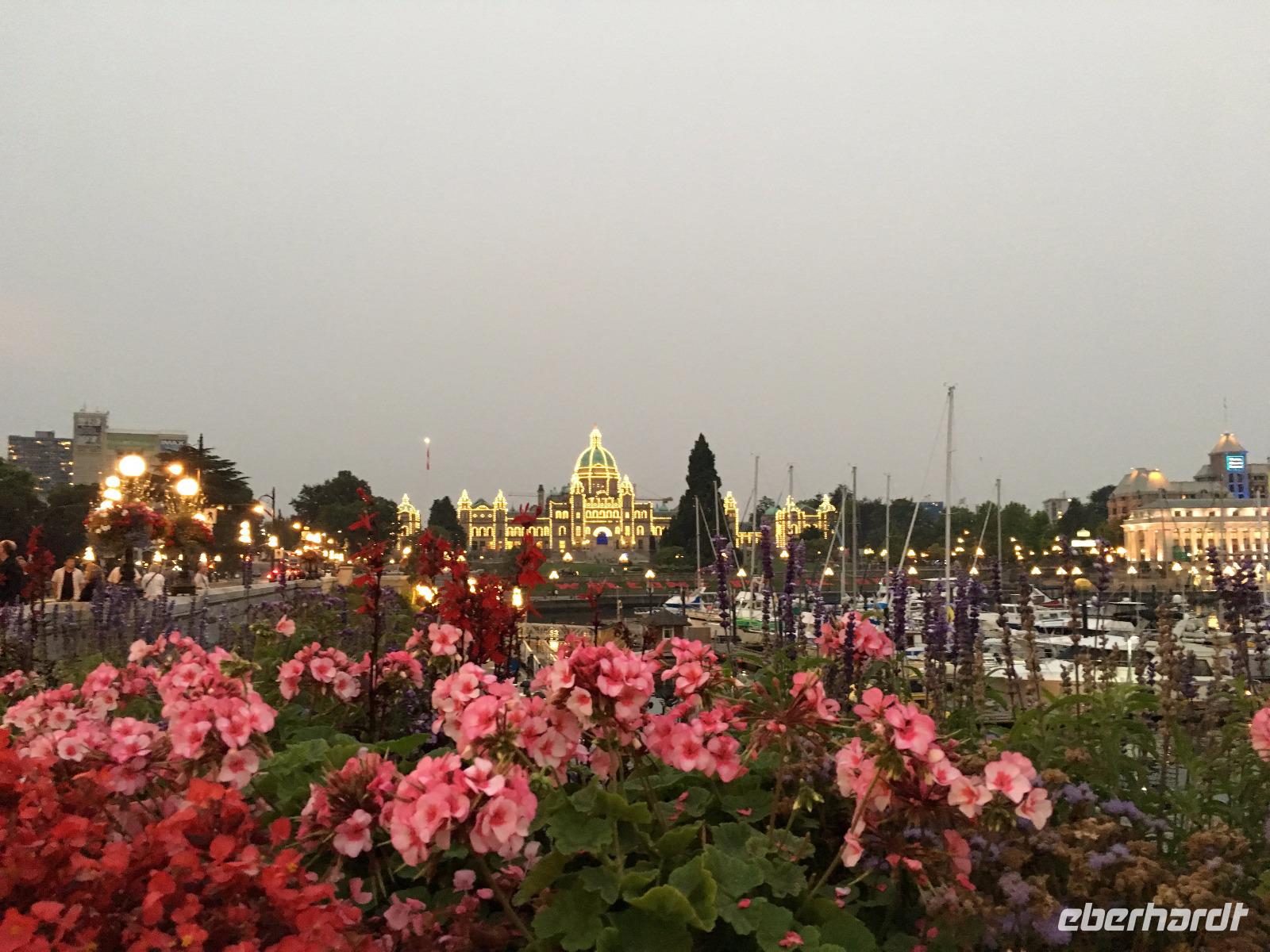 Schon wieder Sonnenschein, Was fuer ein unwahrscheinliches Glueck. Wir haben so viele kurze Hosen und Roecke gar nicht mitgenommen wie das Wetter es gut meint mit uns. So fahren wir gemuetlich, einen Film mit Bart, dem Kodiakbaeren, anschauend und Lornas feinen Kuchen im Cable House kostend, nach Campbell River und weiter nach Coombs wo wir die Mittagspause einlegen. Nach der Mittagspause schauen wir uns eine Freilichtgallerie an. Die Hausmauern von Chemainus sind fast alle schoen bemalt mit Bilder die historischen Hintergrund haben muessen. Ein wahrlich wunderbares Doerfchen, idyllisch an einer Bucht gelegen. Wir bleiben auch eine Weile ehe wir nicht nach Victoria weiterreisen. Unser heutiges Reiseziel, die Hauptstadt von Britisch Columbien, das schoene Victoria, erkunden wir zu Fuss. Goran, der beste aller Fahrer, faehrt unser Gepaeck ins Hotel und erwartet uns dort spaeter. Natuerlich kann man auch mit ihm gleich zum Hotel fahren und sich ein wenig ausruhen ehe wir zum Abendessen an den Hafen gehen. Ooh, das Parlamentsgbaeude, es ist so zauberhaft beleuchtet man glaubt es sei Weihnachten oder ein spezieller Anlass. Ach ja, es ist ein spezieller Anlass, wir sind angekommen, wir, die Glueckstruppe (ausser einigen Schnupfen !), Anlass genug zur Verschoenerung dieser schoenen Stadt. Das Abendessen ist sehr fein und die Aussicht natuerlich perfekt aufs Parlament. Mit einem schmunzeln auf unseren Lippen, wenn wir an Francis Rattenburry und seine Alma denken, schlummern wir heute ein.