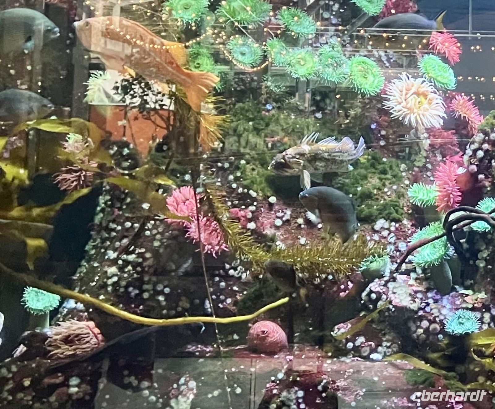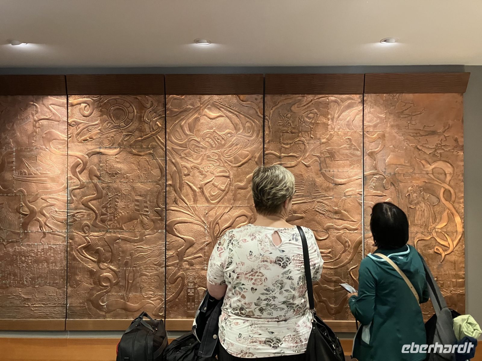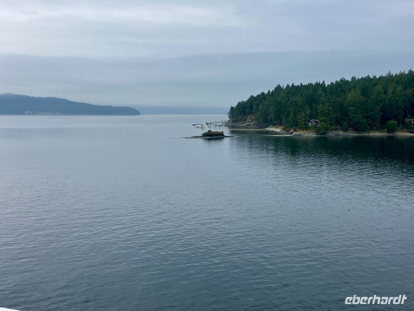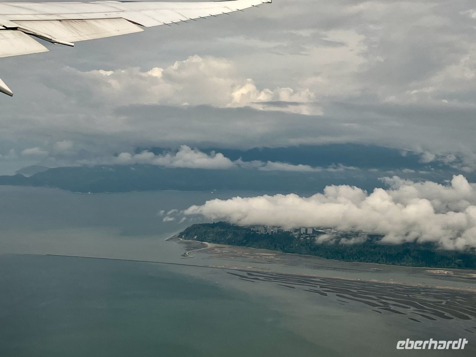 wie immer, um 7:30 Uhr, treffen wir uns beim Fruehstueck. Wir singen nochmals Happy Birthday fuer Peter aber da es noch fruehmorgends ist, hat der Chor die Stimmbaender noch nicht richtig geoelt. So sorry Peter ! Wir fahren anschliessend gleich zum Flughafen. Ehedem, verrabschieden wir uns noch von 6 lieben Mitreisenden, die hier in Vancouver eine Verelaengerung eingeplant haben. Einchecken geht nun ganz rasant, da alles automatisiert ist und jeder sich auf Deutsch an einem Kiosk einchecken kann mit Koffer. Dies getan gehen wir weiter bis zur Sicherheitskontrolle und zum Gate. Oh ja, die Fischchen im Aquarium sind echt schoen, die Annemonen bunt und die Moraene lugt unter dem Stein hervor. Die Flughalle ist hell, hat Baeume und ein Wasserlauf. Nein, keine Lachse sind da drinnen bloss Geldstueckchen fuer Flug-Glueck. Unser Flieger fliegt auch puenktlich ab.