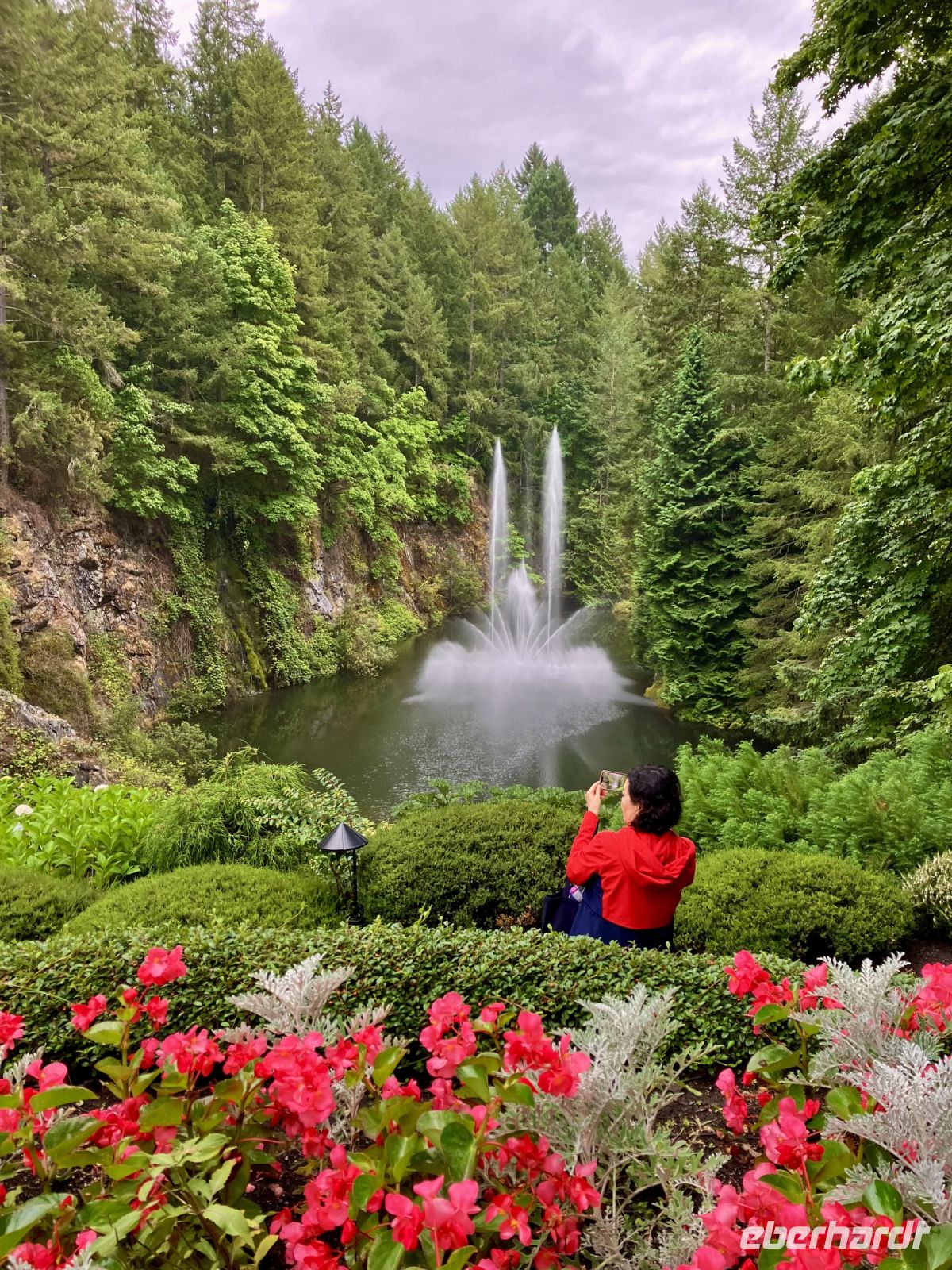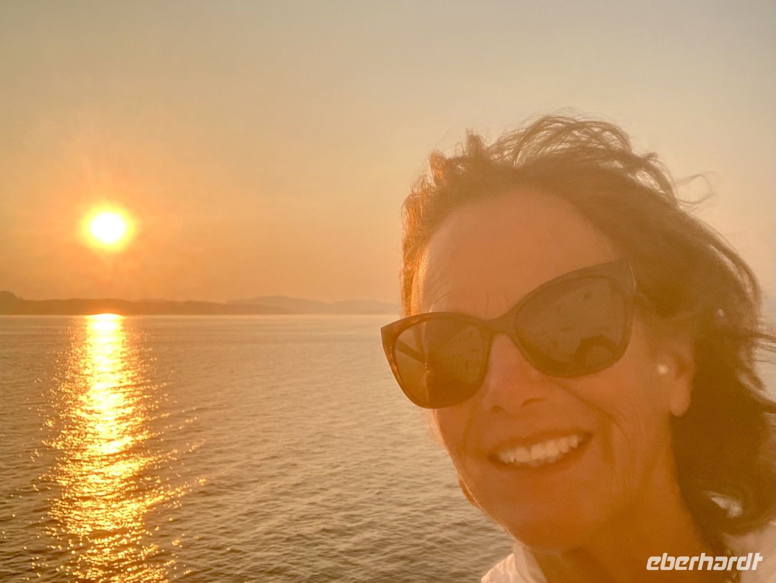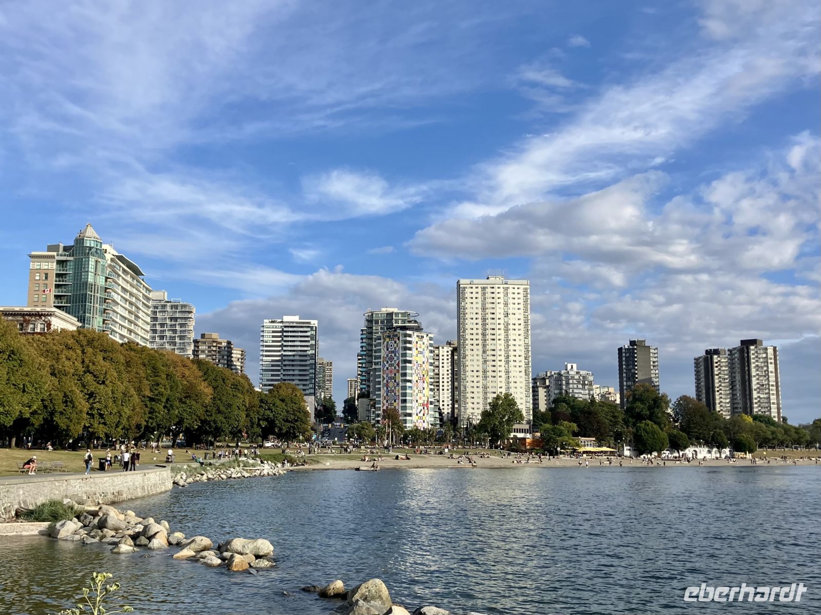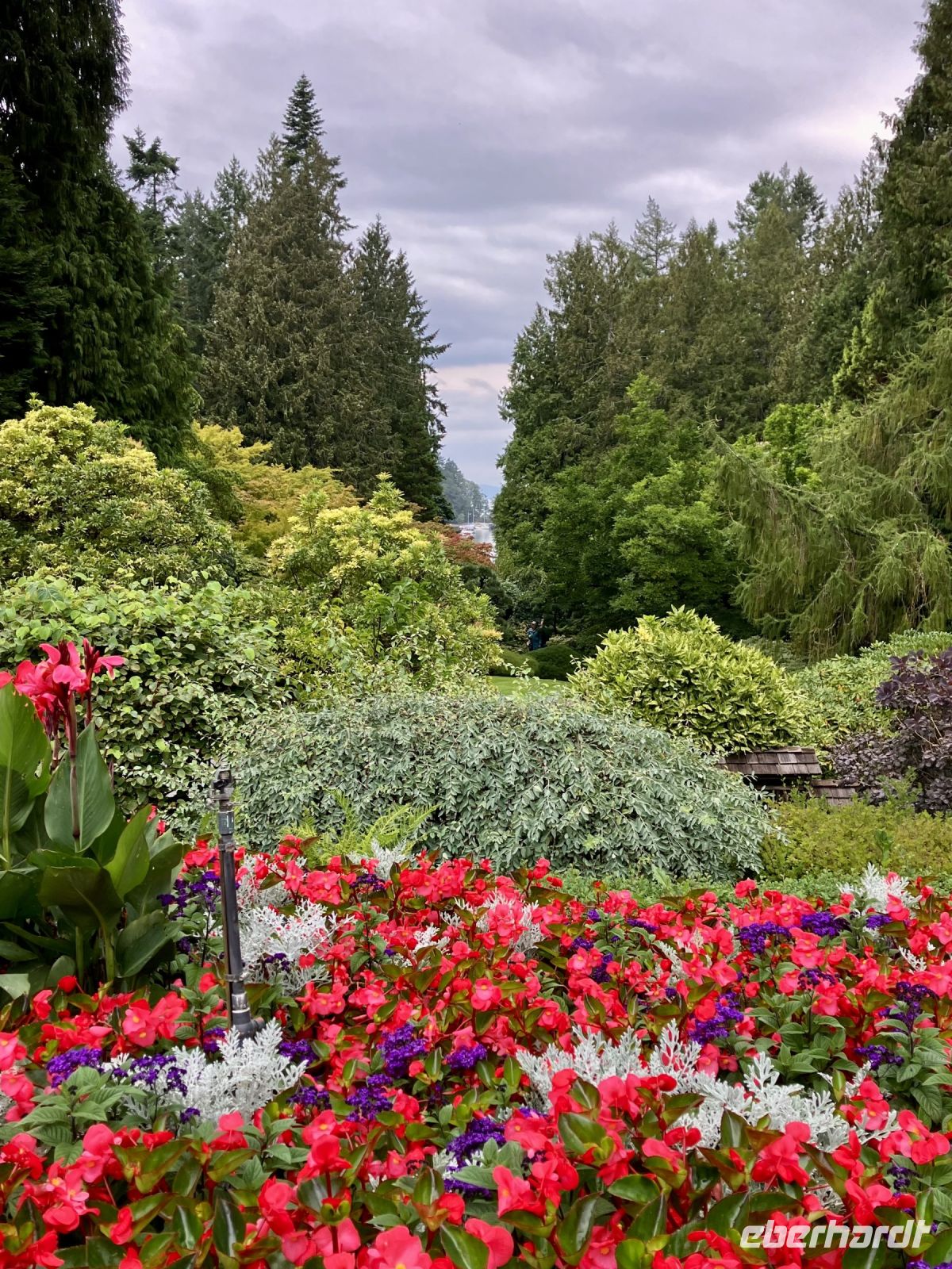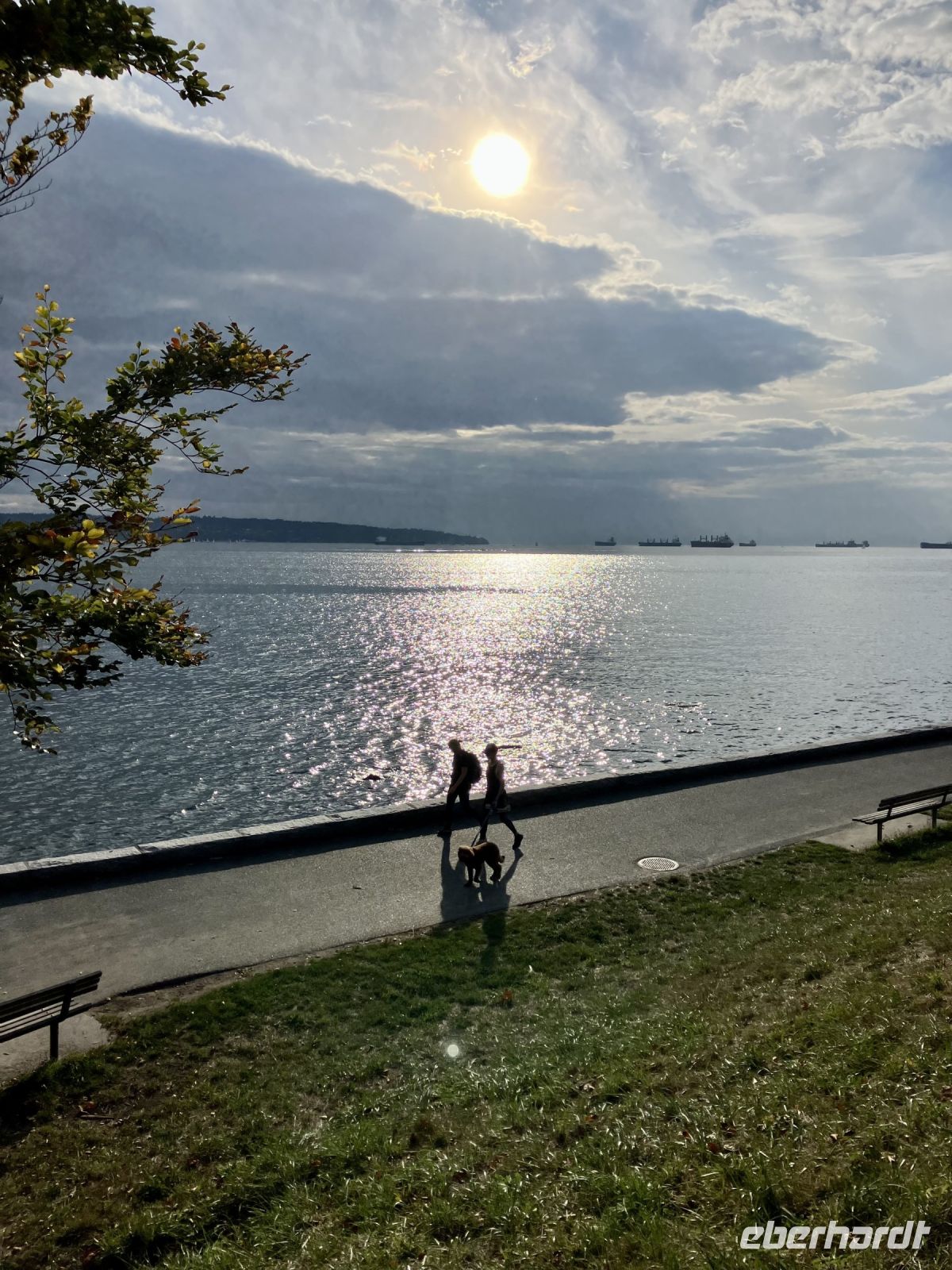 Die Sonne versteckt sich hinter den Wolken als wir heute spaeter als sonst aufwachen. Dieses ehrwuerdige, sehr englisch angehauchte Hotel, liegt mitten in der Stadt und wir haben heute morgen Zeit um in dem schoenen Victoria bummeln zu gehen, eine Yogastunde einzurichten, dem Hafentreiben zu zuschauen oder einfach die Beine baumeln zu lassen. Um 11 Uhr fahren wir erst ab. Dem Meer entlang fahren wir nun, vorbei an vielen herrlichen Villen und schoener Aussicht. Von der Meile 0 aus, sieht man sogar die schneebedeckten Berge der Olympia Peninsula der USA. Unser Ziel heute sind die Butchart Garten. Ach so wunderschoen sind doch diese Garten! Jenny Butchart hatte echt einen gruenen Daumen, dass heute ueber 1 Mio Leute pro Jahr herkommen um sich an ihrer Realisierung dieser einzigartigen Gartengestaltung zu erfreuen. Es gibt einen Haenge-garten, einen versunkenen Garten, einen italienischen- franzoesischen- und japanischen Garten. Die Rosen im Rosengarten stammen aus der ganzen Welt und der Schornstein der ehemaligen Zementfabrik lugt noch heute hinter seinen Pappeln hervor. Voller Tatendrang und guter Ideen der Gartenarchitektur treffen wir uns nach 1 Stunden wieder beim Ein/Ausgang. Meine lieben Herren, sie wissen was auf Sie wartet nach diesem Urlaub, staerken Sie sich, legen Sie sich Muskeln an, denn das Baggern und Ausheben zu Hause wird bald beginnen ;-) Auf der Faehre zwischen Vancouver Island und Vancouver sitzen wir ganz oben, sodass wir die schoene Inselwelt geniessen koennen. Oh, es ist ja richtig kalt geworden, also schauen wir uns die Inselwelt durchs Fenster an. Einige unter uns haben auch schon ihr zukuenftiges Ferienhaeuschen auf einer Insel gefunden. Bei Ankunft auf dem Festland, fahren wir nun in Richtung Vancouver. Nach der Legende ueber die kleine Tsawwassen erhalten auch wir ein kleines Abschiedsgeschenk als Erinnerung. Unser Fahrer Tracy, wird uns heute noch ins Hotel im Zentrum Vancouvers fahren und dann heisst es Abschied nehmen von ihm. Er faehrt heute noch weiter und wir wuenschen ihm viel Glueck. Sein sympatisches Lachen, sein neuer Elektroscooter und tolle Fahrweise, wird uns in Erinnerung bleiben. Wir checken ins Sands Hotel ein und gehen auch bald darauf auf einen schoenen Spaziergang der english Bay entlang . Heute findet jeder sein eigenes Abendessen und wir sehen uns erst morgen wieder…ohne Koffer….WOW diese Stadt. Alles ist neu, alles ist modern hier in Vancouver und das kommt uns, nach 15 Tagen unberuehrte Landschaft, ein bisschen gewoehnungsbeduerftig vor. Die vielen Leute, die Autos und die vielen Glass Hochhaeuser, der Laermpegel und die vielen Restaurants und Bars, an alles werden wir uns schnell wieder gewoehnen muessen. Der Sonnenuntergang ist heute etwas verhangen aber morgen wird das vielleicht was. Unsere Zimmer sind nicht so ruhig wie sonst auch, wir schlafen trotzdem tief und gut.