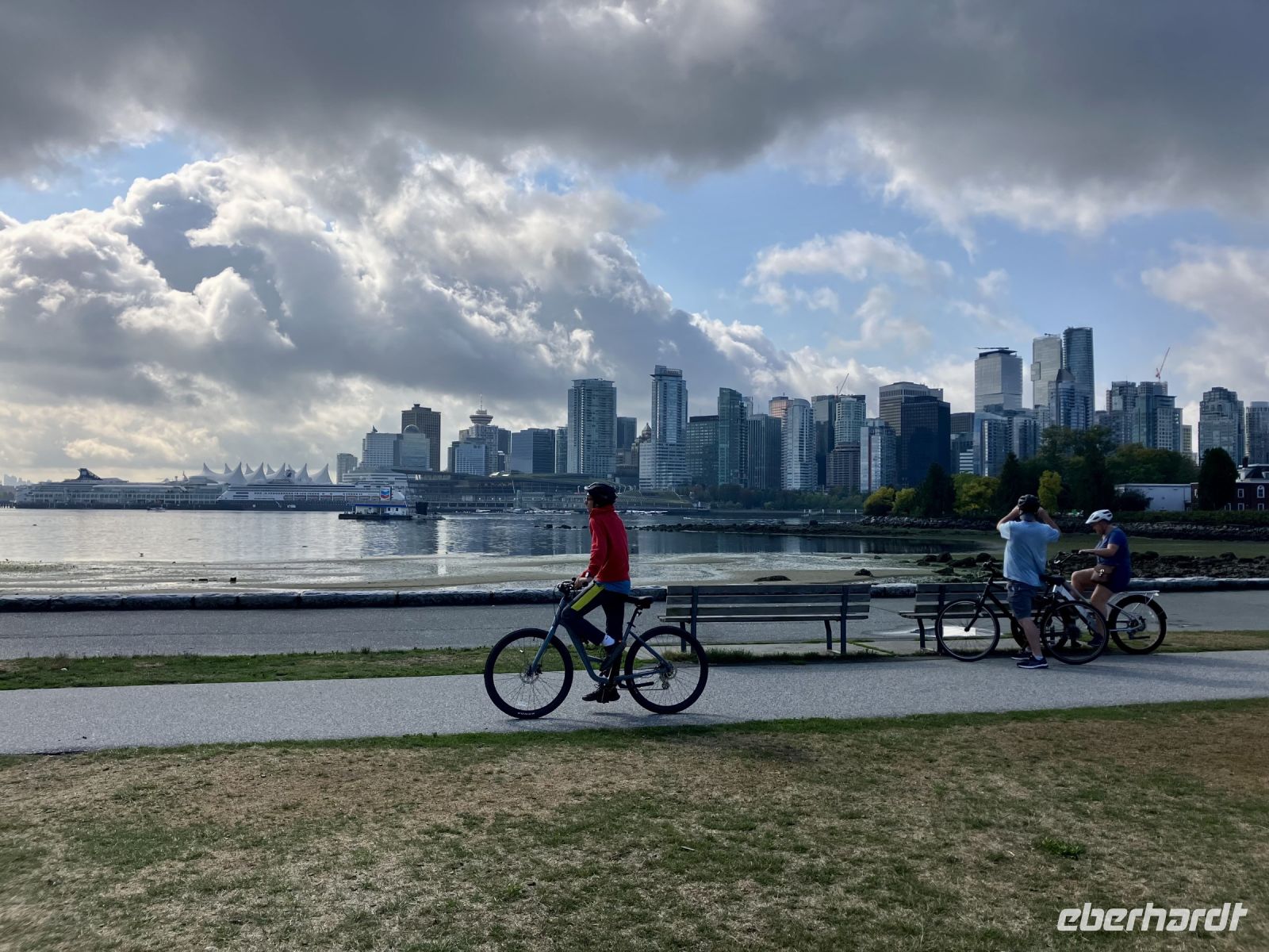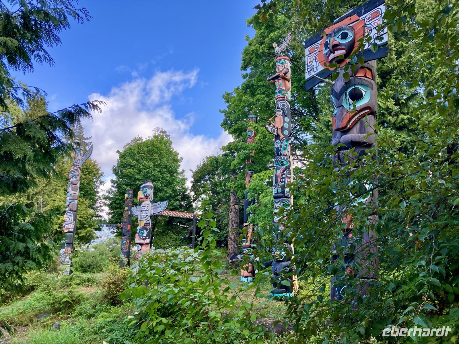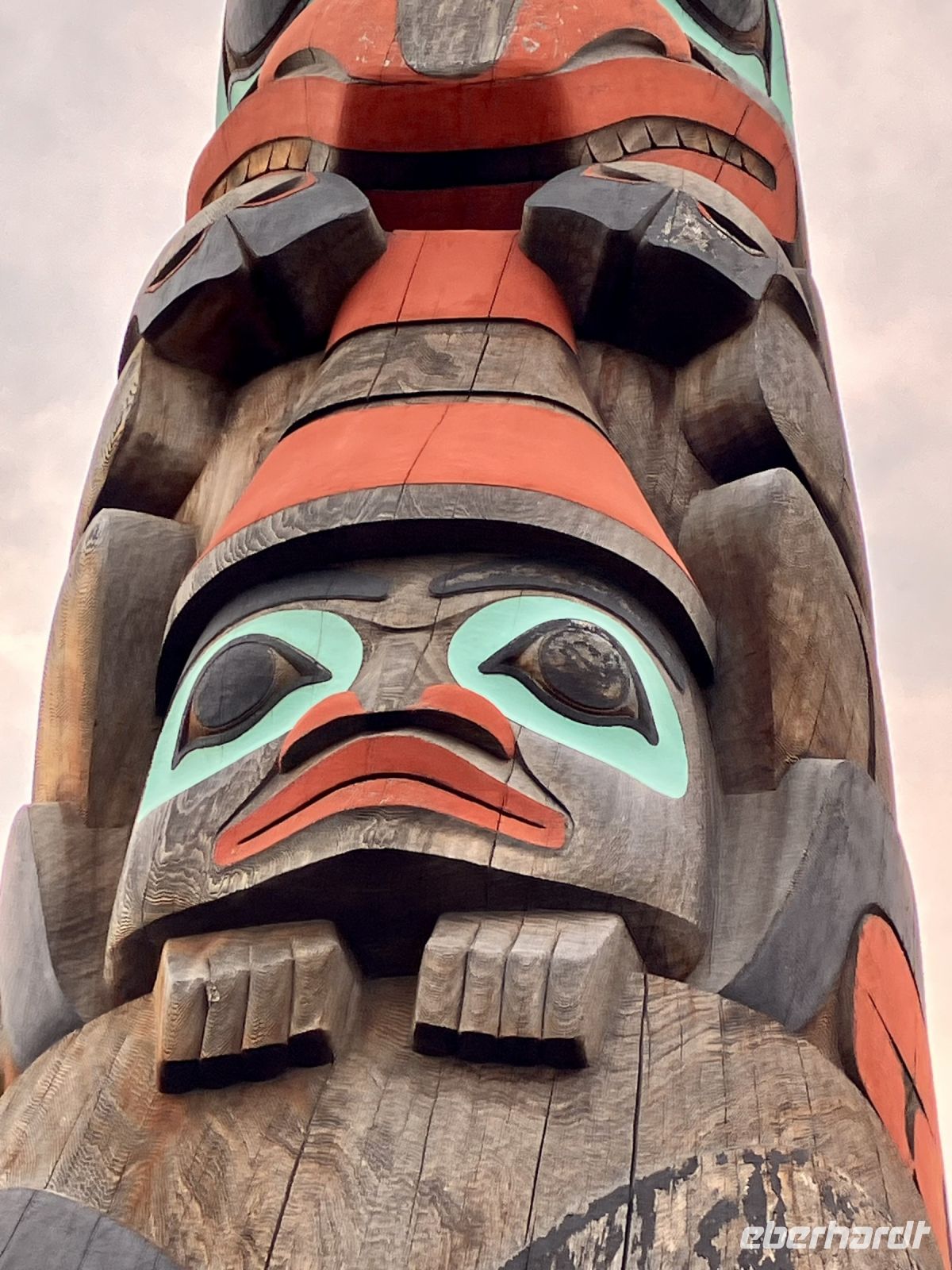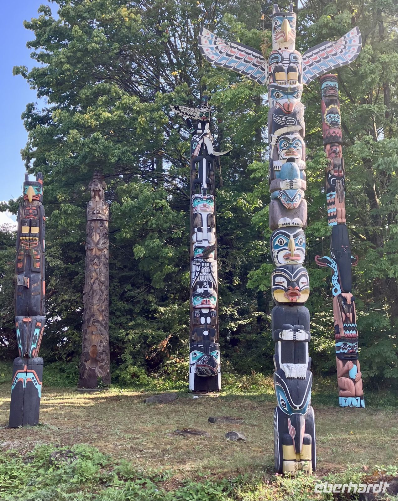 Heute ist Stadtrundfahrt angesagt und ein grosser, neuer, schoener, weisser Bus mit verry pretty Preet am Steuer wartet bereits auf uns. Als erstes haben wir Chinatown auf unserem Programm. Wir fahren durch das Herz von Vancouver und sehen diese wunderbaren Spiegelungen der vielen Glass-hochhaeuser. Auch das Hotel Vancouver spiegelt sich sehr posierlich in einem blauen Glasspalast. Die alte anglikanische Kirche ist wie ein kleines Juwel inmitten der Wolkenkratzer. Leider ist Chinatown momentan von Heimatlosen und Drogensuechtigen ueberrannt. Also bleiben wir im Bus sitzen, fahren langsam durch diesen geschichtlich sehr interessanten Stadtteil, schauen uns die 3-stoeckigen Haeuser an von denen wir so viel gehoert haben und staunen ueber die getrockneten Fische und Fruechte die da feilgeboten werden. Ach schau, da, in der Metzgerei haengen 4-eckige Huehner, so hergerichtet passen die sicher besser in den Ofen. Wo sonst gibt es so ideale Huehner ? Viel wird ueber die Chinesen gesprochen und auch ueber ihr Leben im fernen Kanada. Unterdessen hat Vancouver bereits einen Spitznamen bekommen….Hong-Couver … Danach gehts nach Gastown. Es ist der aelteste Stadtteil Vancouvers auch mit einer bewegten Geschichte. Diesen Stadtteil besuchen wir per pedes. Die Dampfuhr hat soeben gepustet als wir an ihr vorbeikommen. Im Bus fahren wir danach an dem ehemaligen Bahnhof, an Canada Place und der olympischen Fackel von 2010 vorbei. Bei Canada Place sehen wir auch zwei Kreuzschiffe welche heute abend die inside Passage hinaufsegeln werden nach Alsaska. Eines ist die Volendam, auf der eine Eberhardt Gruppe im Juni gebucht war. Sie behergert bloss 1500 Personen nicht wie die meisten 3000 Gaeste. Ob die vielen Passagiere wohl auch so riesen Grizzlies beim Fischen sehen werden wie wir ? Ich hoffe es, die Erinnerung daran haftet in unserem Gedaechtnis und ist festgehalten in unserer Fotogalerie. Nun gehts weiter mit der Stadtrundfahrt in den Stanley Park. Gleich bei Beginn halten wir bereits bei den geschichtserzaehlenden Pfaehlen und besprechen auch ihre Bedeutung und einige Anekdoten. Diese Totem sind Geschenke der verschiedenen Nationen, die hier im Regenwald heimisch sind. Die Aussicht auf Downtown ueber Coal Harbour ist gigantisch. Das Wetter und die Temperaturen sind auch perfekt. Gemuetlich fahren wir rund um Stanley Park, sehen den Hafen, die Kuestenberge mit der North Shore, die schoene Lions Gate Bruecke die ausschaut wie die Golden Gate Bruecke in San Fran und dann die weissen Straende und der tiefe Wald. Hier im Regenwald hat es heuer kaum geregnet und der Wald leidet sehr. Die Hemlocktannen werden von Motten befallen, sodass sie nun ausschauen als waeren sie abgestorben. Vielleicht koennen sie sich im Winter wieder erholen und wir wuenschen es ihnen.
