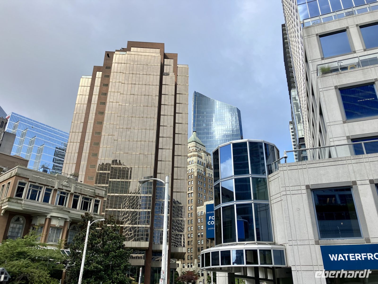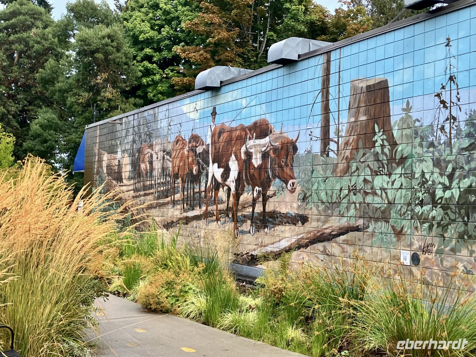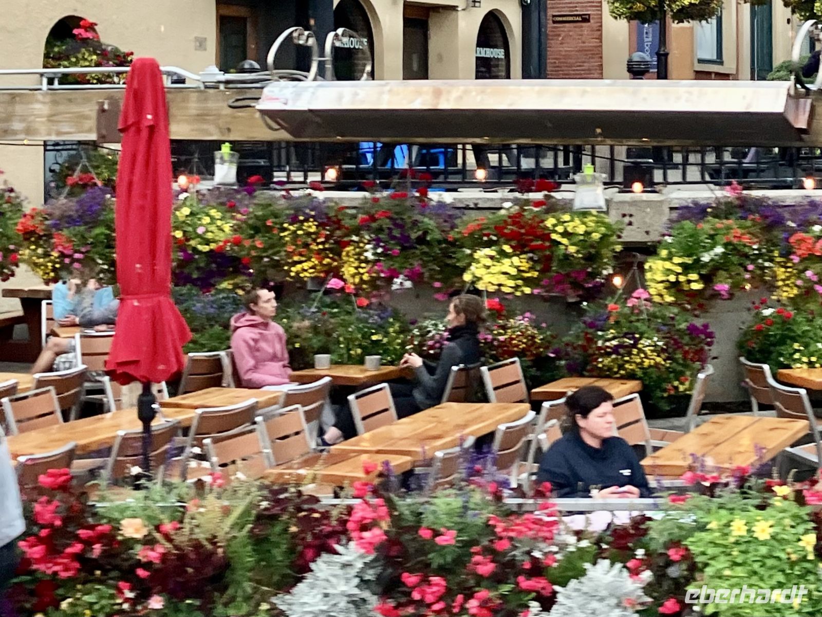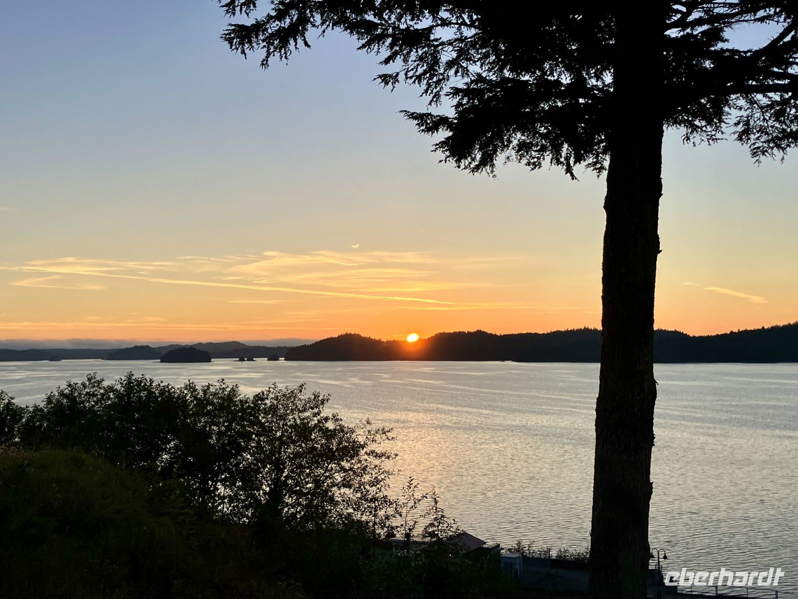 Der naechste und letzte Halt unserer Stadtrundfahrt ist Granville Island. Dort angekommen schlendern wir vorerst dem schwimmenden Dorf entlang und danach an vielen Geschaeften, Kunststudios, Gallerien und einer Weberei vorbei bis wir zur Markthalle gelangen. Die lustigen Seabusses welche hier das Wasser beleben sind oval, vielfarbig und ueberdeckt. Es ist hier sehr lebhaft, also nehmen wir unser Mittagessen gleich bei der Markthalle ein. Zurueck zum Hotel fahren wir wieder mit Preet. Einige bleiben nun auf Granville Island und fahren mit dem Seabus zurueck zum Hotel, einige fahren mit Preet zum Hotel und wieder andere fahren gleich weiter bis zum Wasserflugzeug Landeplatz. Der Nachmittag ist nun frei. Einige fliegen ueber Vanvouver andere gehen an den Strand und andere wollen heute noch einkaufen gehen fuer alle Verwandte und Freunde, Nachbarn und Bekannte. Erst abends treffen wir uns wieder fuers Abschiedsessen. Es ist sehr lebhaft, lustig und fein in diesem nahegelegenen Restaurant mit schoener Aussicht auf den legendaeren Sonnenuntergang. Naja, der Sonnenuntergang ist heute auch wieder etwas gedaemmt, da Wolken den Himmel verstecken. Nun muessen wir noch packen, denn Morgen geht es bereits zeitig weiter zum Flughafen. Die Nacht ist gut, die Traeume gefuellt mit wundervollen Erinnerungen an eine unvergessliche Reise.