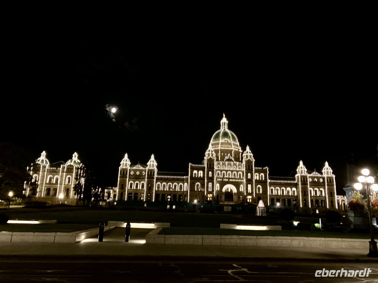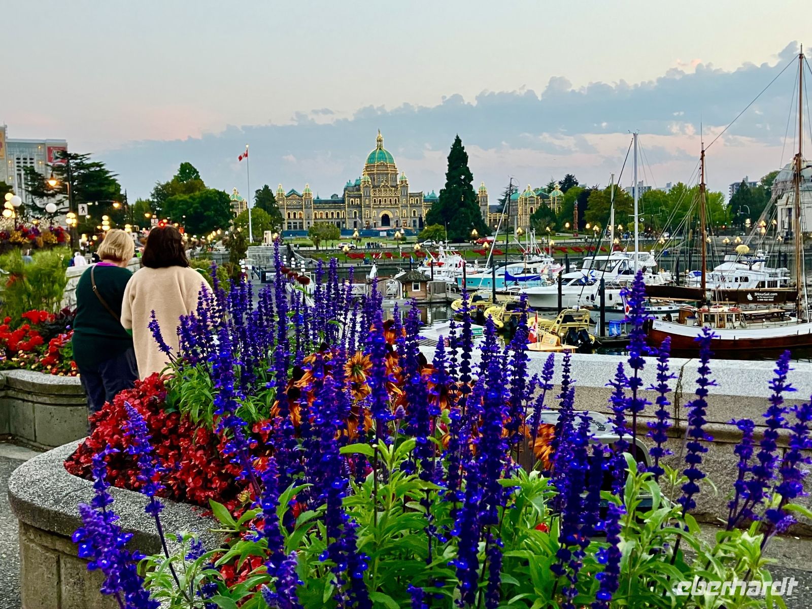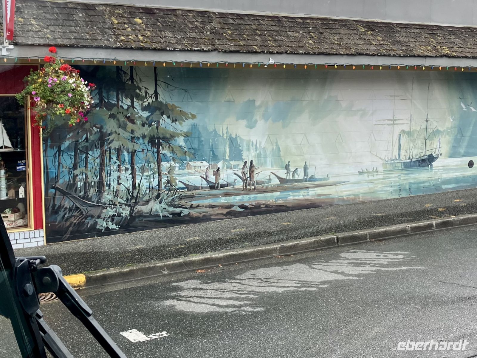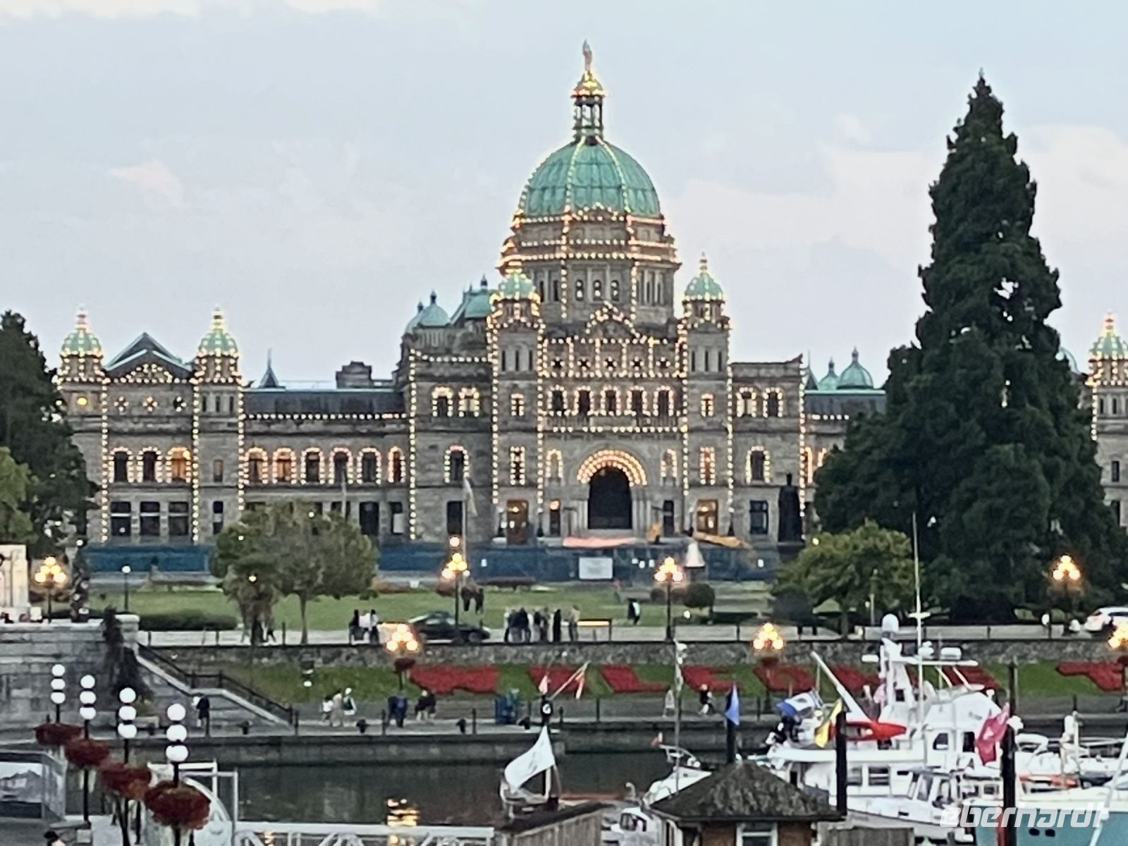 Wir wachen in dem super schoenen Hotel auf welches nun der ansaessigen Sippe gehoert. Es wurde total renoviert. Die Zimmer sind modern, gross, sauber und schoen dekoriert nach Haida Art. Der Himmel ist stahlblau, es ist ein perfekter Morgen. Das Fruehstueck lasst ein bisschen zu wuenschen uebrig aber wir werden alle gut satt. So fahren wir auch bald los. Wir nehmen die einzige Strasse, die Island Highway. Ein Stuendchen spaeter gibt es eine Kreuzung, die nutzen wir aus und biegen links ab nach Telegraph Cove. Vorbei an einer Holz Verladestelle betrachten wir die riesen Lastwagen die hier schwer beladen werden mit den hierher gefloessten Holzstaemmen. Das Fischerdoerfchen,Telegraph Cove, ist sehr pitoresk mit seinen bunten Haeuser. Es wurde sehr schoen restauriert. Viele Fotos spaeter, wollen wir eigentlich gar nicht mehr weiter. Aber Victoria wartet auf uns. Vielen Geschichten ueber die Insel und seine Politik, Kapitaen Cook, sein Leben und seine Kapitaene zuhorchend, erreichen wir die Mitte der Insel. Hier, in Campbell River, am Ufer, nach Quadra Insel schauend, halten wir auch fuer unsere Mittagspause an. Die Sonne meint es gut mit uns, sie strahlt uns an und es ist richtig warm. Die Hafen Robben schauen uns beim Mittagessen zu. Nach dieser Pause haben wir uns nun ein Nickerchen im Bus verdient. Es bringt uns bis nach Chemainus. Uuii, da faengt es ploetzlich an zu regnen, aber nicht bloss ein bisschen es schuettet regelrecht. Da dieses Dorf eine Freiluftgallerie ist, steigen wir mit unserer Regenbekleidung aus. Die Hausmauern von Chemainus sind fast alle schoen bemalt mit Bilder die historischen Hintergrund haben muessen. Ein wahrlich wunderbares Doerfchen, idyllisch an einer Bucht gelegen. Wir bleiben eine Weile, auch wegen des feinen Eises, ehe wir nicht nach Victoria aufbrechen. Es regnet noch immer also horchen wir den Geschichten von Mr Duoglas und Mr Rattenburry zu und erfahren auch weshalb nicht das groessere Vancouver auf dem Festland als Hauptstadt von Britisch Columbien auserwaehlt wurde. Victoria ist unser heutiges Reiseziel. Angekommen, fahren wir schon mal durch das tolle Chinatown mit seiner Fan Tan Alley, rollen an den ehemaligen Lagerhaeuser vorbei, sehen die Bastion mit dem Justitzpalast um am Schluss, dem Inneren Hafen entlang zu fahren. Das schoene, englisch angehauchte Staedtchen Victoria, erkunden wir dann Morgen zu Fuss. Nach dem einchecken haben wir 1 Stunde Zeit ehe wir zum Abendessen zum Hafen spazieren. Ooh, das Parlamentsgbaeude, es ist so zauberhaft beleuchtet man glaubt es sei Weihnachten oder ein spezieller Anlass. Ach ja, es ist ein spezieller Anlass, wir sind angekommen ! Anlass genug zur Verzierung dieser schoenen Stadt. Das Abendessen ist sehr fein und die Aussicht natuerlich perfekt auf den Hafen und das Parlament. Der Regen hat auch aufgehoert so kommen doch fast alle nach dem Abendessen auch noch auf die Pub-Tour mit. In 2 Pubs gibt es flotte Musik, gutes Bier und auch Tanz. Mit einem schmunzeln auf unseren Lippen, wenn wir an die Geschichte von Francis Rattenburry und seiner Alma denken, schlummern wir heute ein.