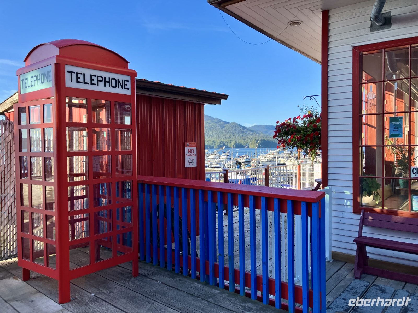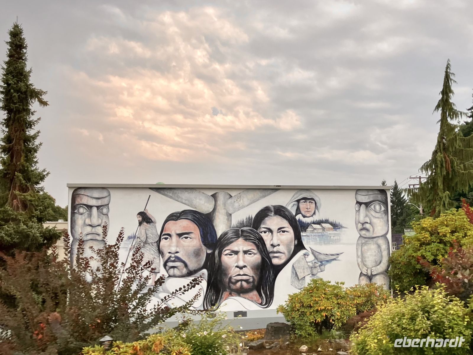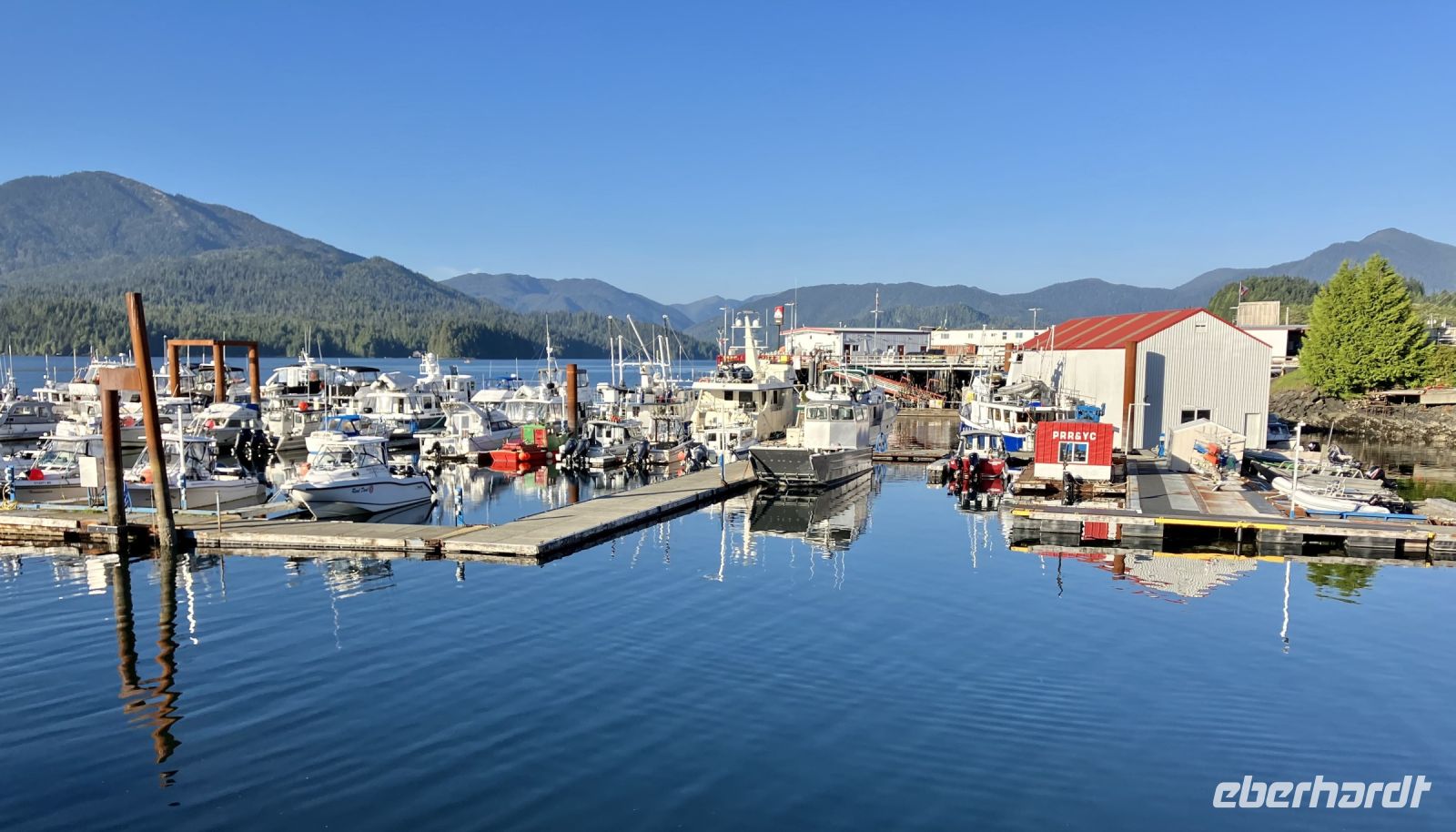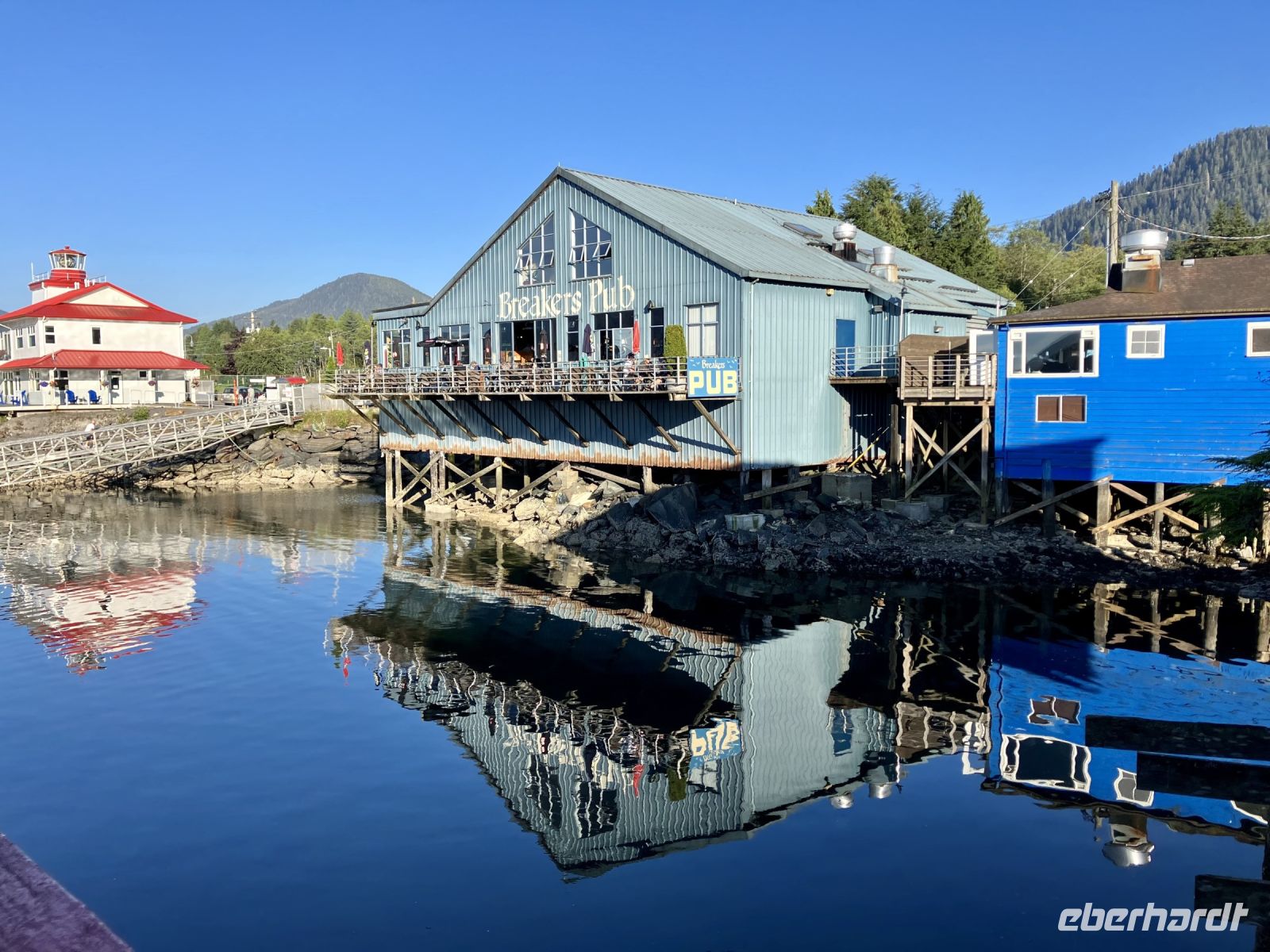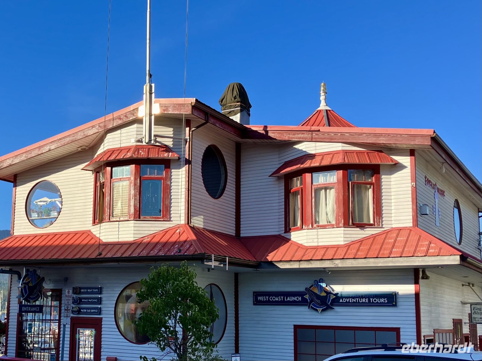 Wir wachen in dem super schoenen Hotel auf welches nun der ansaessigen Sippe gehoert. Es wurde total renoviert. Die Zimmer sind modern, gross, sauber und schoen dekoriert nach Haida Art. Der Himmel ist stahlblau, es ist ein perfekter Morgen. Das Fruehstueck lasst ein bisschen zu wuenschen uebrig aber wir werden alle gut satt. So fahren wir auch bald los. Wir nehmen die einzige Strasse, die Island Highway. Ein Stuendchen spaeter gibt es eine Kreuzung, die nutzen wir aus und biegen links ab nach Telegraph Cove. Vorbei an einer Holz Verladestelle betrachten wir die riesen Lastwagen die hier schwer beladen werden mit den hierher gefloessten Holzstaemmen. Das Fischerdoerfchen,Telegraph Cove, ist sehr pitoresk mit seinen bunten Haeuser. Es wurde sehr schoen restauriert. Viele Fotos spaeter, wollen wir eigentlich gar nicht mehr weiter. Aber Victoria wartet auf uns. Vielen Geschichten ueber die Insel und seine Politik, Kapitaen Cook, sein Leben und seine Kapitaene zuhorchend, erreichen wir die Mitte der Insel. Hier, in Campbell River, am Ufer, nach Quadra Insel schauend, halten wir auch fuer unsere Mittagspause an. Die Sonne meint es gut mit uns, sie strahlt uns an und es ist richtig warm. Die Hafen Robben schauen uns beim Mittagessen zu. Nach dieser Pause haben wir uns nun ein Nickerchen im Bus verdient. Es bringt uns bis nach Chemainus. Uuii, da faengt es ploetzlich an zu regnen, aber nicht bloss ein bisschen es schuettet regelrecht. Da dieses Dorf eine Freiluftgallerie ist, steigen wir mit unserer Regenbekleidung aus. Die Hausmauern von Chemainus sind fast alle schoen bemalt mit Bilder die historischen Hintergrund haben muessen. Ein wahrlich wunderbares Doerfchen, idyllisch an einer Bucht gelegen. Wir bleiben eine Weile, auch wegen des feinen Eises, ehe wir nicht nach Victoria aufbrechen. Es regnet noch immer also horchen wir den Geschichten von Mr Duoglas und Mr Rattenburry zu und erfahren auch weshalb nicht das groessere Vancouver auf dem Festland als Hauptstadt von Britisch Columbien auserwaehlt wurde. Victoria ist unser heutiges Reiseziel. Angekommen, fahren wir schon mal durch das tolle Chinatown mit seiner Fan Tan Alley, rollen an den ehemaligen Lagerhaeuser vorbei, sehen die Bastion mit dem Justitzpalast um am Schluss, dem Inneren Hafen entlang zu fahren. Das schoene, englisch angehauchte Staedtchen Victoria, erkunden wir dann Morgen zu Fuss. Nach dem einchecken haben wir 1 Stunde Zeit ehe wir zum Abendessen zum Hafen spazieren. Ooh, das Parlamentsgbaeude, es ist so zauberhaft beleuchtet man glaubt es sei Weihnachten oder ein spezieller Anlass. Ach ja, es ist ein spezieller Anlass, wir sind angekommen ! Anlass genug zur Verzierung dieser schoenen Stadt. Das Abendessen ist sehr fein und die Aussicht natuerlich perfekt auf den Hafen und das Parlament. Der Regen hat auch aufgehoert so kommen doch fast alle nach dem Abendessen auch noch auf die Pub-Tour mit. In 2 Pubs gibt es flotte Musik, gutes Bier und auch Tanz. Mit einem schmunzeln auf unseren Lippen, wenn wir an die Geschichte von Francis Rattenburry und seiner Alma denken, schlummern wir heute ein.