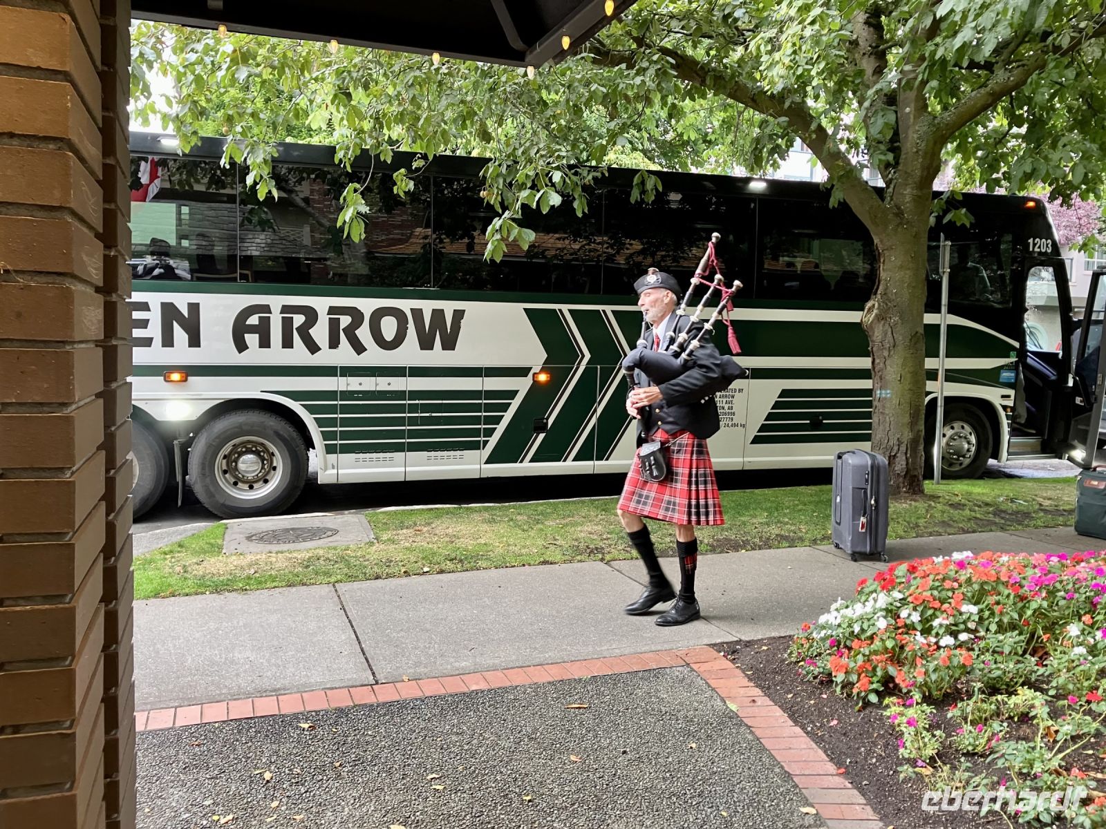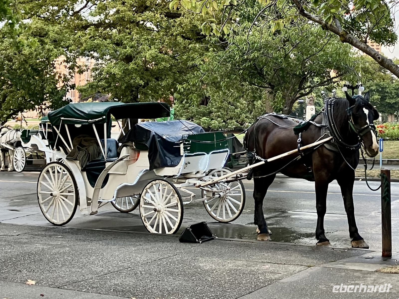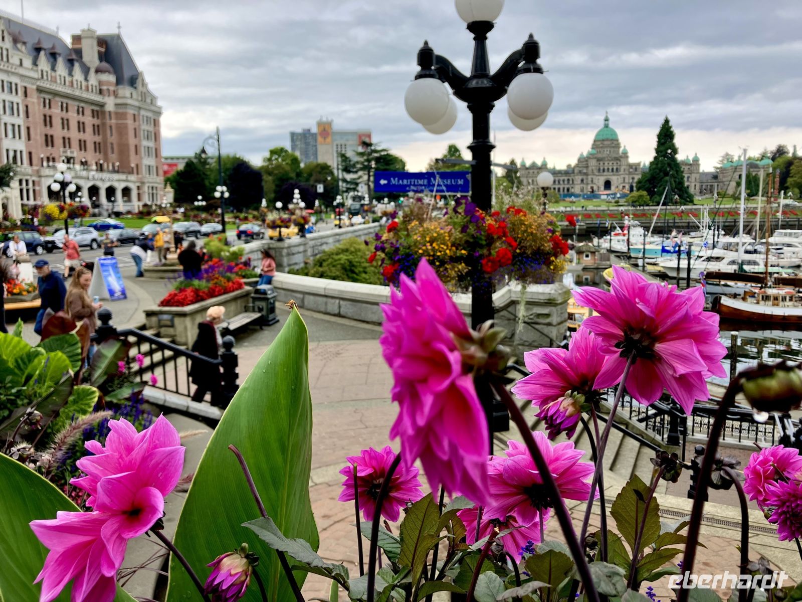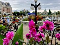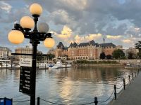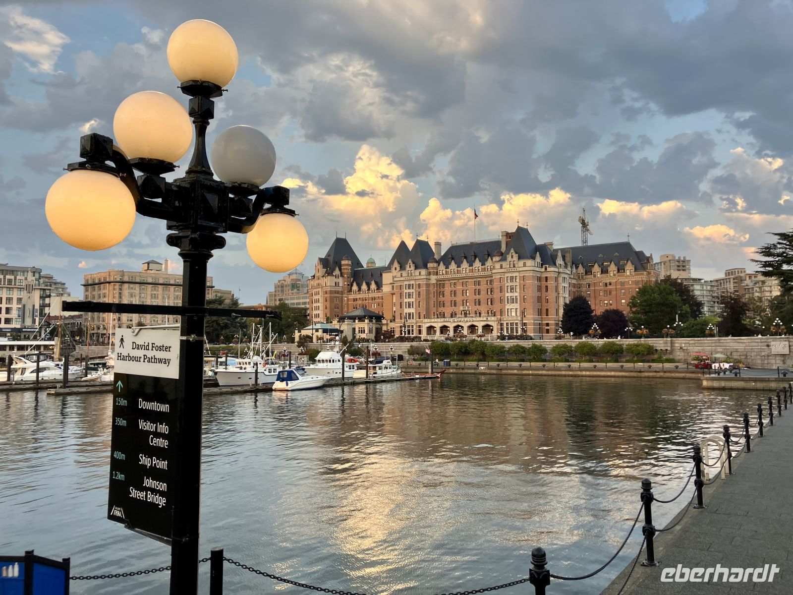 Wir wachen in dem super schoenen Hotel auf welches nun der ansaessigen Sippe gehoert. Es wurde total renoviert. Die Zimmer sind modern, gross, sauber und schoen dekoriert nach Haida Art. Der Himmel ist stahlblau, es ist ein perfekter Morgen. Das Fruehstueck lasst ein bisschen zu wuenschen uebrig aber wir werden alle gut satt. So fahren wir auch bald los. Wir nehmen die einzige Strasse, die Island Highway. Ein Stuendchen spaeter gibt es eine Kreuzung, die nutzen wir aus und biegen links ab nach Telegraph Cove. Vorbei an einer Holz Verladestelle betrachten wir die riesen Lastwagen die hier schwer beladen werden mit den hierher gefloessten Holzstaemmen. Das Fischerdoerfchen,Telegraph Cove, ist sehr pitoresk mit seinen bunten Haeuser. Es wurde sehr schoen restauriert. Viele Fotos spaeter, wollen wir eigentlich gar nicht mehr weiter. Aber Victoria wartet auf uns. Vielen Geschichten ueber die Insel und seine Politik, Kapitaen Cook, sein Leben und seine Kapitaene zuhorchend, erreichen wir die Mitte der Insel. Hier, in Campbell River, am Ufer, nach Quadra Insel schauend, halten wir auch fuer unsere Mittagspause an. Die Sonne meint es gut mit uns, sie strahlt uns an und es ist richtig warm. Die Hafen Robben schauen uns beim Mittagessen zu. Nach dieser Pause haben wir uns nun ein Nickerchen im Bus verdient. Es bringt uns bis nach Chemainus. Uuii, da faengt es ploetzlich an zu regnen, aber nicht bloss ein bisschen es schuettet regelrecht. Da dieses Dorf eine Freiluftgallerie ist, steigen wir mit unserer Regenbekleidung aus. Die Hausmauern von Chemainus sind fast alle schoen bemalt mit Bilder die historischen Hintergrund haben muessen. Ein wahrlich wunderbares Doerfchen, idyllisch an einer Bucht gelegen. Wir bleiben eine Weile, auch wegen des feinen Eises, ehe wir nicht nach Victoria aufbrechen. Es regnet noch immer also horchen wir den Geschichten von Mr Duoglas und Mr Rattenburry zu und erfahren auch weshalb nicht das groessere Vancouver auf dem Festland als Hauptstadt von Britisch Columbien auserwaehlt wurde. Victoria ist unser heutiges Reiseziel. Angekommen, fahren wir schon mal durch das tolle Chinatown mit seiner Fan Tan Alley, rollen an den ehemaligen Lagerhaeuser vorbei, sehen die Bastion mit dem Justitzpalast um am Schluss, dem Inneren Hafen entlang zu fahren. Das schoene, englisch angehauchte Staedtchen Victoria, erkunden wir dann Morgen zu Fuss. Nach dem einchecken haben wir 1 Stunde Zeit ehe wir zum Abendessen zum Hafen spazieren. Ooh, das Parlamentsgbaeude, es ist so zauberhaft beleuchtet man glaubt es sei Weihnachten oder ein spezieller Anlass. Ach ja, es ist ein spezieller Anlass, wir sind angekommen ! Anlass genug zur Verzierung dieser schoenen Stadt. Das Abendessen ist sehr fein und die Aussicht natuerlich perfekt auf den Hafen und das Parlament. Der Regen hat auch aufgehoert so kommen doch fast alle nach dem Abendessen auch noch auf die Pub-Tour mit. In 2 Pubs gibt es flotte Musik, gutes Bier und auch Tanz. Mit einem schmunzeln auf unseren Lippen, wenn wir an die Geschichte von Francis Rattenburry und seiner Alma denken, schlummern wir heute ein.